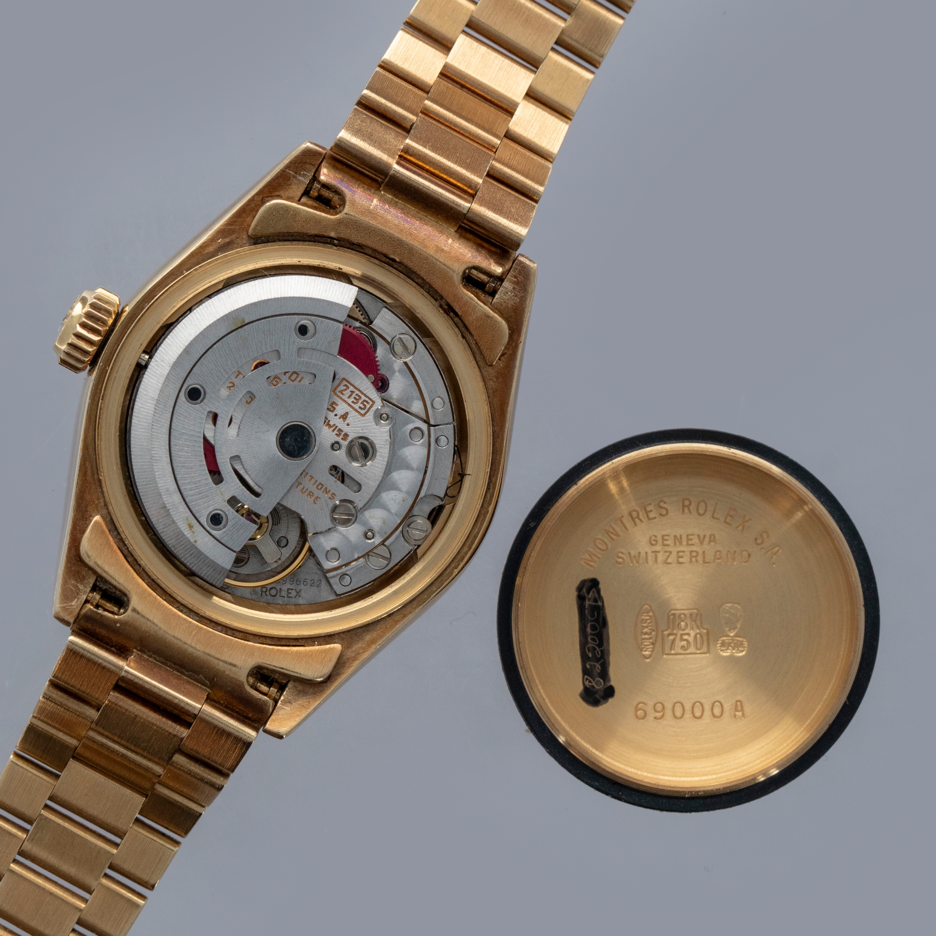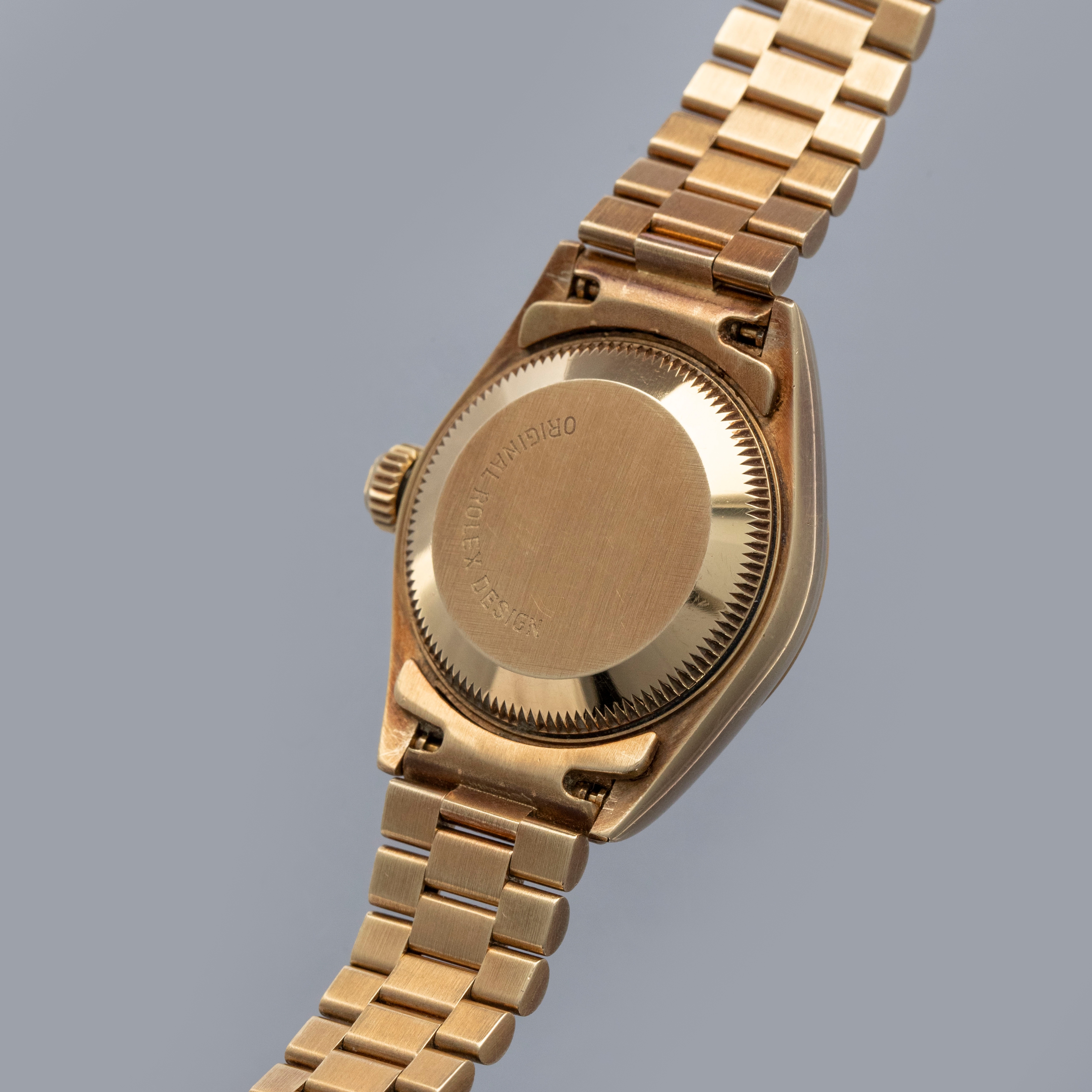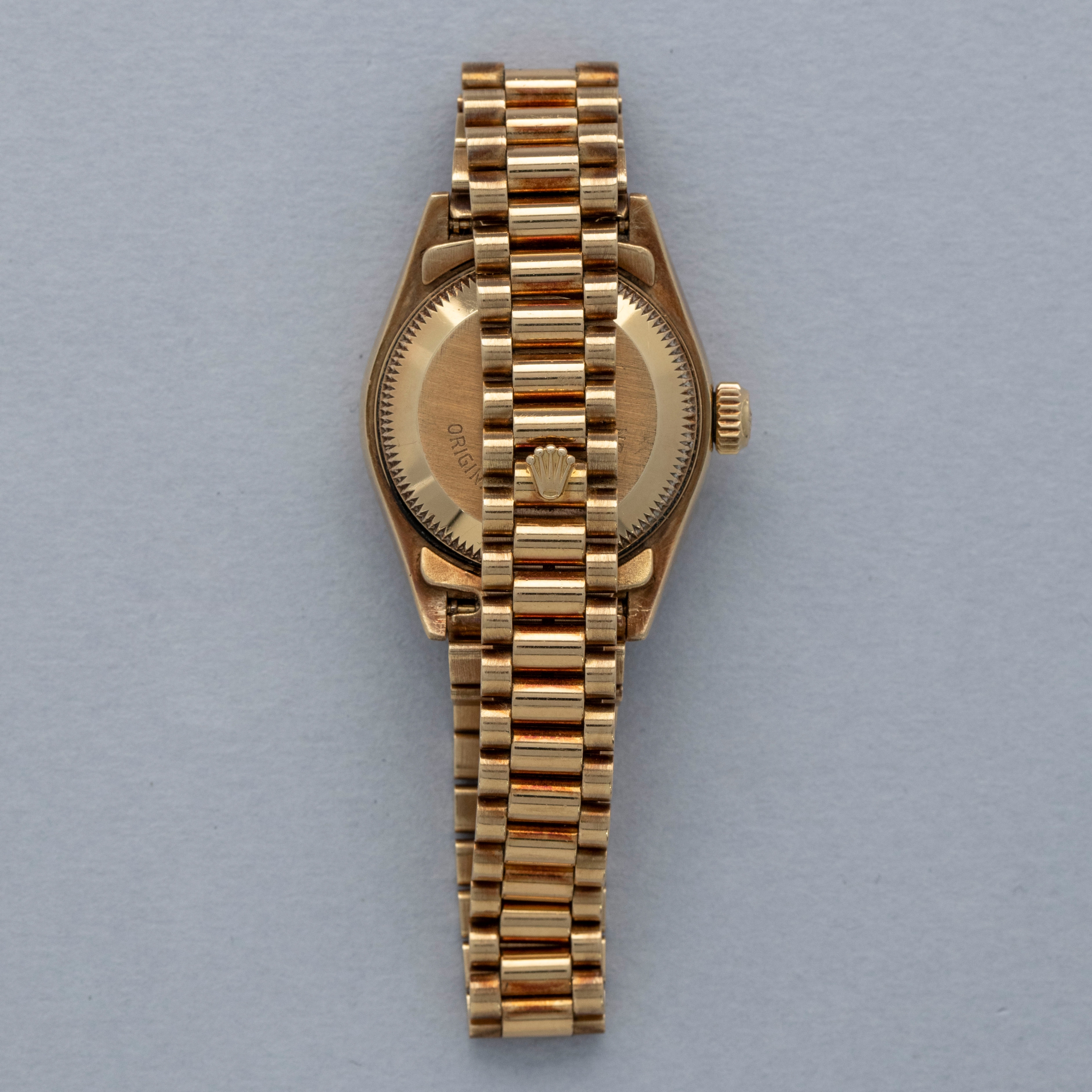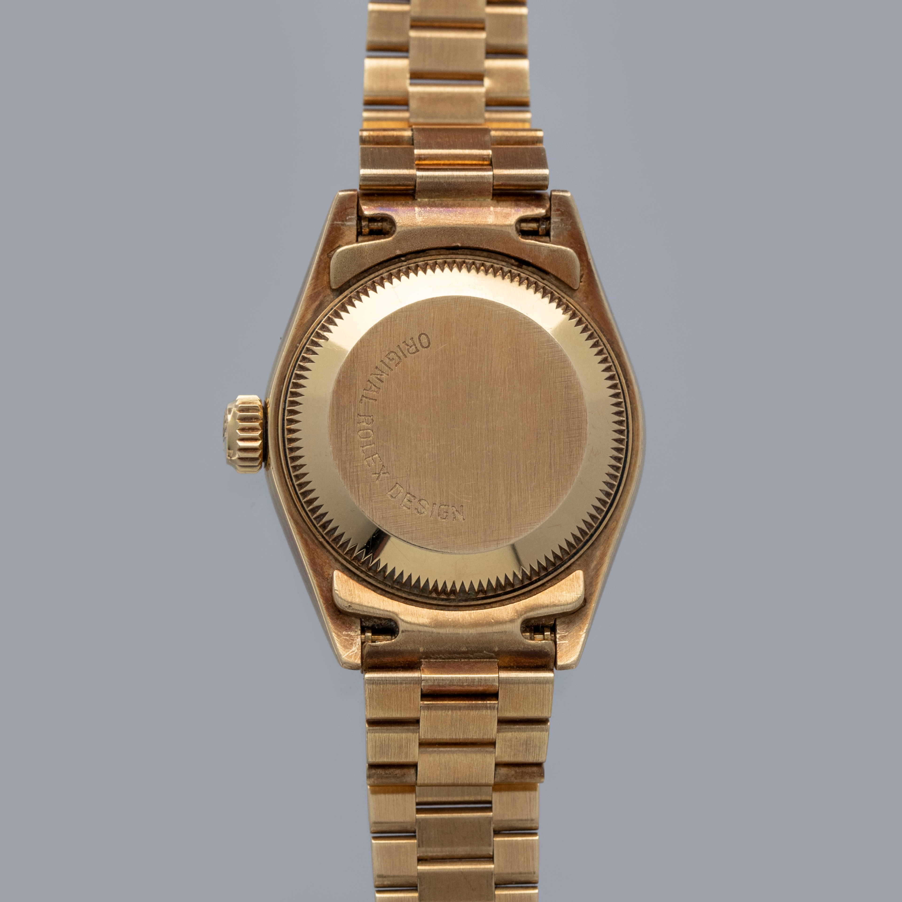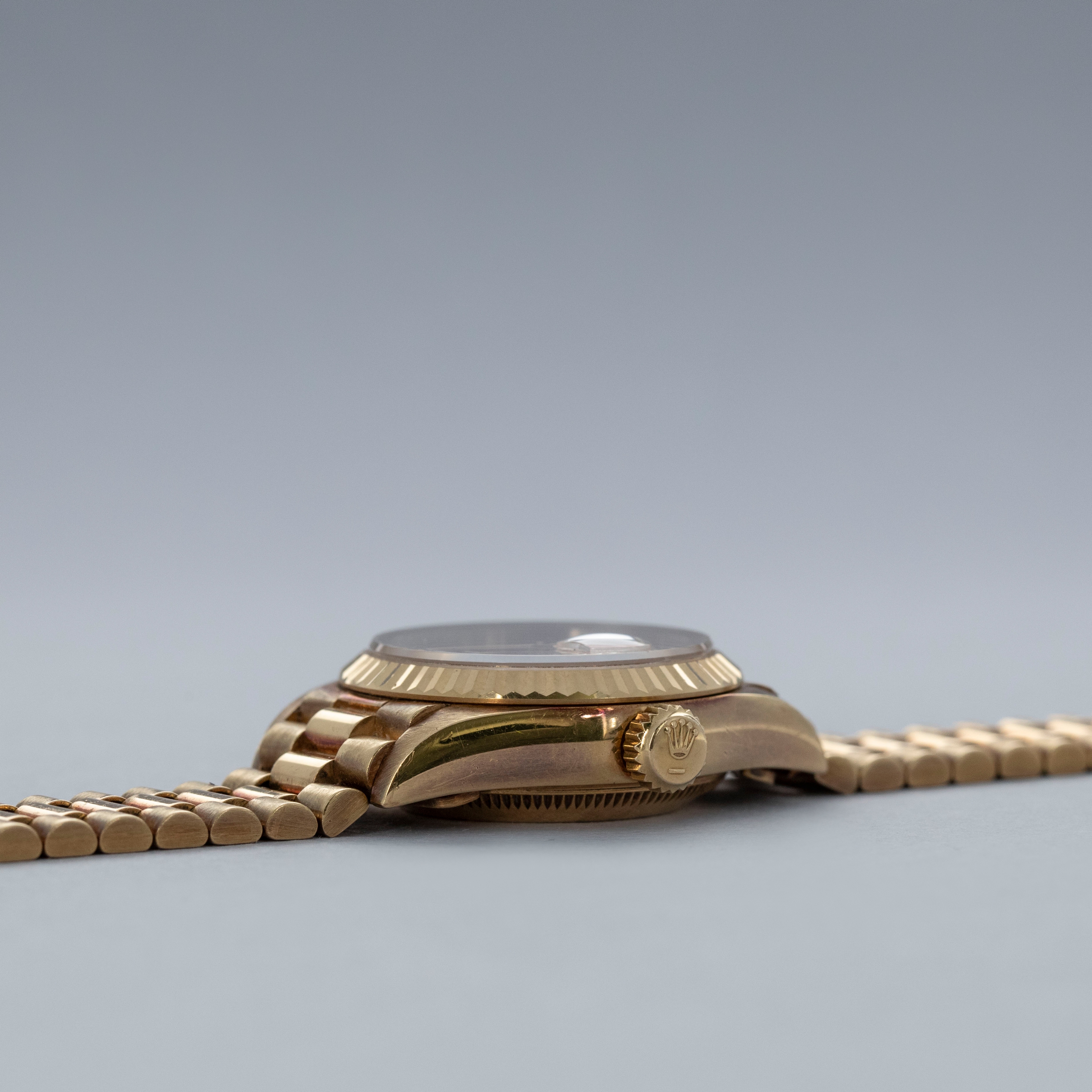 Watch is in overall excellent condition. The yellow gold case shows surface scratches and light nicks, while the case back retains a well-defined factory engraving with some light scuffs. The hallmarks and stamps on the backs of the lugs remain legible. The fluted bezel shows light surface scratches. The hardstone coral dial remains near mint with no cracks, and the no-lume hands remain very clean. It is fitted with a yellow gold President bracelet showing light surface marks and light play between the links. The bracelet is fitted with 31 links and fits approximately a 6¼” wrist.