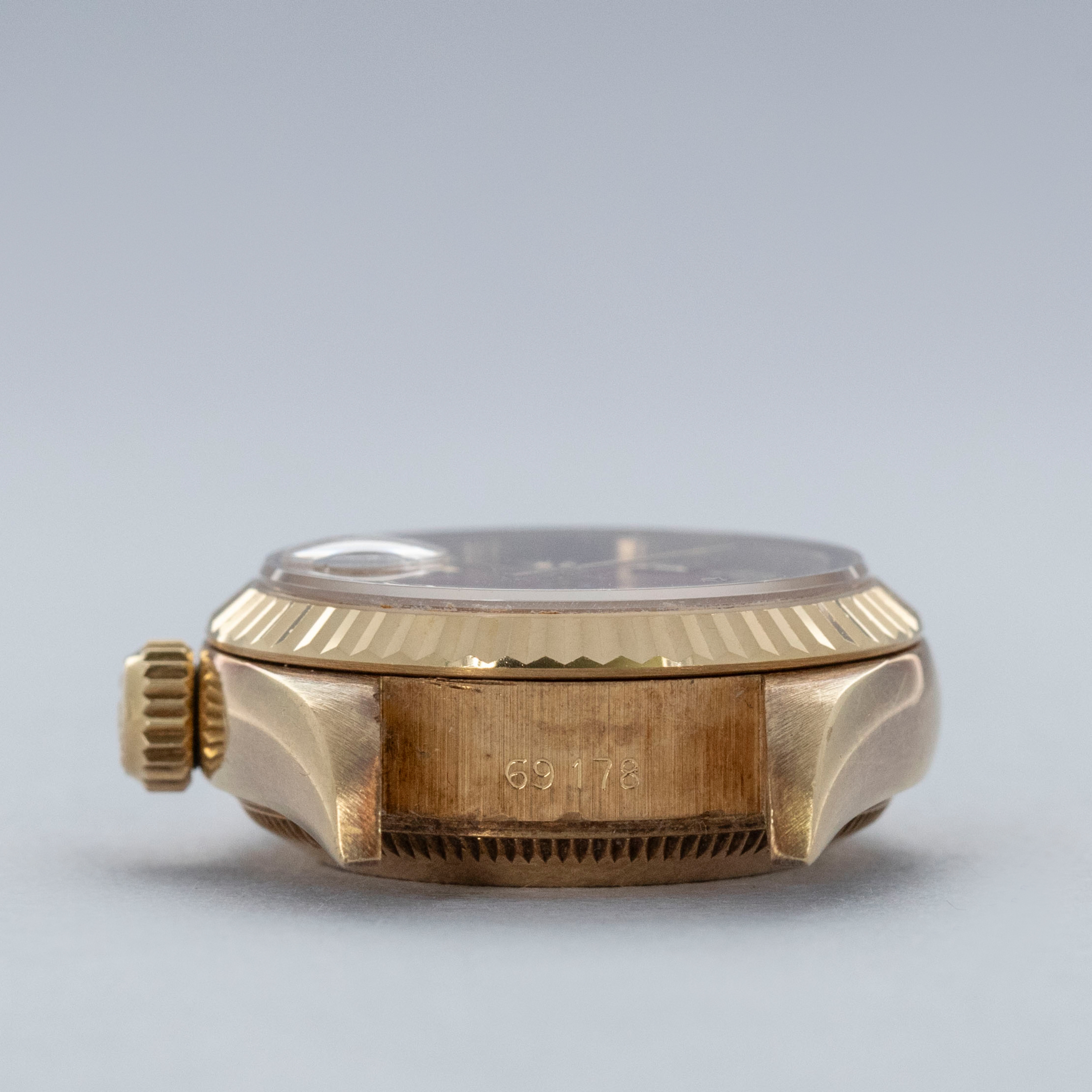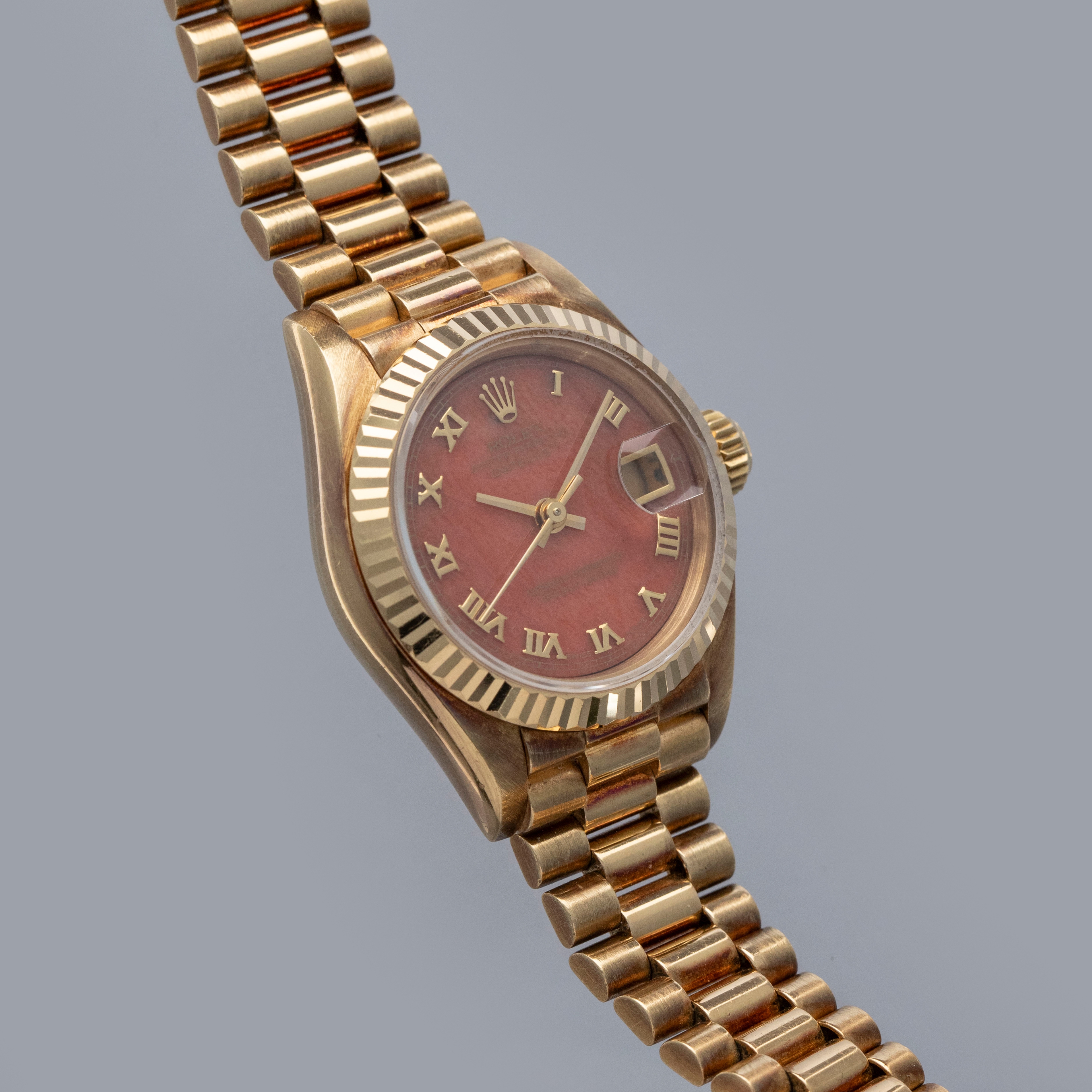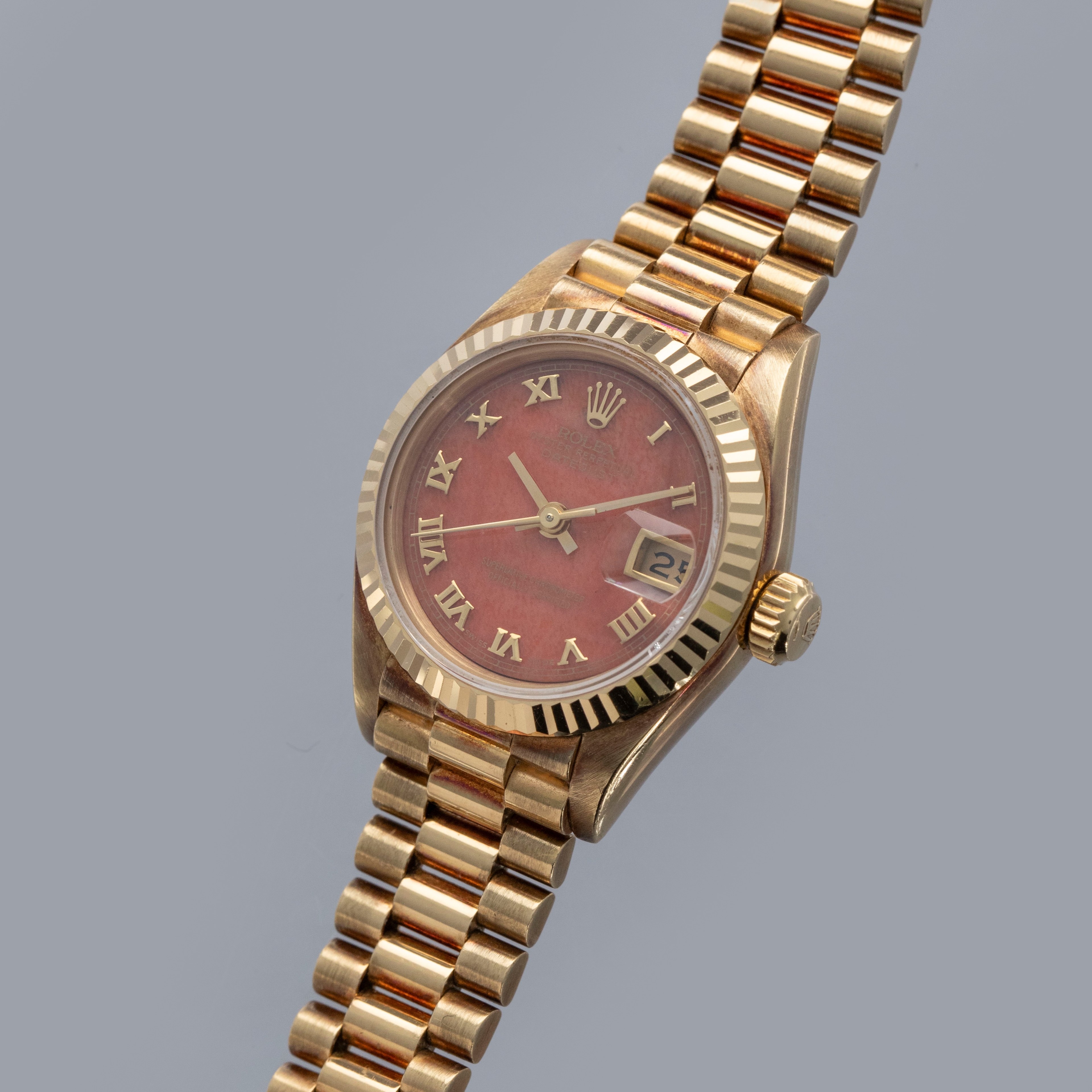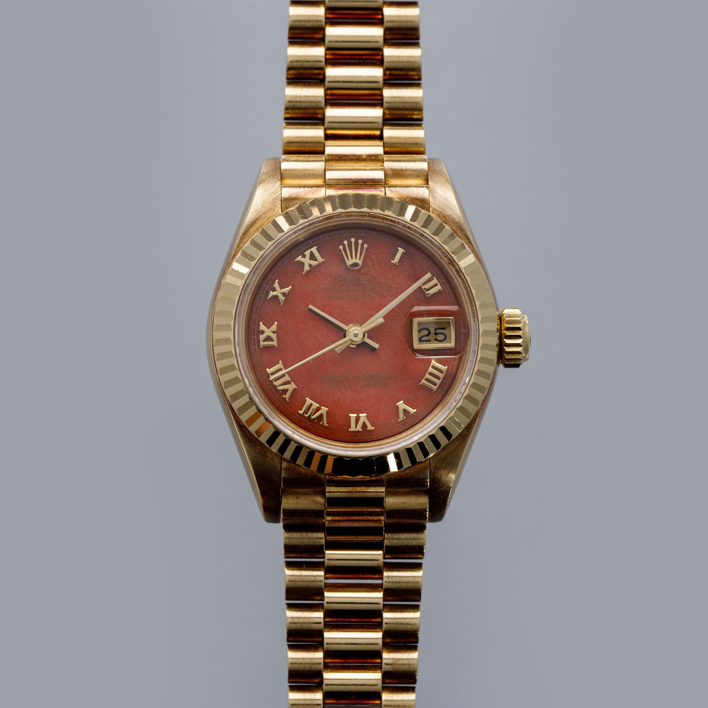 Released to celebrate Rolex's 40th anniversary in 1945, the Rolex Datejust has become one of the Genevan Giant's most iconic watches. The world's first wristwatch to display the date via an aperture on the dial, the Datejust revolutionized wristwatch design for decades to follow. With its emblematic Cyclops lens, jubilee bracelet (designed specifically for the model in 1945), and classy fluted precious metal bezel, the Datejust's aesthetic has always been that of pure elegance and class. Perhaps one of Rolex's most recognizable designs, the Datejust has evolved from its dressier roots into a perfectly capable timepiece rivaling the robustness of most brands' sports watches. Featuring a stainless steel case with a screw-down crown and caseback, the Datejust packs an impressive punch. 100m of water resistance alongside its consistently capable movements and construction have enabled it to become one of the best-equipped watches for daily wear and tear. Available in several different dial options, a multitude of materials, and across many styles, the Datejust is an inescapable reflection of its owner, with a model out there to suit pretty much everybody's tastes and preferences. The majority of Datejusts' were produced in stainless steel and two-tone, with fewer quantities made in 18k solid gold. Offered here, our Ladies Datejust ref. 69178 example boasts coral stone dial with applied Roman numeral hands, making it one of the rarest variants of this ladies presidential Datejust.