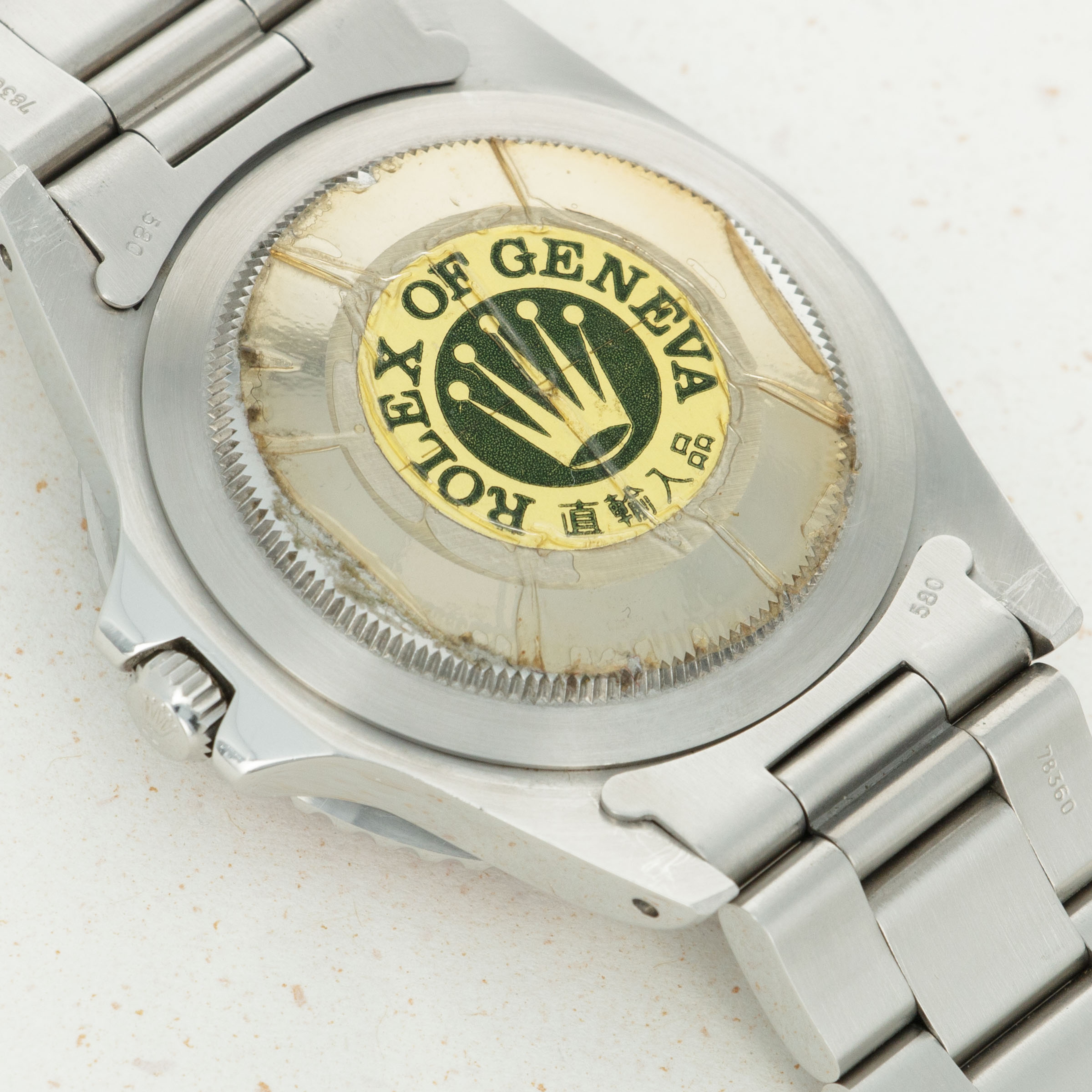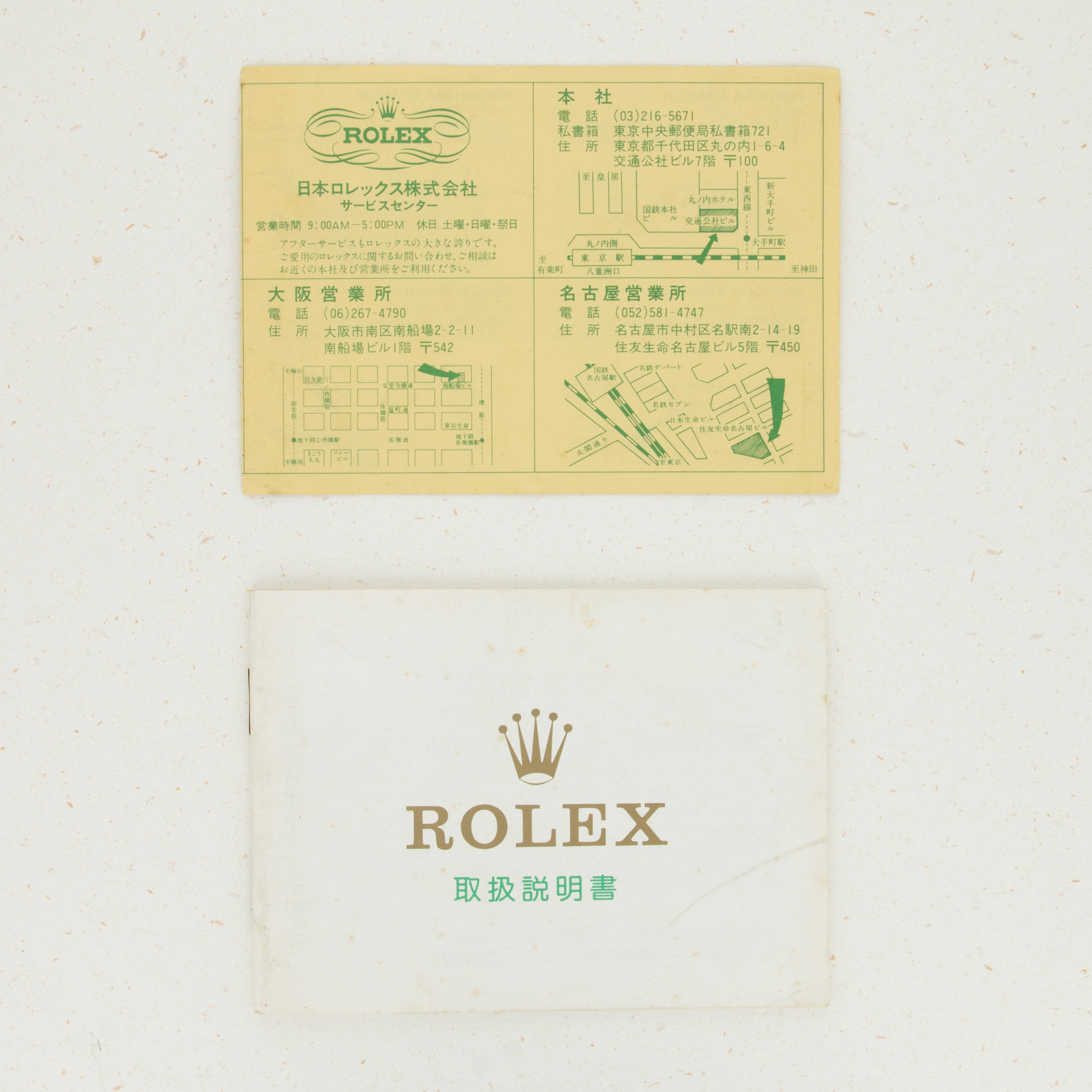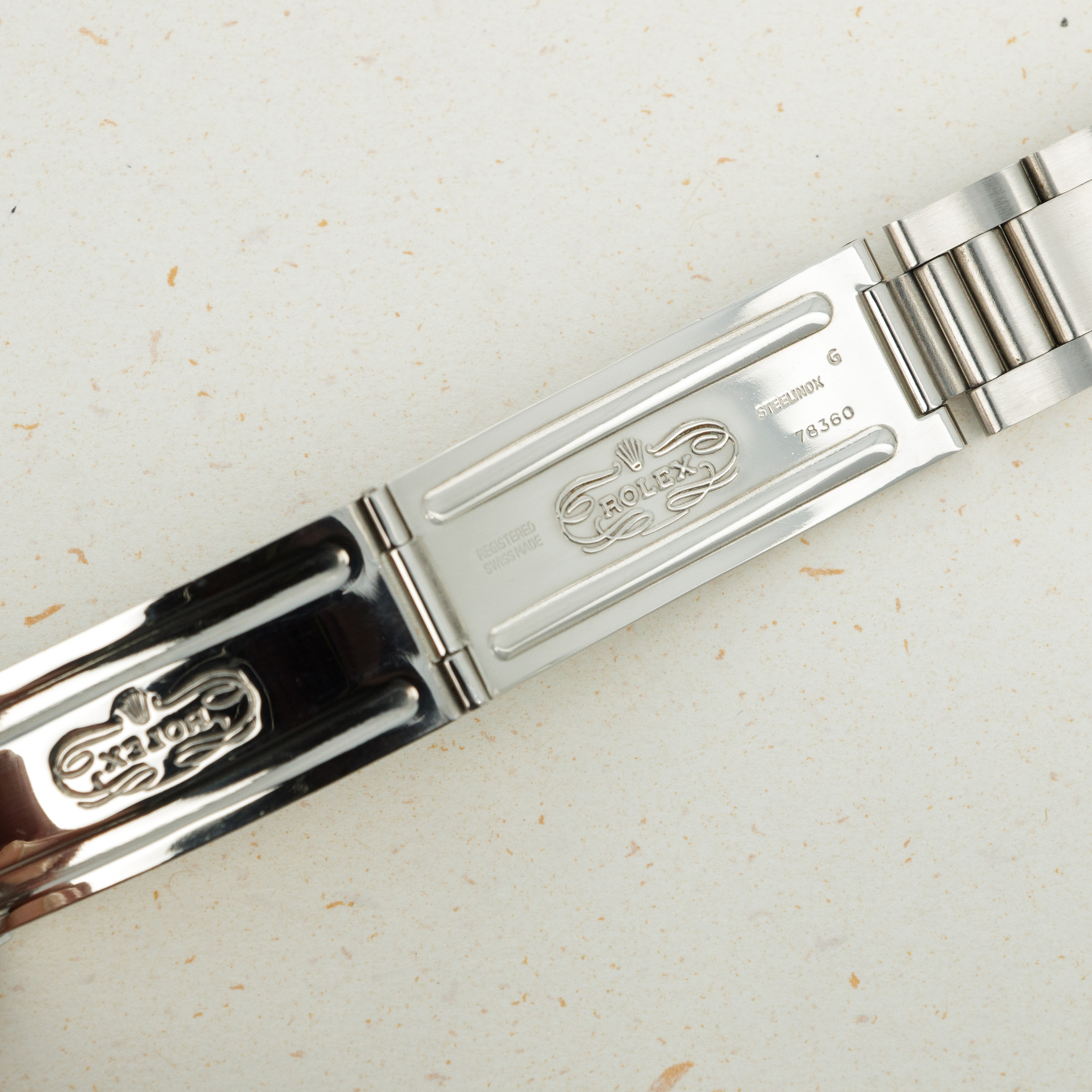 The watch is in 'like new' condition overall. Dial appears to be untouched, and has rich matching patina on the markers and hands. Hands have oxidized as shown, and there are minor scratches on the original acrylic crystal. Case and bracelet are mint with no signs of use, save for some scratches around the lug holes due to improper removal of the bracelet. Watch retains the full original caseback sticker from Rolex Japan. Bracelet is sized to fit a 7.5" wrist but can be adjusted. There are 13 links in total.