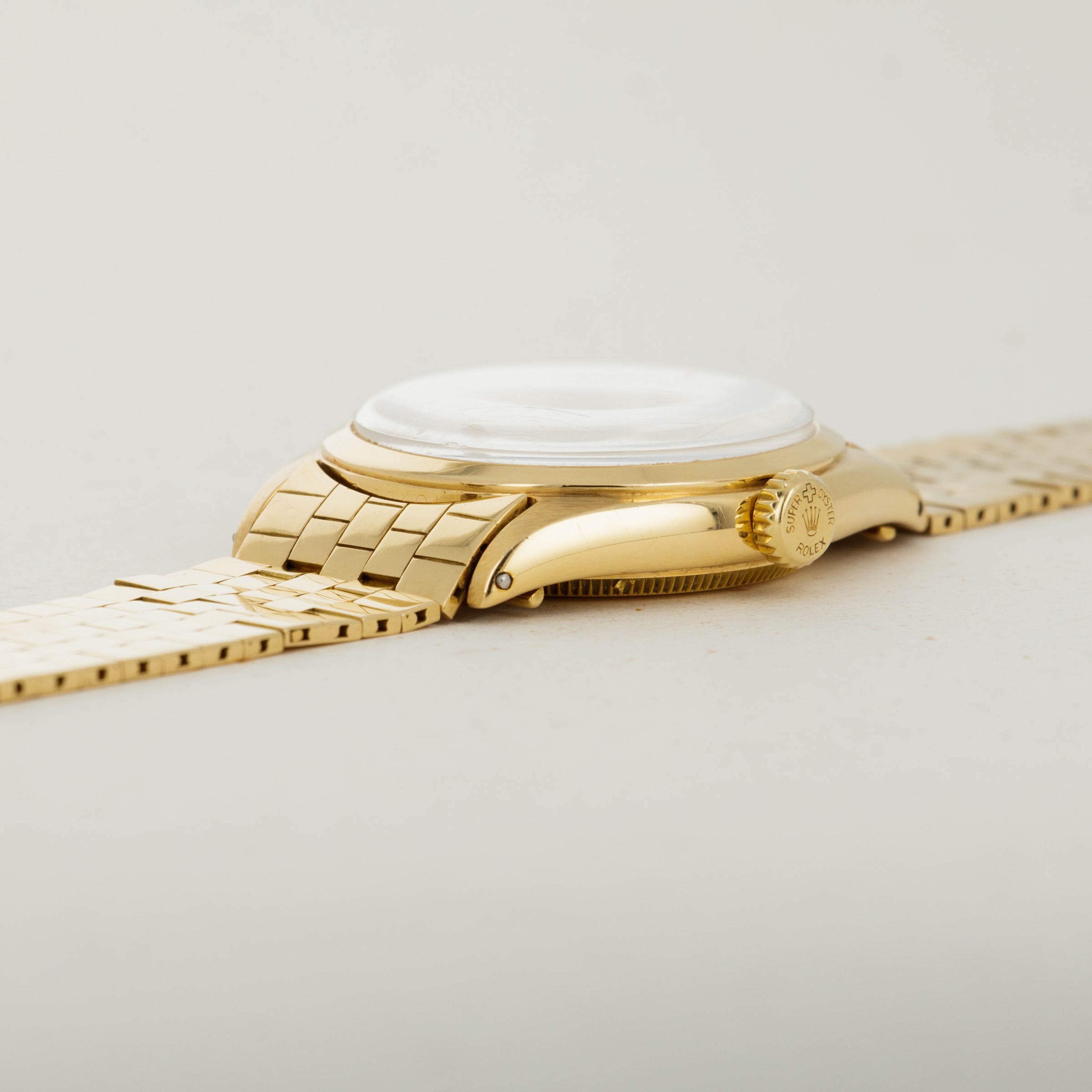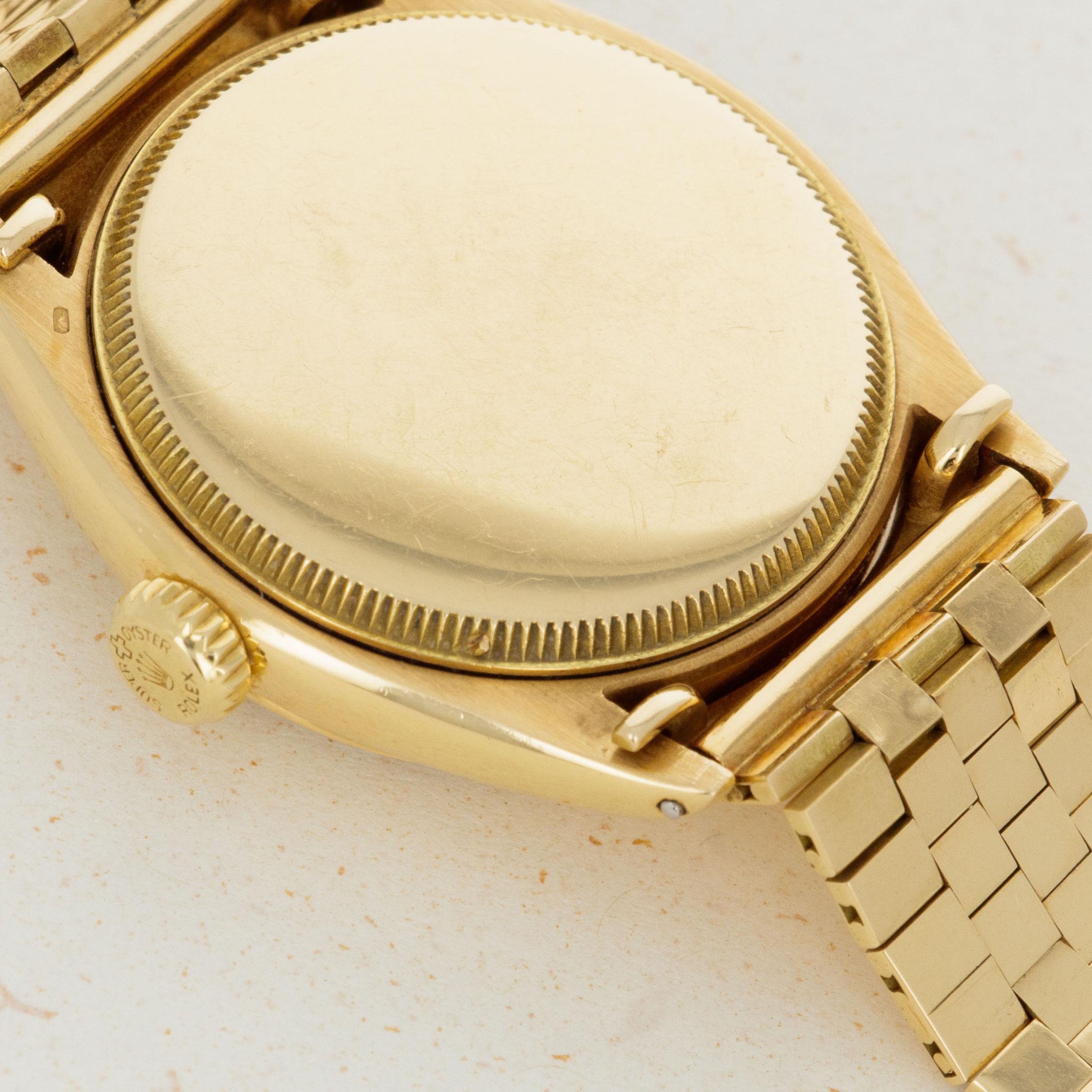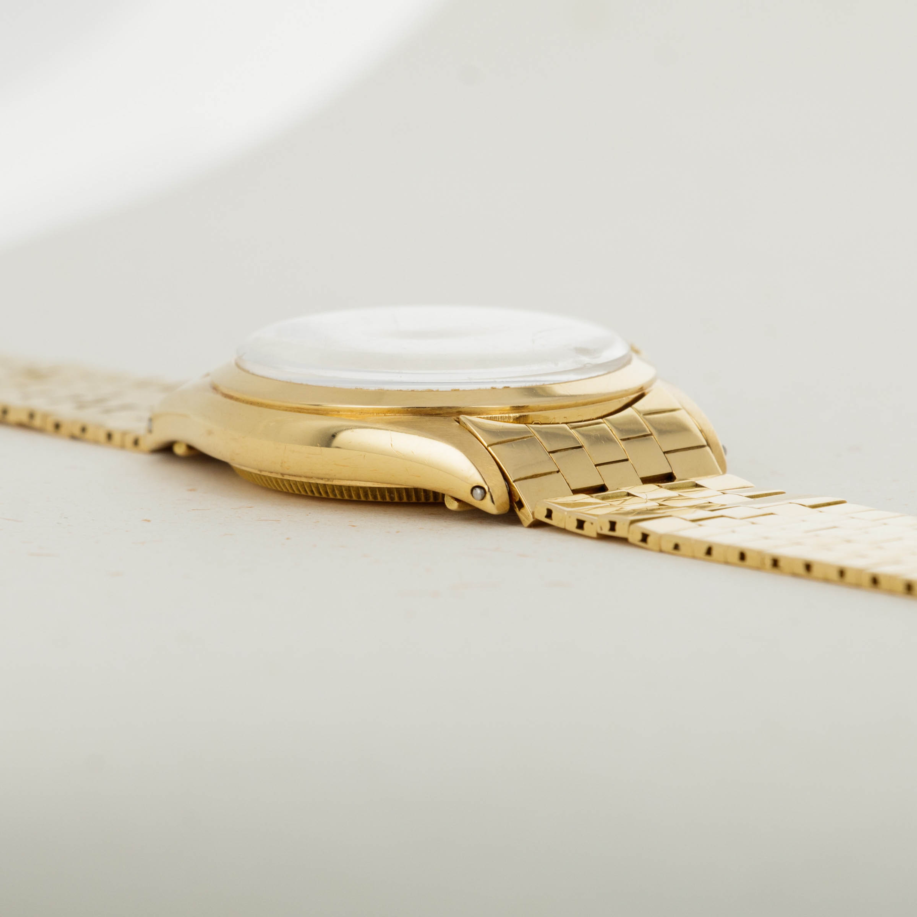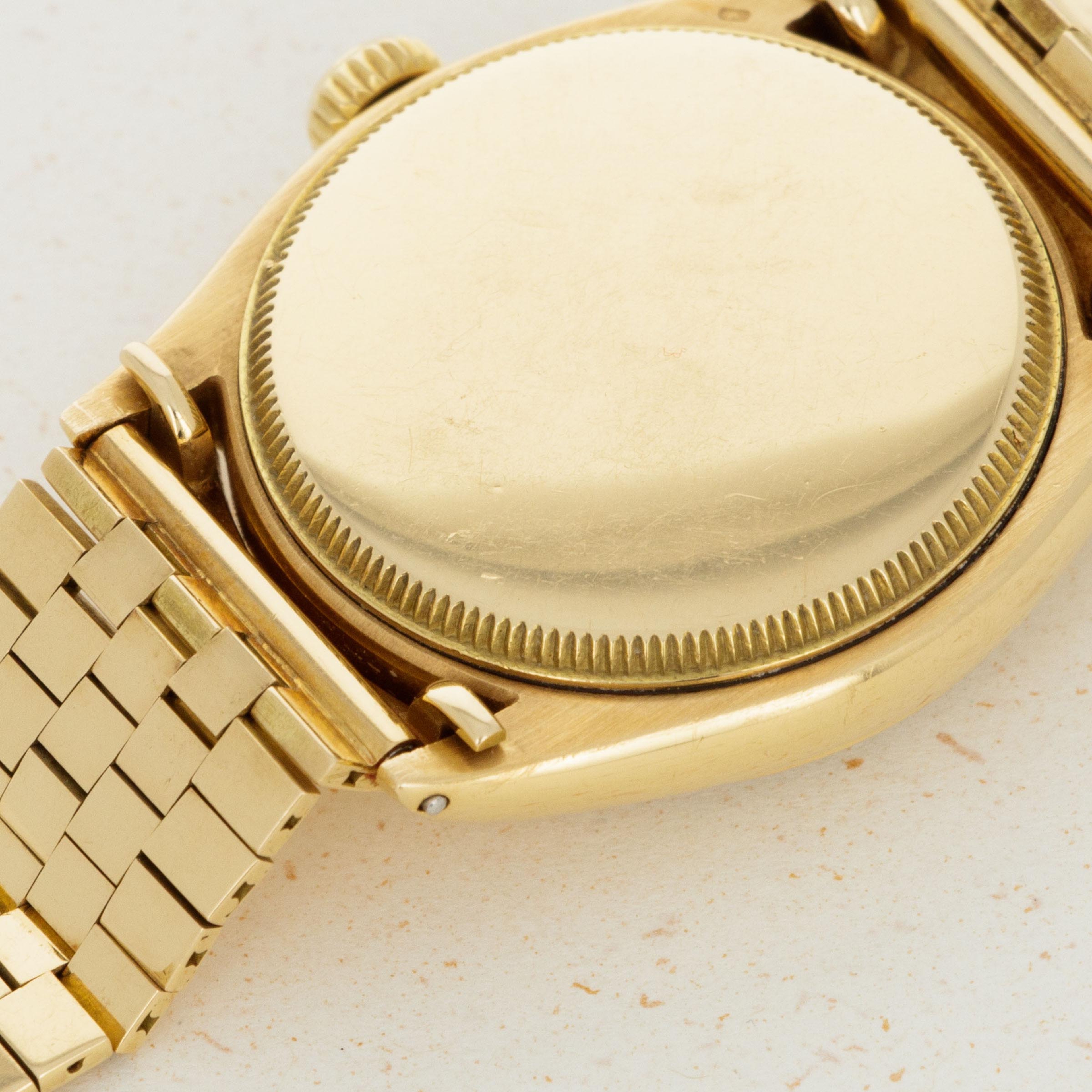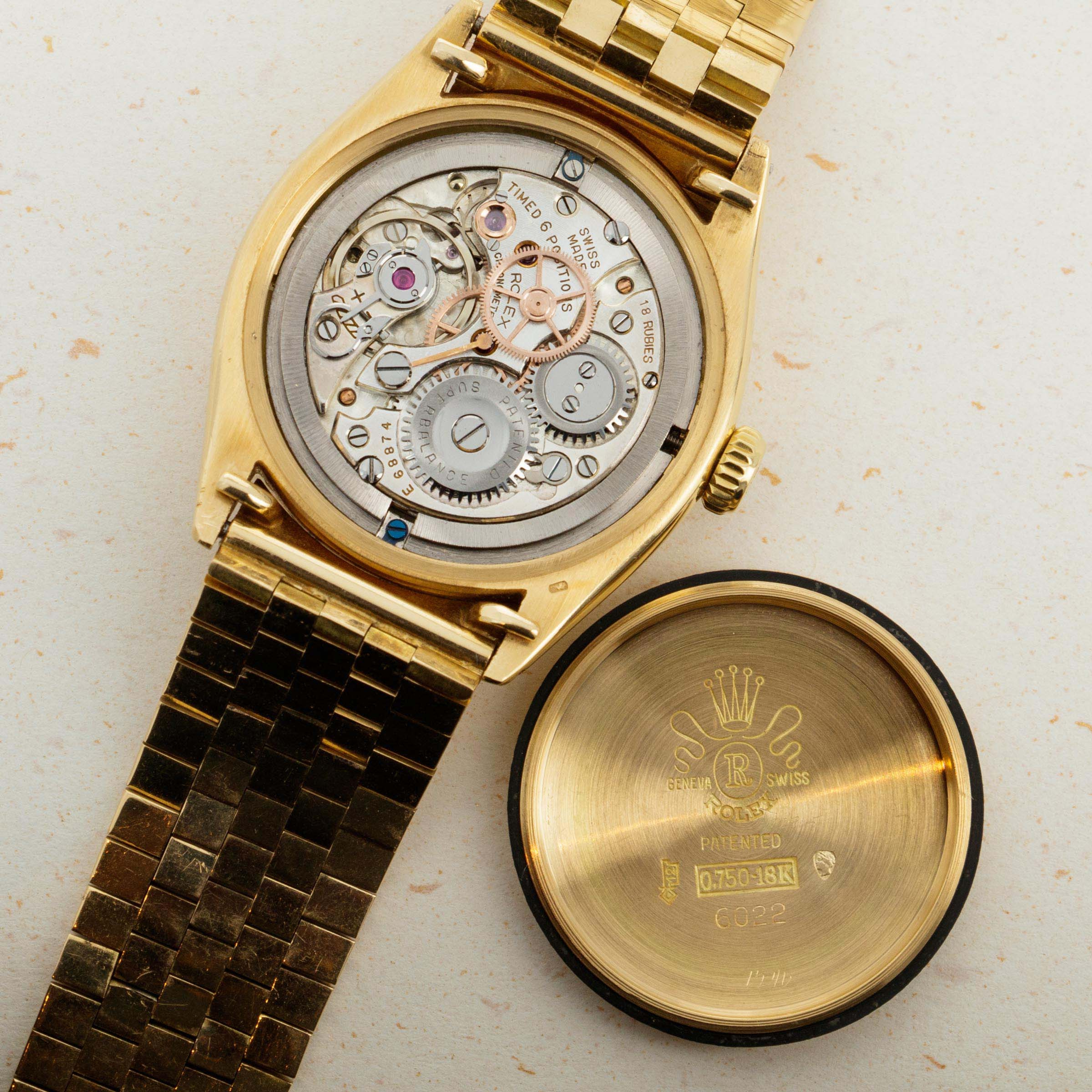 As part of its all-golden construction, this example sports a rare and intricate 14kt "brick" bracelet in lieu of the ref. 6022's restrained leather strap.