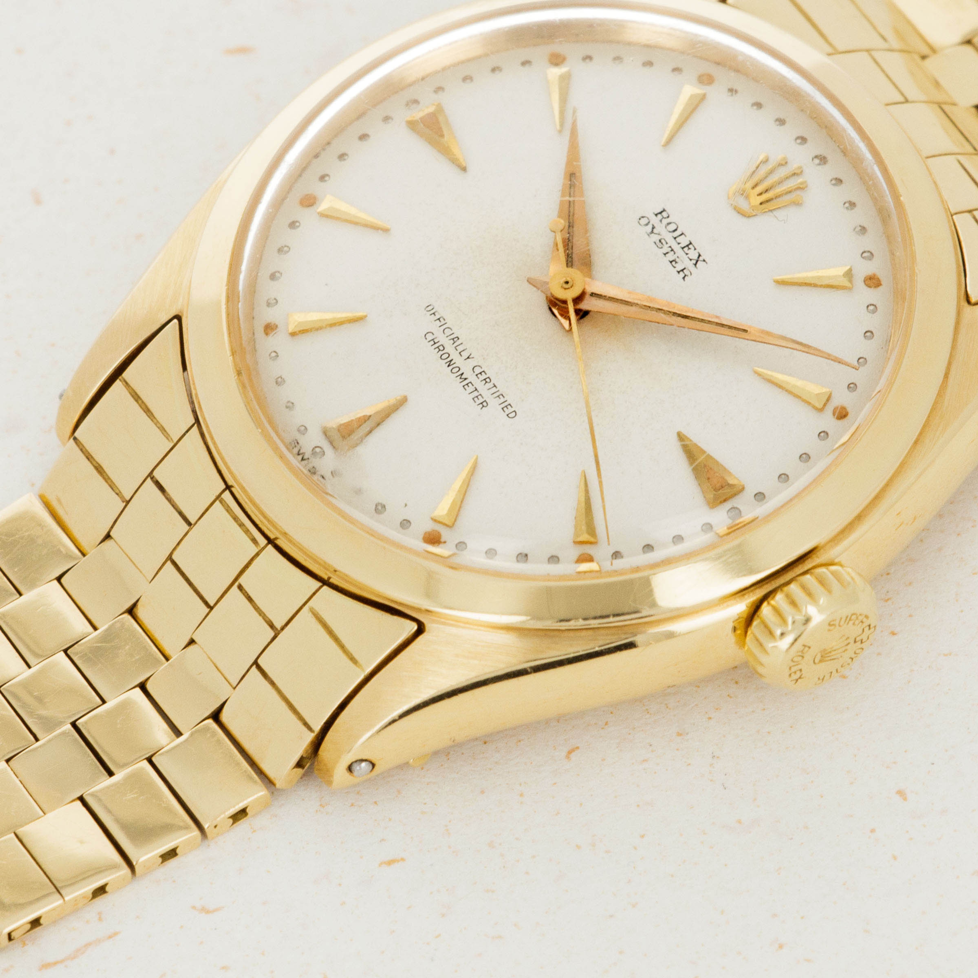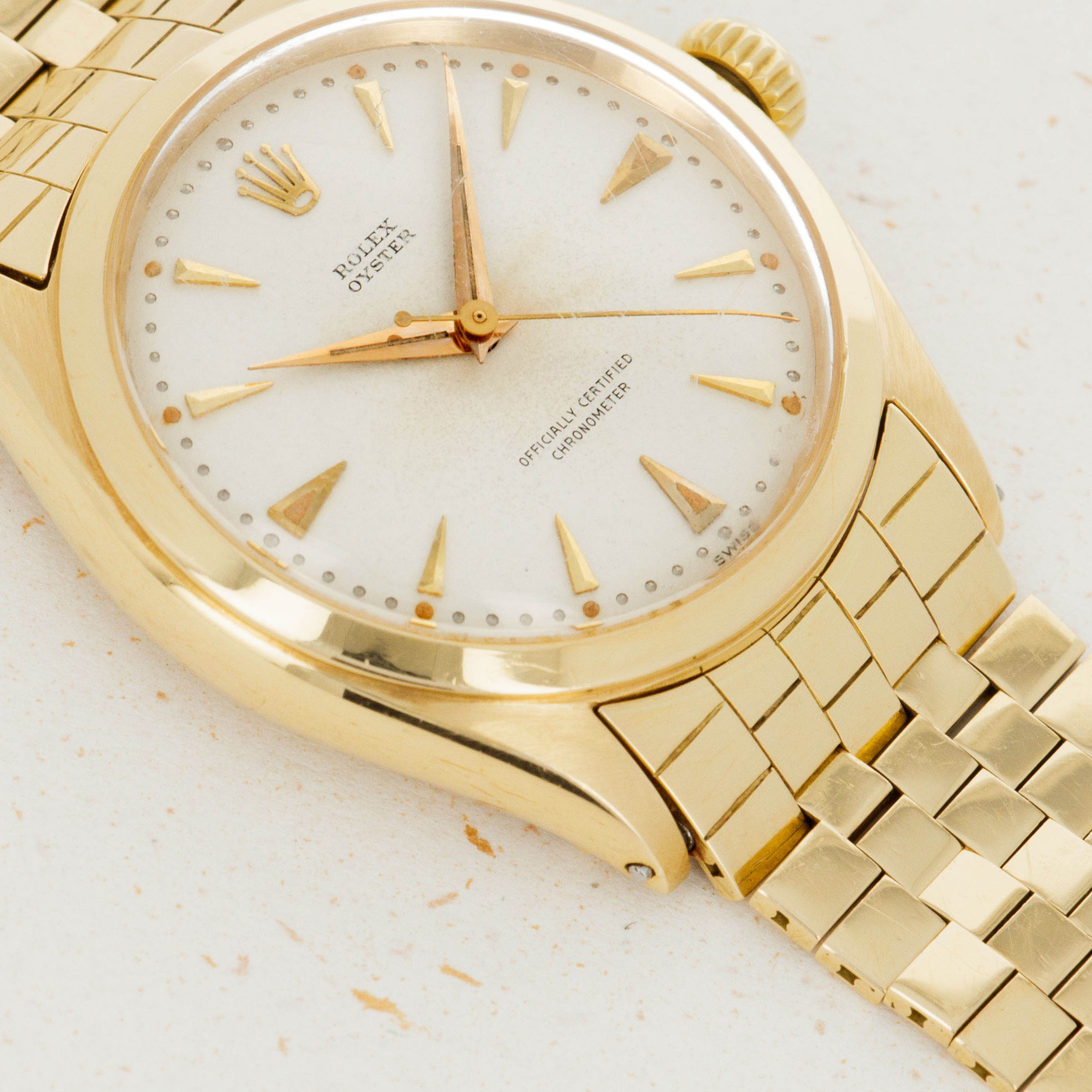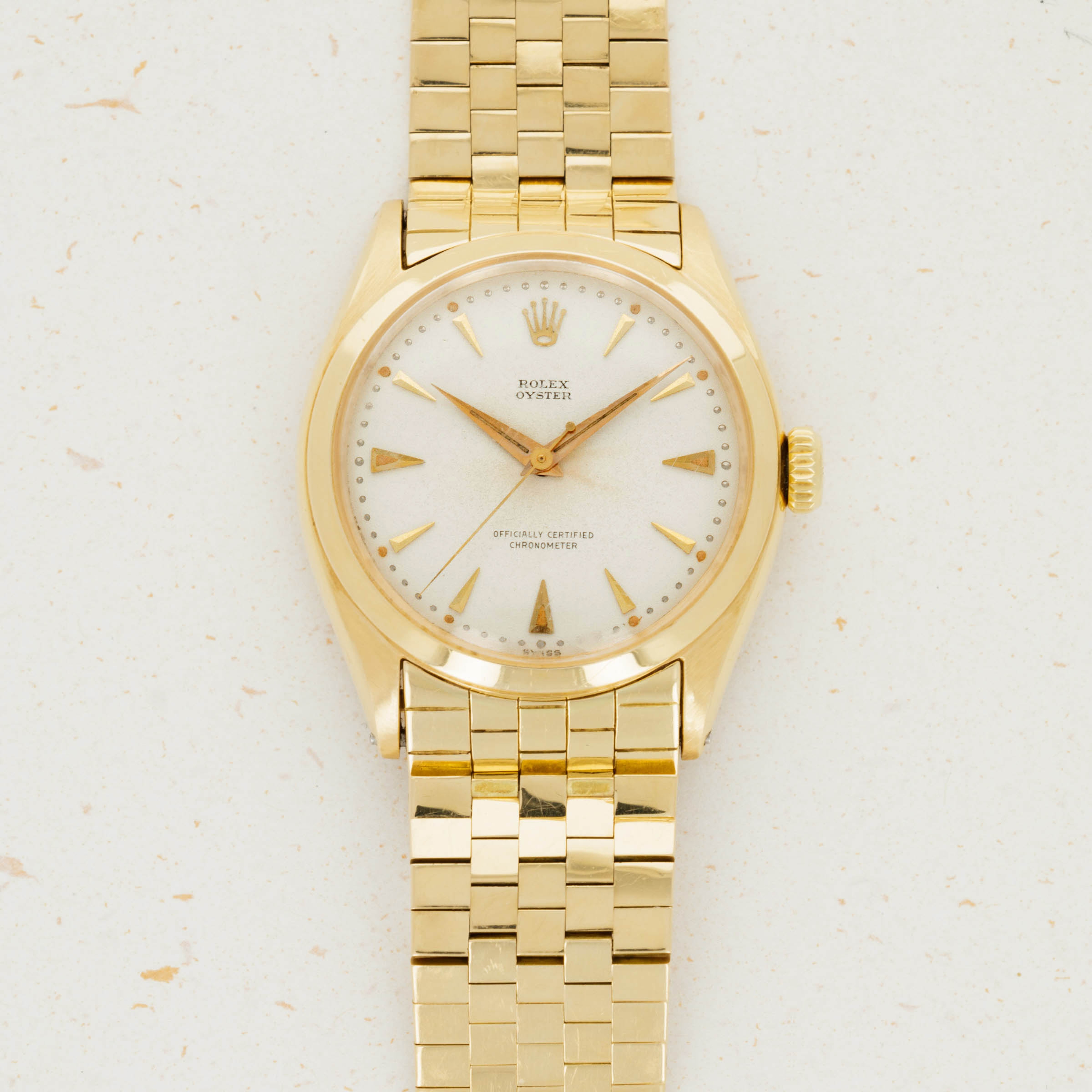An icon within the watchmaking industry, the Rolex Oyster is famed as the basis of nearly every sports model that Rolex has ever produced. With its screwdown crown and caseback, its Oyster case provided a rugged construction with impressive water resistance that was apt for the rough and tumble of daily life. Offered here we have a 1950s example of the Oyster ref. 6022. While typically offered as a stainless steel model, this variant sports an entirely 18kt yellow gold construction, with 18kt gold applied hour markers, a beautifully aged champagne dial and an intriucate, and rather rare, 'brick' bracelet. Powered by a chronometer rated manual wind movement, this example is a wonderful link to Rolex's puritan past and in the present example's condition, is ready to be enjoyed right away.