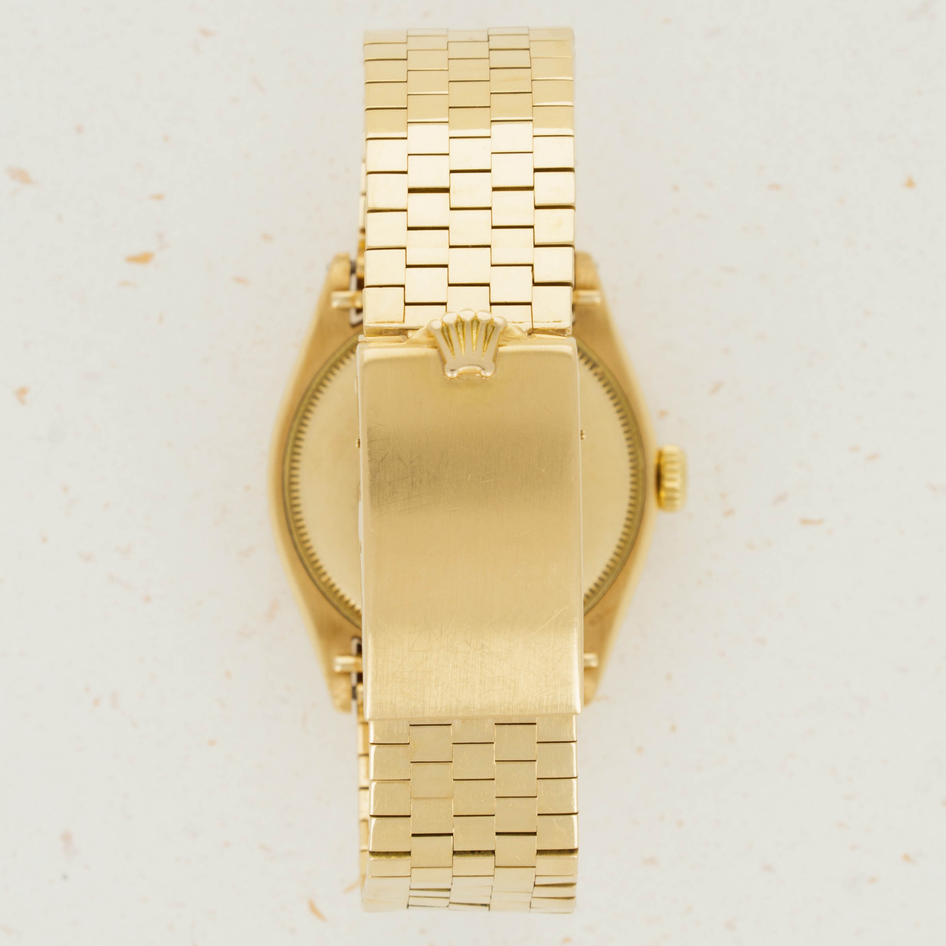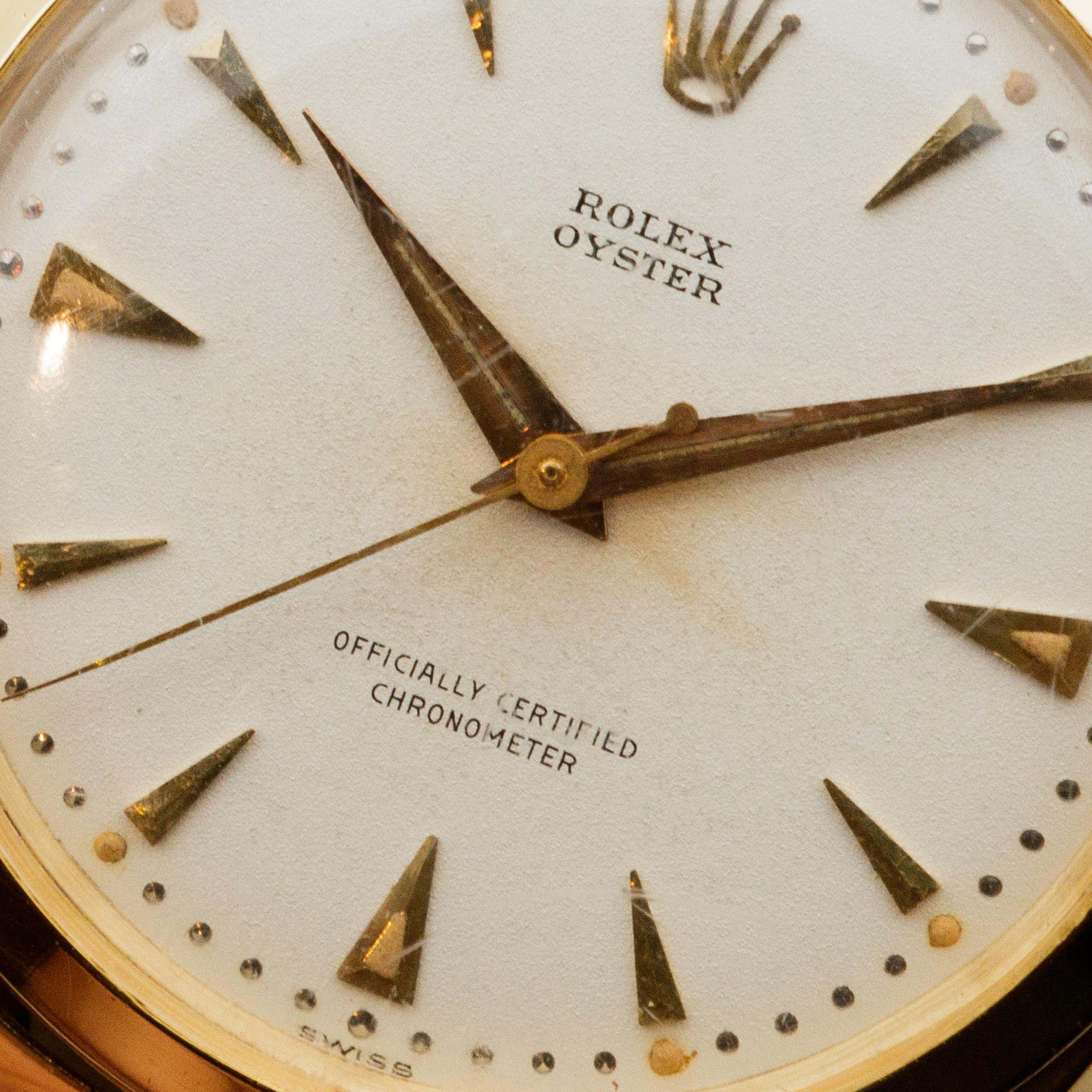 Featuring a beautifully aged champagne dial, this Oyster Perpetual sports triangular applied hour markers and sharp dauphine hands that match its golden construction beautifully.
