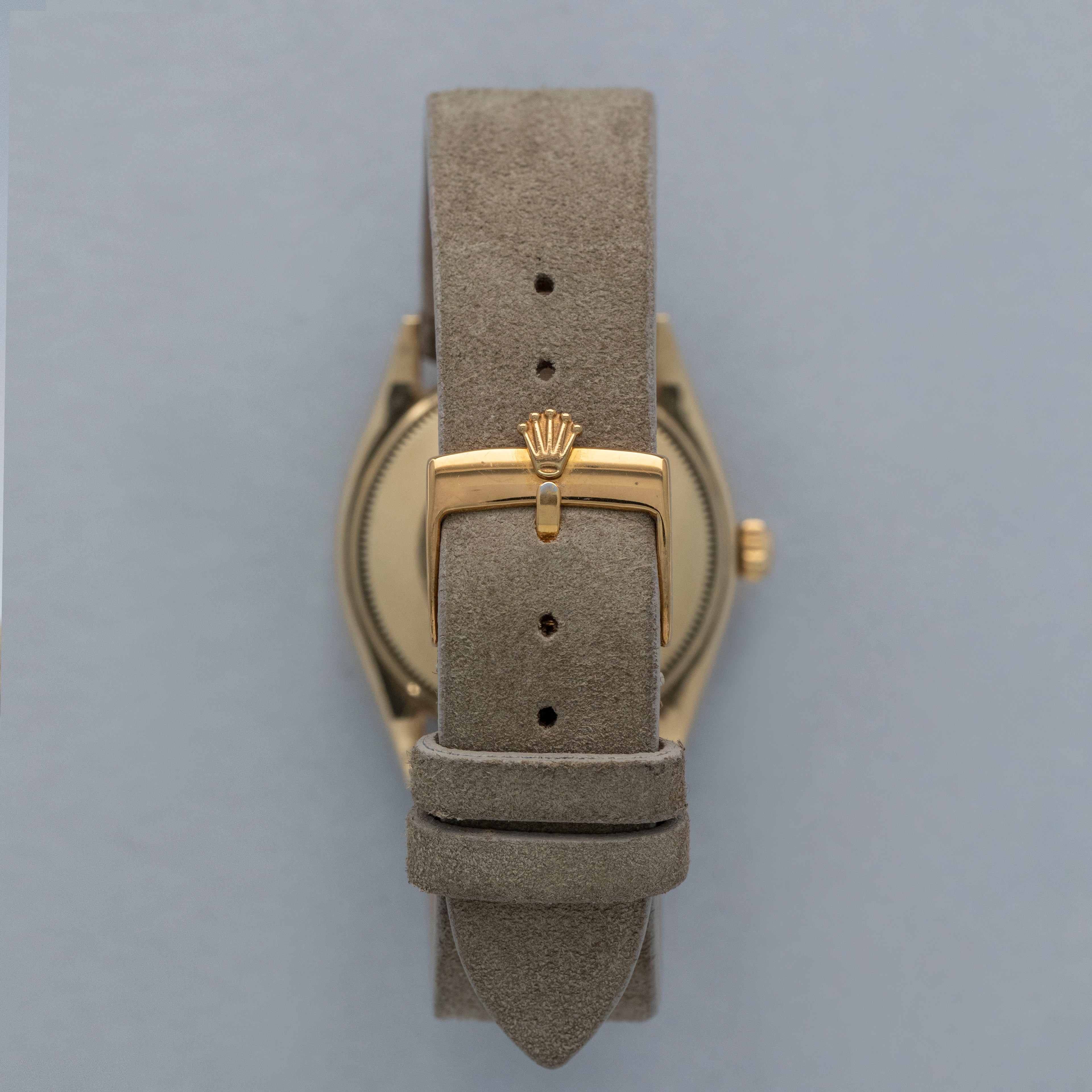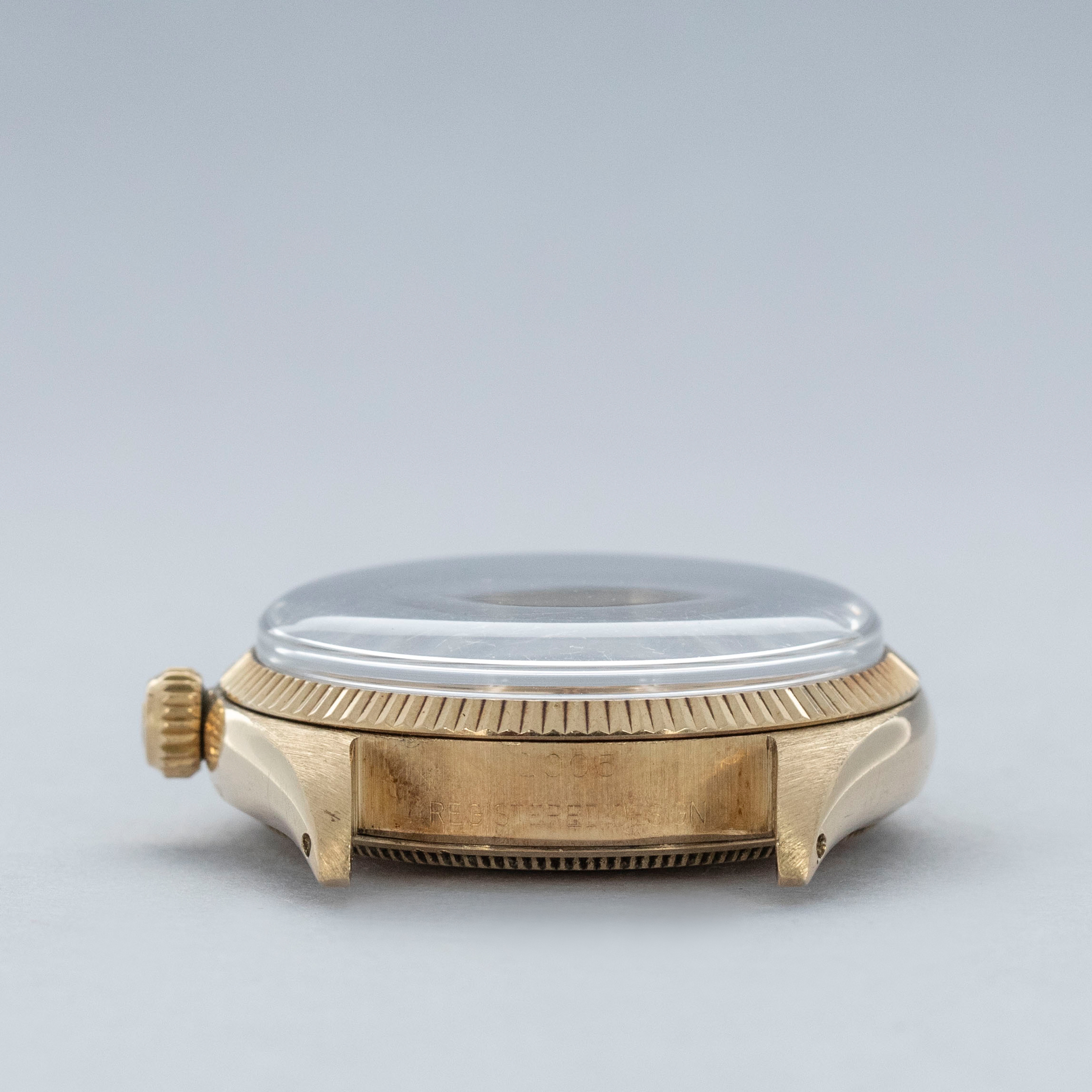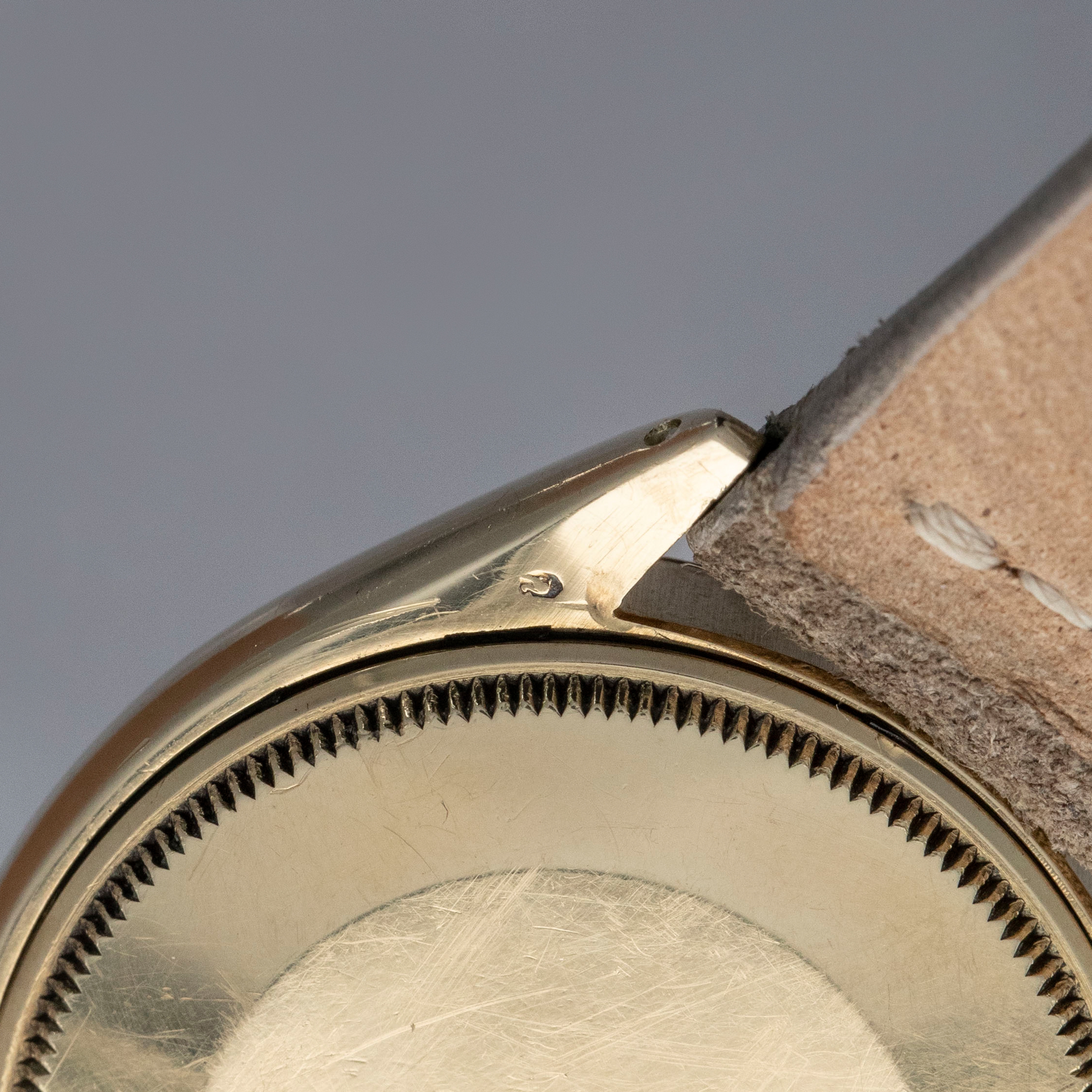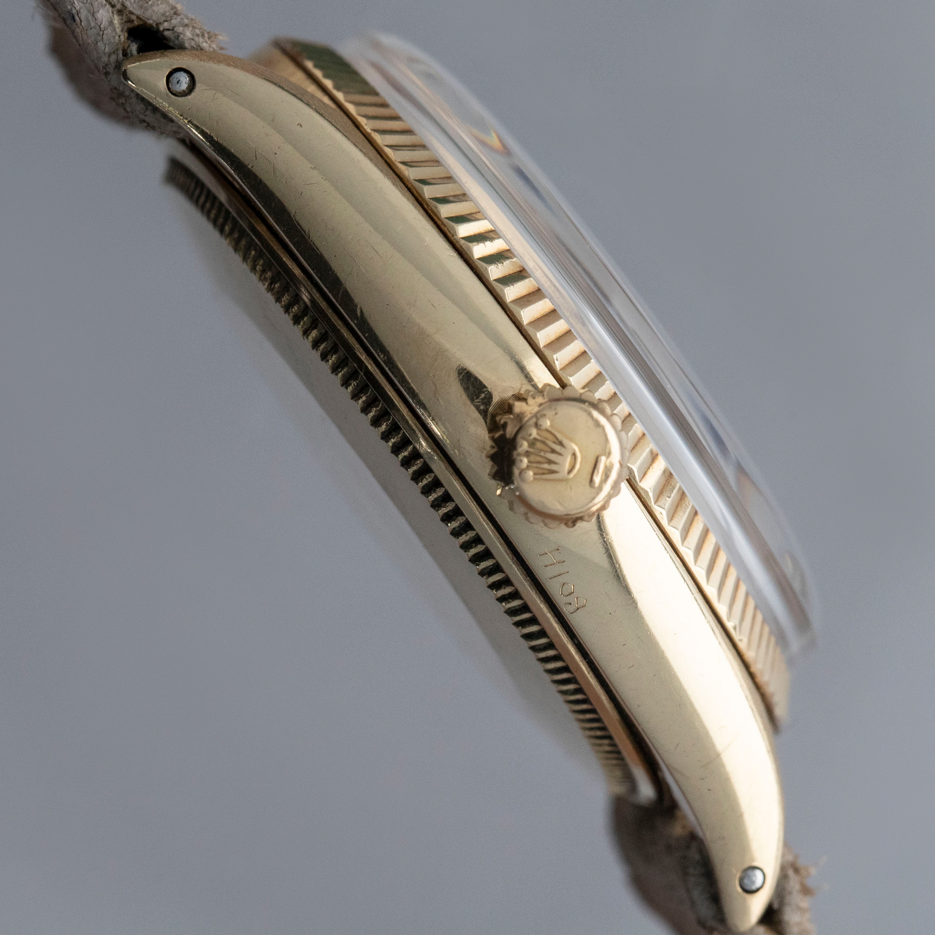Watch is in overall excellent condition. The yellow gold case shows light surface scratches and marks, with evidence of a previous polish. A legible hallmark remains visible on the back of the lower left lug, and what appears to be a stock number is engraved on the crown side of the case. The fluted bezel remains well defined, while the case back shows a couple of deeper nicks along the edge. The champagne dial remains excellent, with some discoloration visible on the applied hour markers and light oxidation on the dagger hands. It is fitted with a brown leather strap and a gold-plated Rolex pin buckle with light marks. The buckle is stainless steel and was plated at some point. (Not done by Rolex)