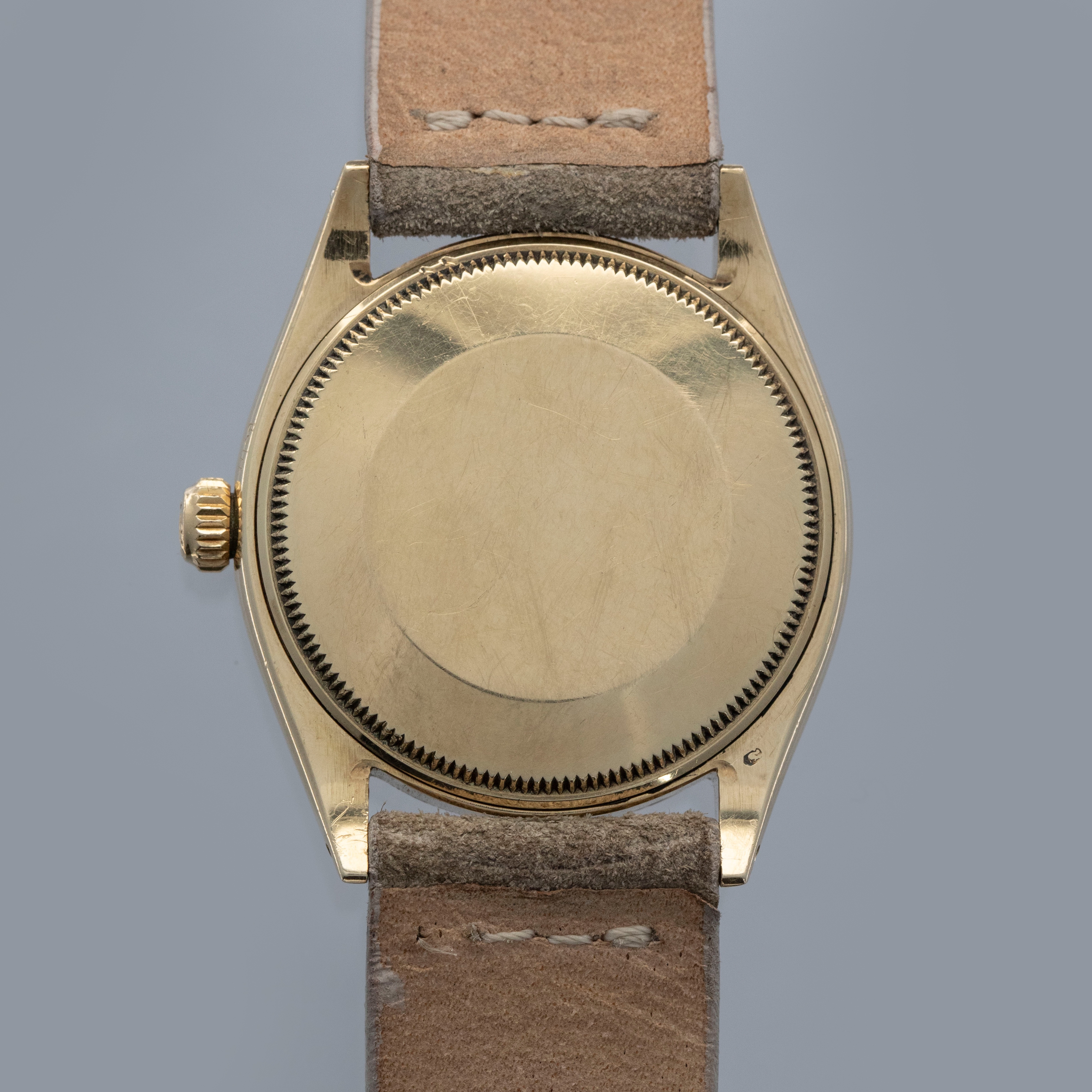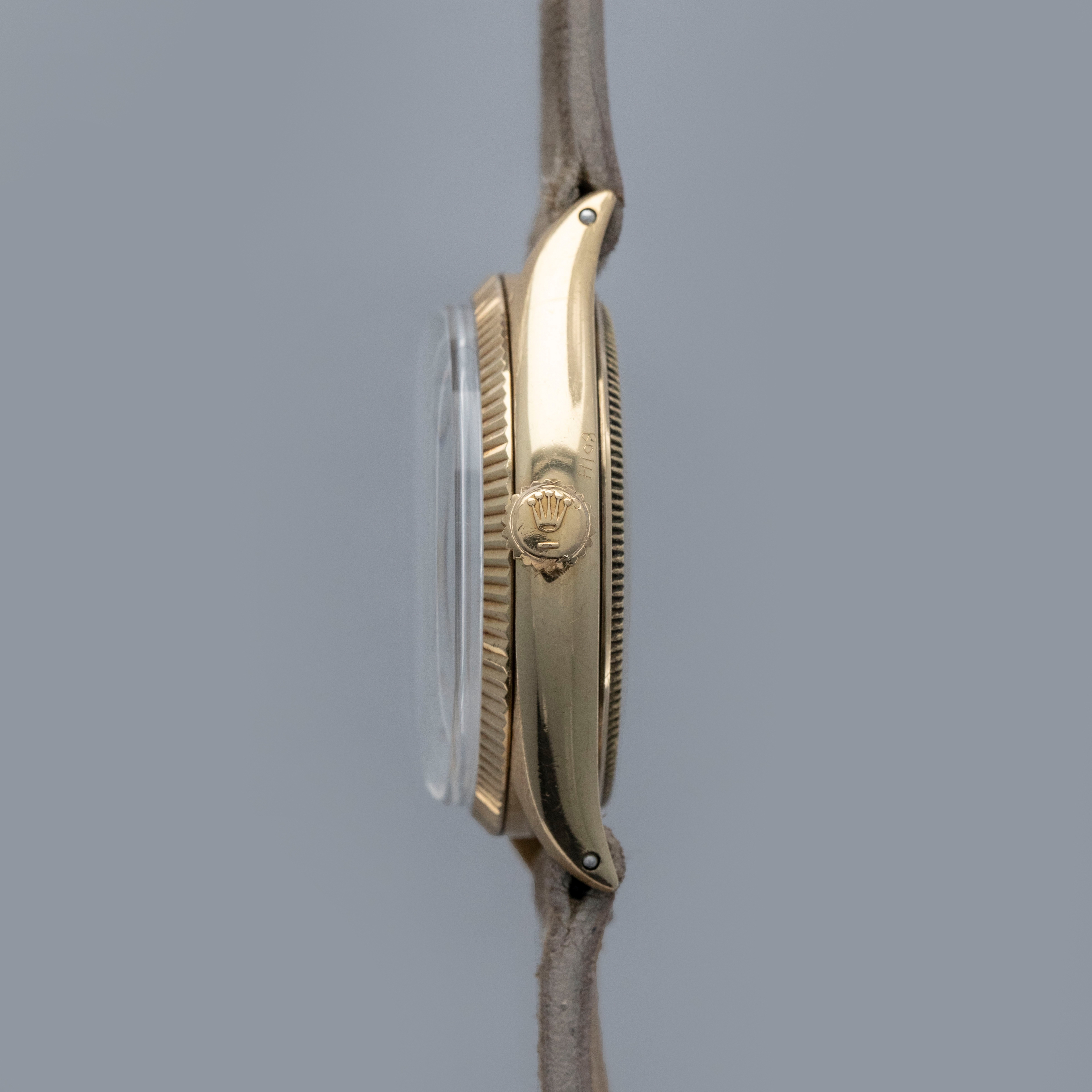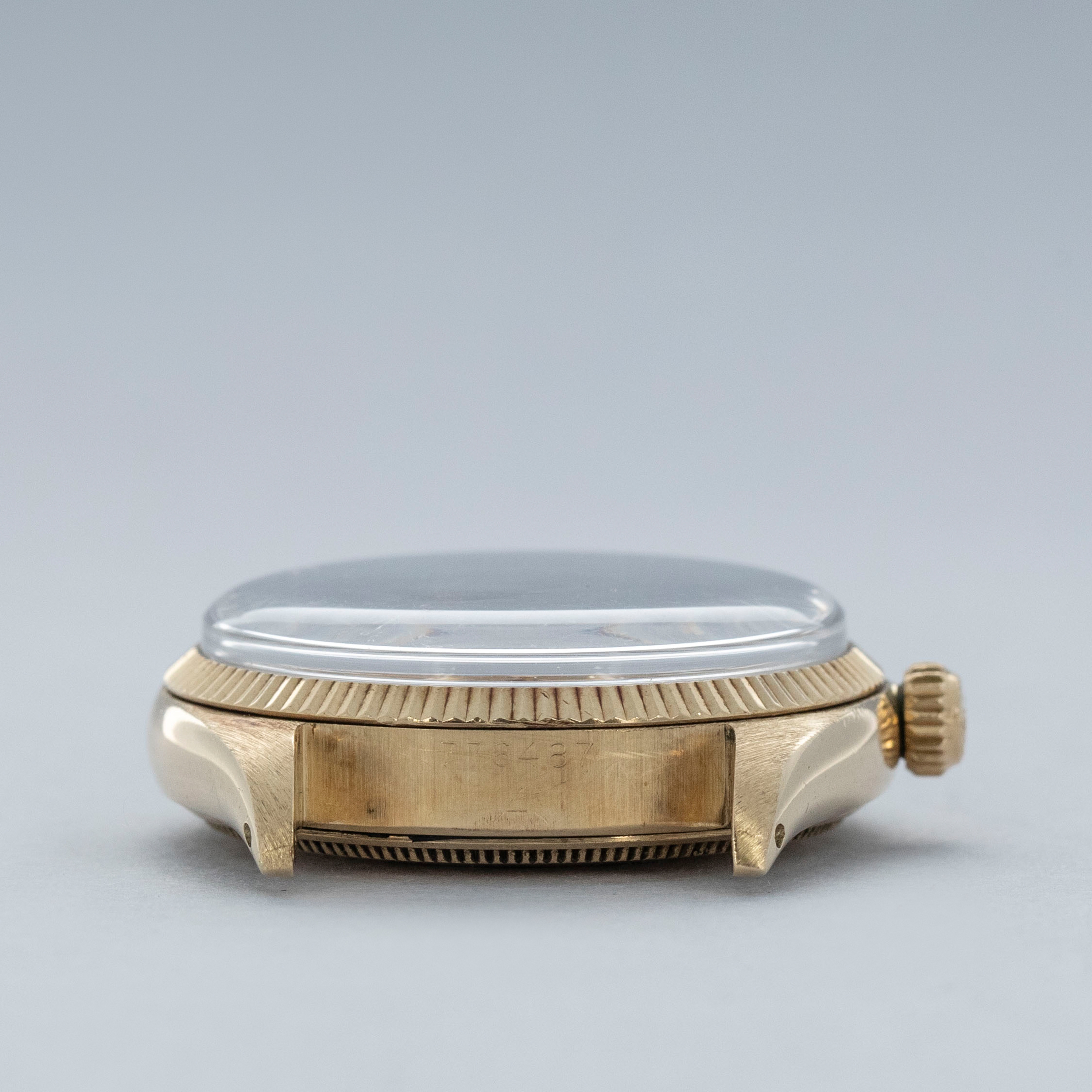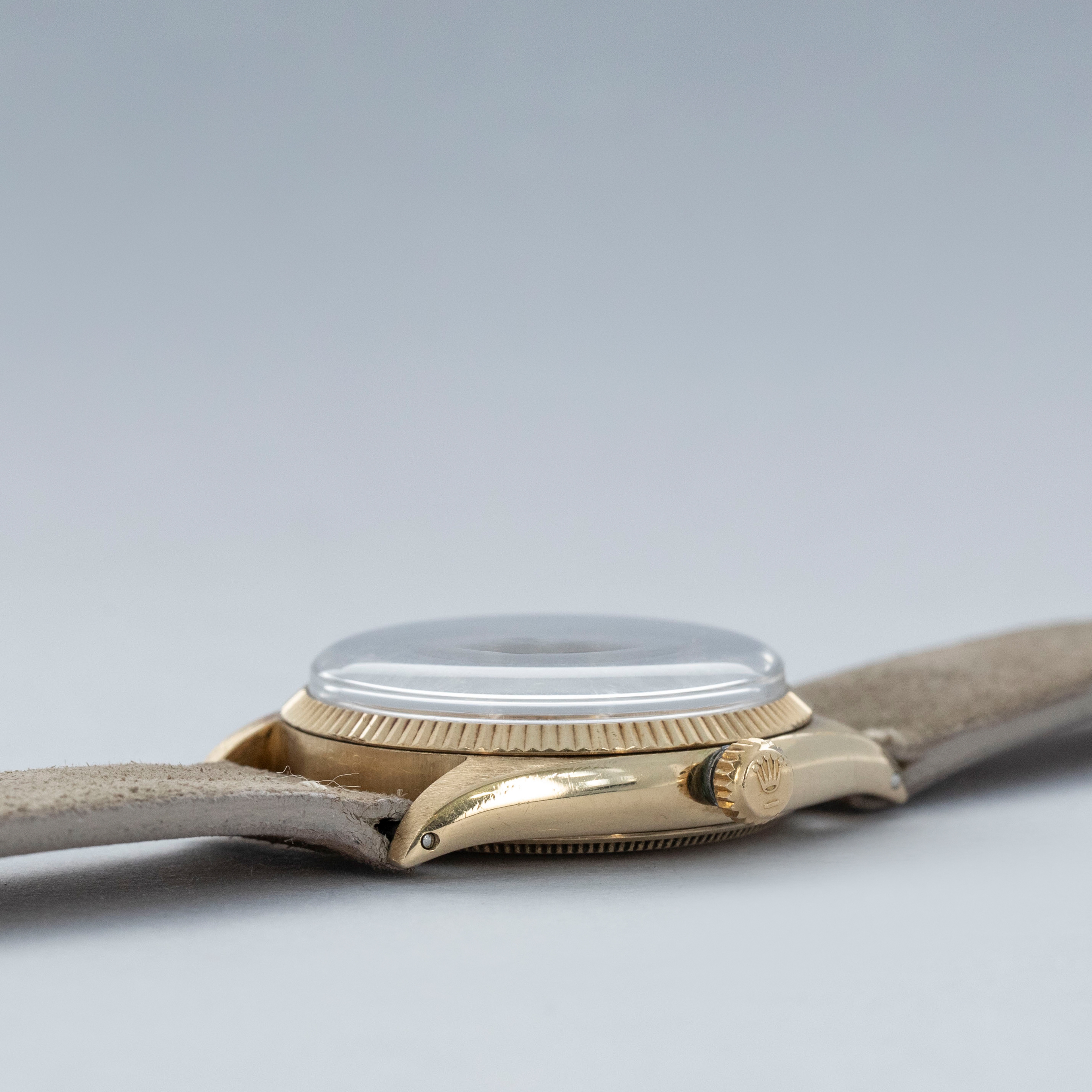 Watch is in overall excellent condition. The yellow gold case shows light surface scratches and marks, with evidence of a previous polish. A legible hallmark remains visible on the back of the lower left lug, and what appears to be a stock number is engraved on the crown side of the case. The fluted bezel remains well defined, while the case back shows a couple of deeper nicks along the edge. The champagne dial remains excellent, with some discoloration visible on the applied hour markers and light oxidation on the dagger hands. It is fitted with a brown leather strap and a gold-plated Rolex pin buckle with light marks. The buckle is stainless steel and was plated at some point. (Not done by Rolex)