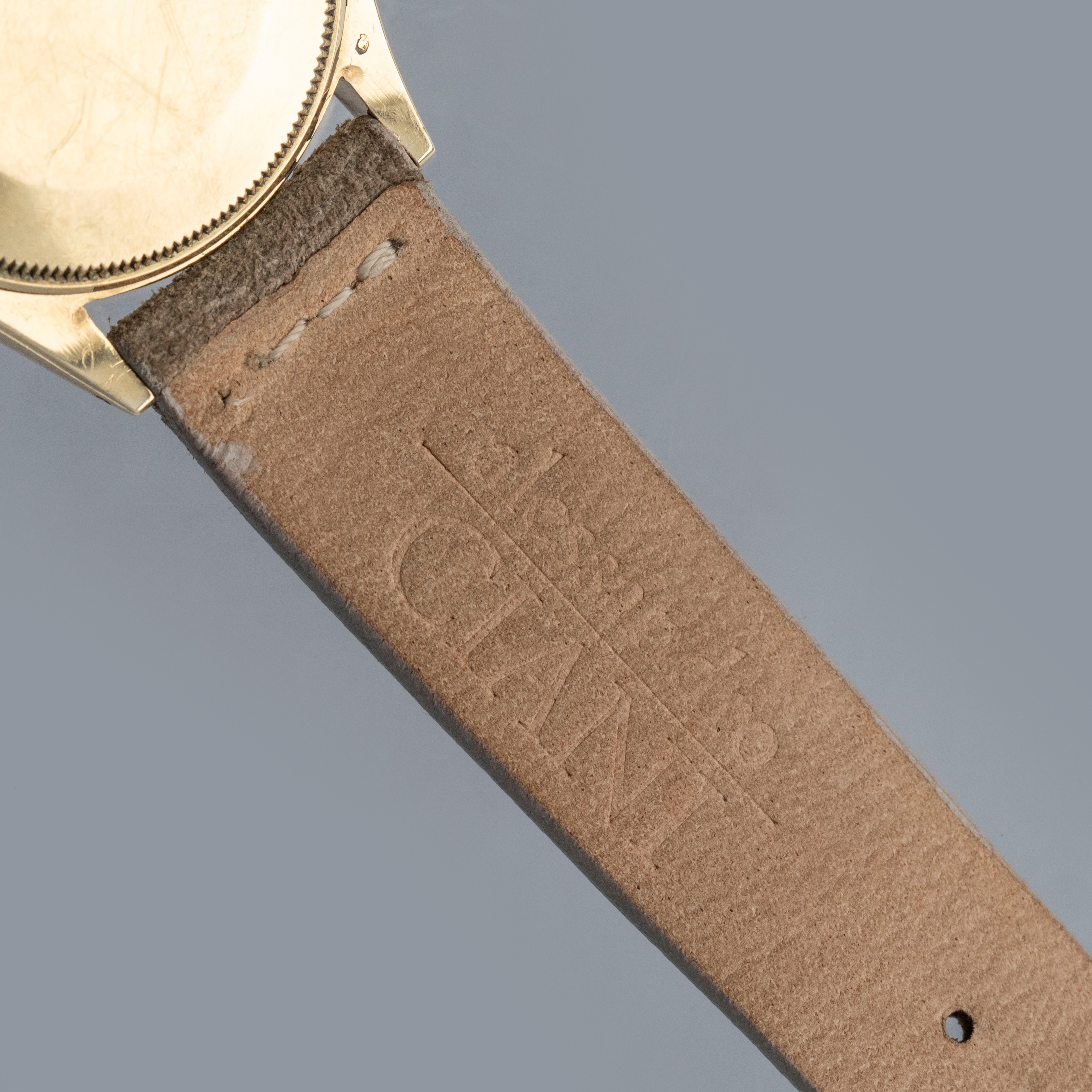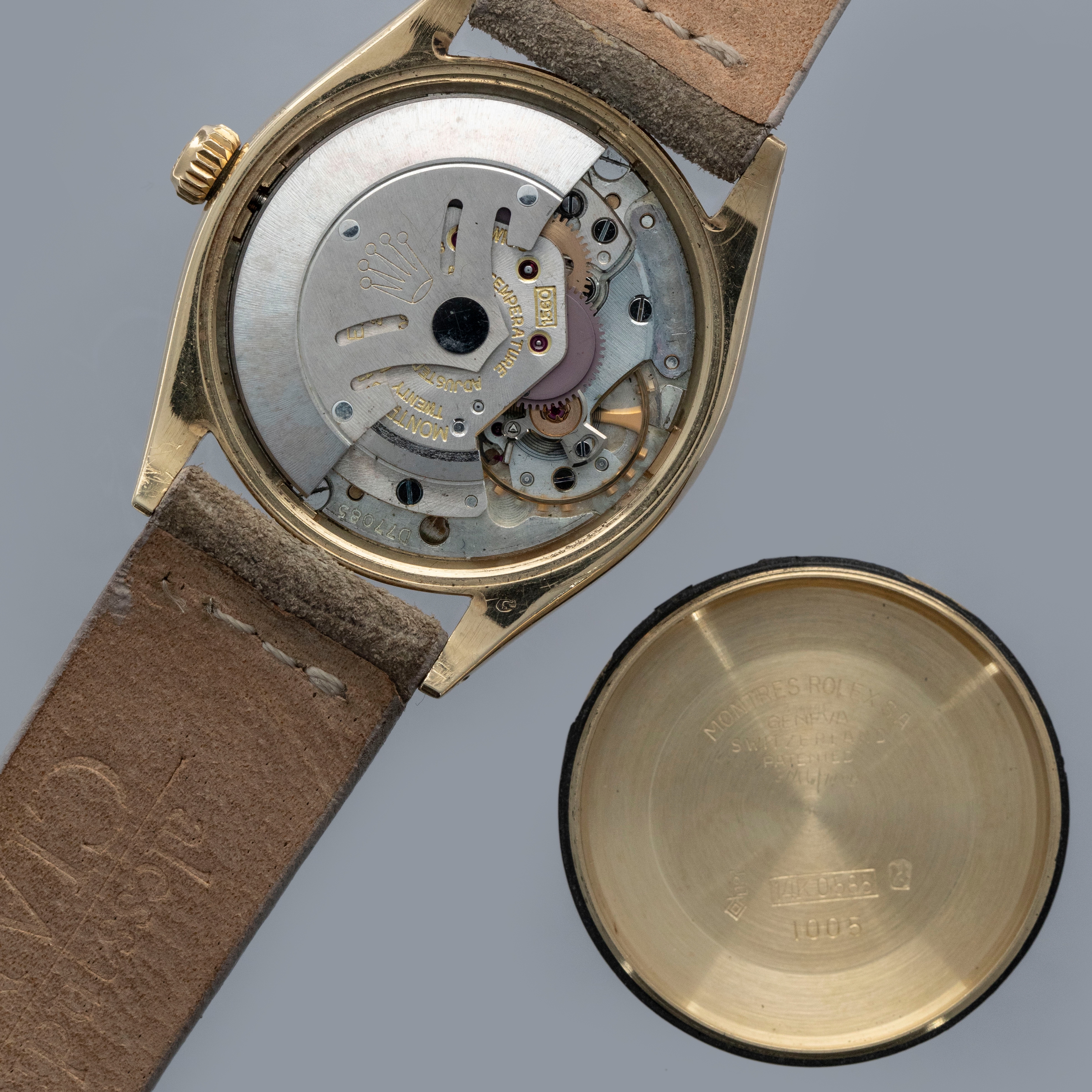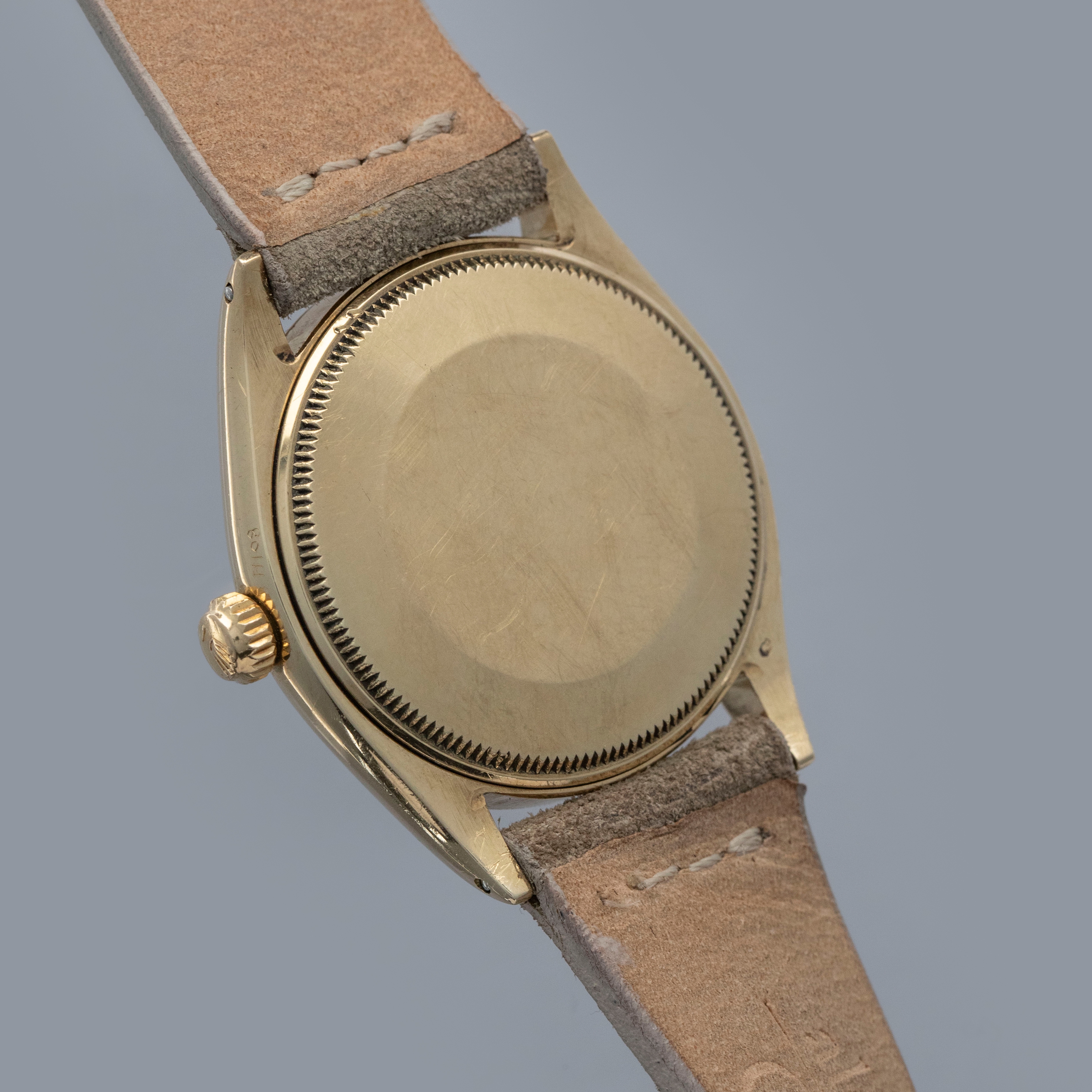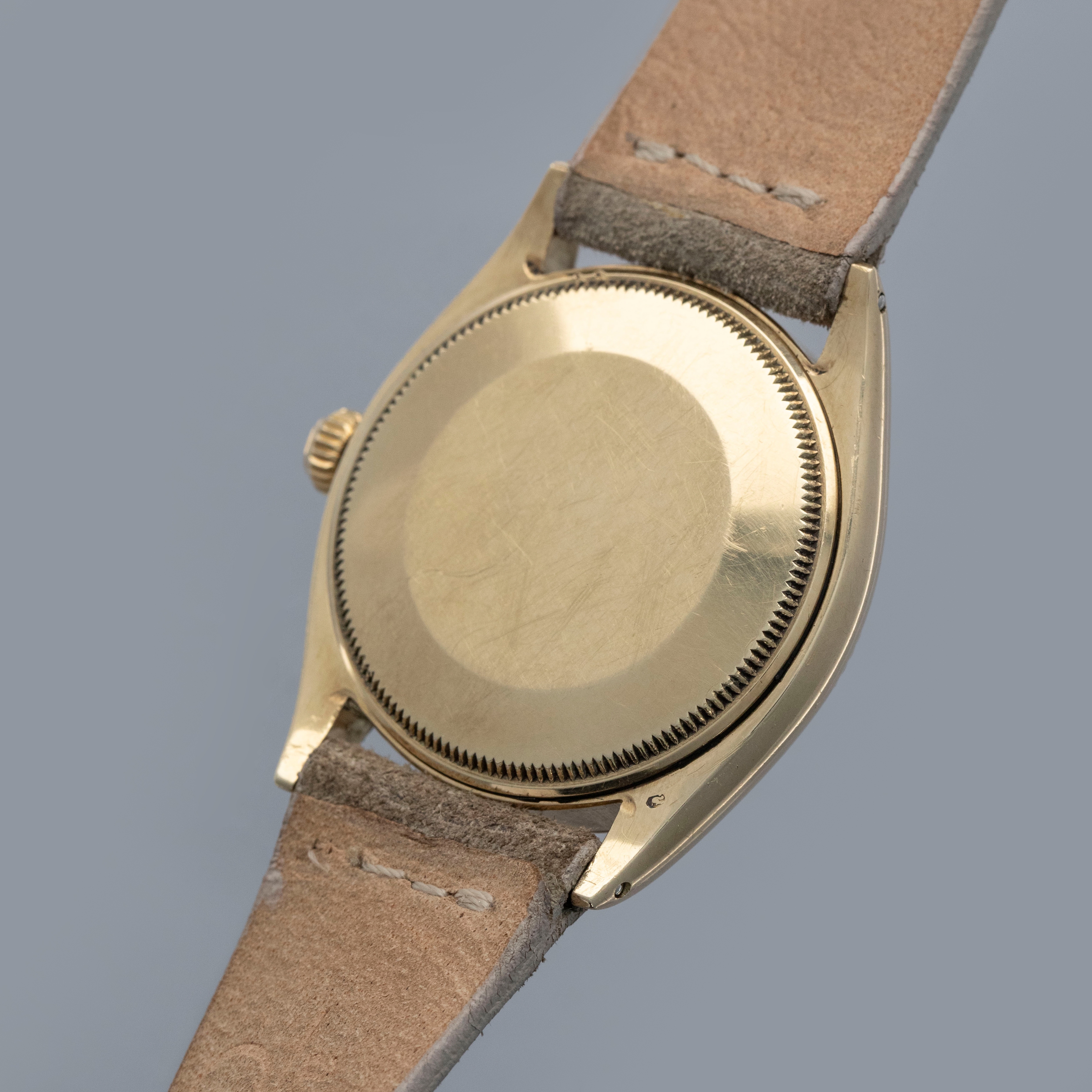 Watch is in overall excellent condition. The yellow gold case shows light surface scratches and marks, with evidence of a previous polish. A legible hallmark remains visible on the back of the lower left lug, and what appears to be a stock number is engraved on the crown side of the case. The fluted bezel remains well defined, while the case back shows a couple of deeper nicks along the edge. The champagne dial remains excellent, with some discoloration visible on the applied hour markers and light oxidation on the dagger hands. It is fitted with a brown leather strap and a gold-plated Rolex pin buckle with light marks. The buckle is stainless steel and was plated at some point. (Not done by Rolex)