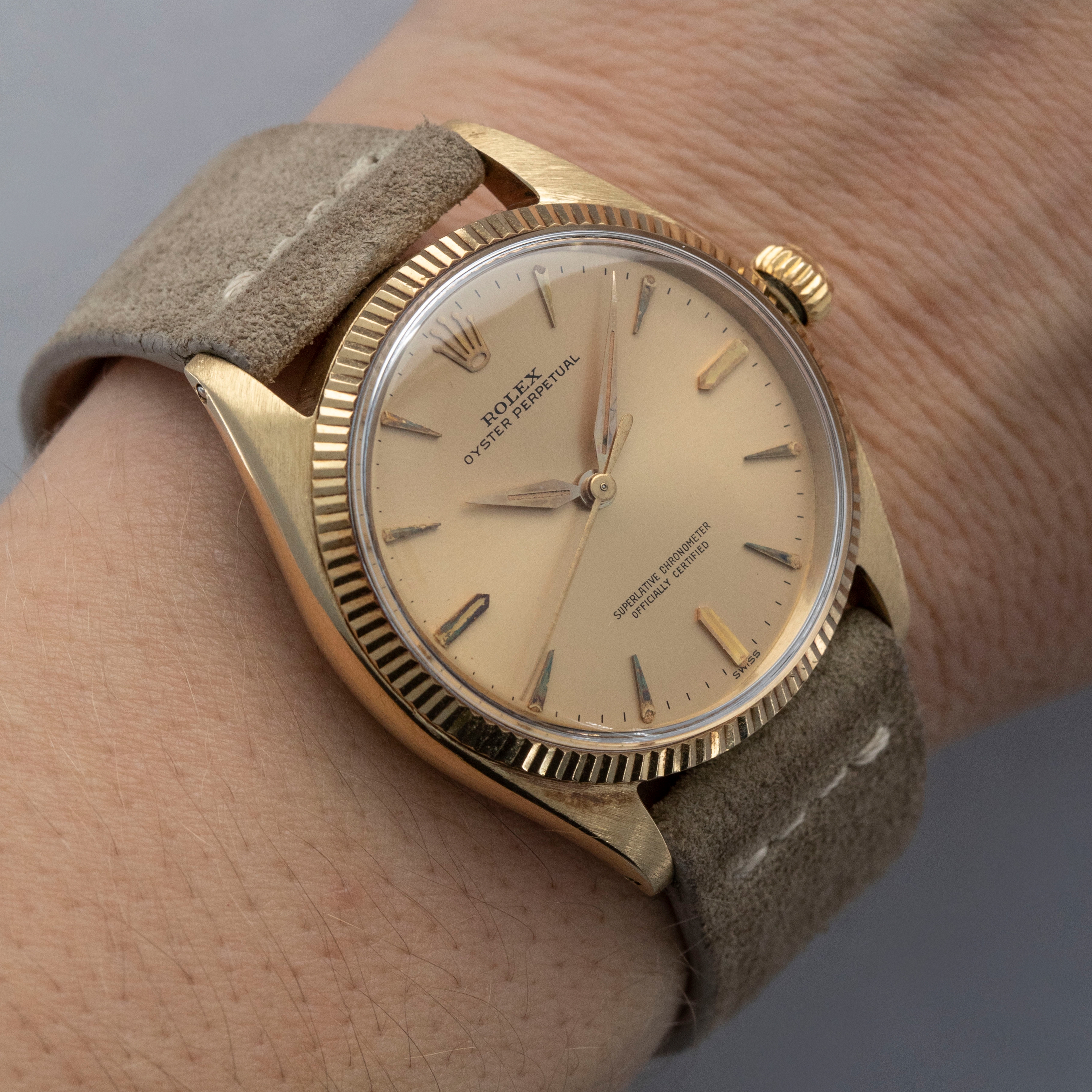 Offered since the 1930s, the Oyster Perpetual has come to define Rolex aesthetic and technical achievements in just about every way possible. Initially offered as the watch that merged Rolex’s hermetically sealed and waterproof Oyster case design and their automatic movements, the Oyster Perpetual has grown into the foundation of everything Rolex produces. Now the starting point of so many other collections, it is the Oyster Perpetual that marks each collection’s beginning. With a long and storied past, it serves as no surprise that the Oyster Perpetual has sported an incredible litany of case designs, dial designs, construction materials, and everything else that could vary in a watch. As such, what we have here is the Oyster Perpetual cal. 1005, produced between 1959 and the late 1980s. Made of 18kt yellow gold and measuring 34mm in diameter, it sports a gorgeous champagne dial complete with applied gold indices and gold hands that really set off its luxurious aesthetic. Harboring vintage appeal through its dial and size, the Oyster Perpetual ref. 1005 feels perfectly contemporary on the wrist for those used to 34mm watches, such is the Oyster Perpetual’s staying power and the consistency of its blueprint in Rolex’s catalog over the several decades it has been around.