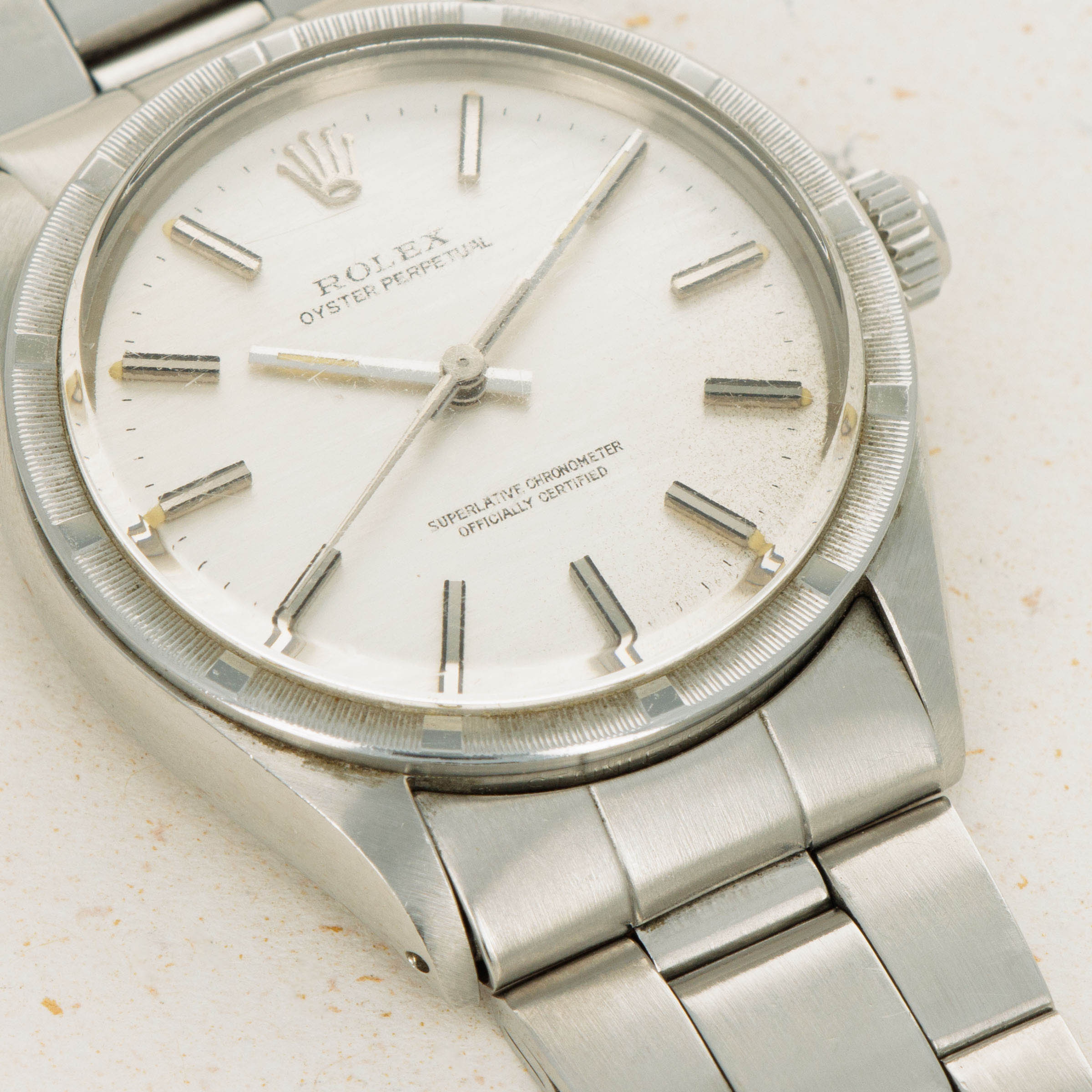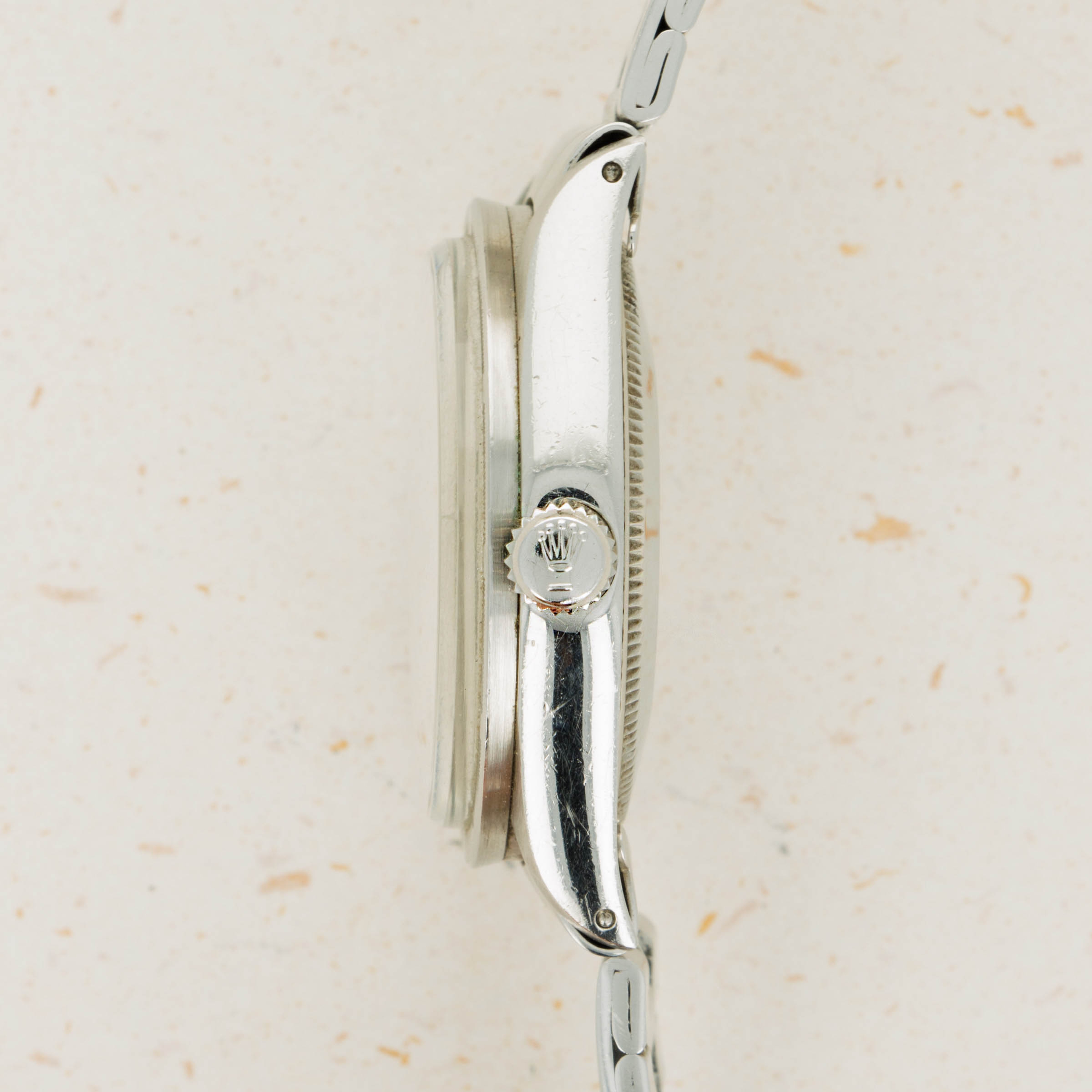 Featuring an uncluttered silver dial, the Oyster Perpetual's time-only display allows it to remain as timeless as ever with its applied hour markers, subtle texture and aged luminous providing a small hint into its age.