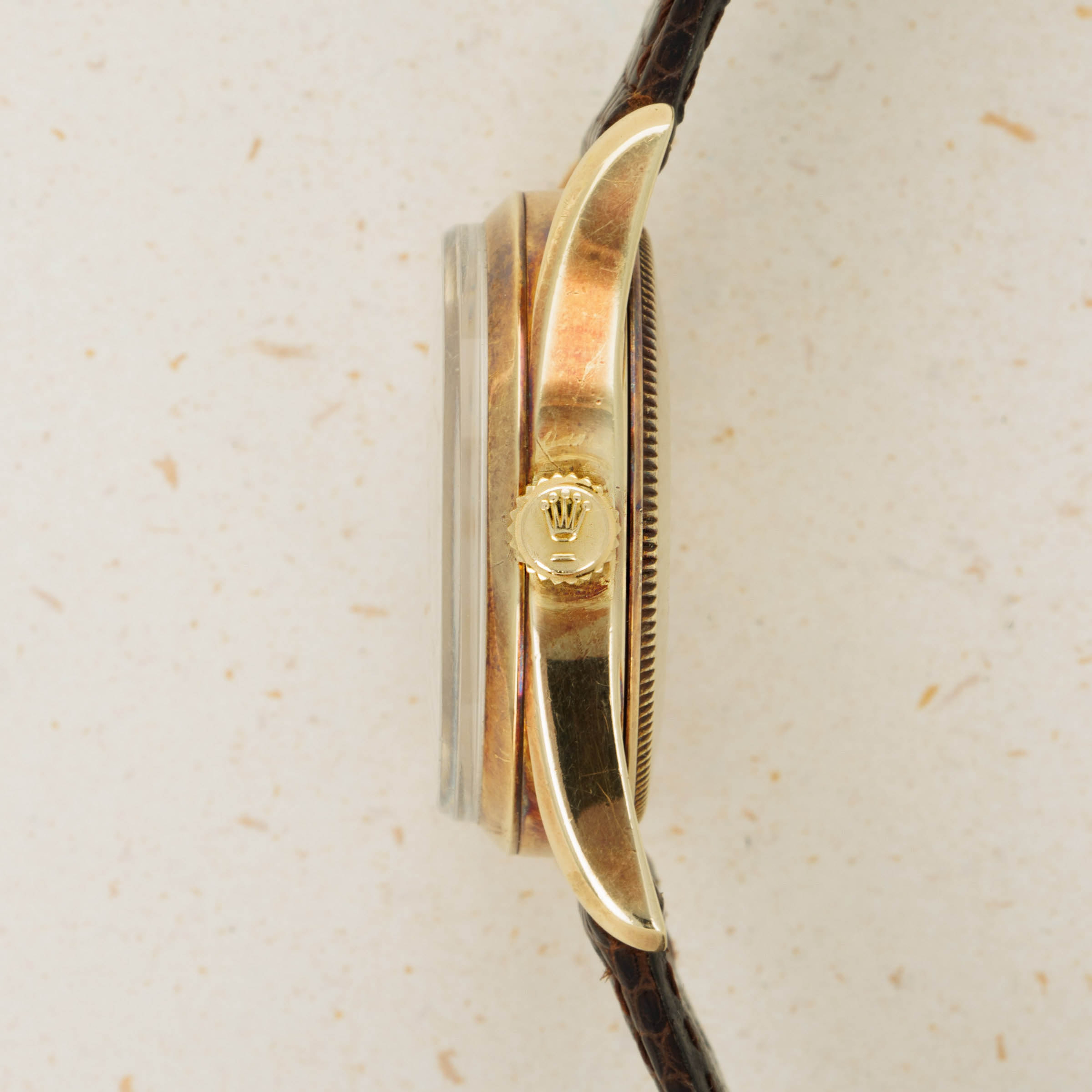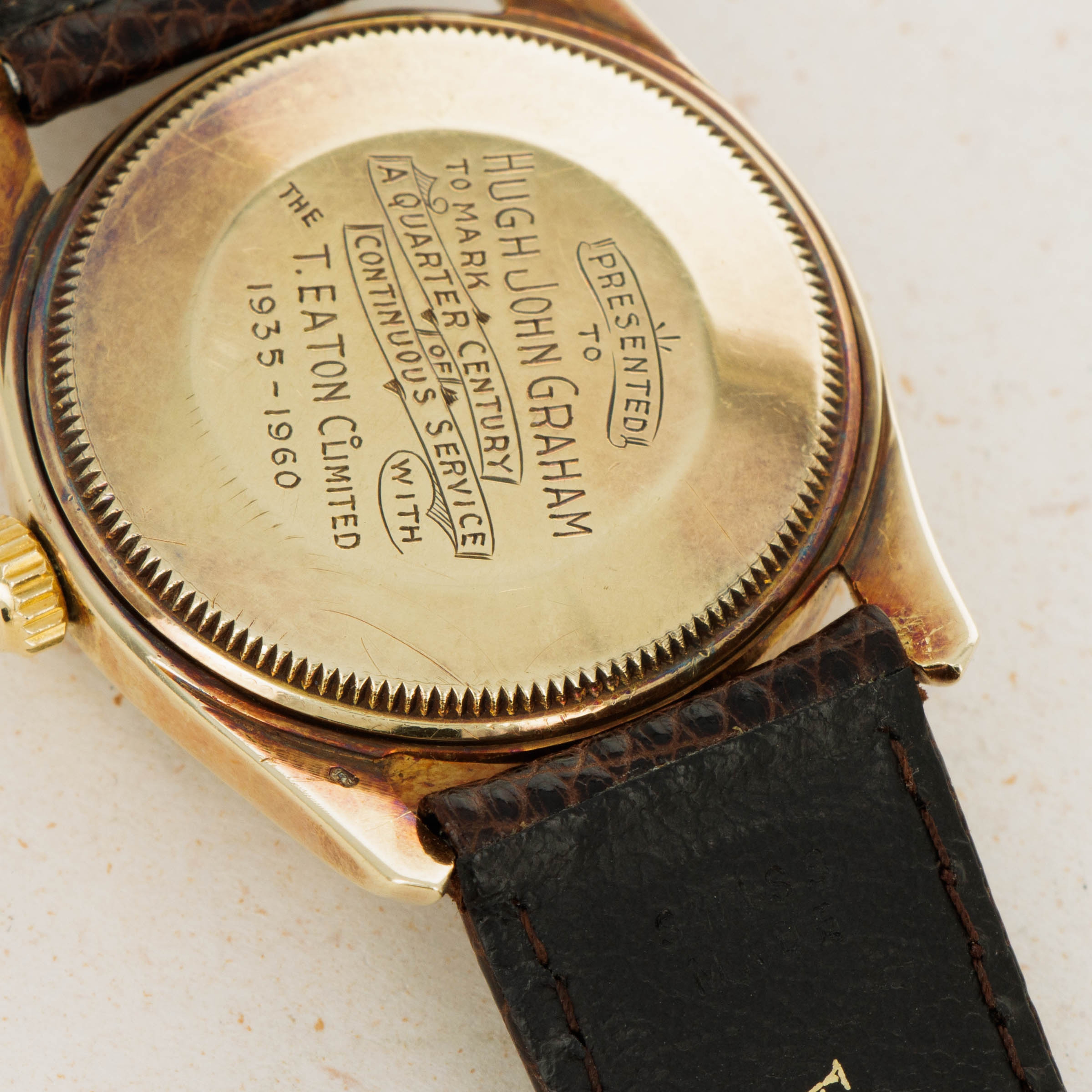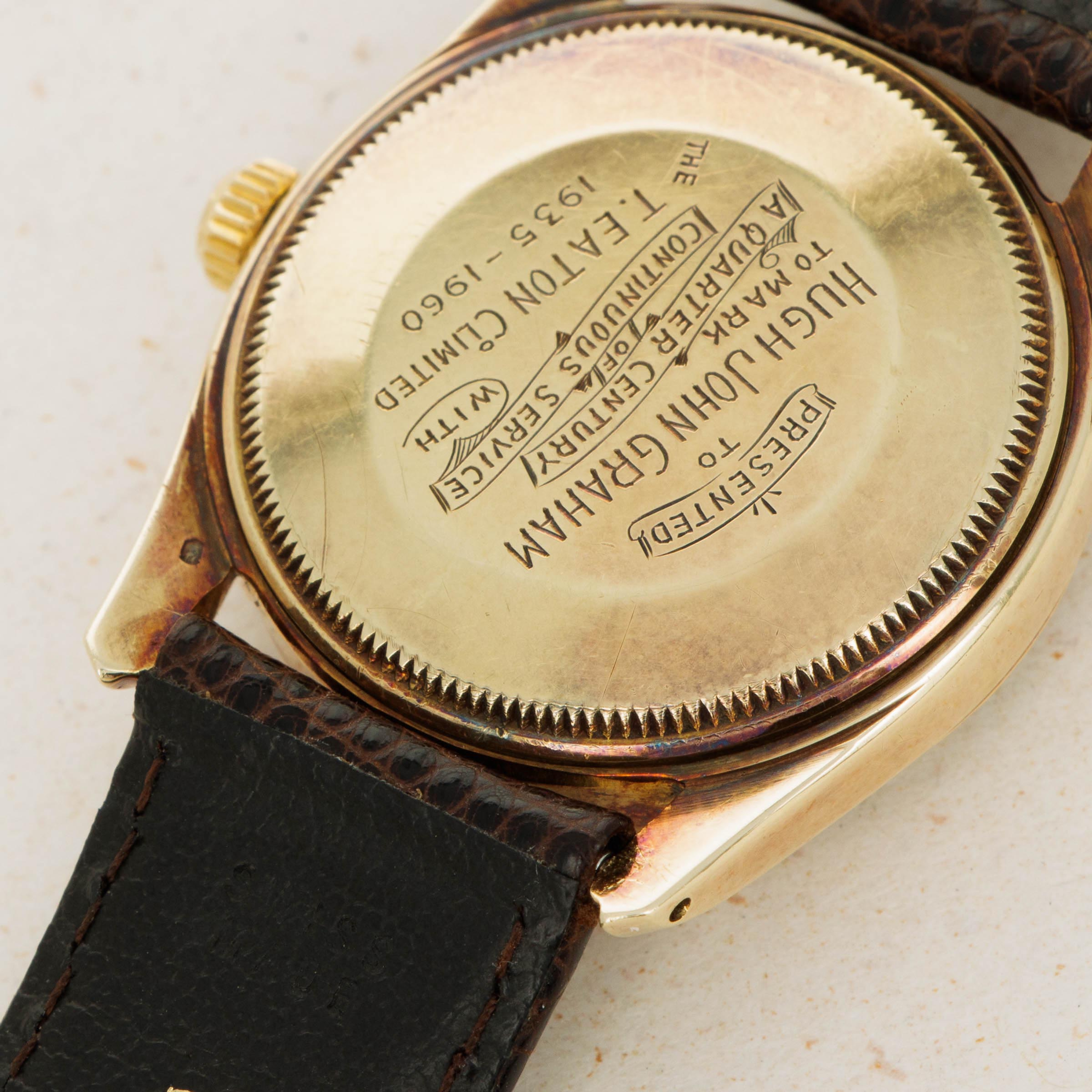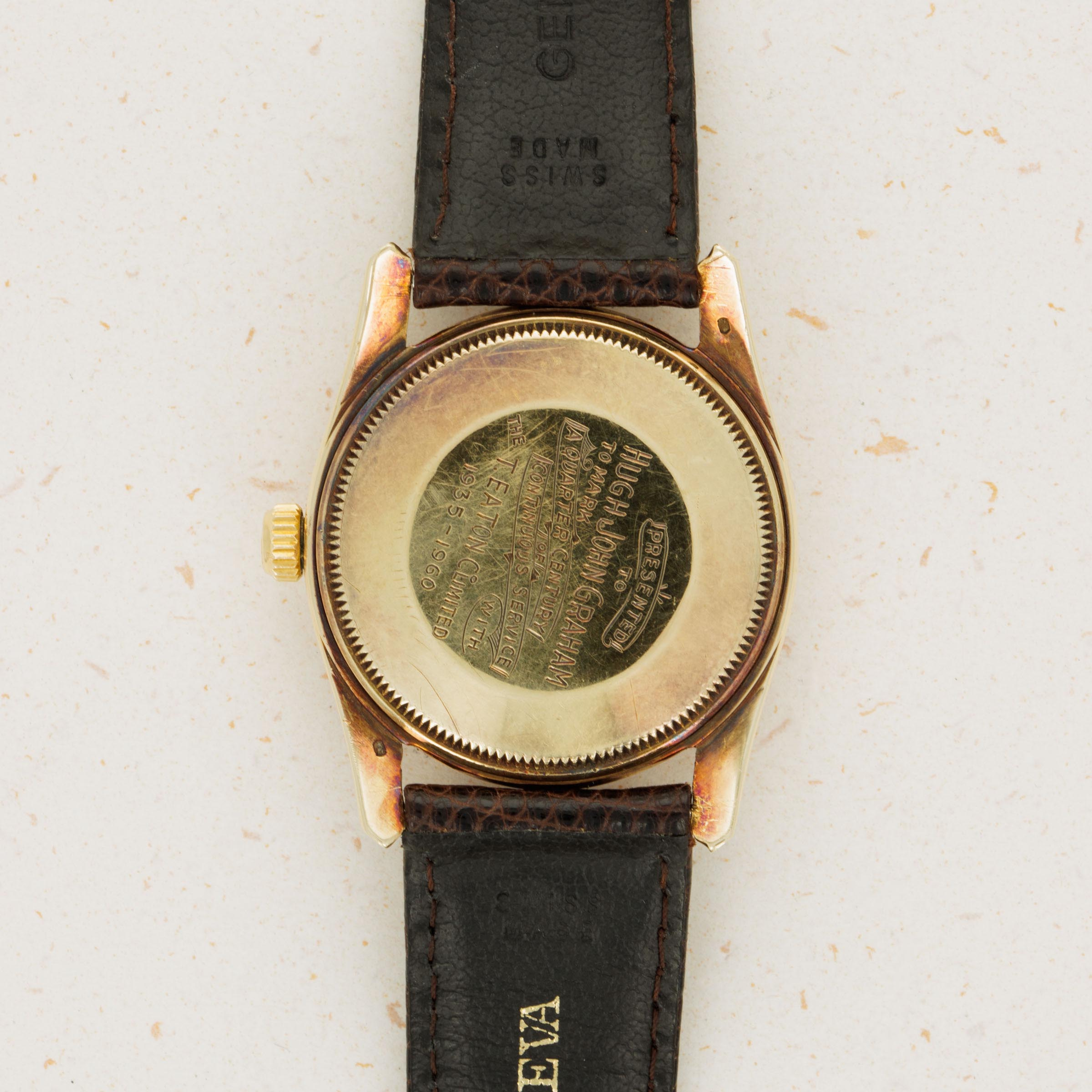 Showing just how special this commission was, Rolex went without putting their name or logo on the ref. 1011's dial, instead placing Eaton's logo at 12 o'clock, along with replacing the usual indices with 1/4CENTURYCLUB which gives this example a unique aura indeed.