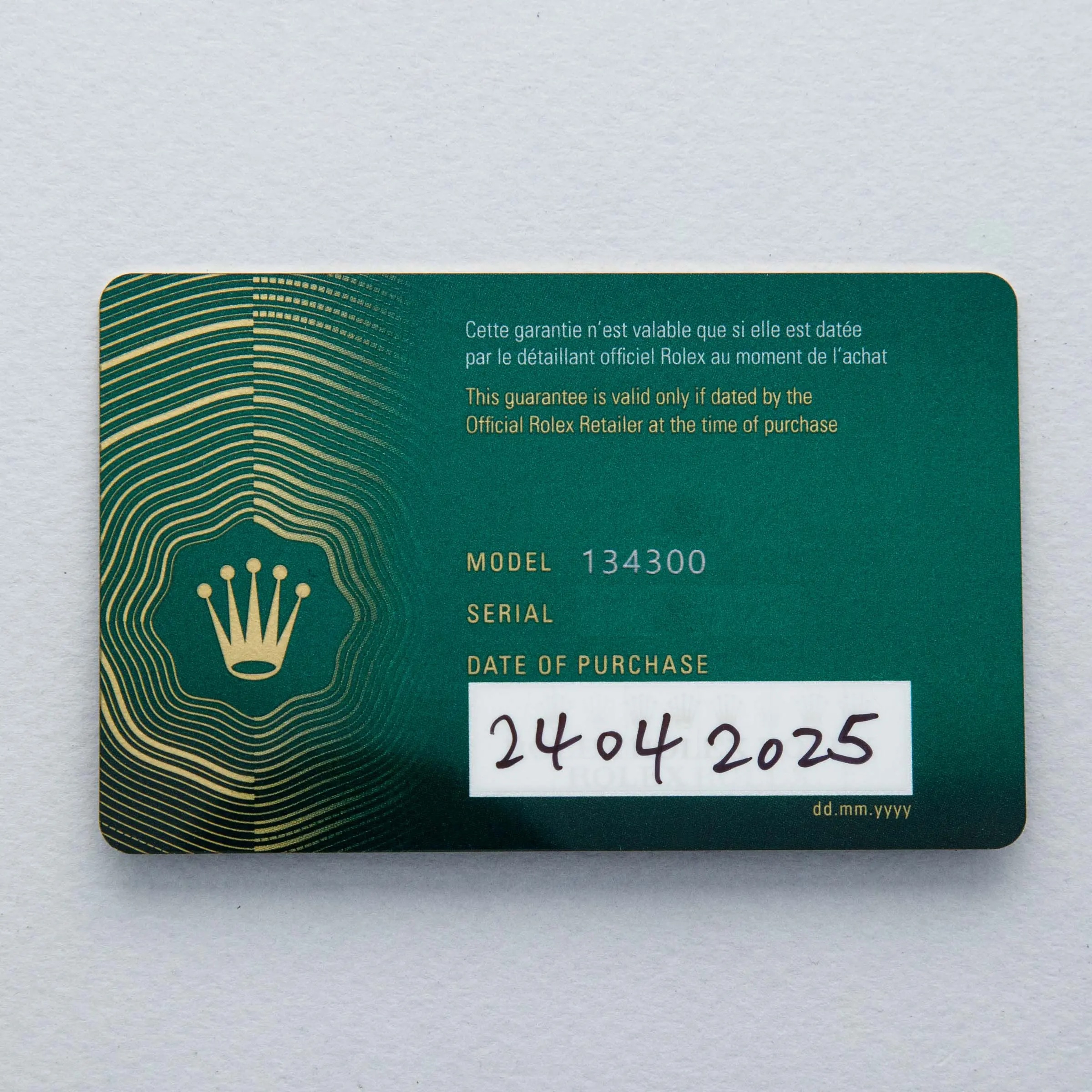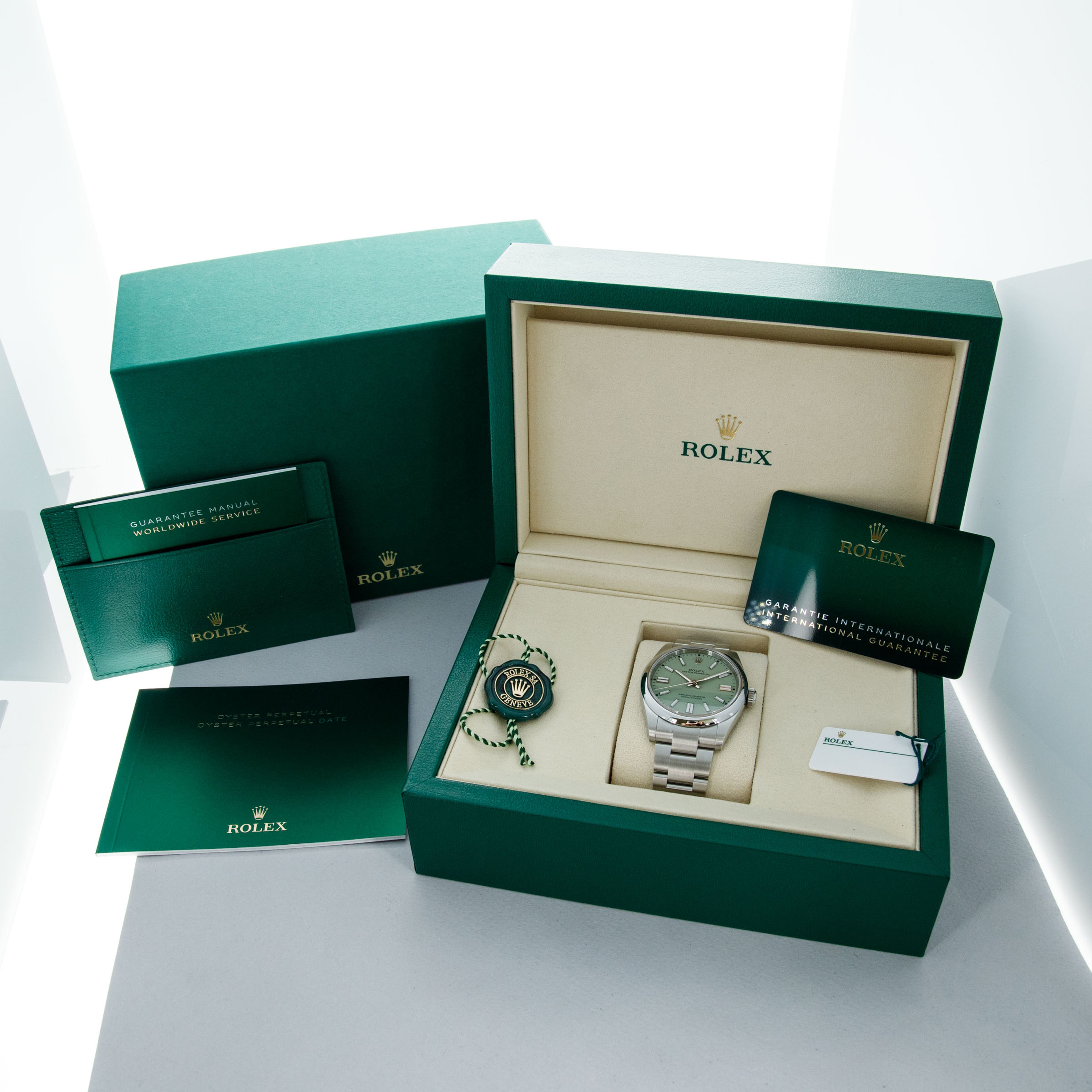 Boasting an original pistachio green dial, as corroborated by its serialized hang tag, this example's dial is a light pastel shade of green that is more subued and refined than its more intensely colored predecessor.