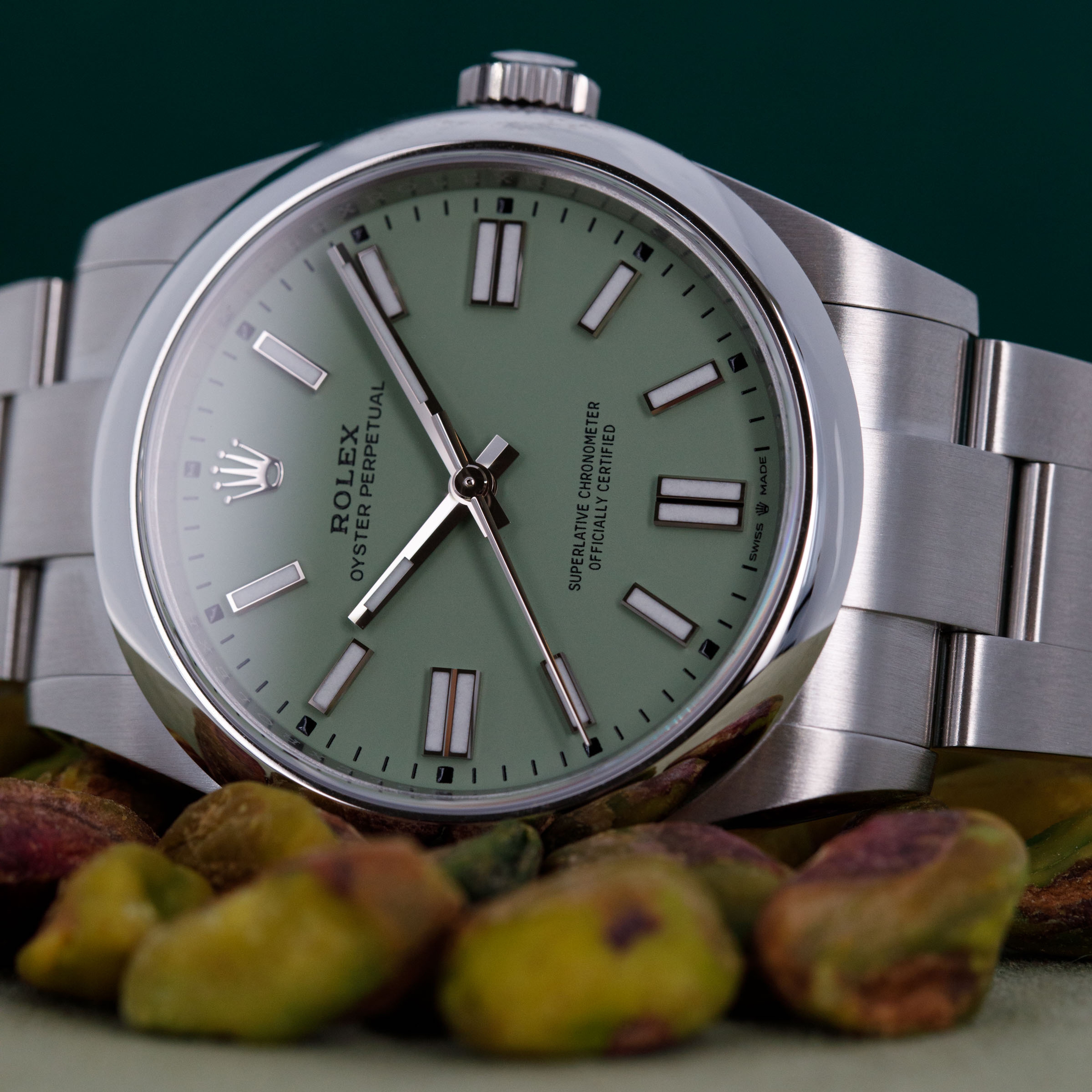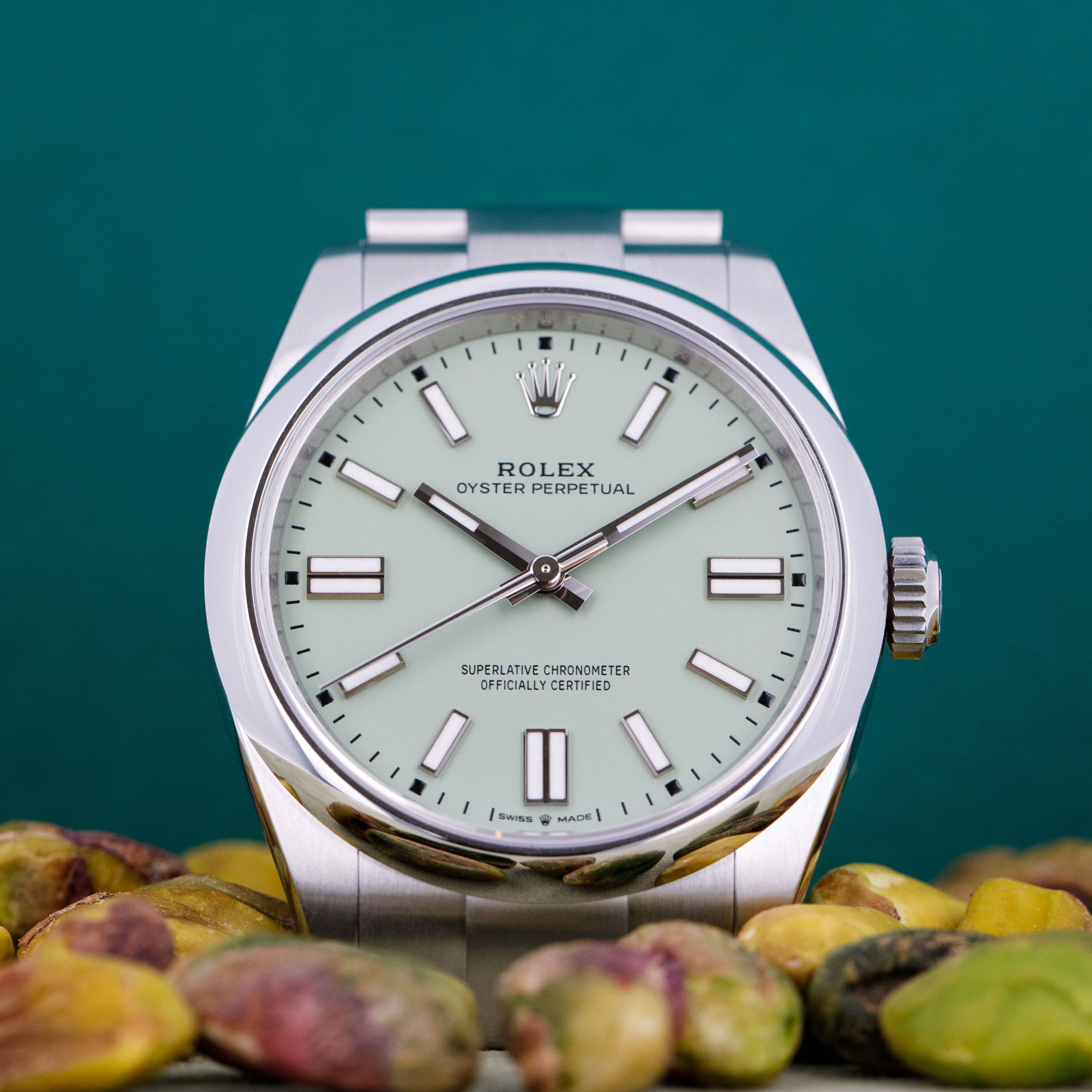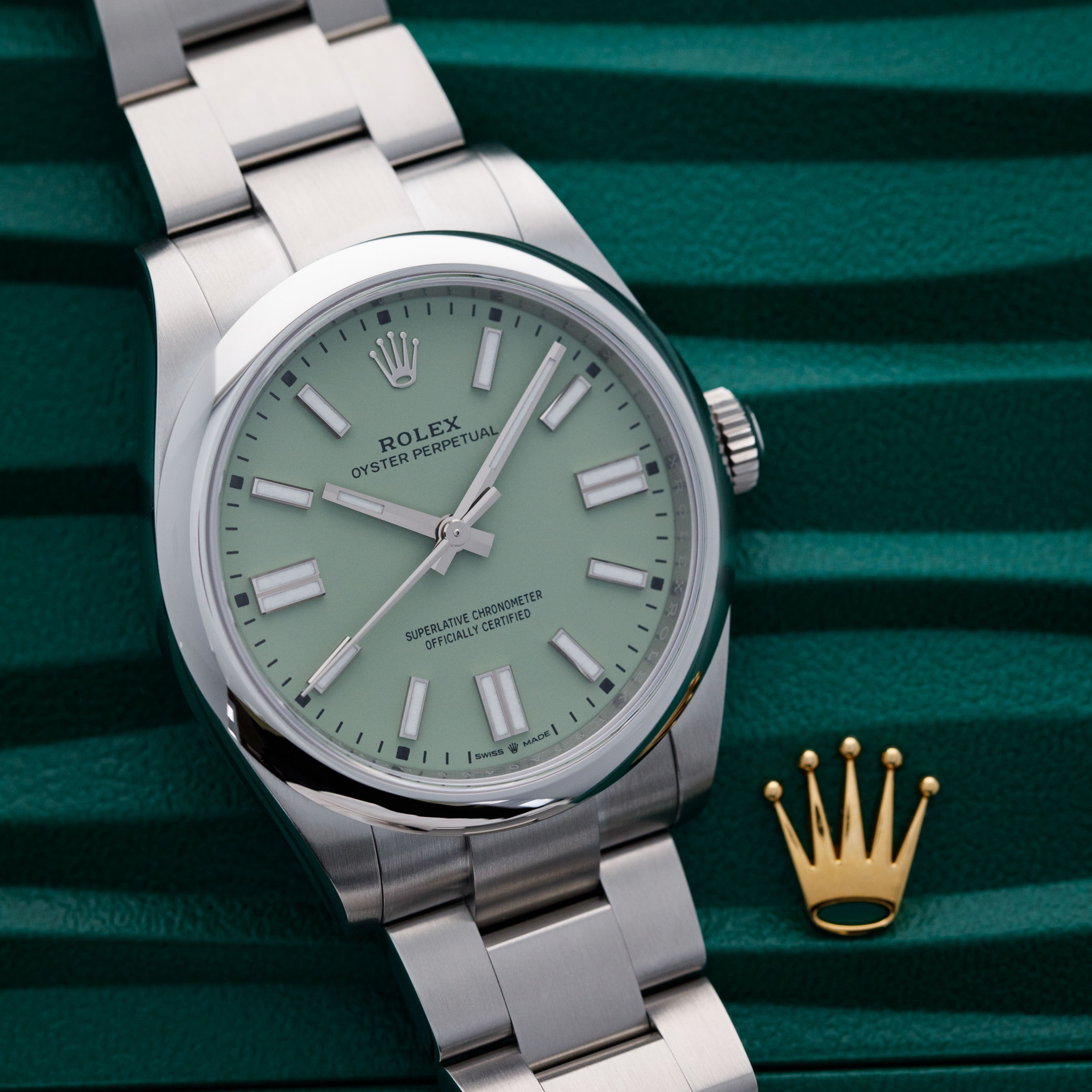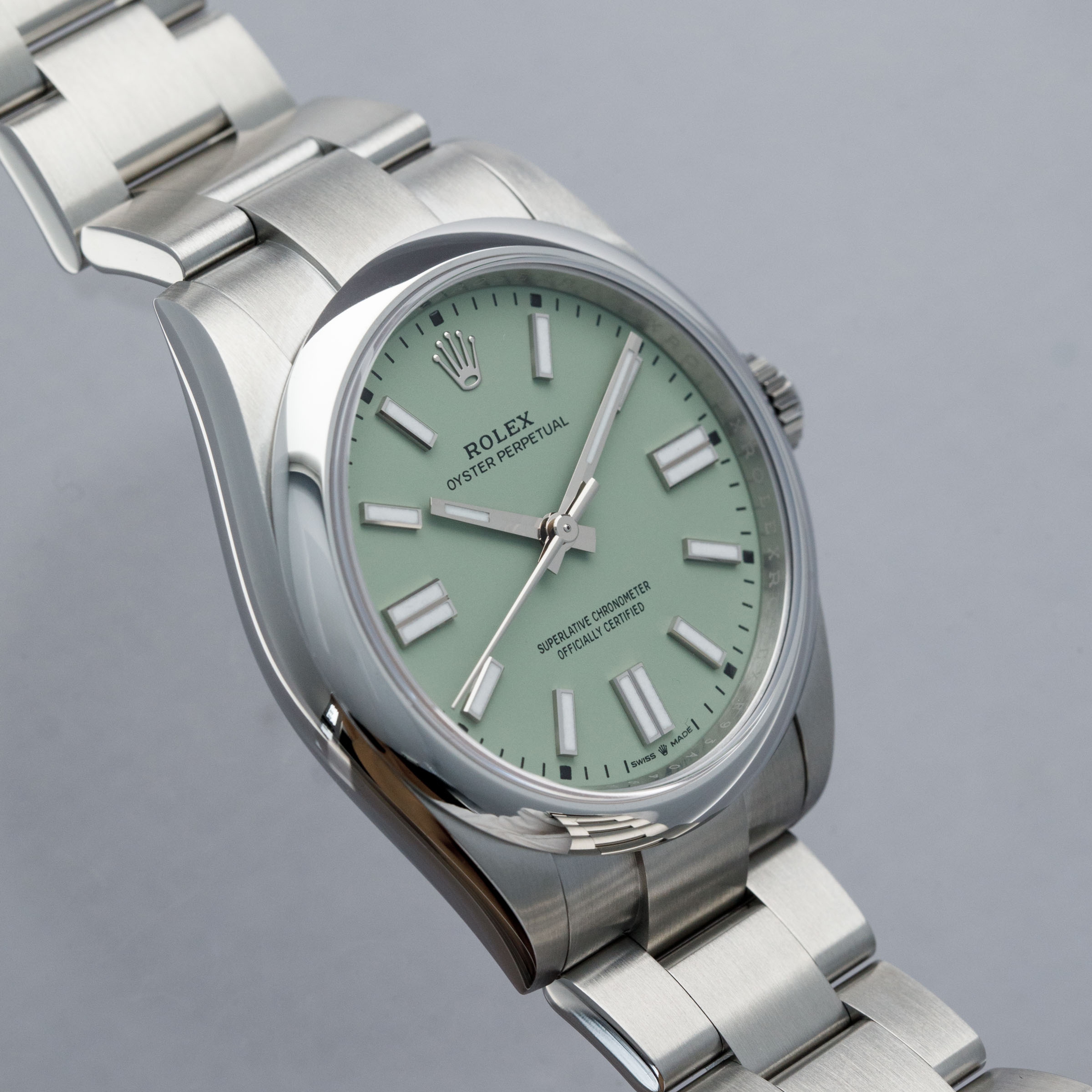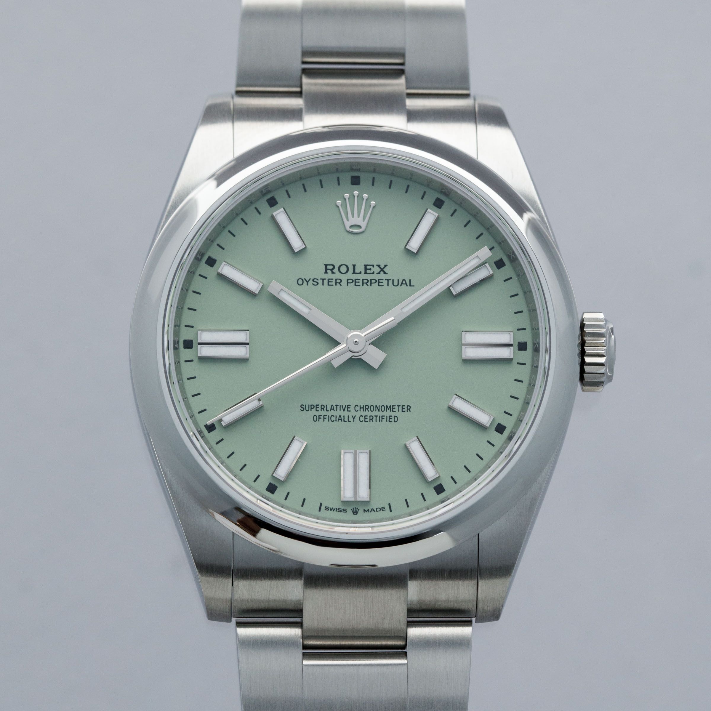 Introduced as a new model in 2020 as Rolex revitalized the entire Oyster Perpetual collection, the Oyster Perpetual 41 features the incredible in-house Rolex cal. 3230 movement within its enlarged 41mm entirely satin-brushed stainless steel case. Featuring 70 hours of power reserve with COSC certification and Rolex's own "Superlative Chronometer" certification, this new movement has ensured that the latest Oyster Perpetuals remain accurate to within -2/+2 seconds a day and feature the same level of horological engineering as any other flagship offering from the Genevan brand. However, keen to keep the collection fresh in the minds of their collectors, Rolex once again revamped the Oyster Perpetual in 2025 by replacing the old dial colors with a selection of updated colors based on the previously available ones, and completely new colors entirely, one of which we have here. Offered as a fresh reference, the ref. 134300, these new models are identical to their predecessors in every way besides their dial. Offered here as one of the three completely new colors we have the pistachio green variant. A light shade of pastel green, this dial moves away from the more intense green from before as Rolex attempt to give the watch a new subued aesthetic. Only released in early April, this is the first pistachio green OP41 on the market.