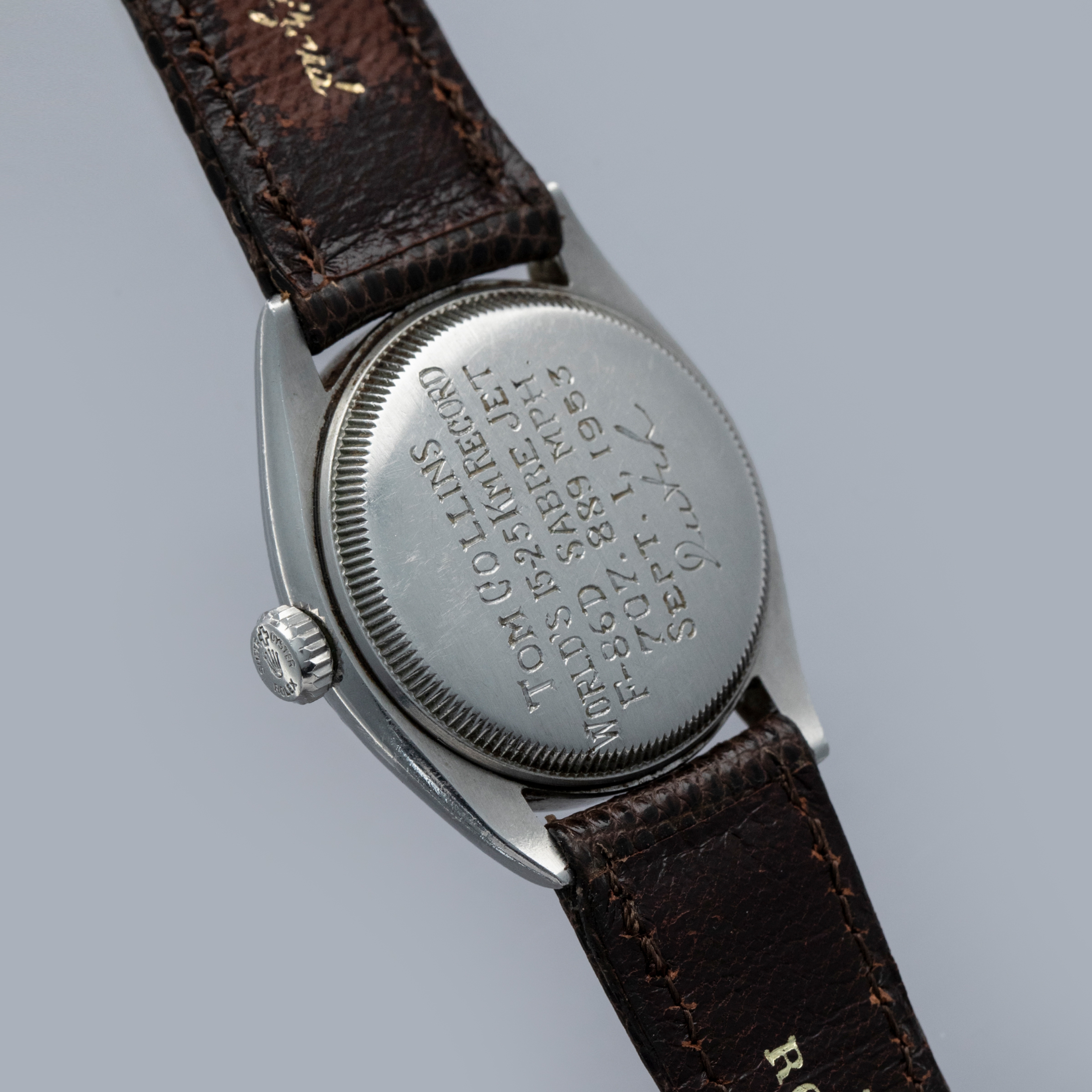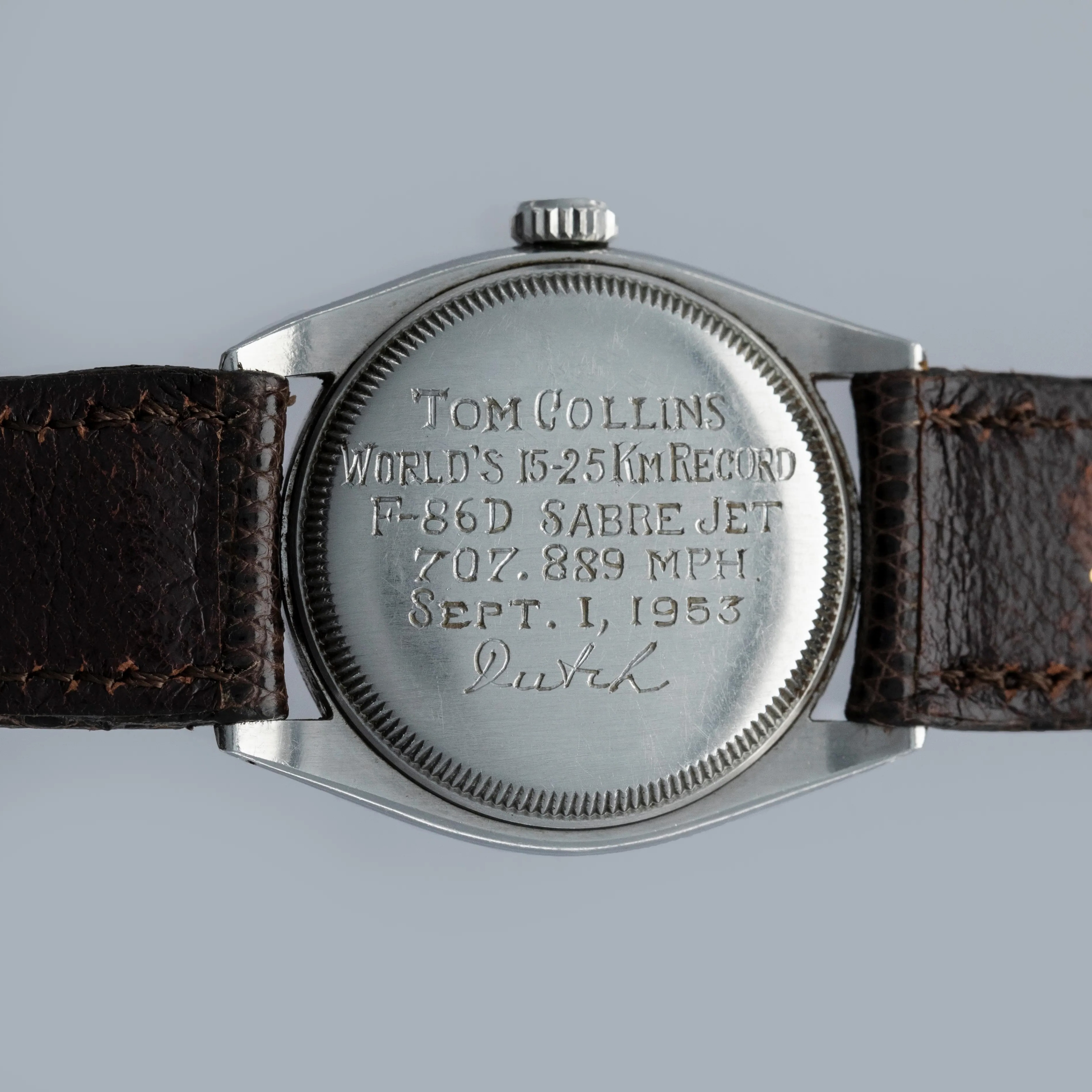 Describing the achievement - a world speed record - that went on to result in this watch being presented to Major Collins, this example proudly wears its rich provenance as a caseback engraving, as it should.