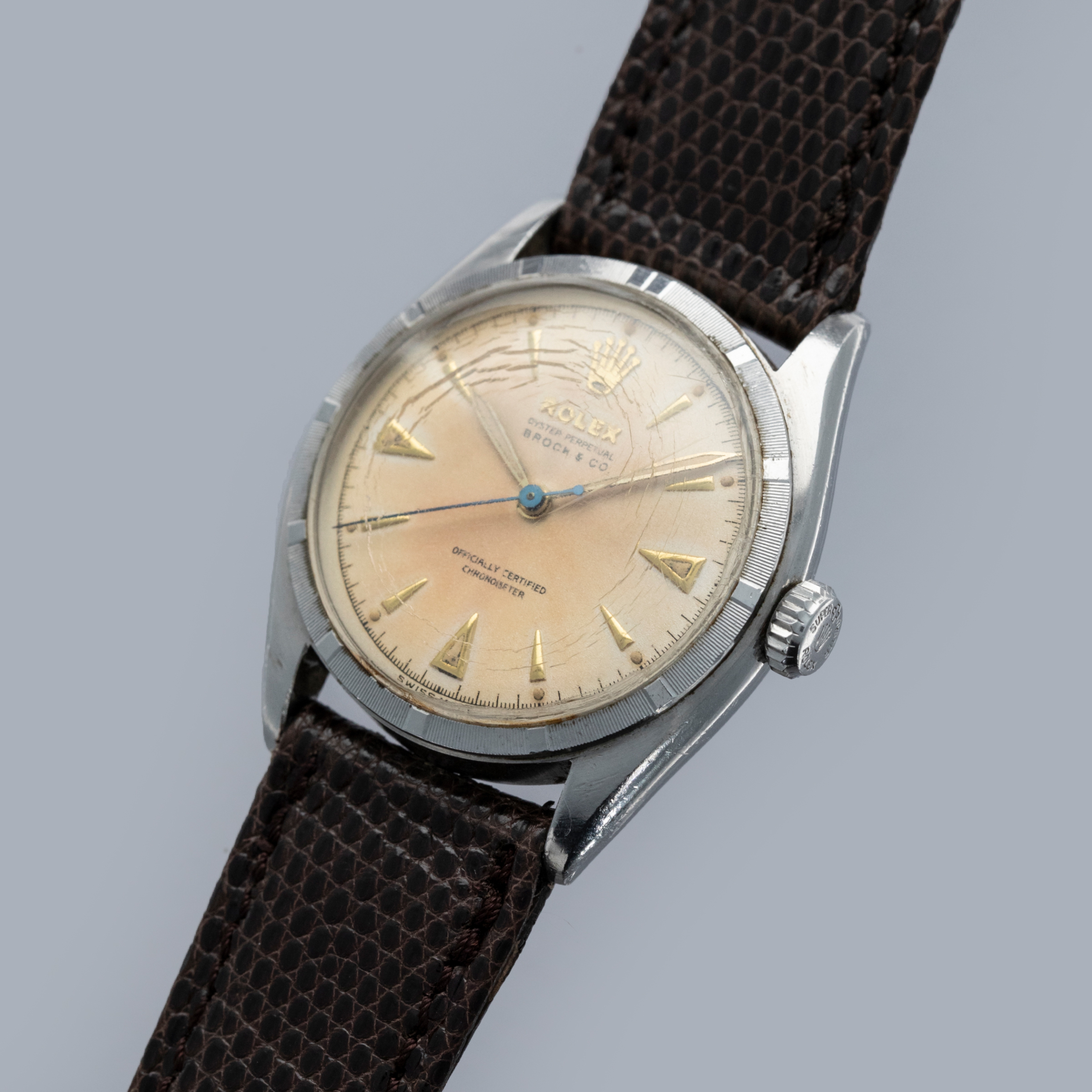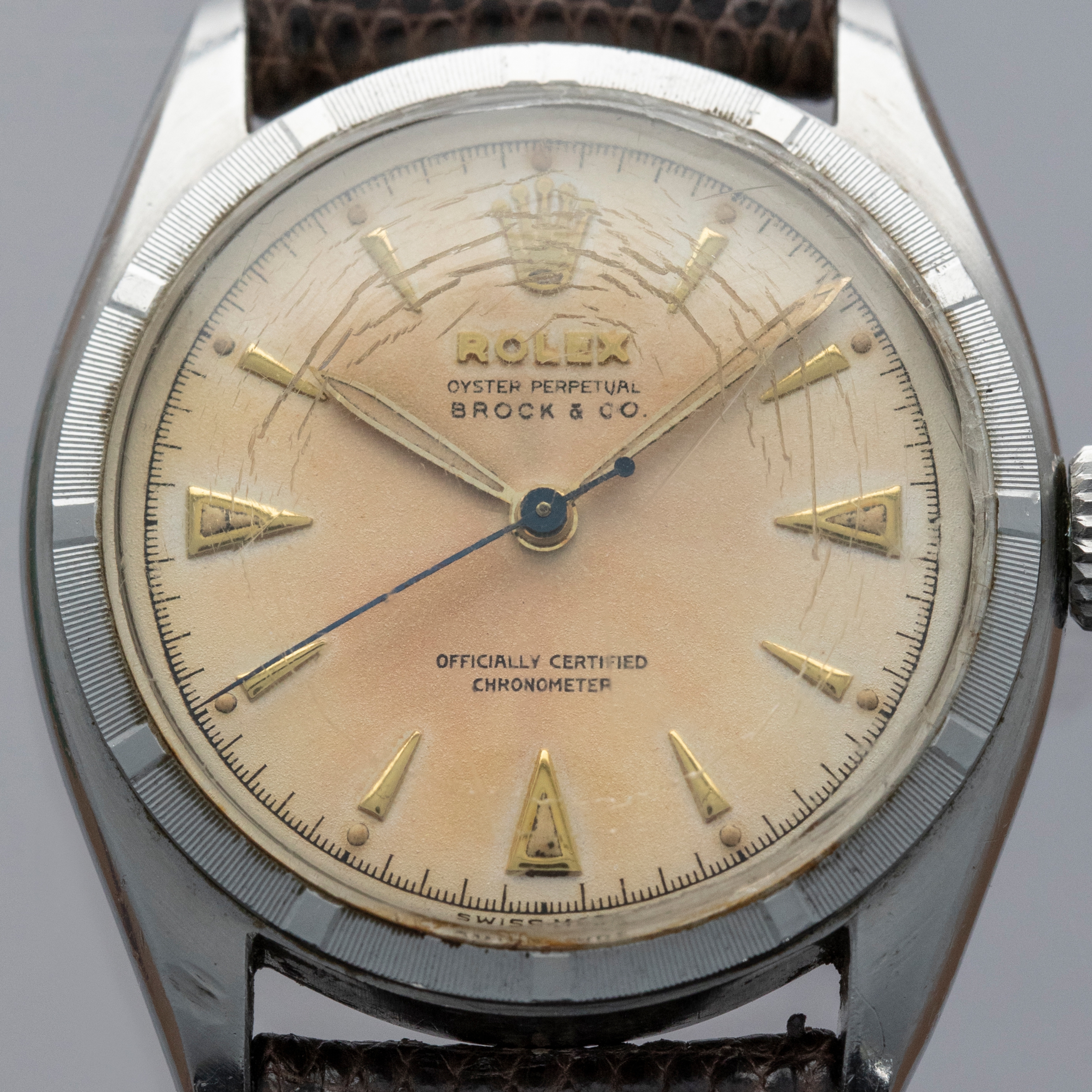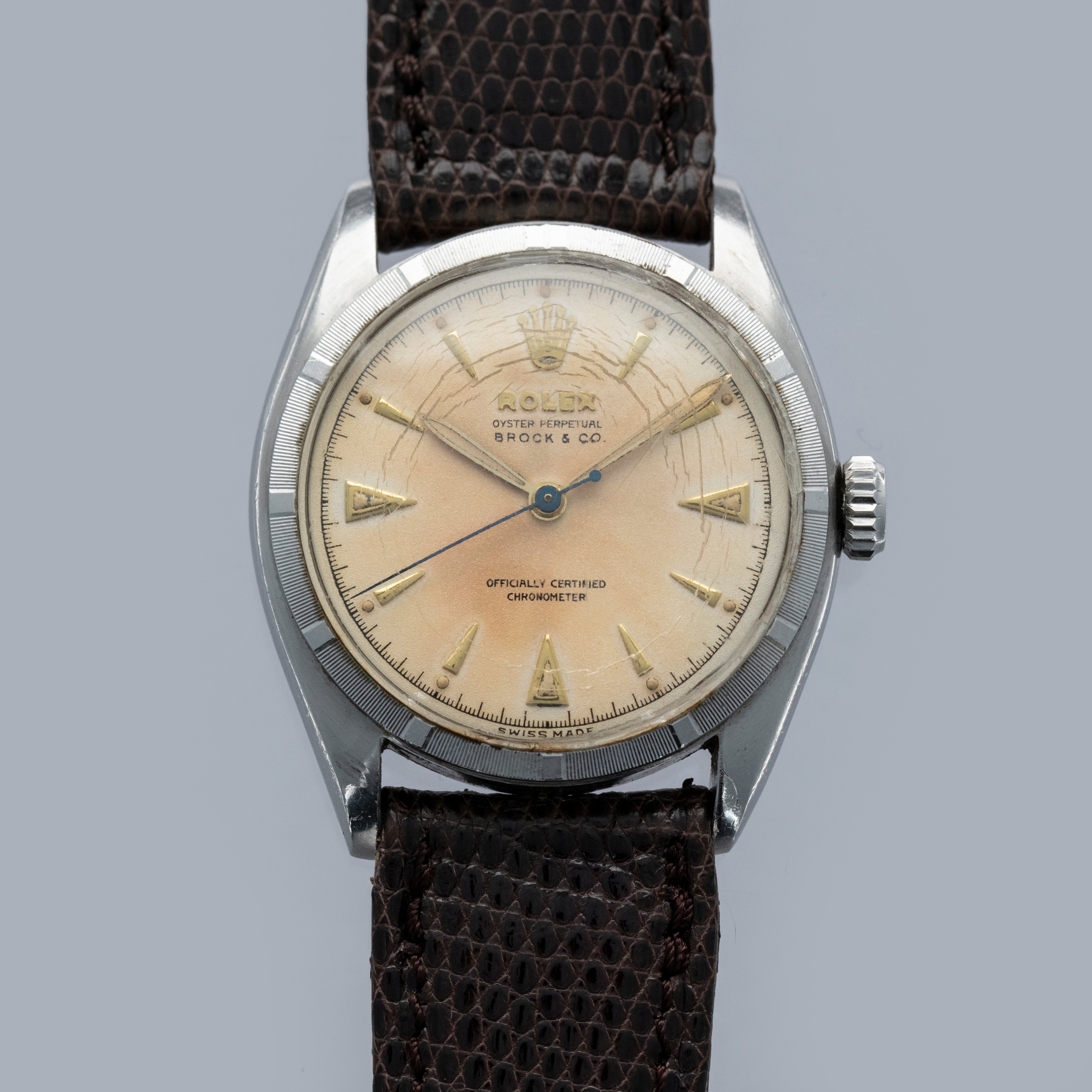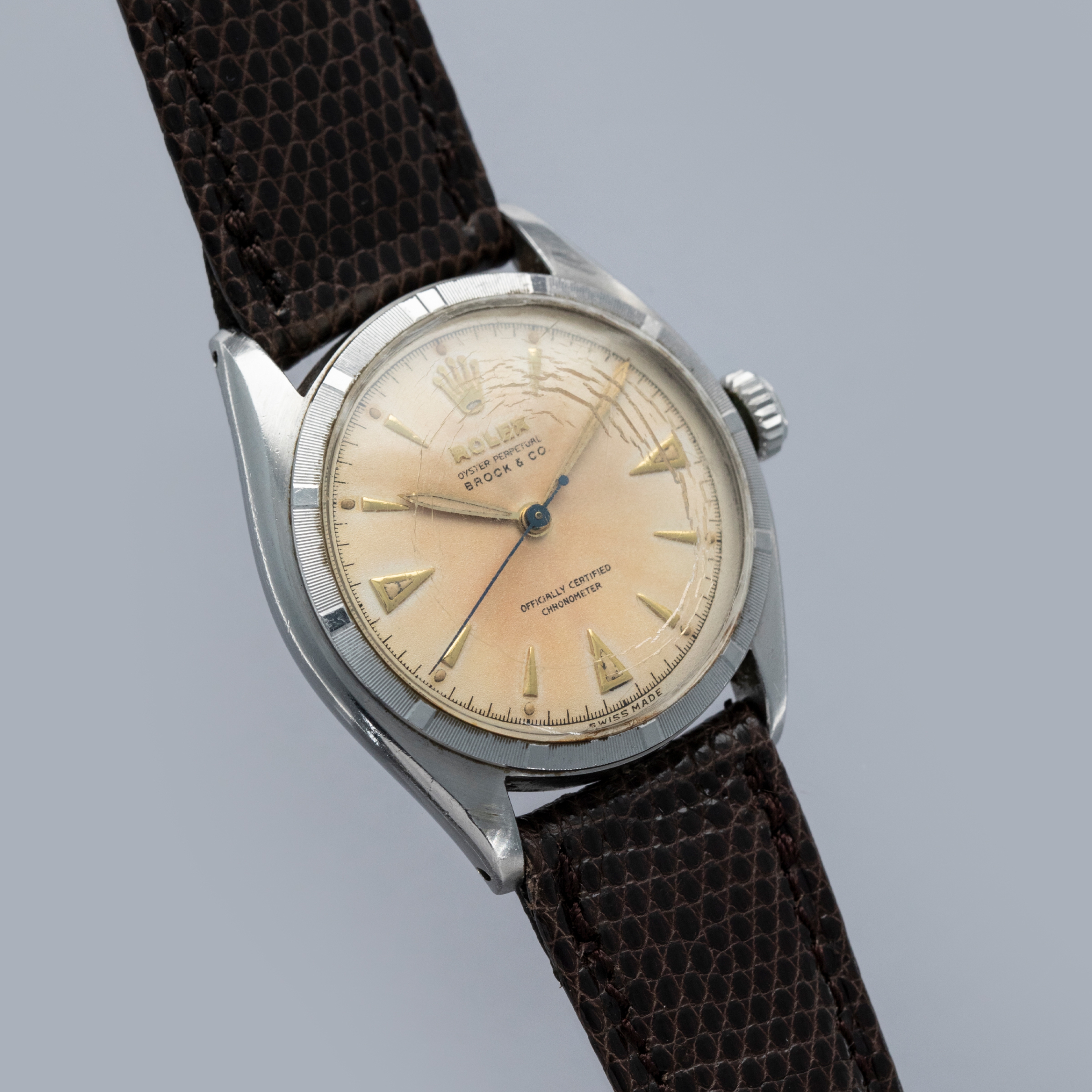 The watch is in overall very good condition. The stainless steel case has some marks and nicks as expected for a watch of this vintage. The case proportions are very good, with symmetrical lugs and well-defined edges. The case back features a personal engraving. The watch retains its original non-screw-down Super Oyster crown. The engine-turned bezel remains very well defined. The acrylic crystal has some crazing and is chipped around the edges. The dial is double-signed Brock & Co and has a pleasing patina, with all radium lume plots intact, while the hands show some light oxidation. The watch is fitted with a brown lizard Rolex strap with a gold-plated Rolex buckle and comes with an additional strap, as well as a comprehensive selection of memorabilia related to the original owner's military service. Please note that the watch ticks at time of cataloging, but timekeeping is poor and a service is recommended.