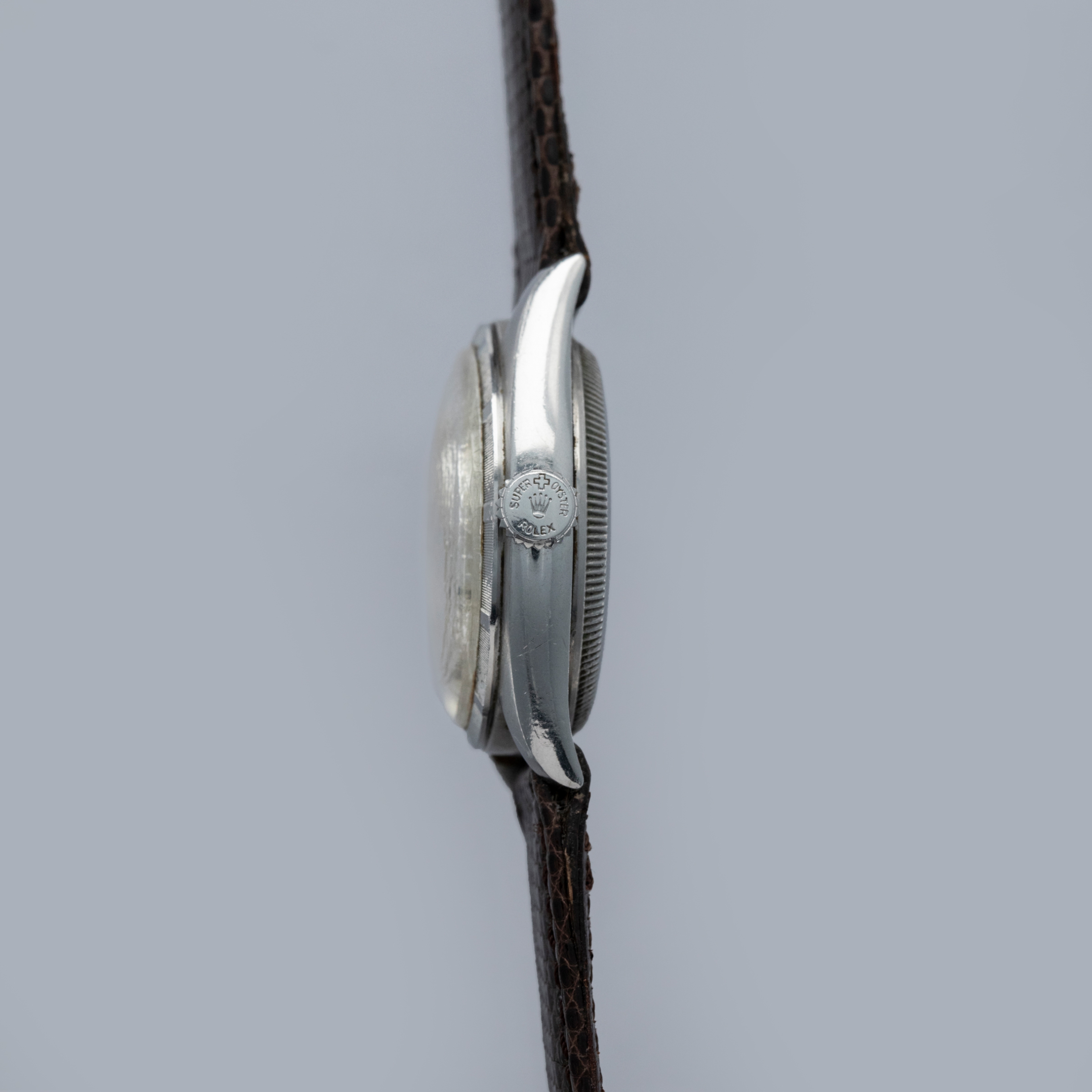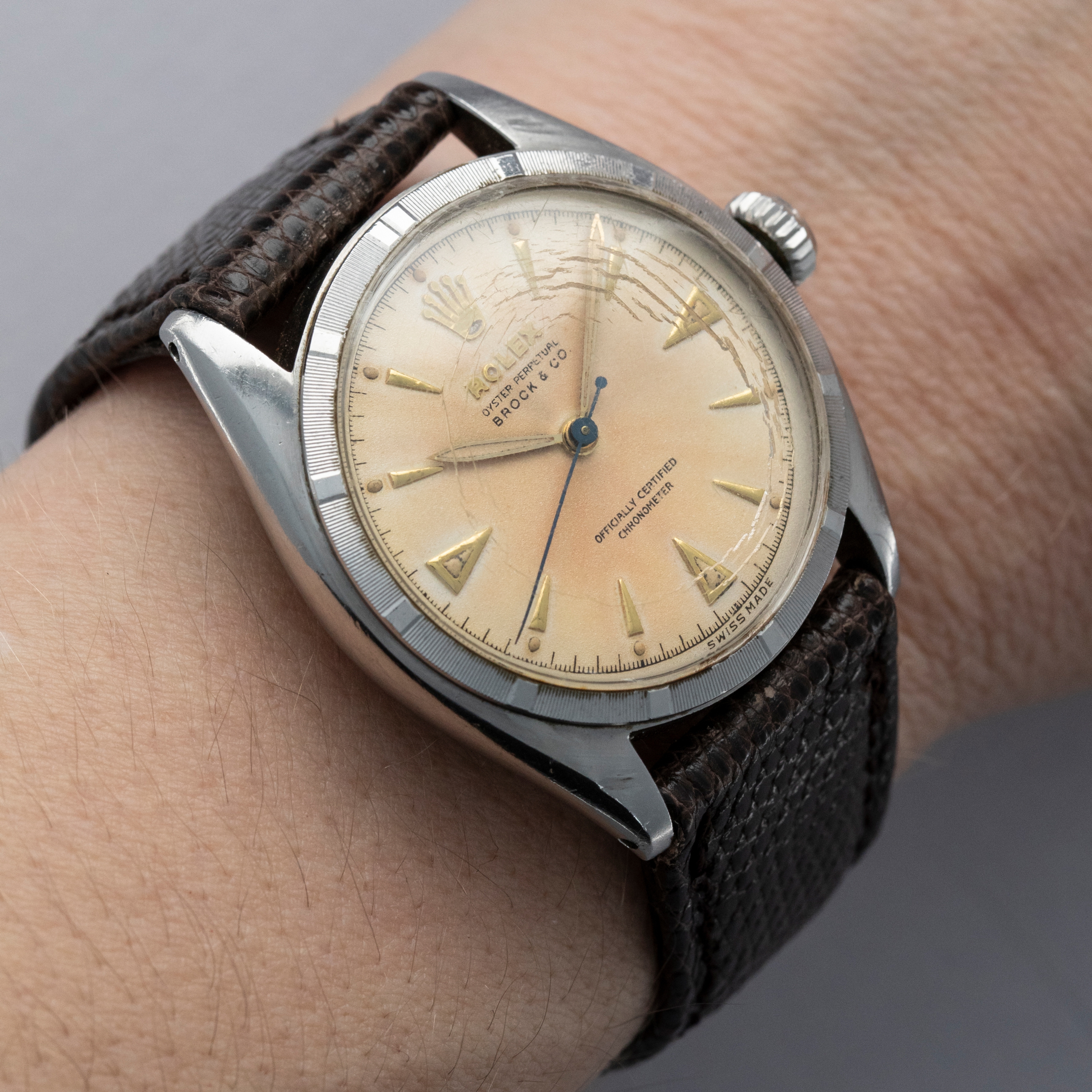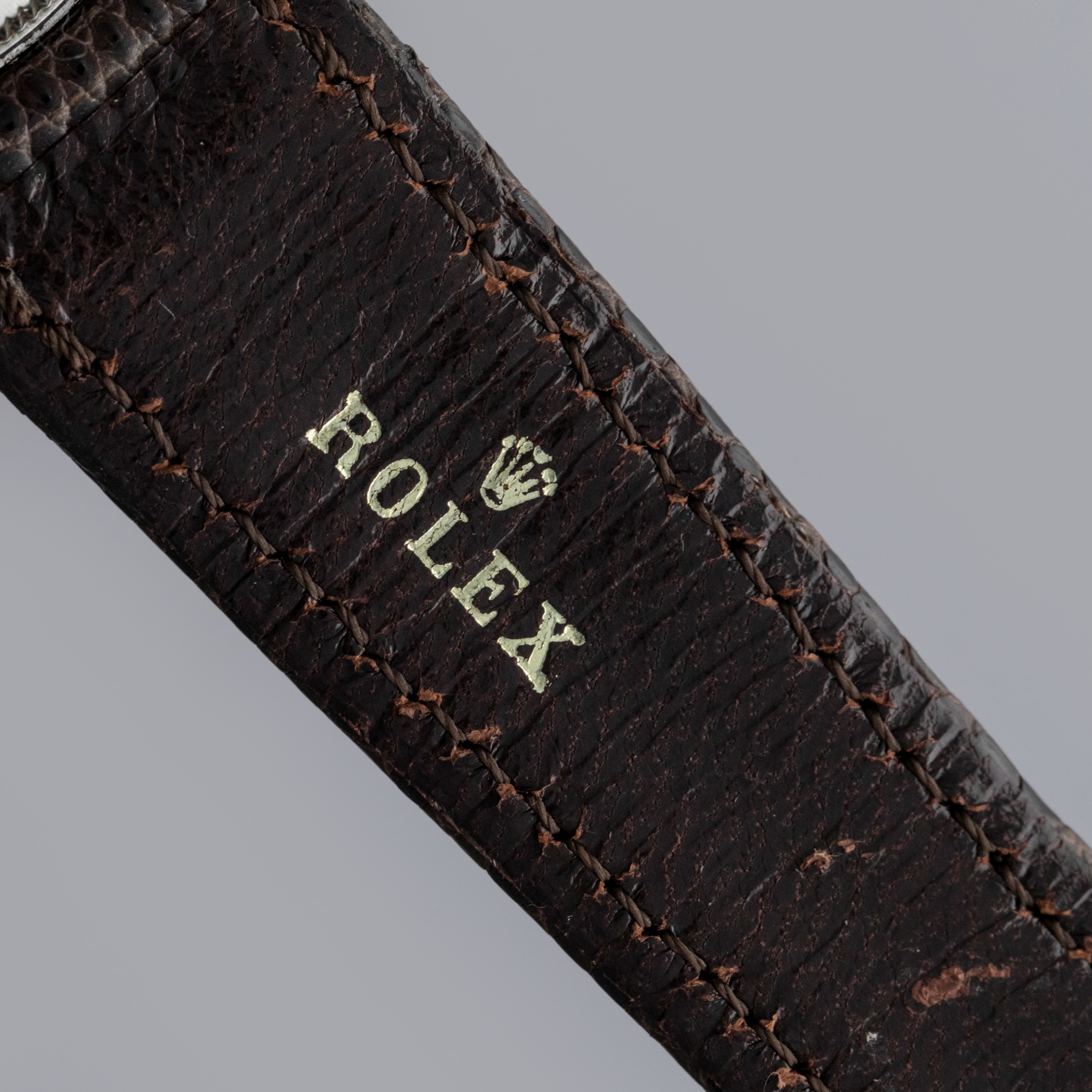 The watch is in overall very good condition. The stainless steel case has some marks and nicks as expected for a watch of this vintage. The case proportions are very good, with symmetrical lugs and well-defined edges. The case back features a personal engraving. The watch retains its original non-screw-down Super Oyster crown. The engine-turned bezel remains very well defined. The acrylic crystal has some crazing and is chipped around the edges. The dial is double-signed Brock & Co and has a pleasing patina, with all radium lume plots intact, while the hands show some light oxidation. The watch is fitted with a brown lizard Rolex strap with a gold-plated Rolex buckle and comes with an additional strap, as well as a comprehensive selection of memorabilia related to the original owner's military service. Please note that the watch ticks at time of cataloging, but timekeeping is poor and a service is recommended.