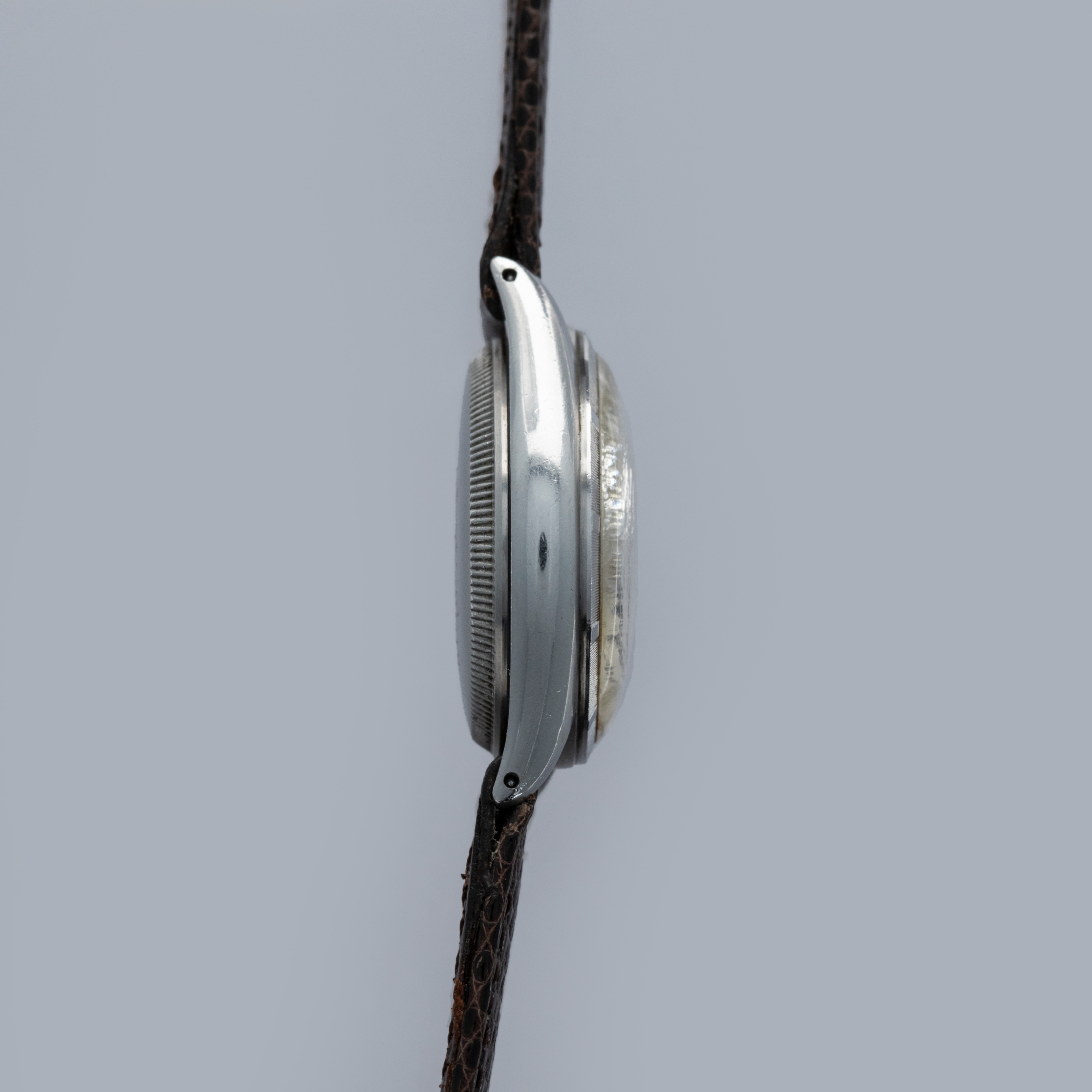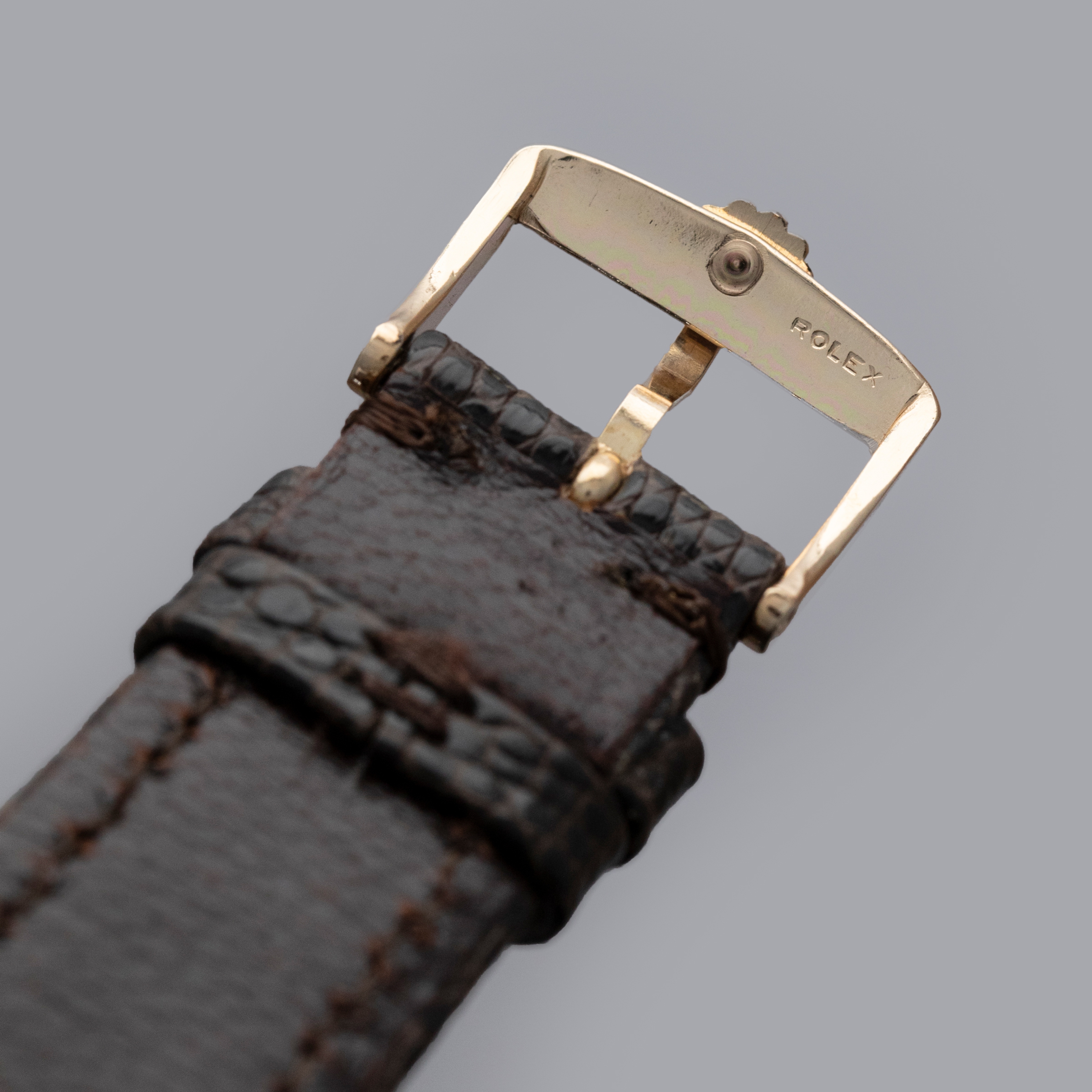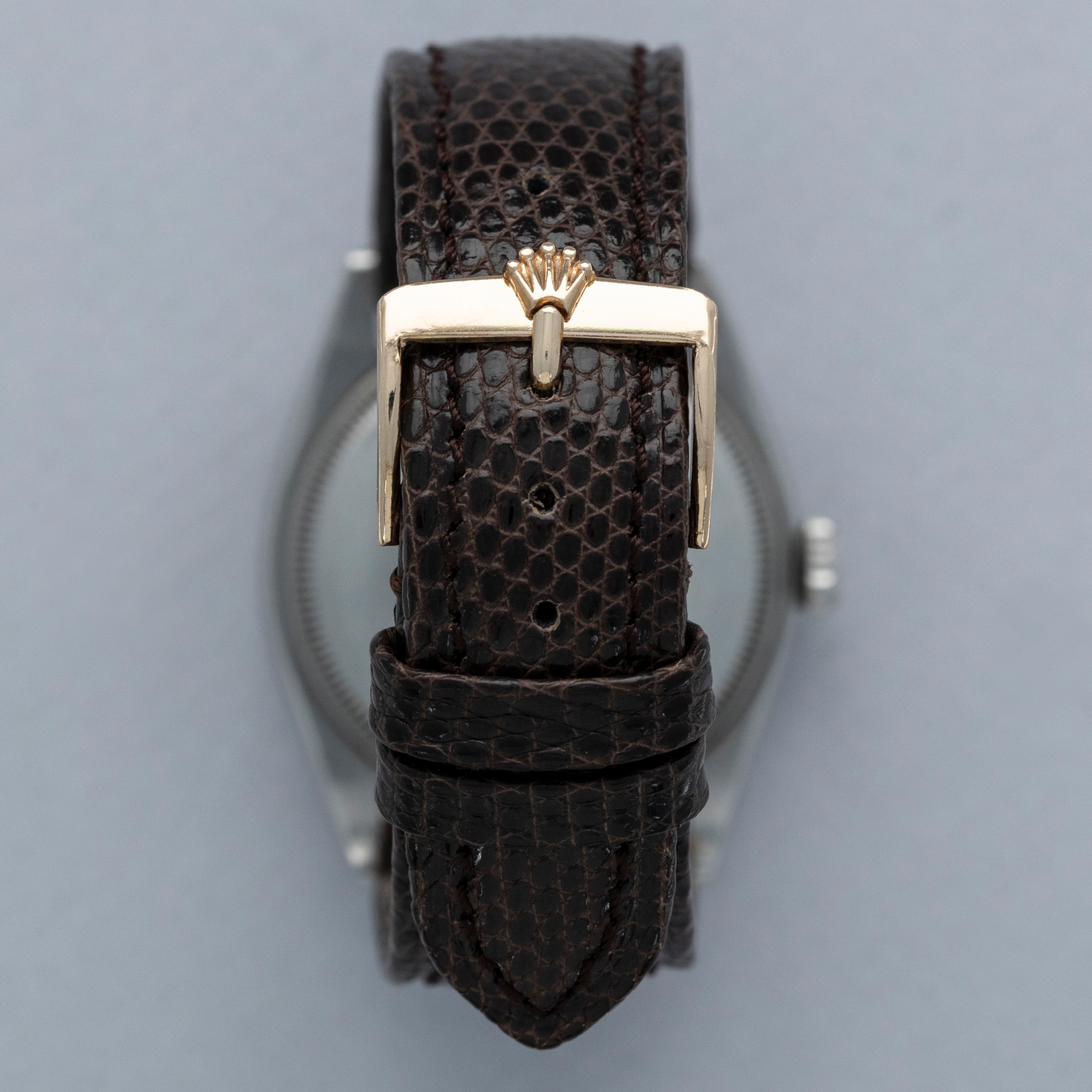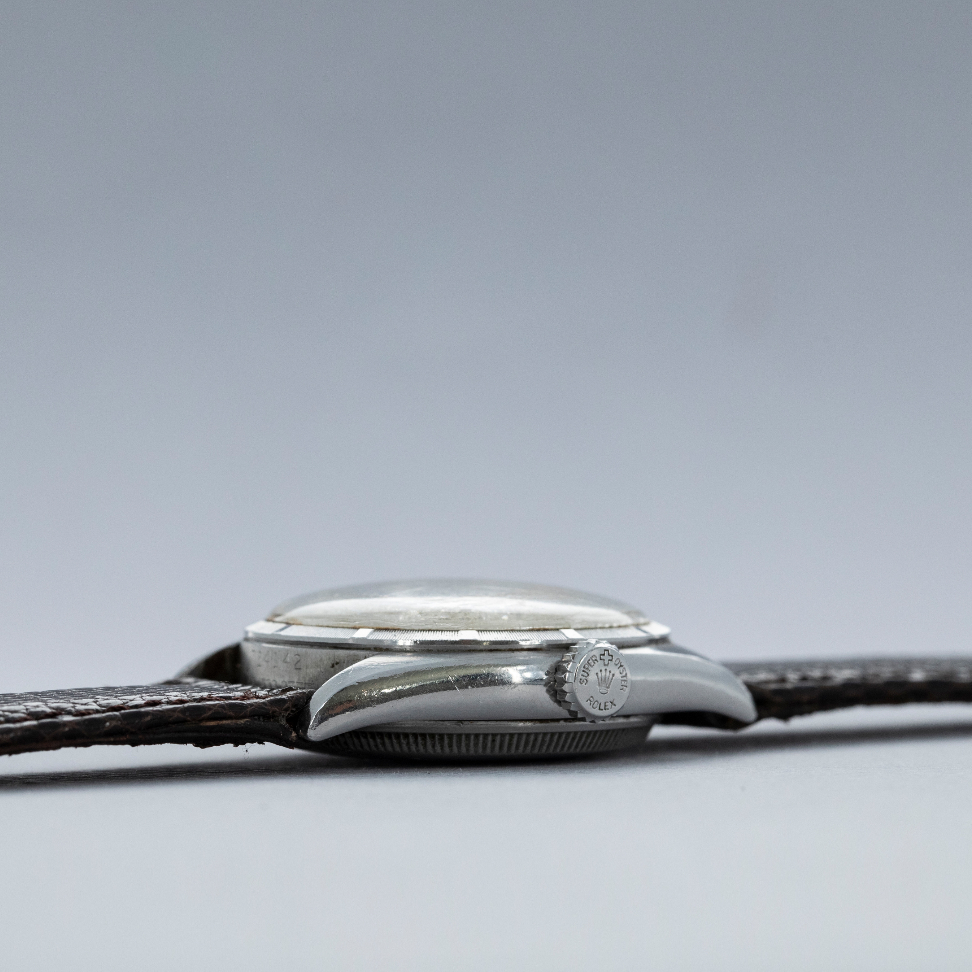 The watch is in overall very good condition. The stainless steel case has some marks and nicks as expected for a watch of this vintage. The case proportions are very good, with symmetrical lugs and well-defined edges. The case back features a personal engraving. The watch retains its original non-screw-down Super Oyster crown. The engine-turned bezel remains very well defined. The acrylic crystal has some crazing and is chipped around the edges. The dial is double-signed Brock & Co and has a pleasing patina, with all radium lume plots intact, while the hands show some light oxidation. The watch is fitted with a brown lizard Rolex strap with a gold-plated Rolex buckle and comes with an additional strap, as well as a comprehensive selection of memorabilia related to the original owner's military service. Please note that the watch ticks at time of cataloging, but timekeeping is poor and a service is recommended.