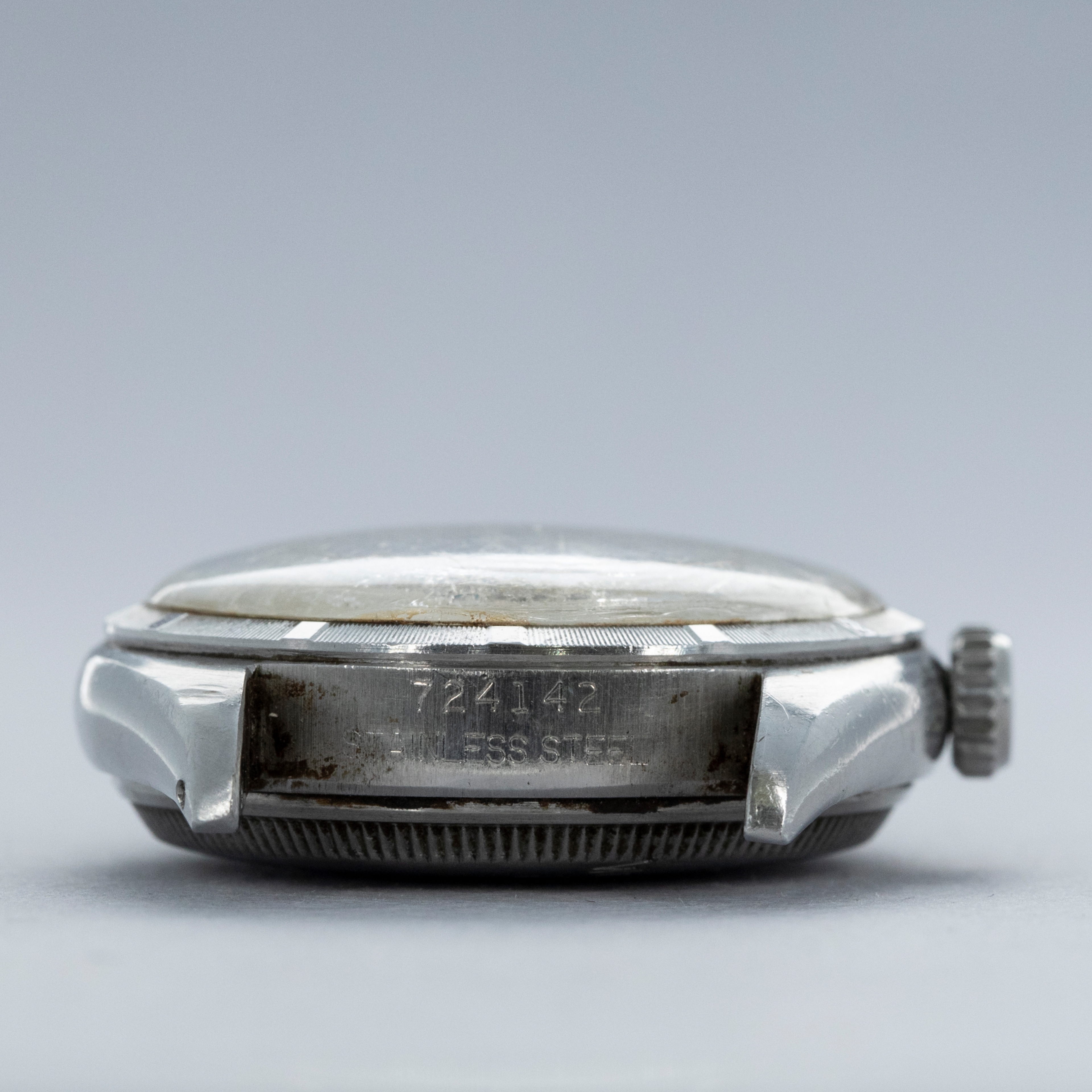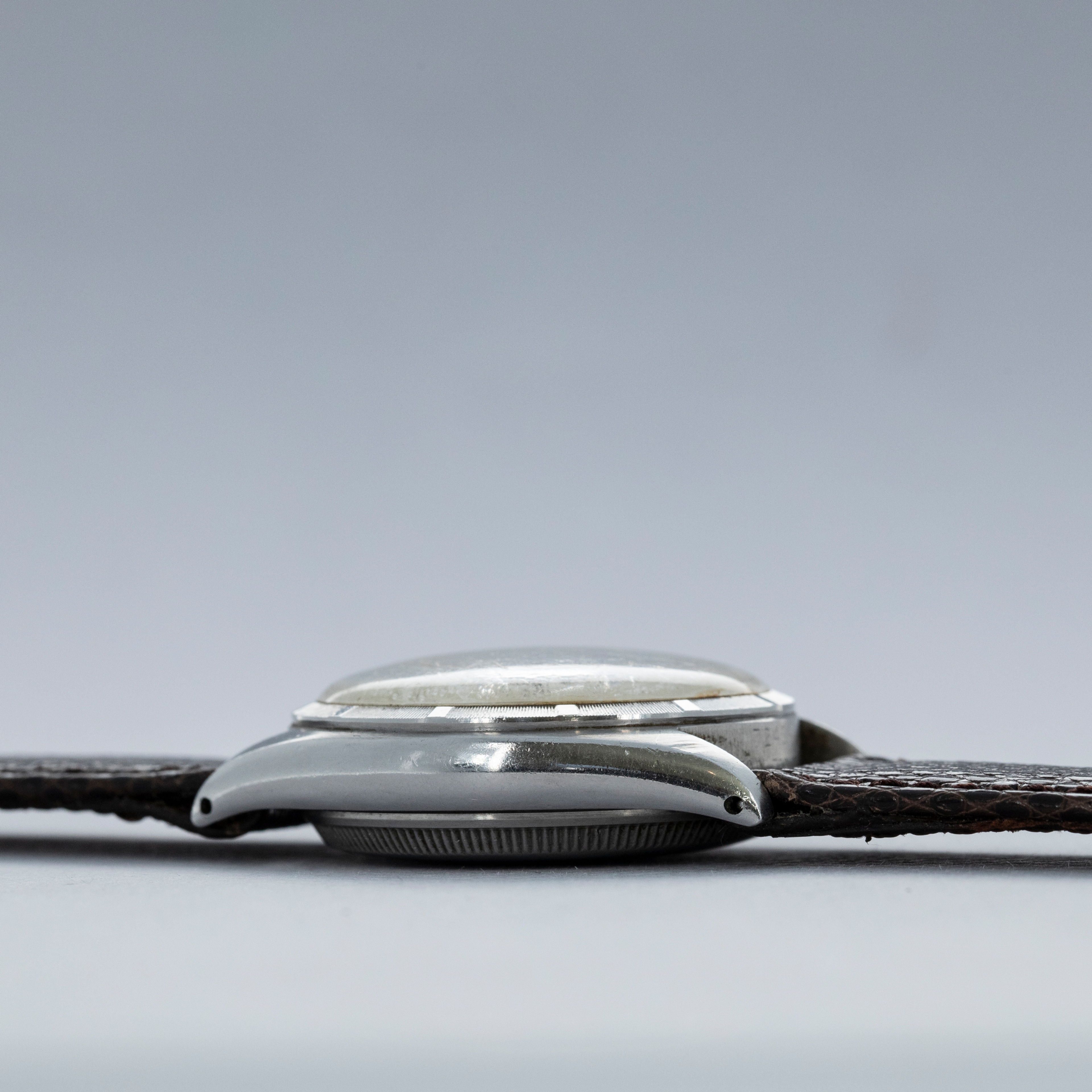Famed as the base model that all of Rolex’s sports models use as their foundations, the Oyster Perpetual is an iconic watch that has a profound impact on horology. While its no-frills stainless steel construction is utilitarian, its design is equally timeless and classic. With its smooth stainless steel bezel and clean dial, the Oyster Perpetual has long been a collector favorite. Launched in 1951, the Oyster Perpetual ref. 6065 featured an automatic movement within its 34mm case and came in a variety of styles. Offered here, however, we do not have an ordinary Oyster Perpetual ref. 6085. Indeed, it is the example that was presented to Major Harold Collins by James H. "Dutch" Kindelberger, the CEO of North American Aviation, upon Collins’ setting of then new world speed record of 707.889 mph in an F86D Sabre Jet, which was manufactured by North American Aviation. Featuring an engraved case commemorating the record along with additional provenance and a gorgeously tropicalized co-signed dial bearing the signature of L.A.-based retailer Brock & Co., this example showcases the very best that the world of vintage horology has to offer with its rich provenance and heritage.