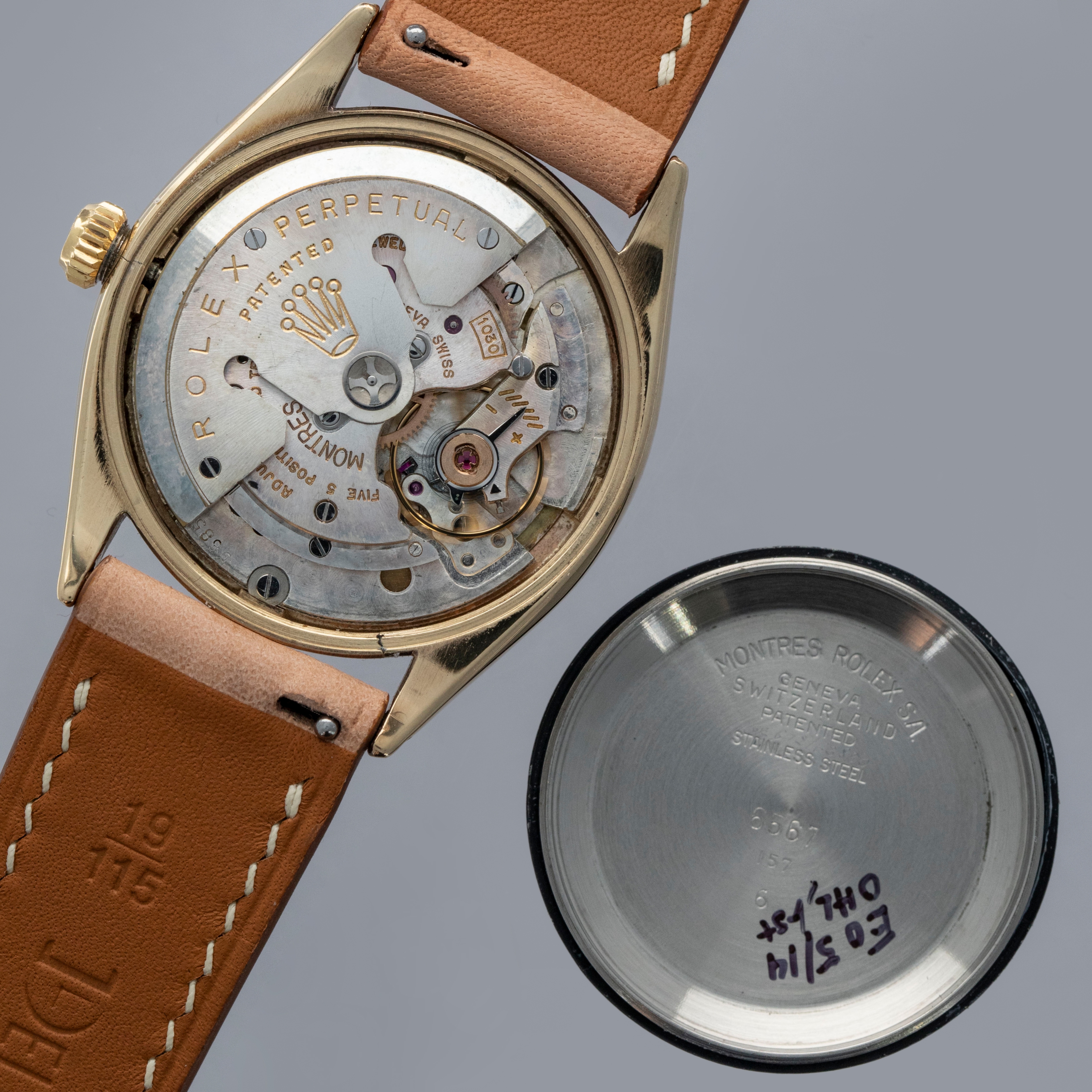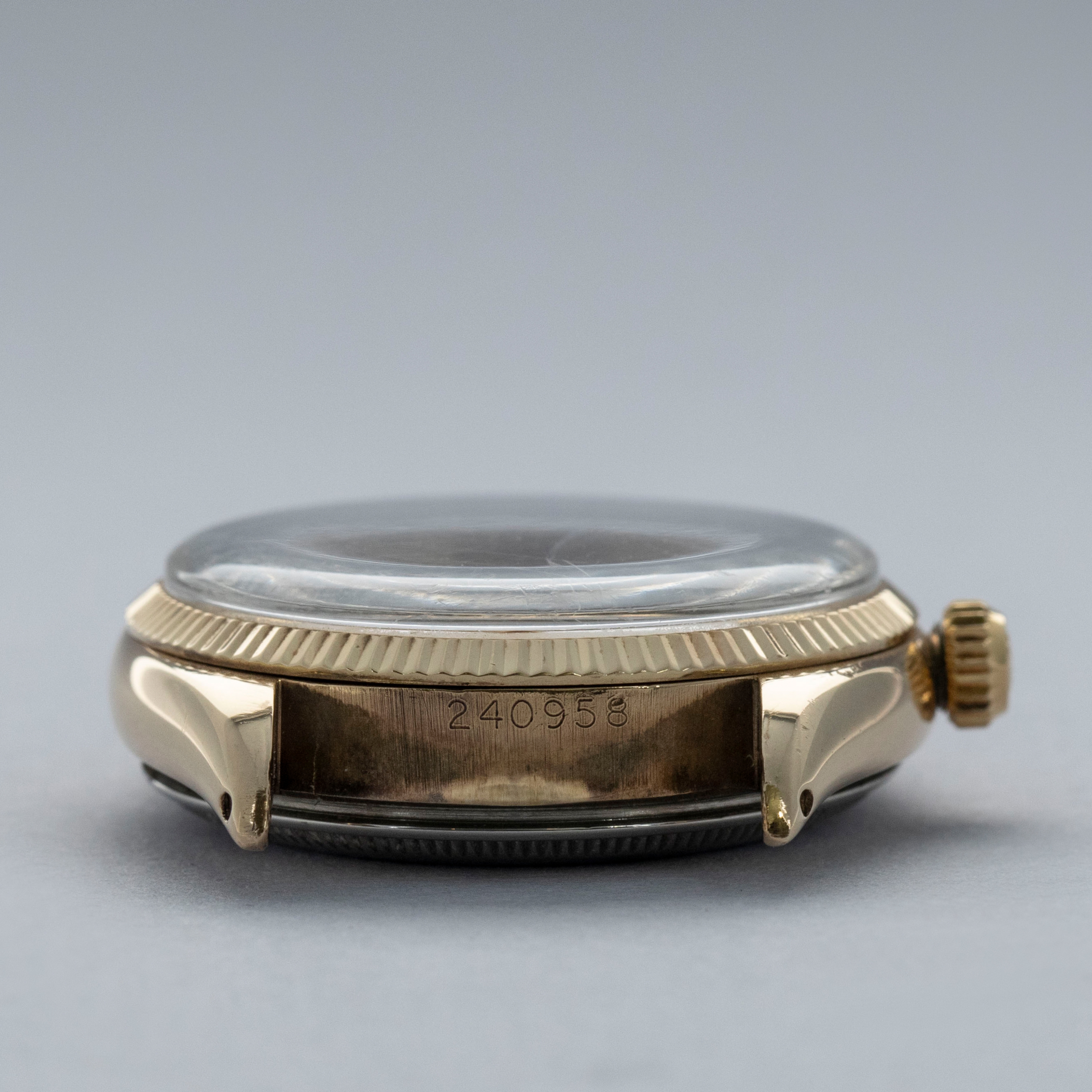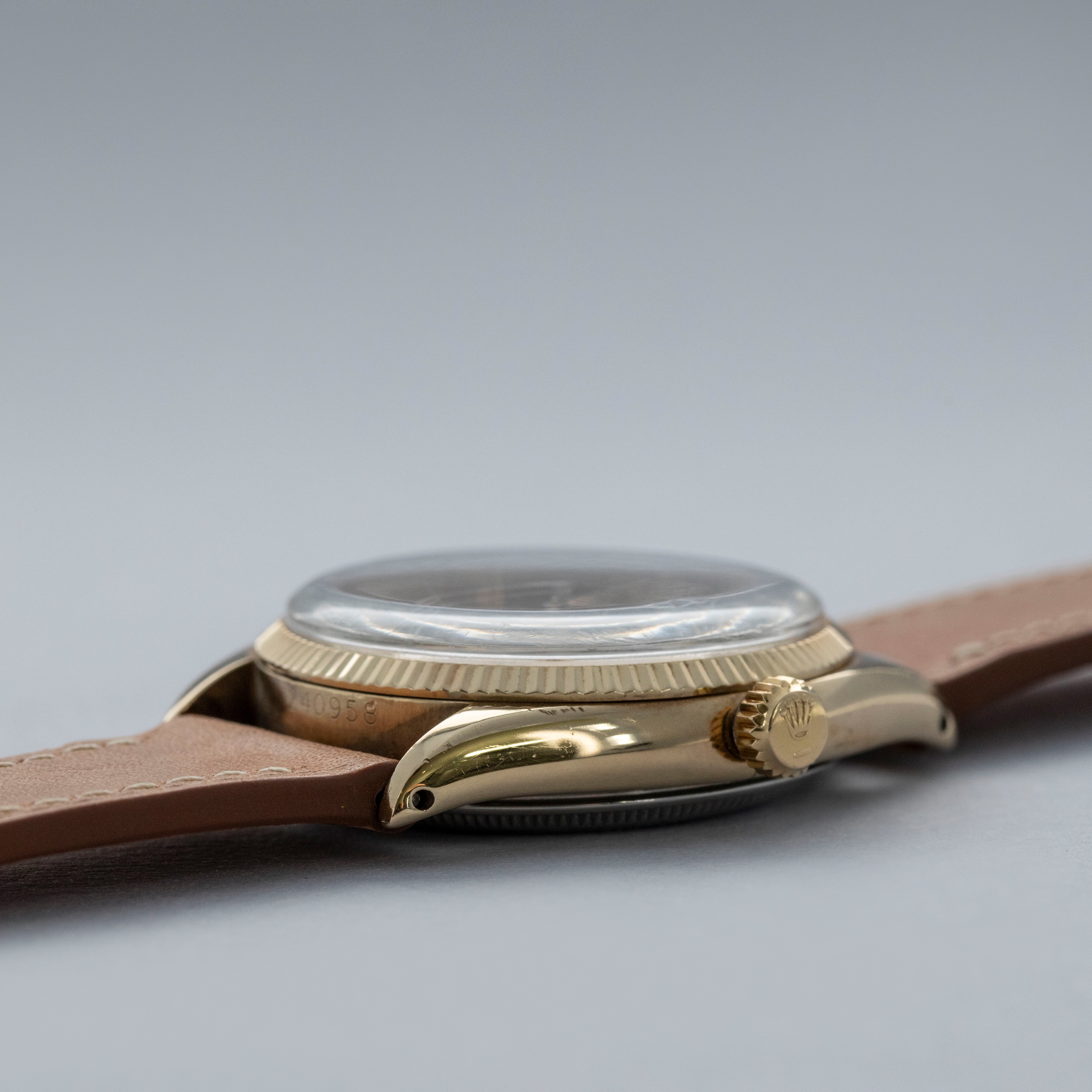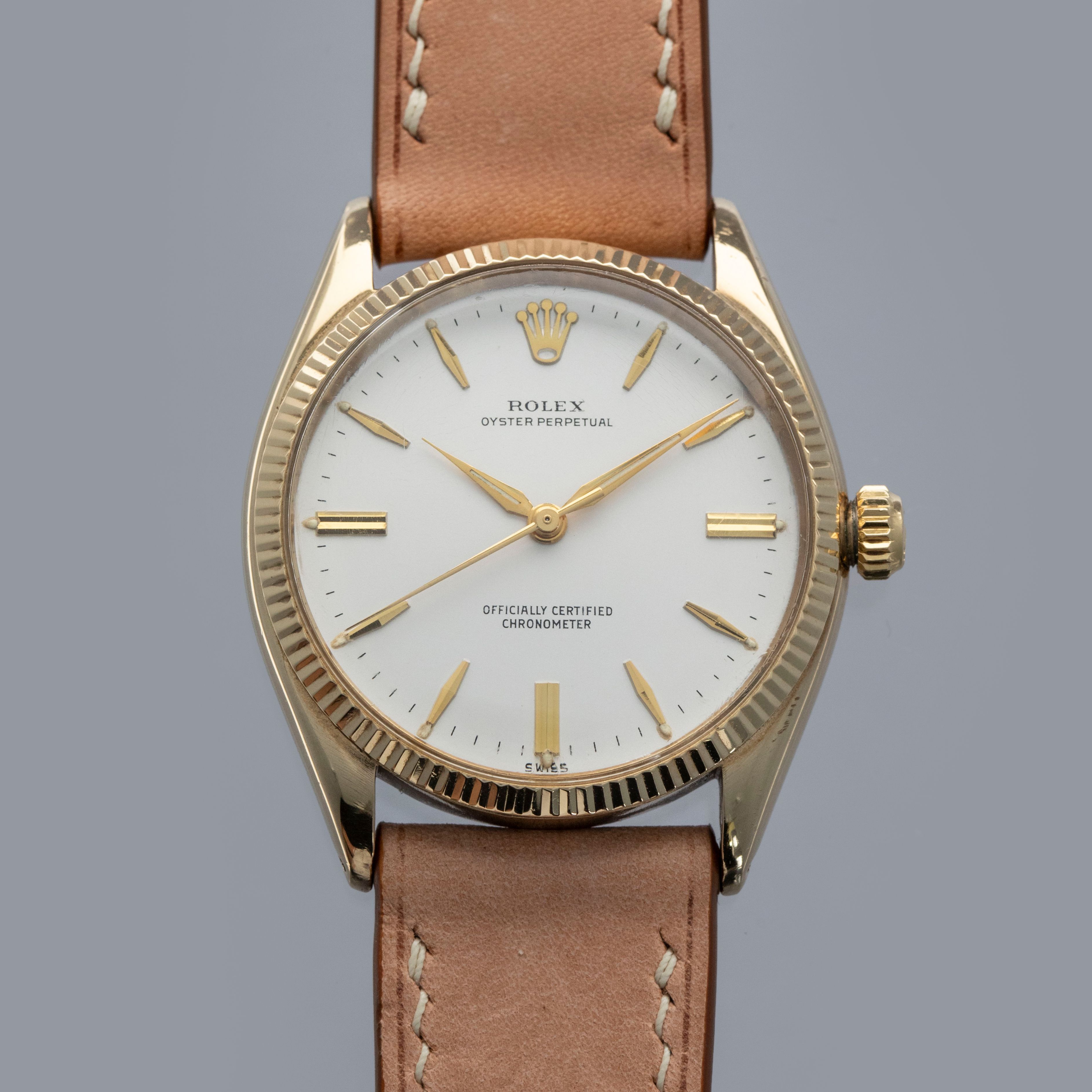 Watch is in overall excellent condition. The yellow gold–capped mid case shows surface scratches and marks consistent with age, while the steel case back remains excellent with light surface marks present. The fluted bezel remains well defined. The white dial is very clean, with some damage to a few of the lume plots and slight degradation visible at the very edge between twelve and two o’clock. The dagger hands remain very clean. It is fitted with a new Delugs leather strap. Comes with Rolex service paperwork from the 1960s, a 1957 price list, and several 1950s booklets.