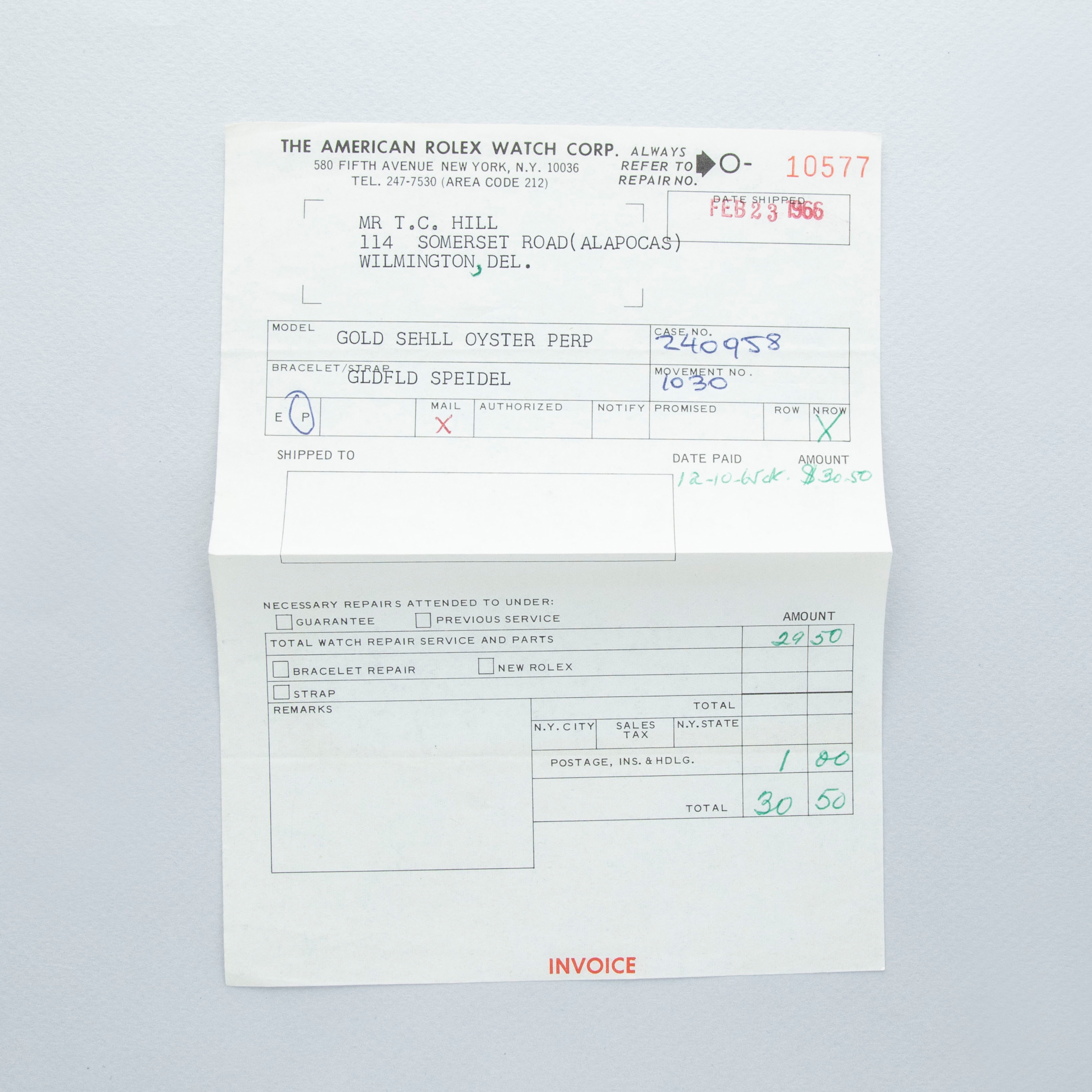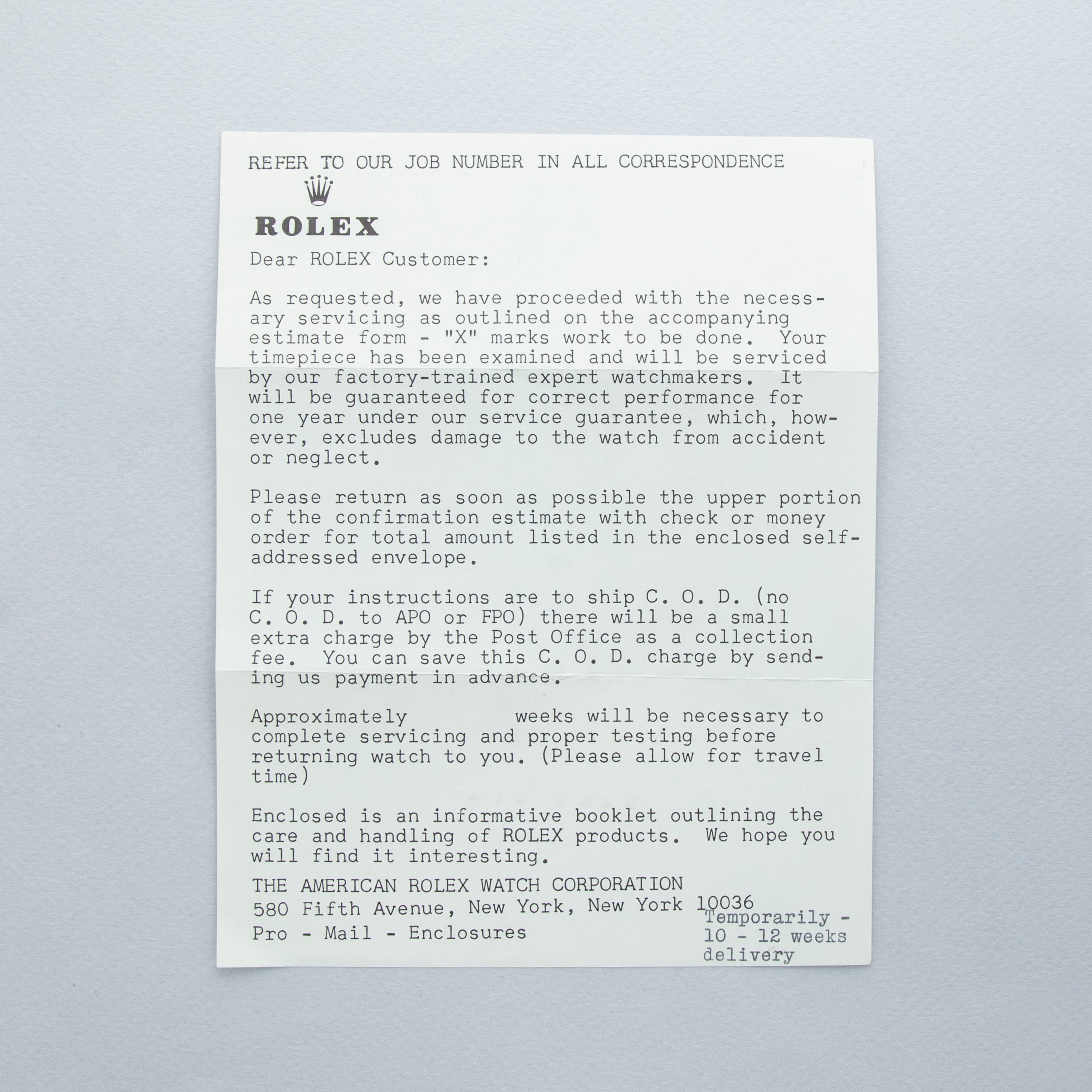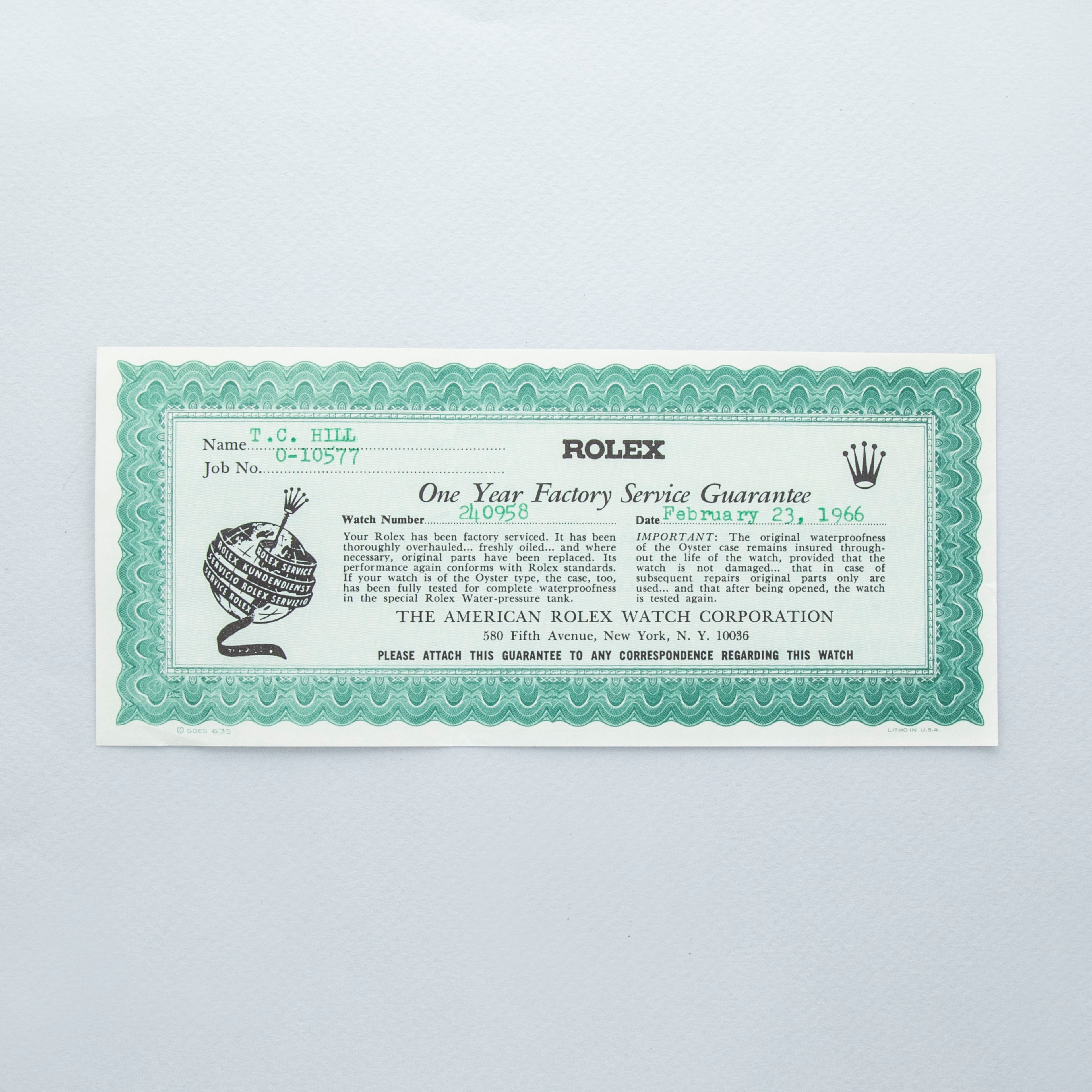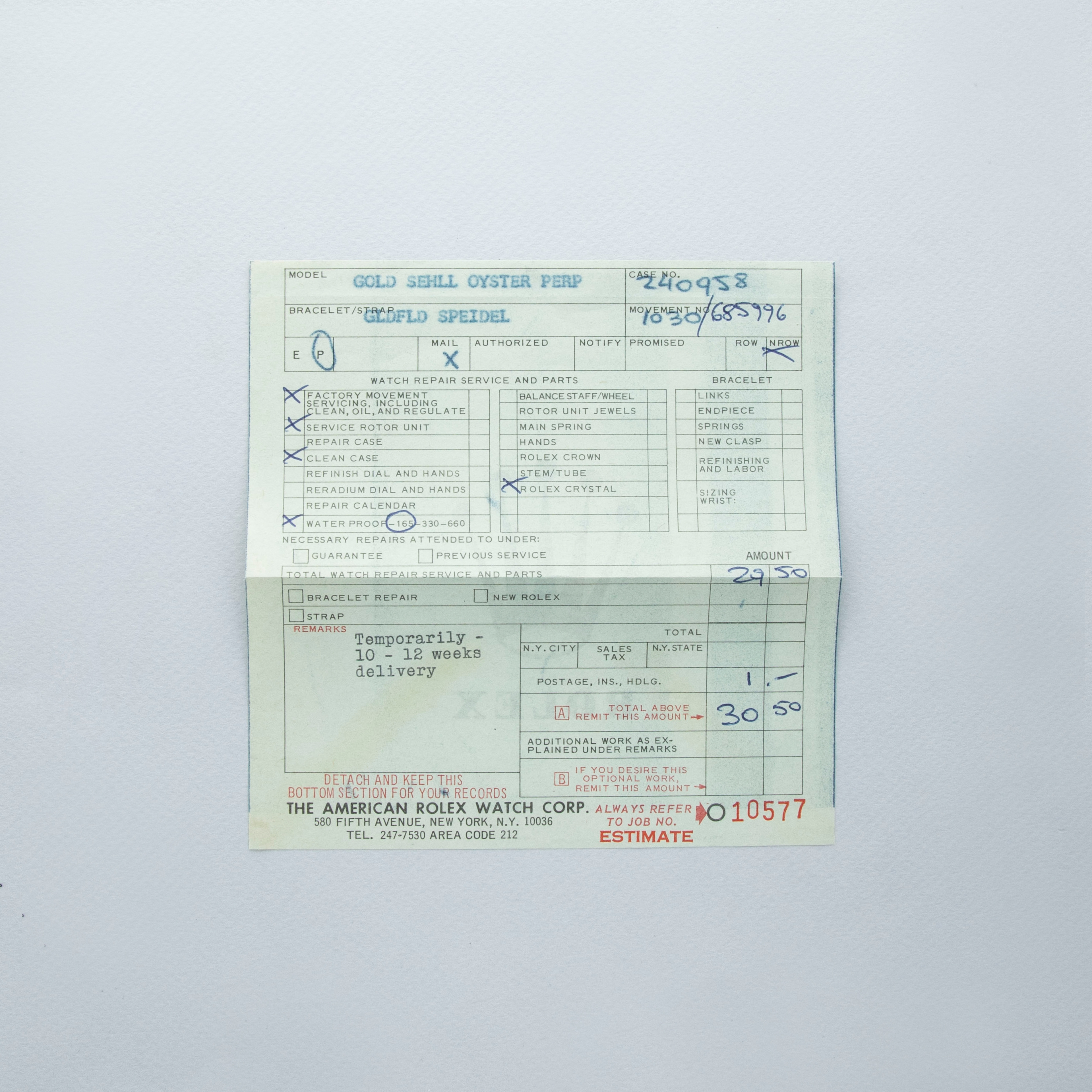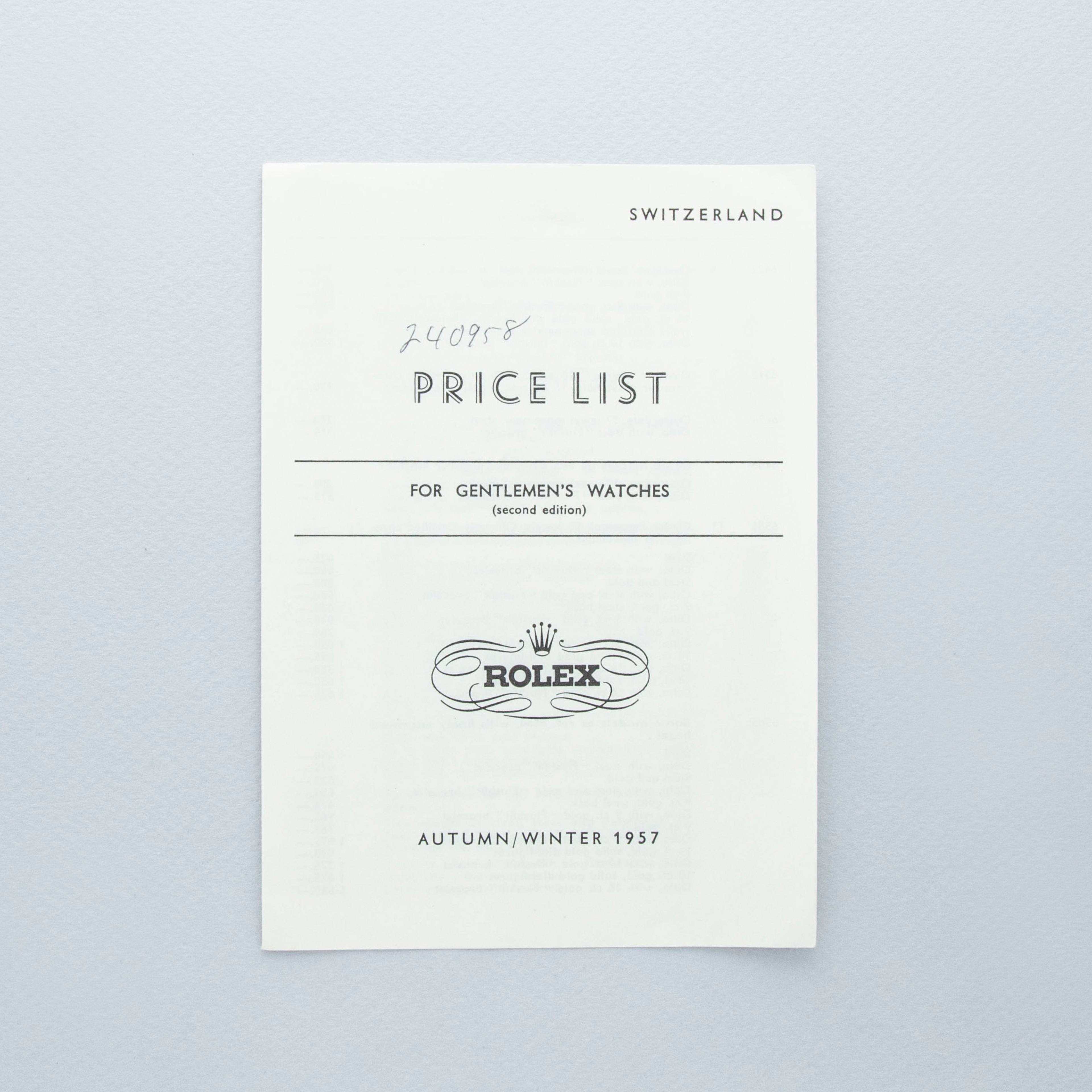 Watch is in overall excellent condition. The yellow gold–capped mid case shows surface scratches and marks consistent with age, while the steel case back remains excellent with light surface marks present. The fluted bezel remains well defined. The white dial is very clean, with some damage to a few of the lume plots and slight degradation visible at the very edge between twelve and two o’clock. The dagger hands remain very clean. It is fitted with a new Delugs leather strap. Comes with Rolex service paperwork from the 1960s, a 1957 price list, and several 1950s booklets.