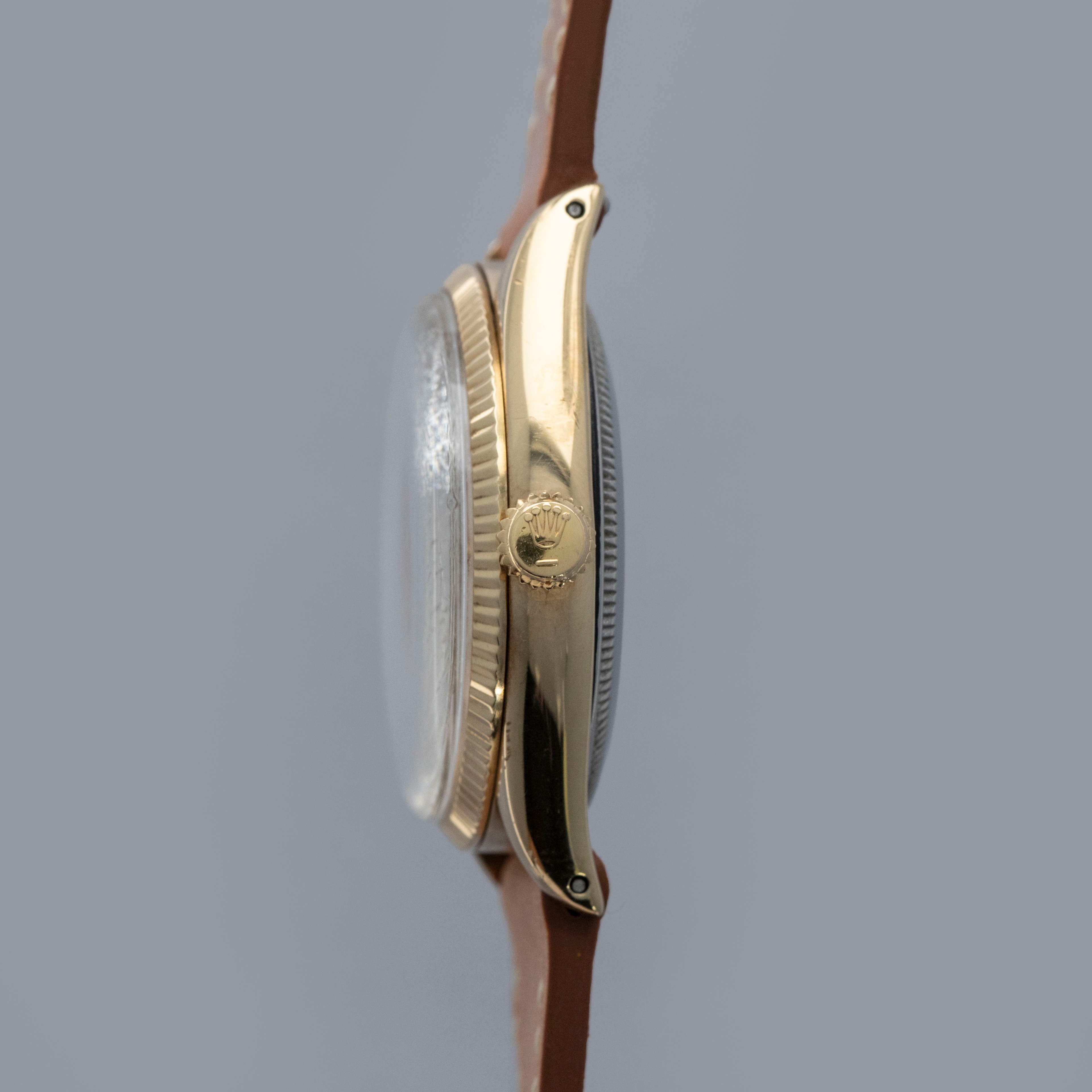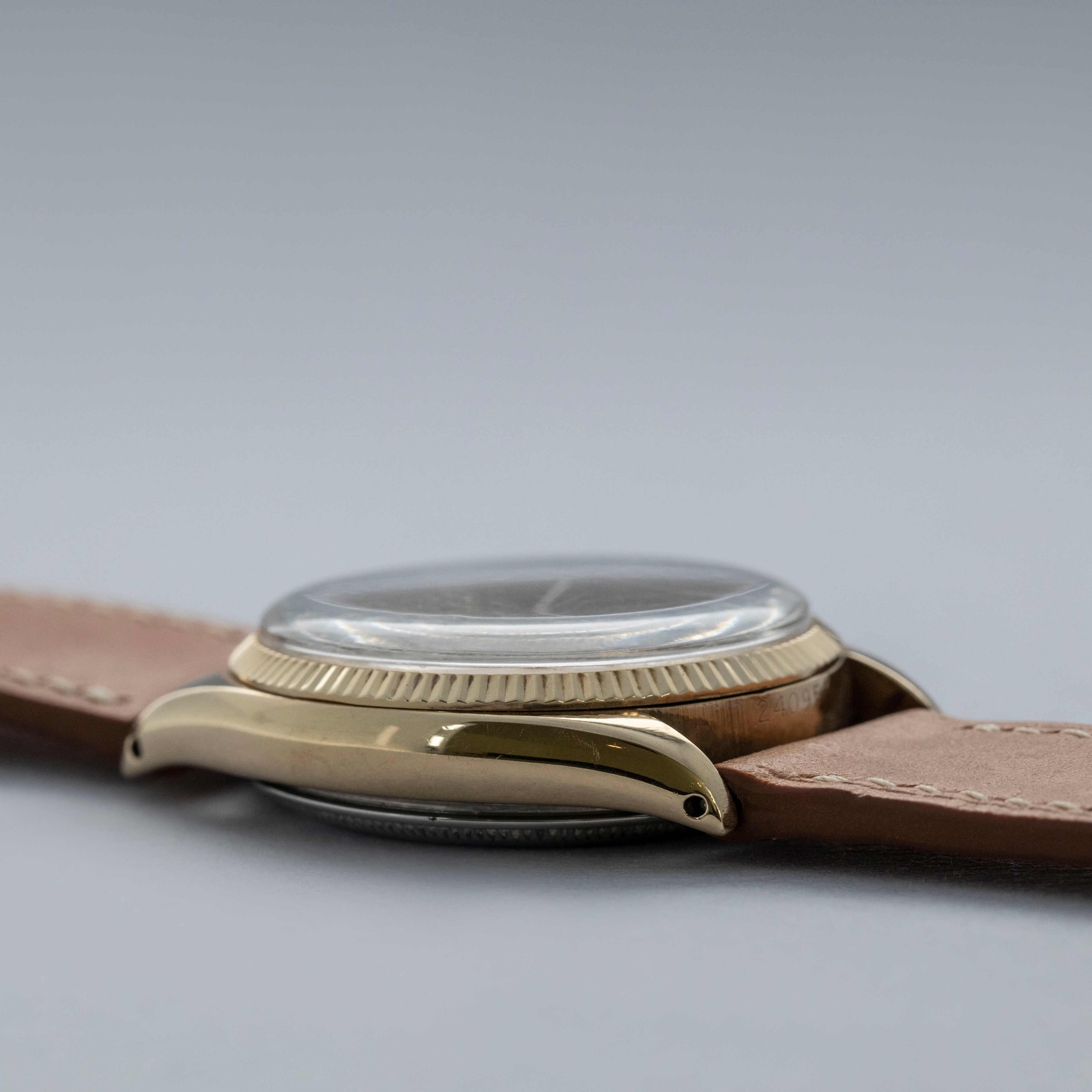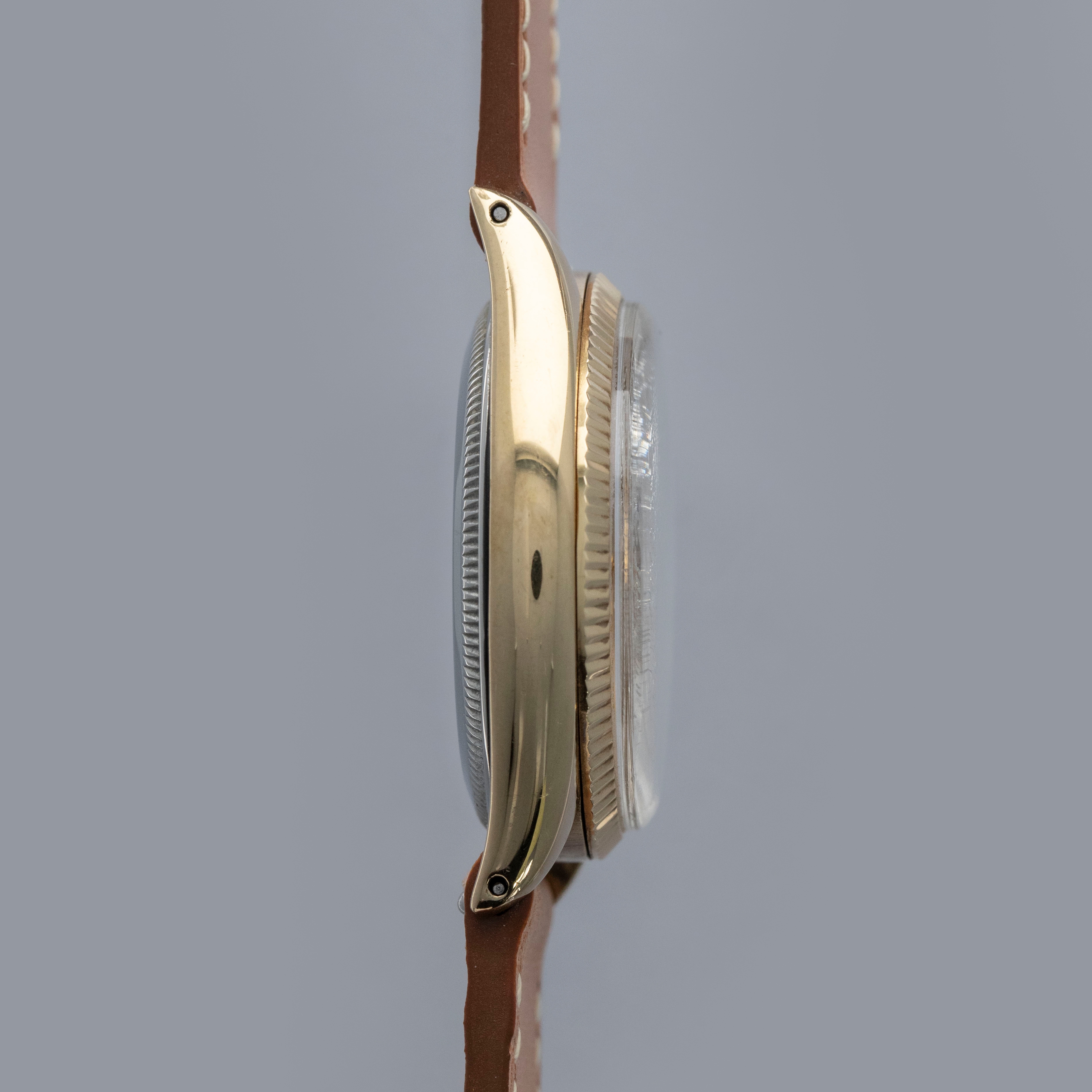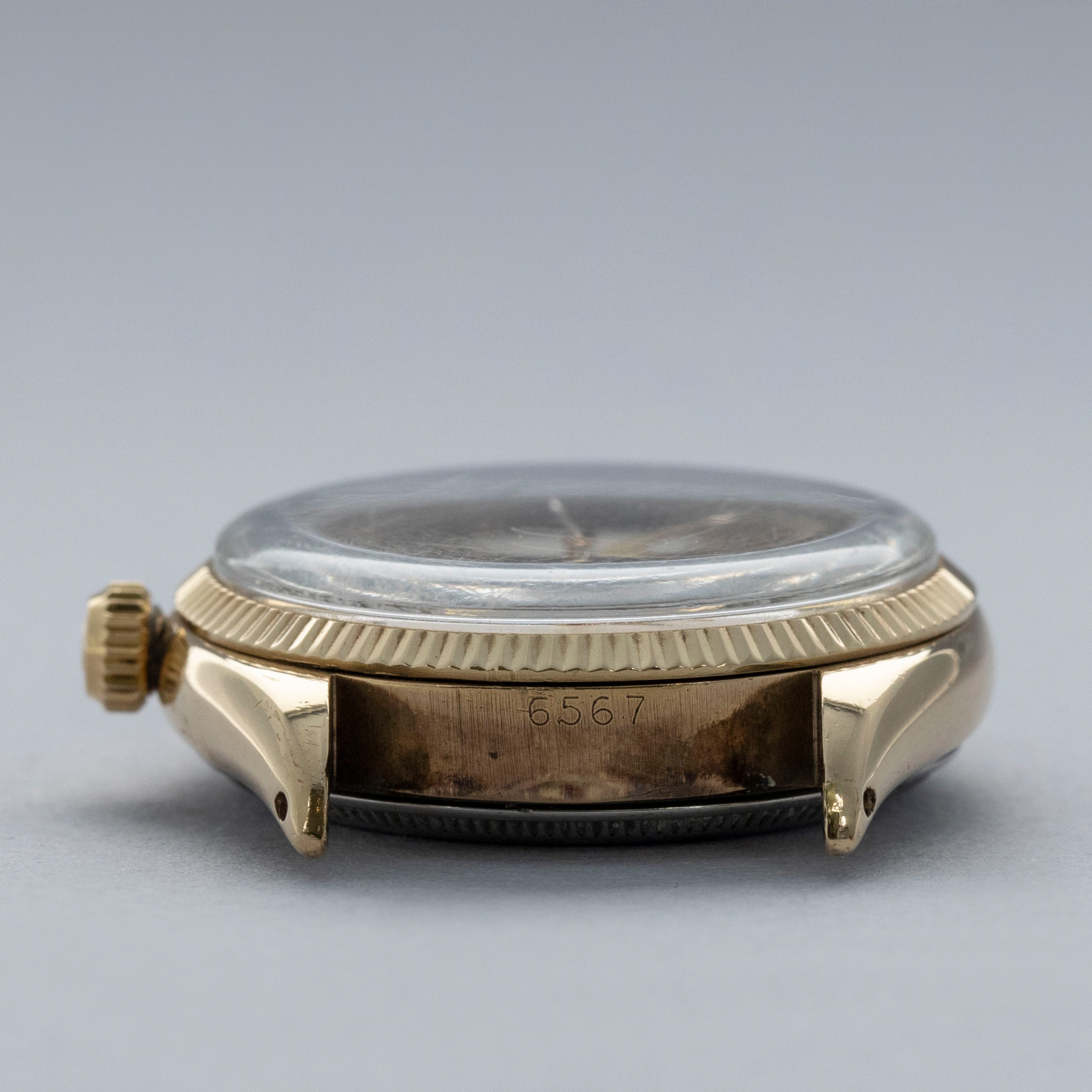 Boasting a 34mm case made of gold plated steel, the ref. 6567's case is instantly recognizable as a Rolex, with its fluted bezel and oyster case construction.