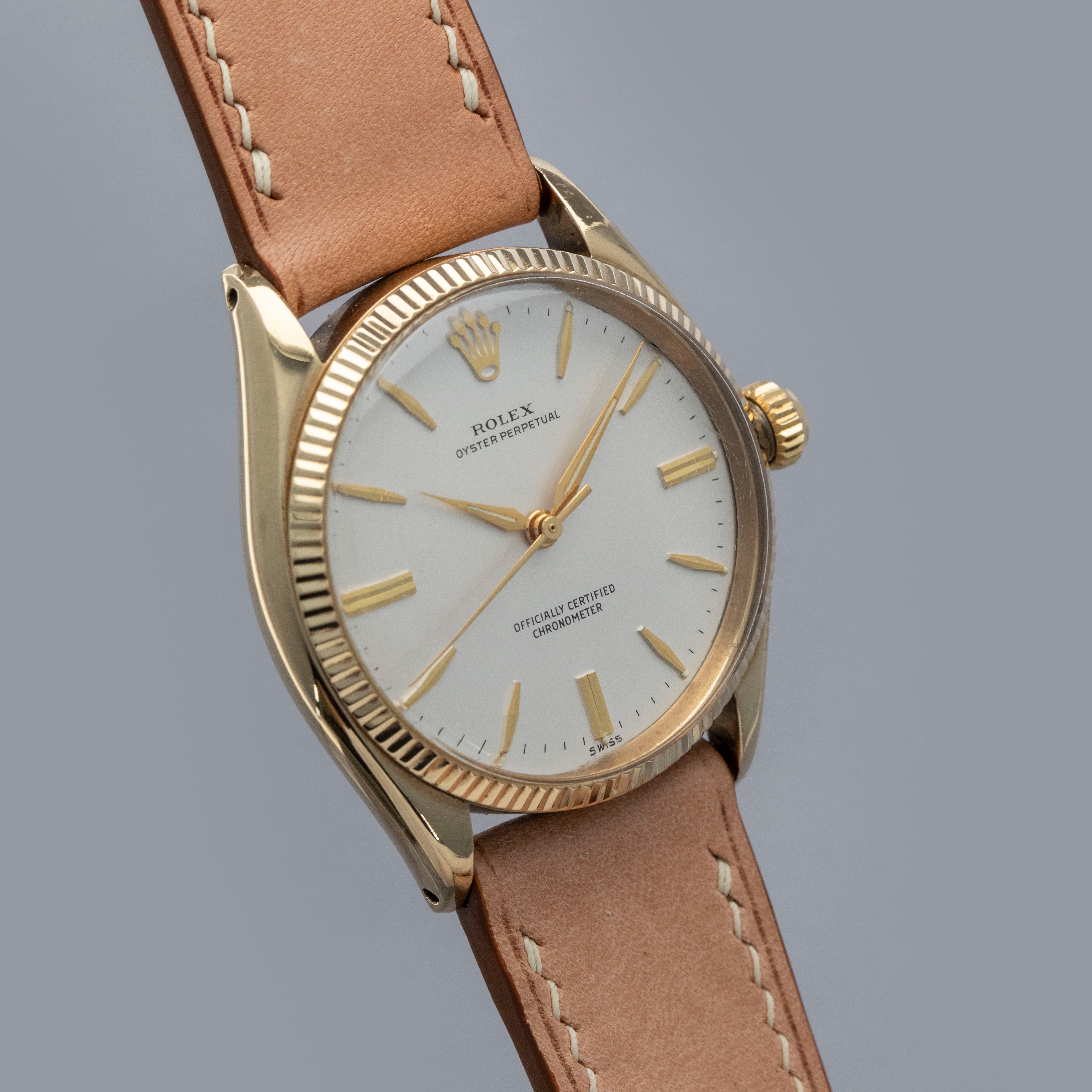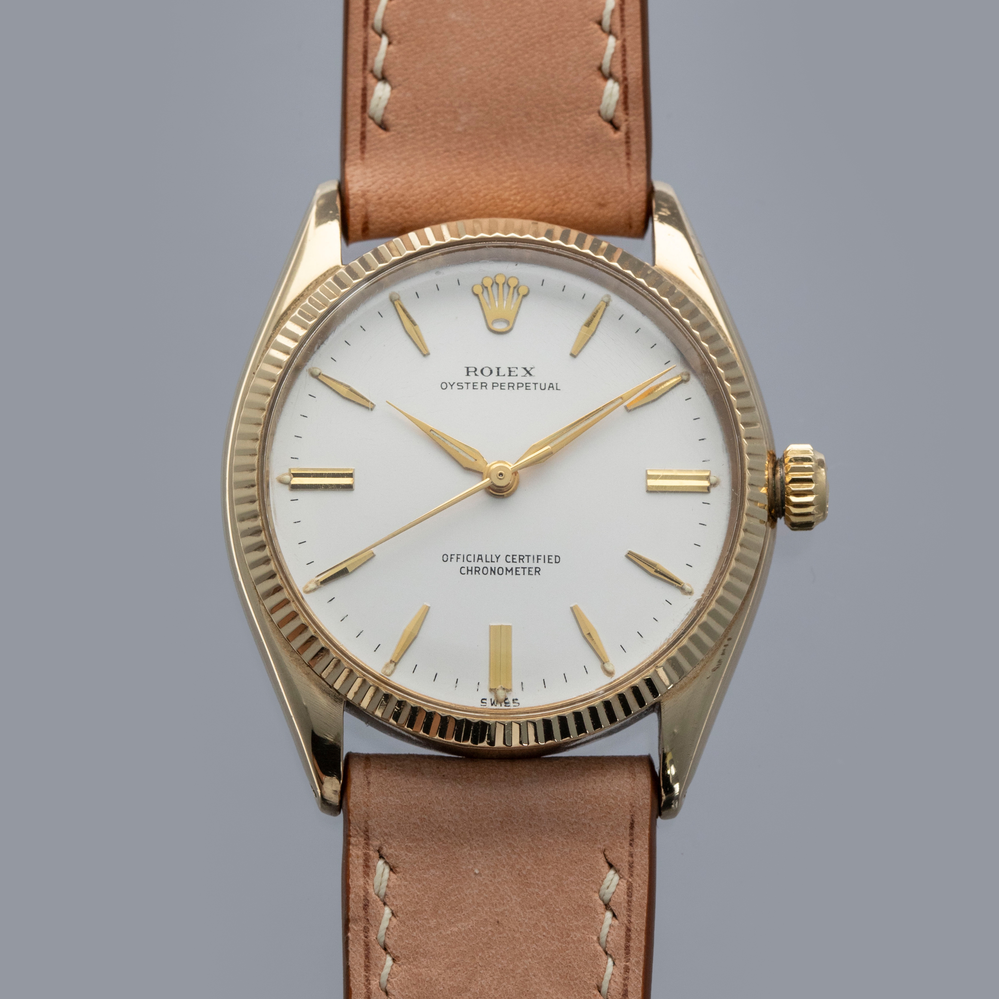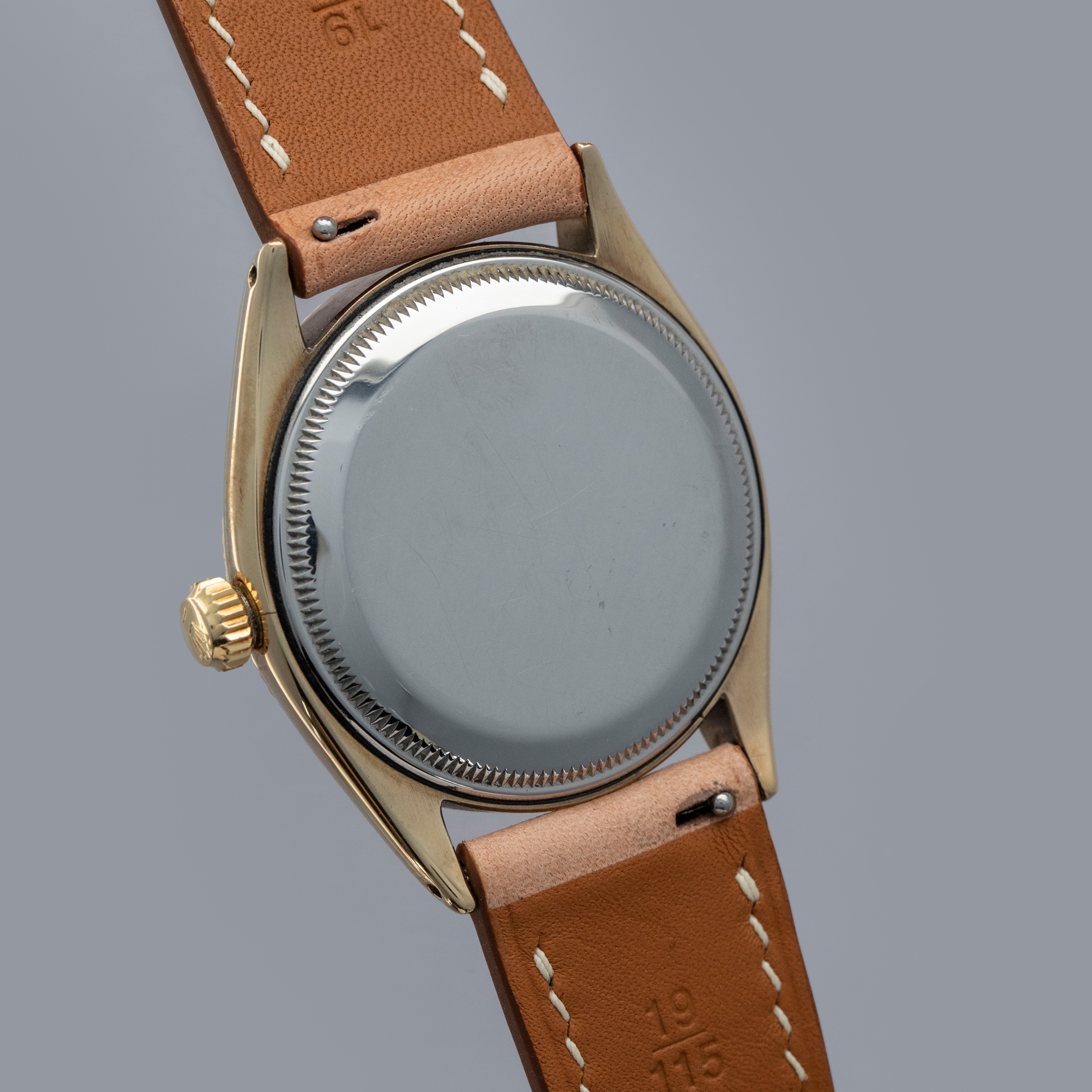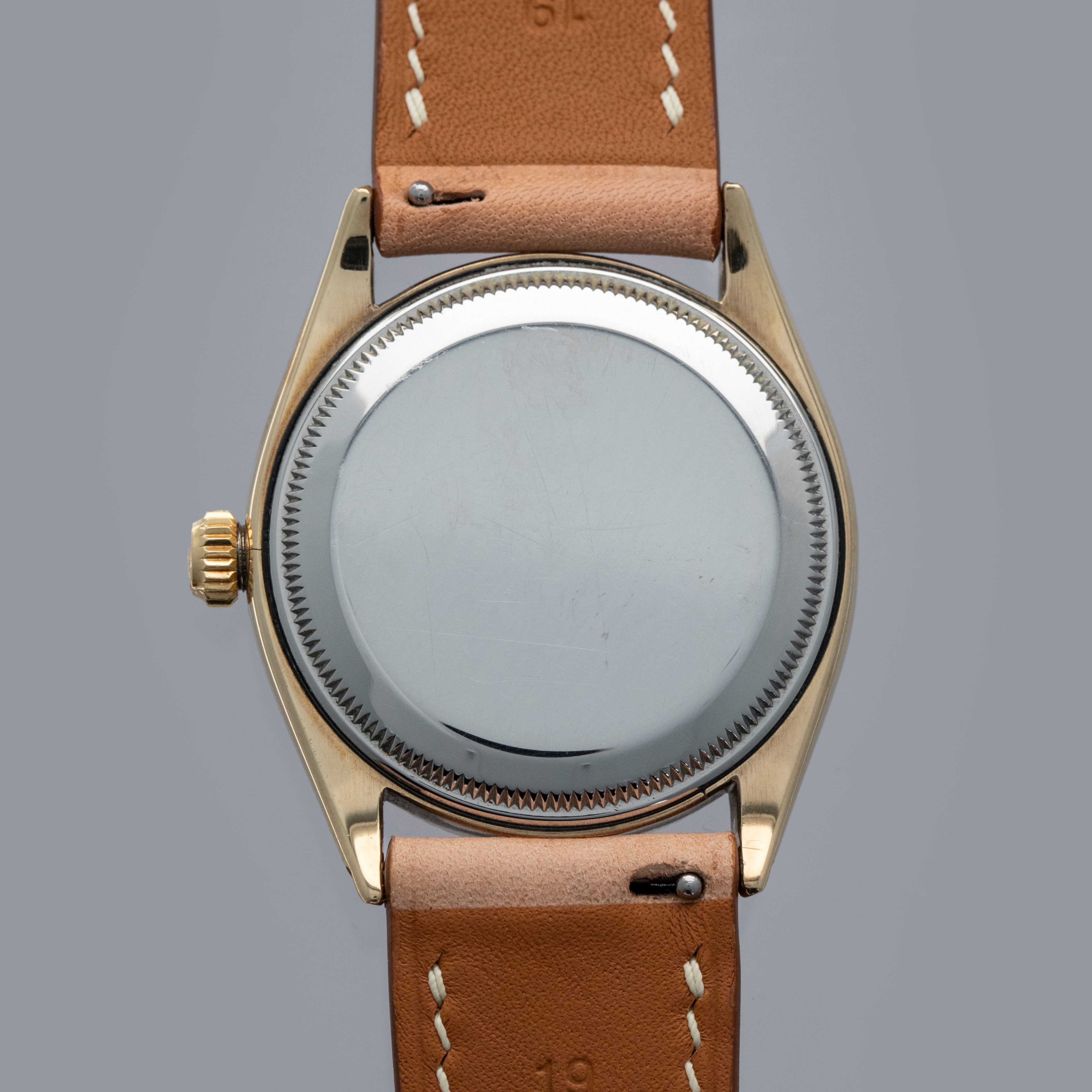 Boasting a 34mm case made of gold plated steel, the ref. 6567's case is instantly recognizable as a Rolex, with its fluted bezel and oyster case construction.