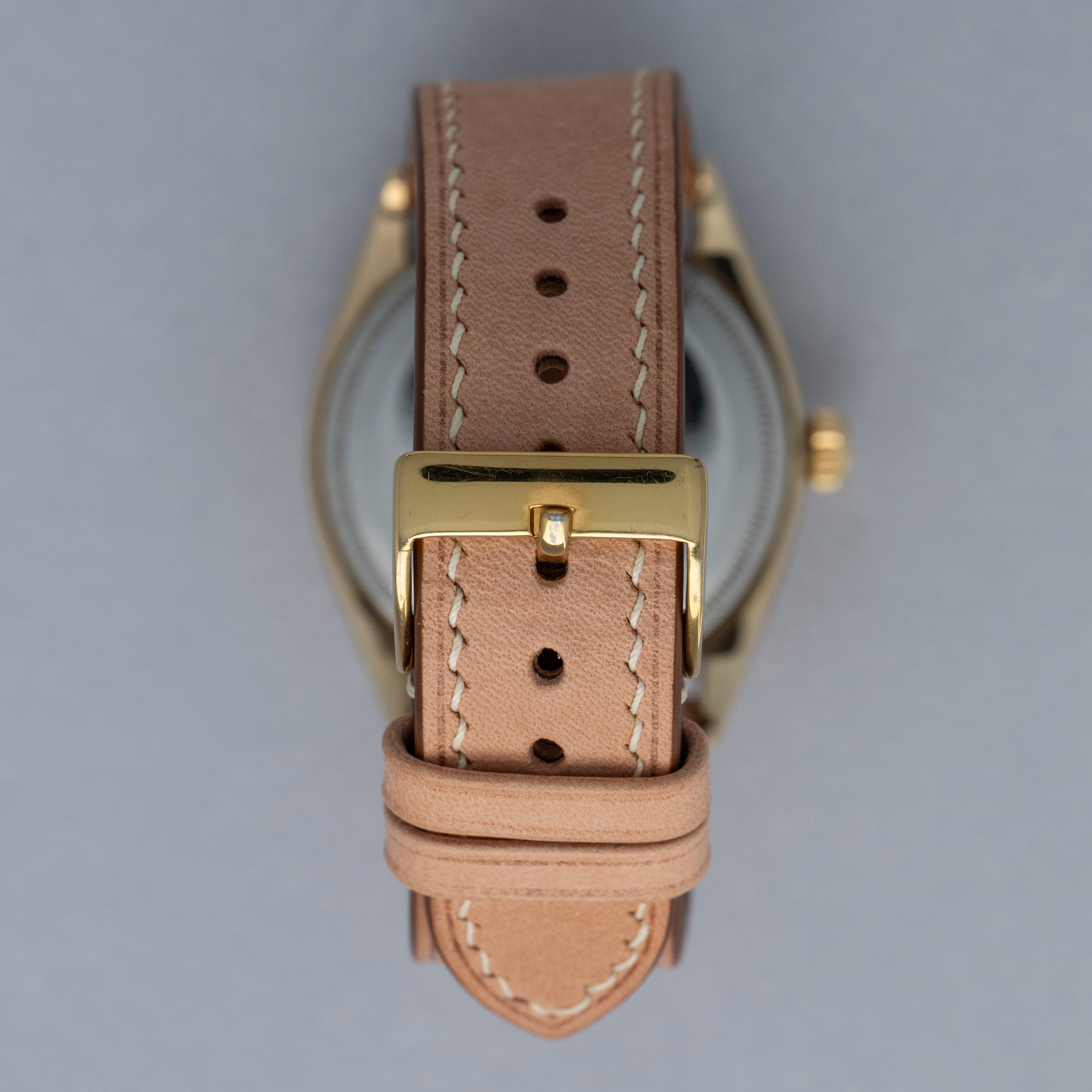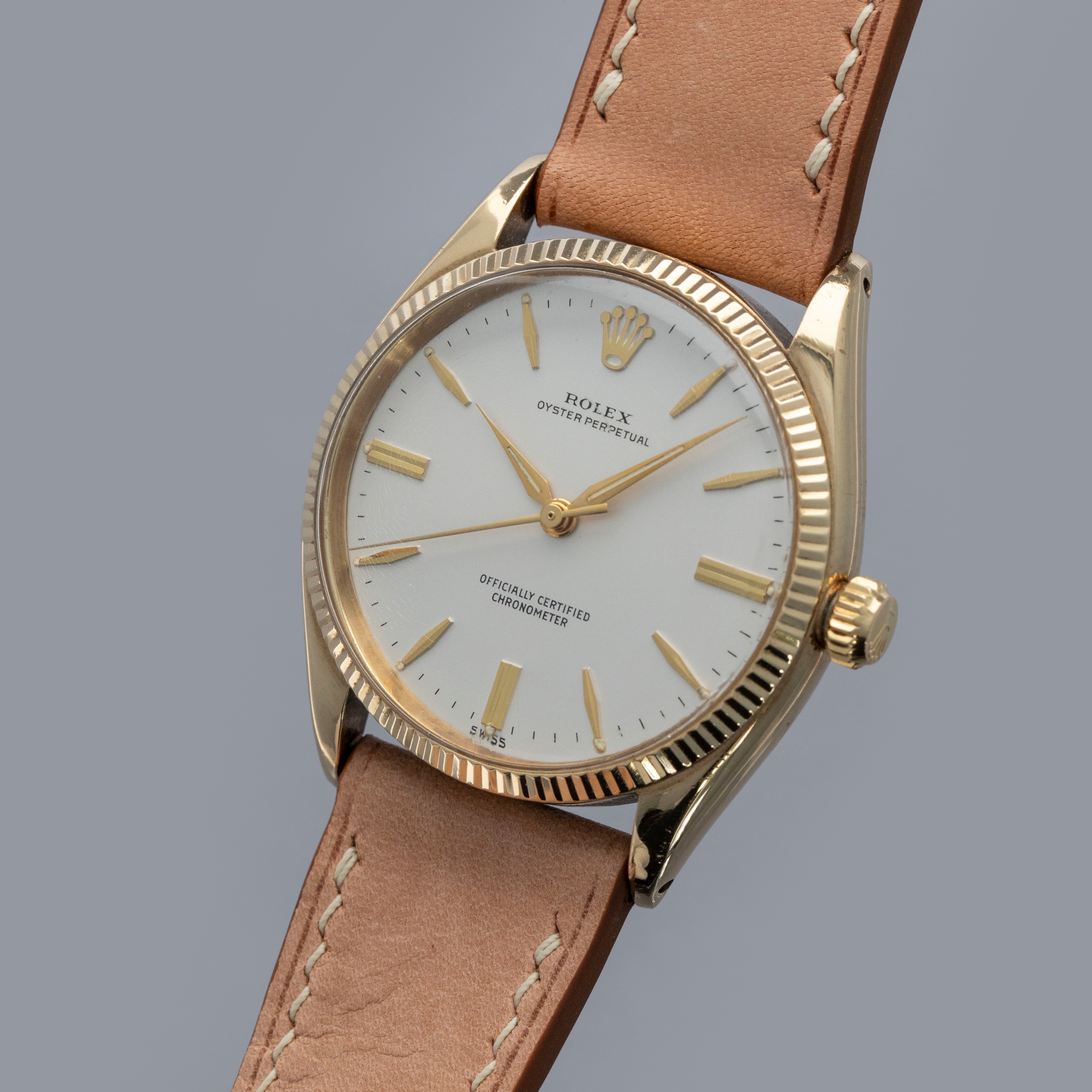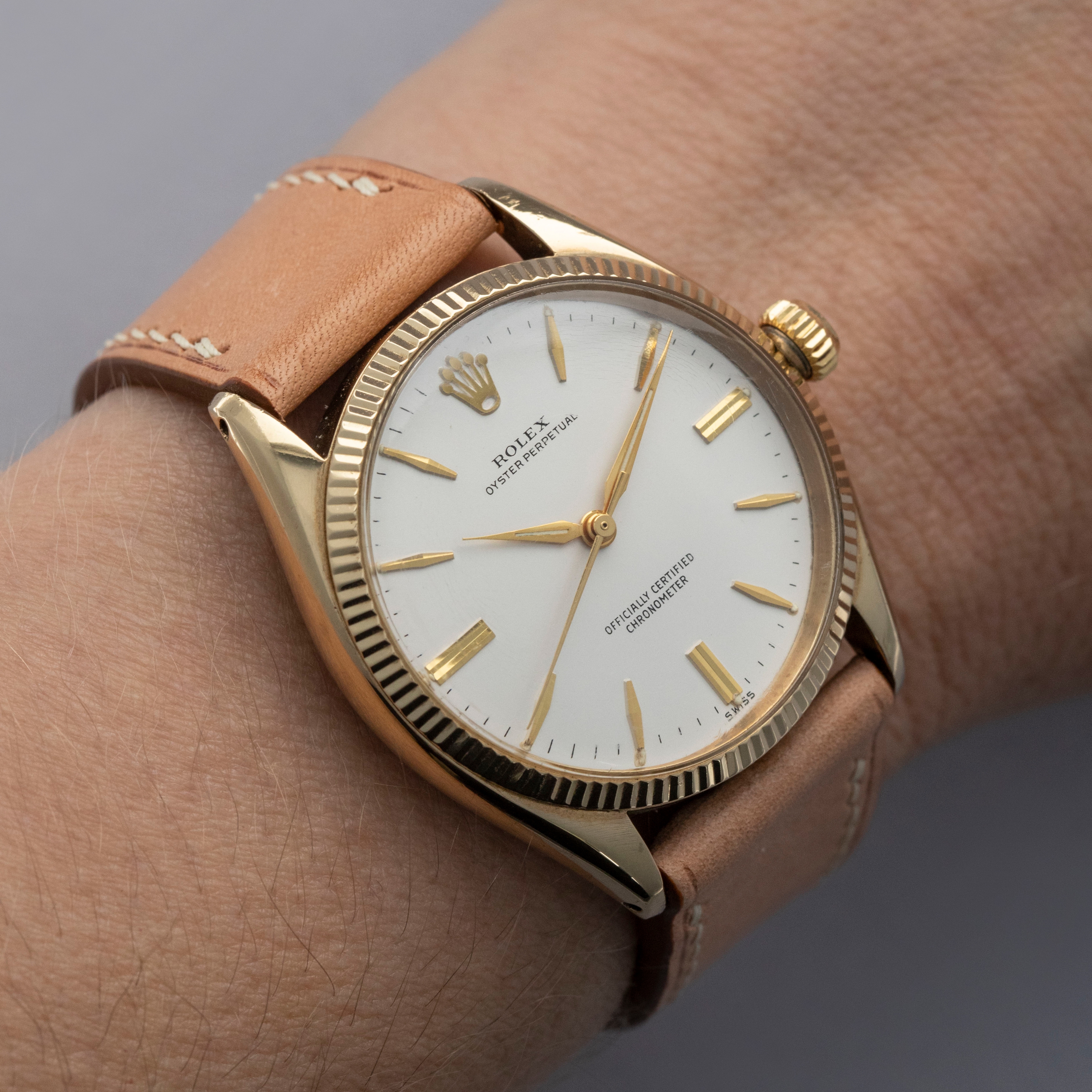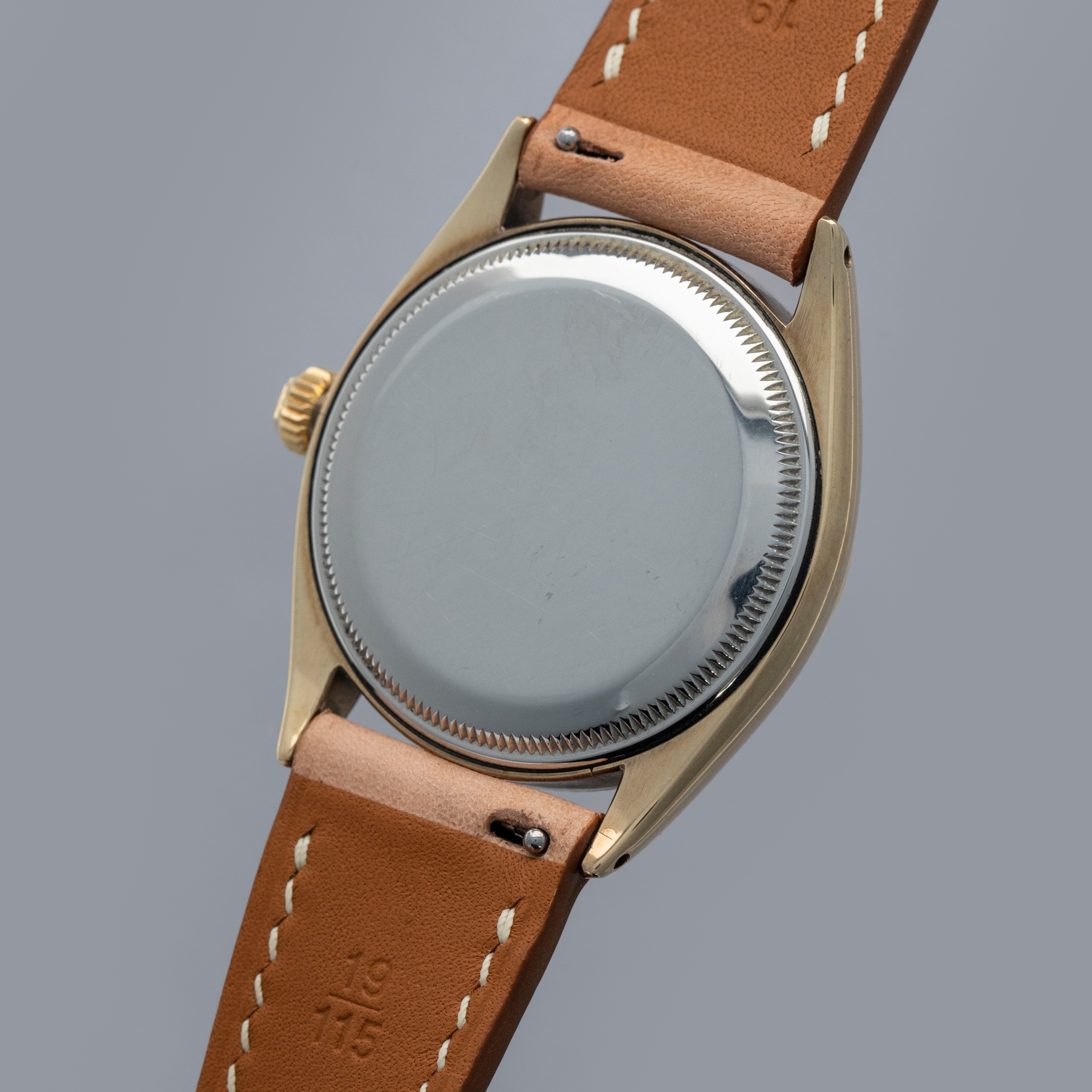 Boasting a 34mm case made of gold plated steel, the ref. 6567's case is instantly recognizable as a Rolex, with its fluted bezel and oyster case construction.