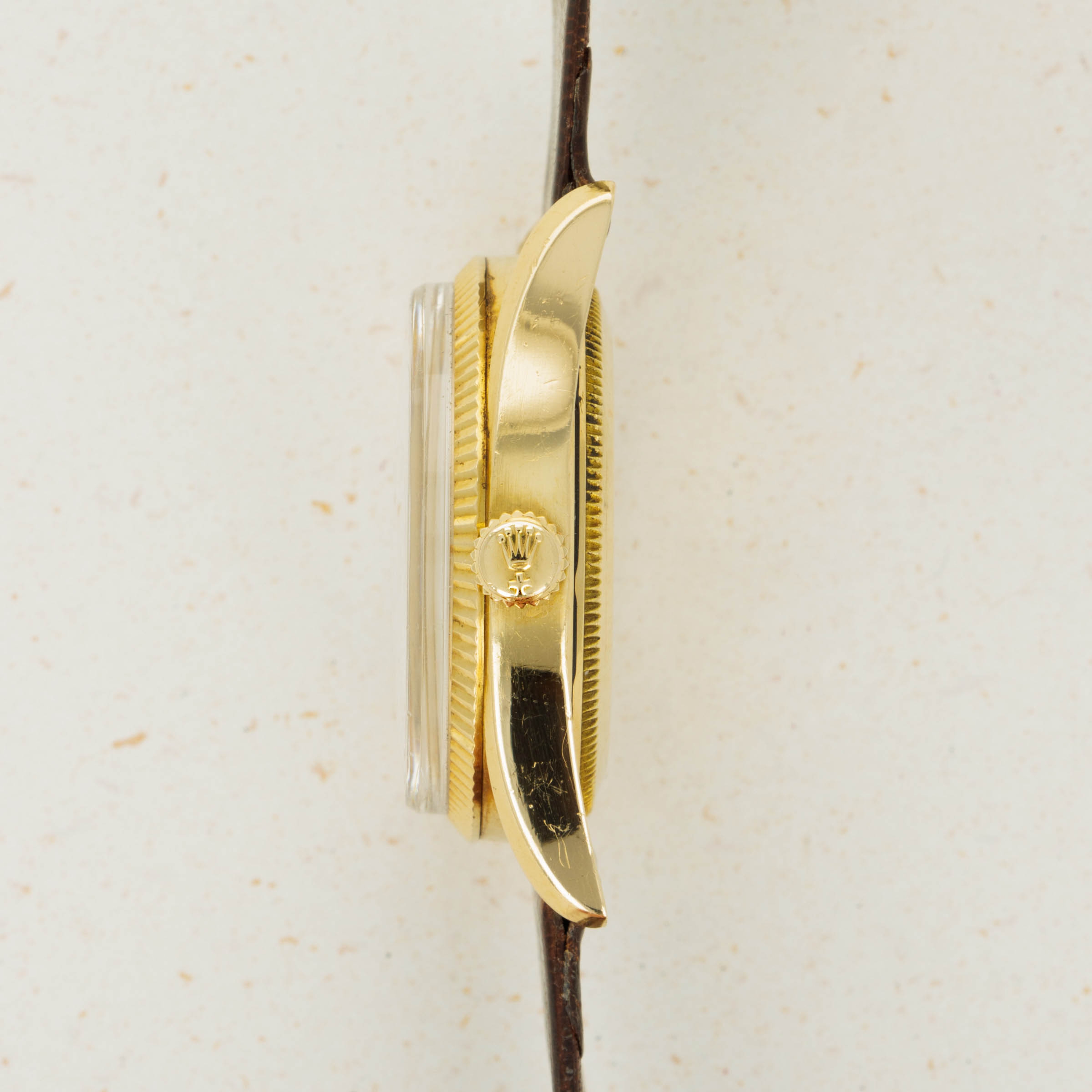 Featuring a stunning diamond-set champagne dial this remarkable dial retains its sword-shaped hour markers and elegant dauphine hands; however the star of the show is the subtle co-signed signature of Serpico Y Laino, the legendary Venezuelan watch retailer.