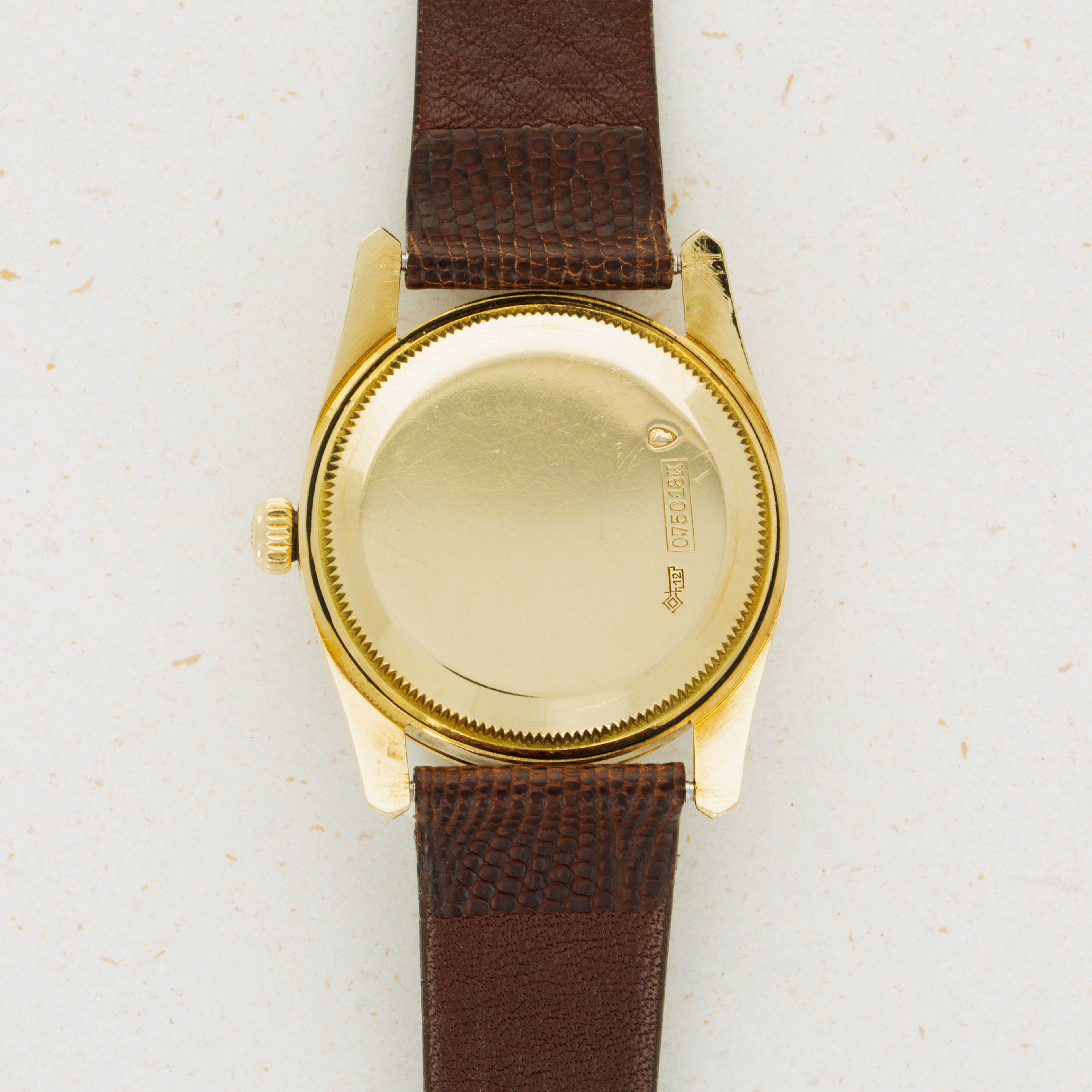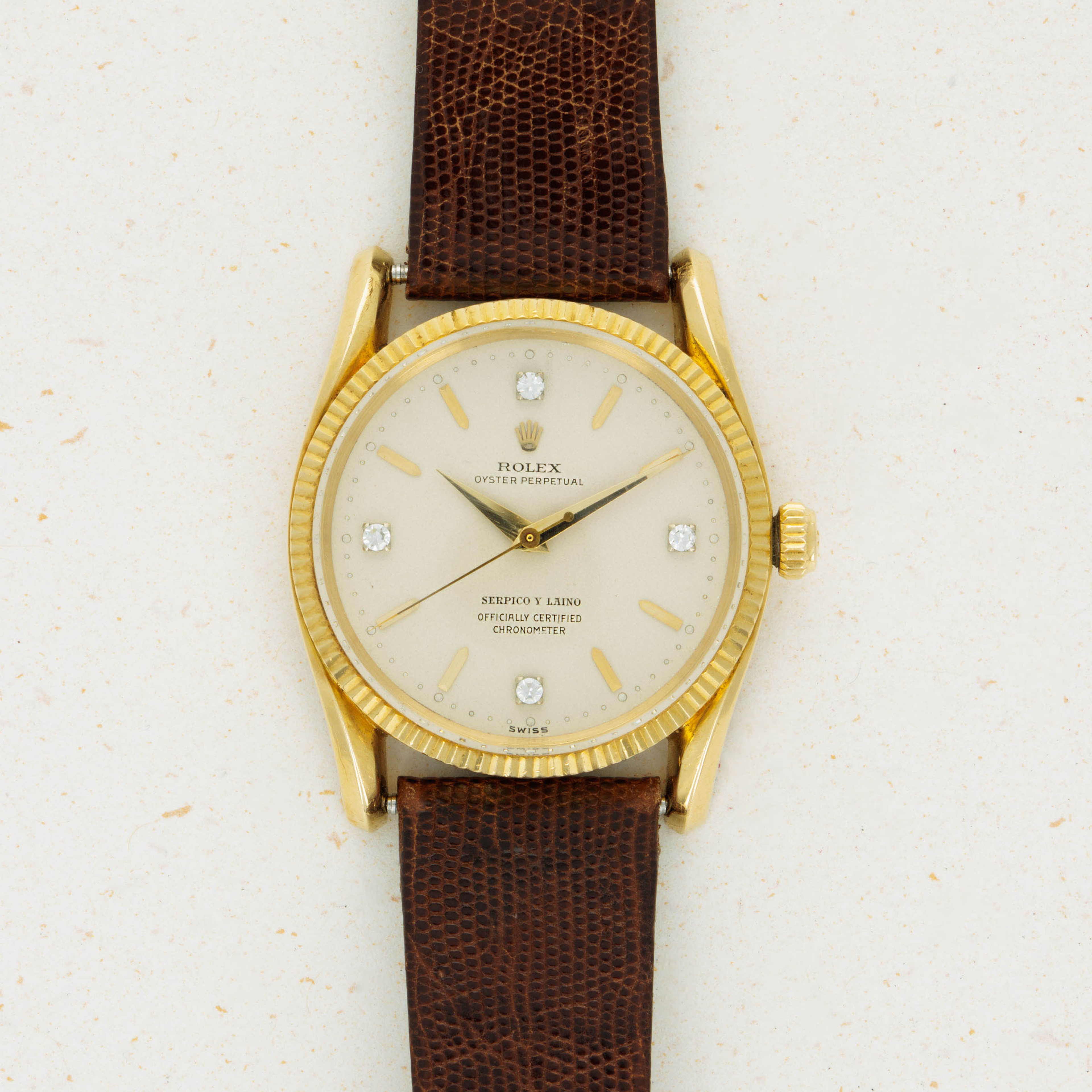 Introduced in 1933 and produced long into the early 1950s, the Rolex Bubbleback saw countless variations of itself produced in various metals, with an exhaustive array of dial configurations and a plethora of different bracelets and straps utilized over its storied past. Perhaps one of the most elusive of these combinations is the Oyster Perpetual “bombé” or “Bombay” in English, meaning “domed.” Offered with a wide variety of dials across its several references, the Oyster Perpetual Bombay is named as such due to its incredibly unique domed lugs. Unlike the majority of Rolex’s designs, the Bombay’s eponymous lugs are accentuated through sharp bevels along their hoods and gentle slopes as they wrap around the watch and sit into its mid-case. Produced from the 1940s until the 1950s, this incredibly rare variety of the Oyster Perpetual Bubbleback is an enthusiast favorite. Examples like ours here remain incredibly hard to find, thanks to the deep appreciation collectors have for these wonderfully unique timepieces. In addition to its already rare status, our example is offered with a rare diamond-set co-signed dial with it bearing the signature of Serpico Y Laino, the legendary Venezuelan watch retailer who aided Rolex's expansion into the South American continent.