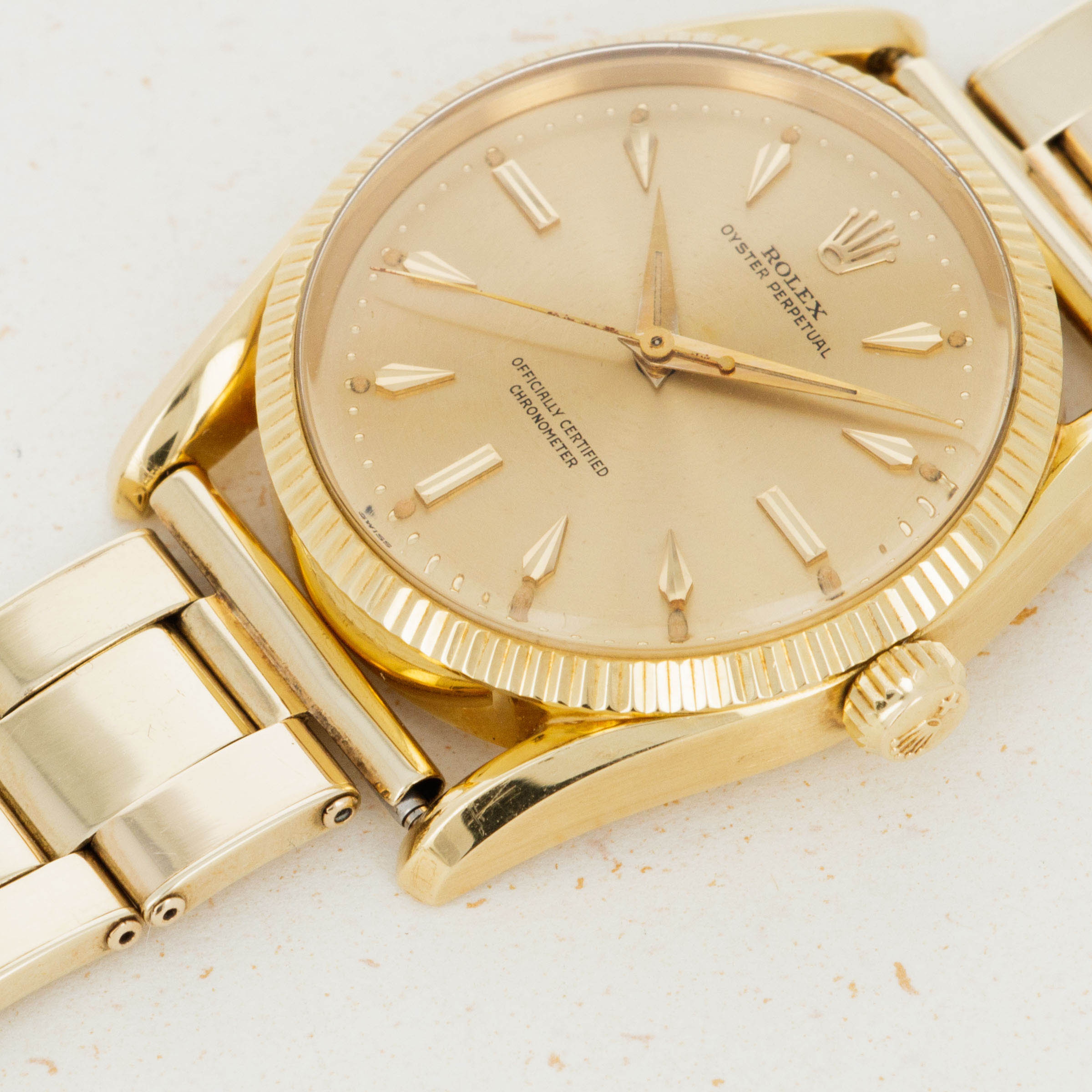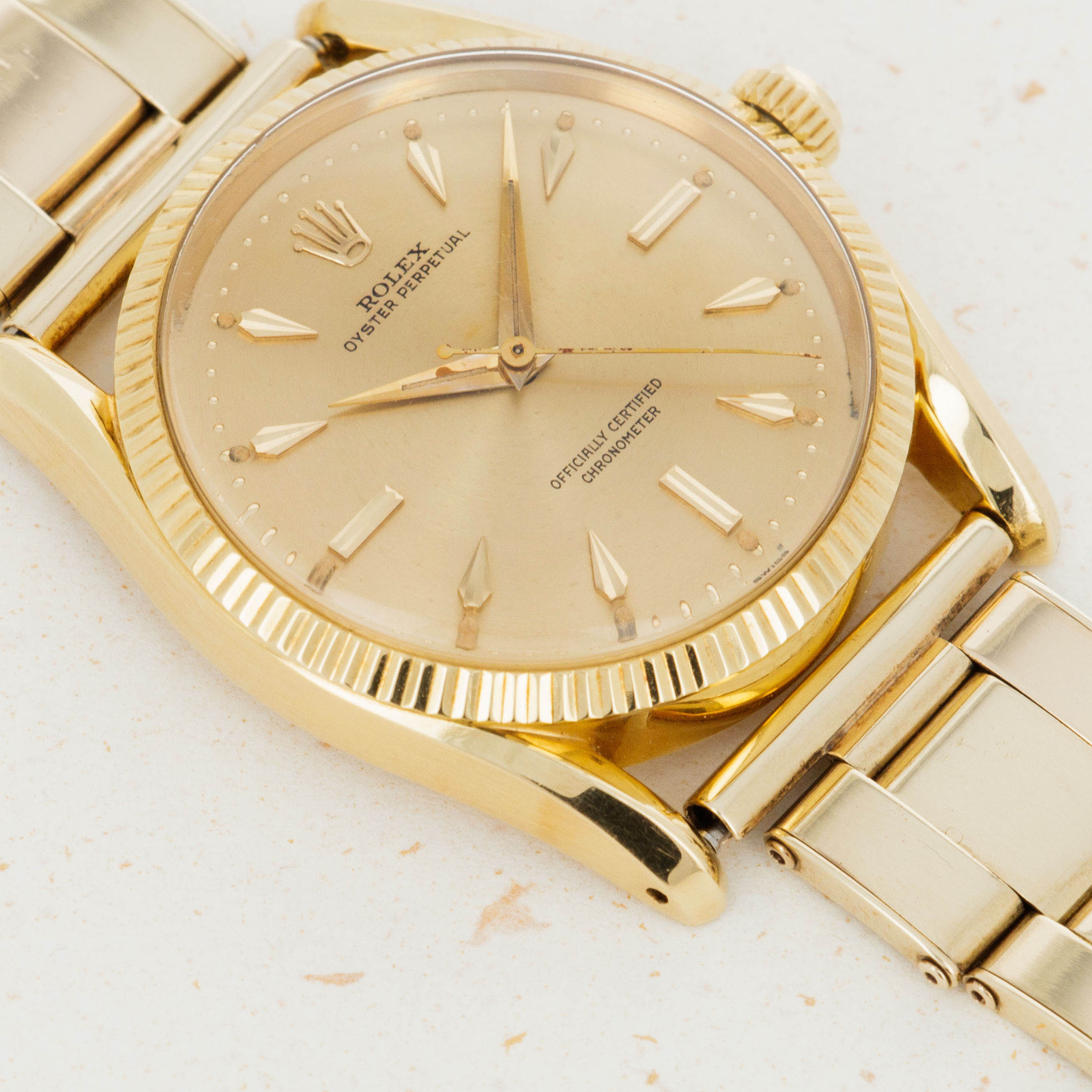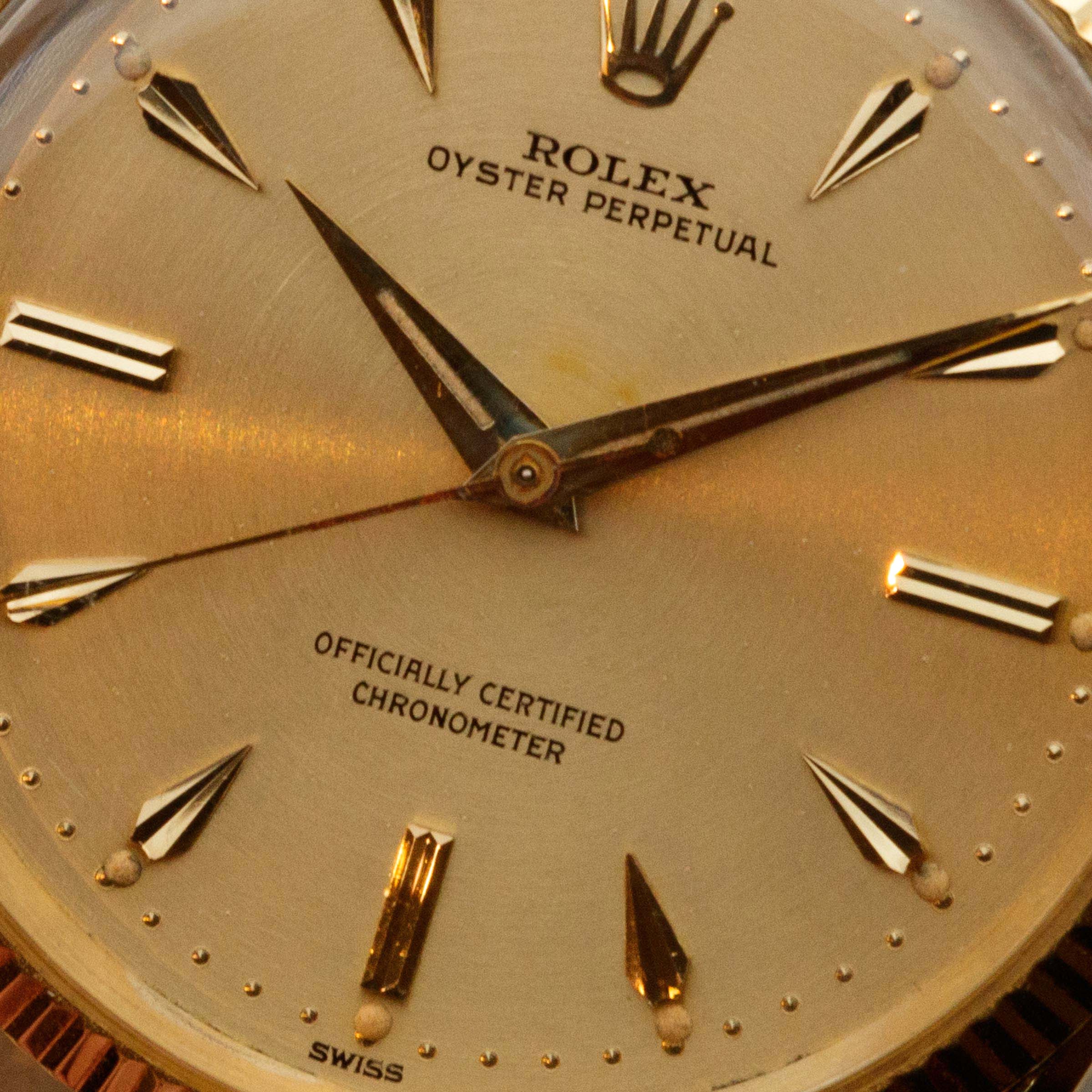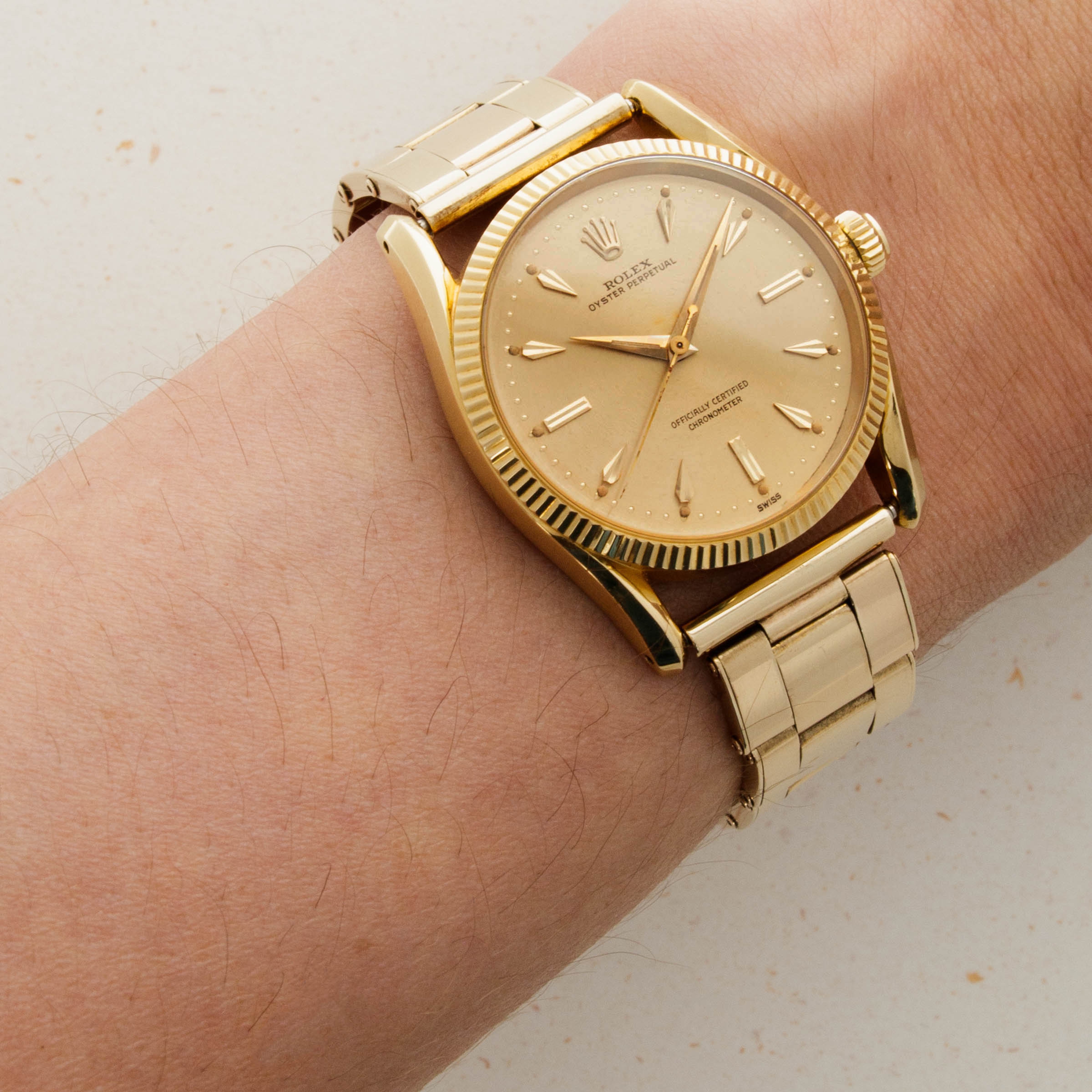 Introduced in 1933 and produced long into the early 1950s, the Rolex Bubbleback saw countless variations of itself produced in various metals, with an exhaustive array of dial configurations and a plethora of different bracelets and straps utilized over its storied past. Perhaps one of the most elusive of these combinations is the Oyster Perpetual “bombé” or “Bombay” in English, meaning “domed.” Offered with a wide variety of dials across its several references, the Oyster Perpetual Bombay is named as such due to its incredibly unique domed lugs. Unlike the majority of Rolex’s designs, the Bombay’s eponymous lugs are accentuated through sharp bevels along their hoods and gentle slopes as they wrap around the watch and sit into its mid-case. Produced from the 1940s until the 1950s, this incredibly rare variety of the Oyster Perpetual Bubbleback is an enthusiast favorite. Examples like ours here remain incredibly hard to find, thanks to the deep appreciation collectors have for these wonderfully unique timepieces. In addition to its already rare status, our example is offered with its original 14kt yellow gold bracelet, which feature straight bar end links, a distinctive element of Rolex’s bracelets at the time.