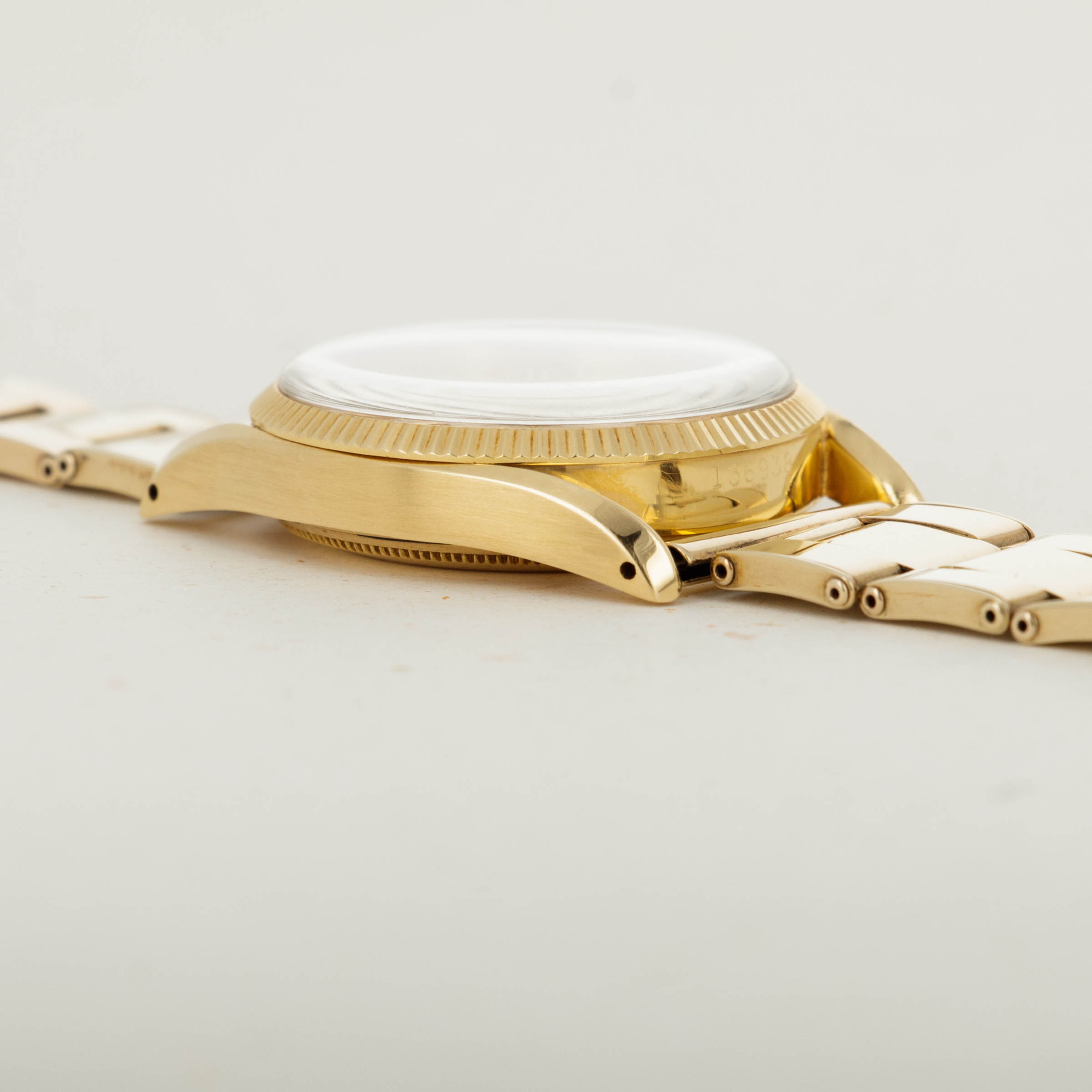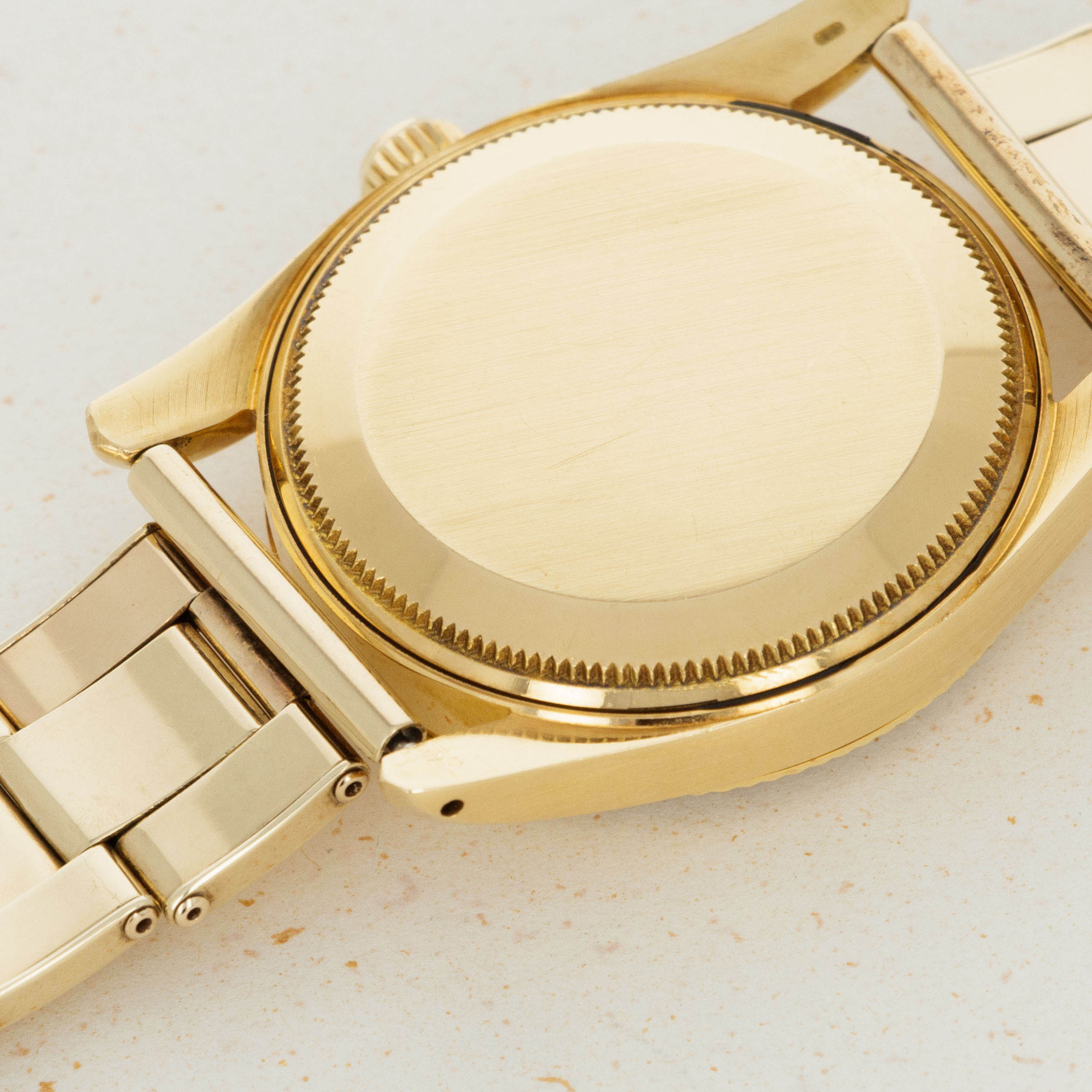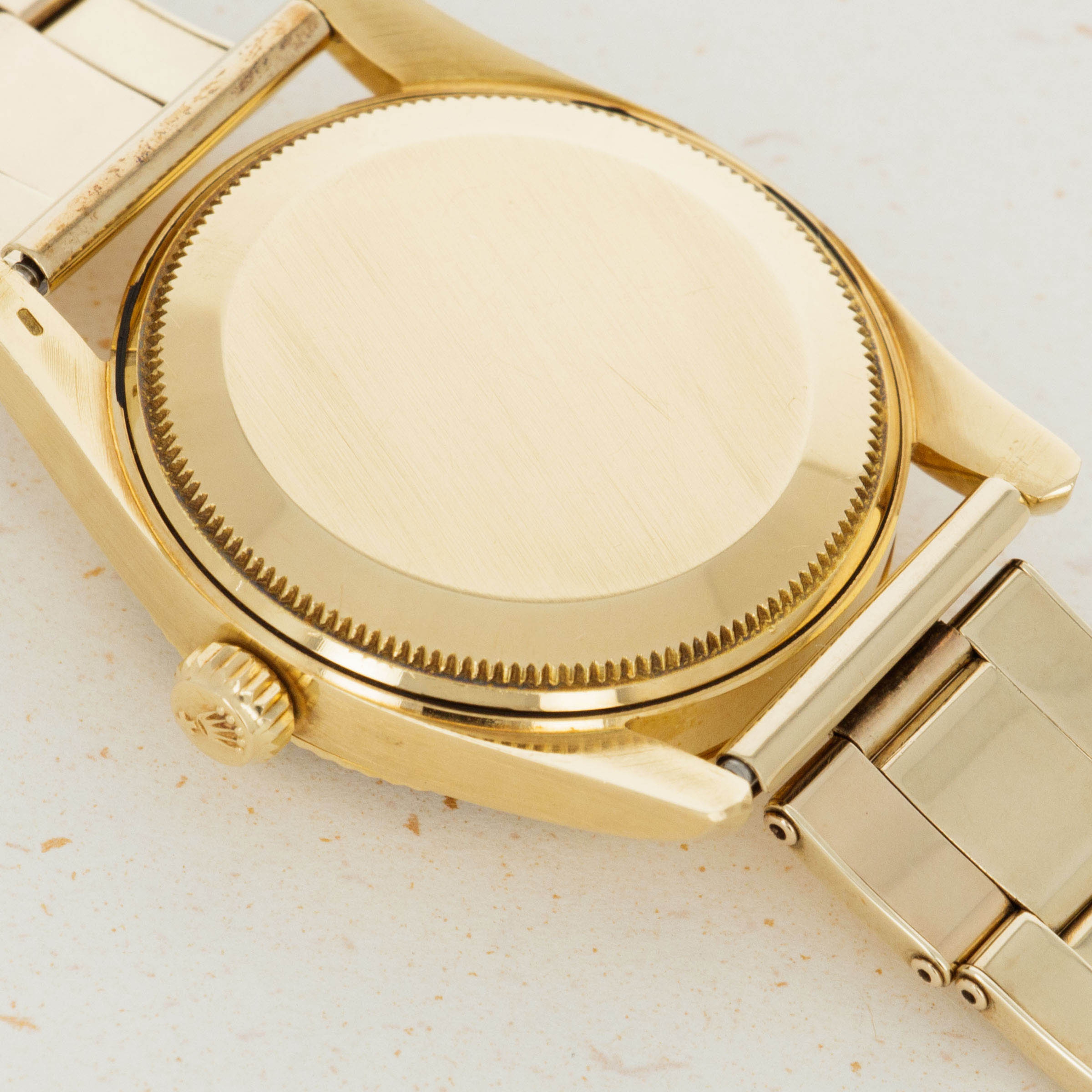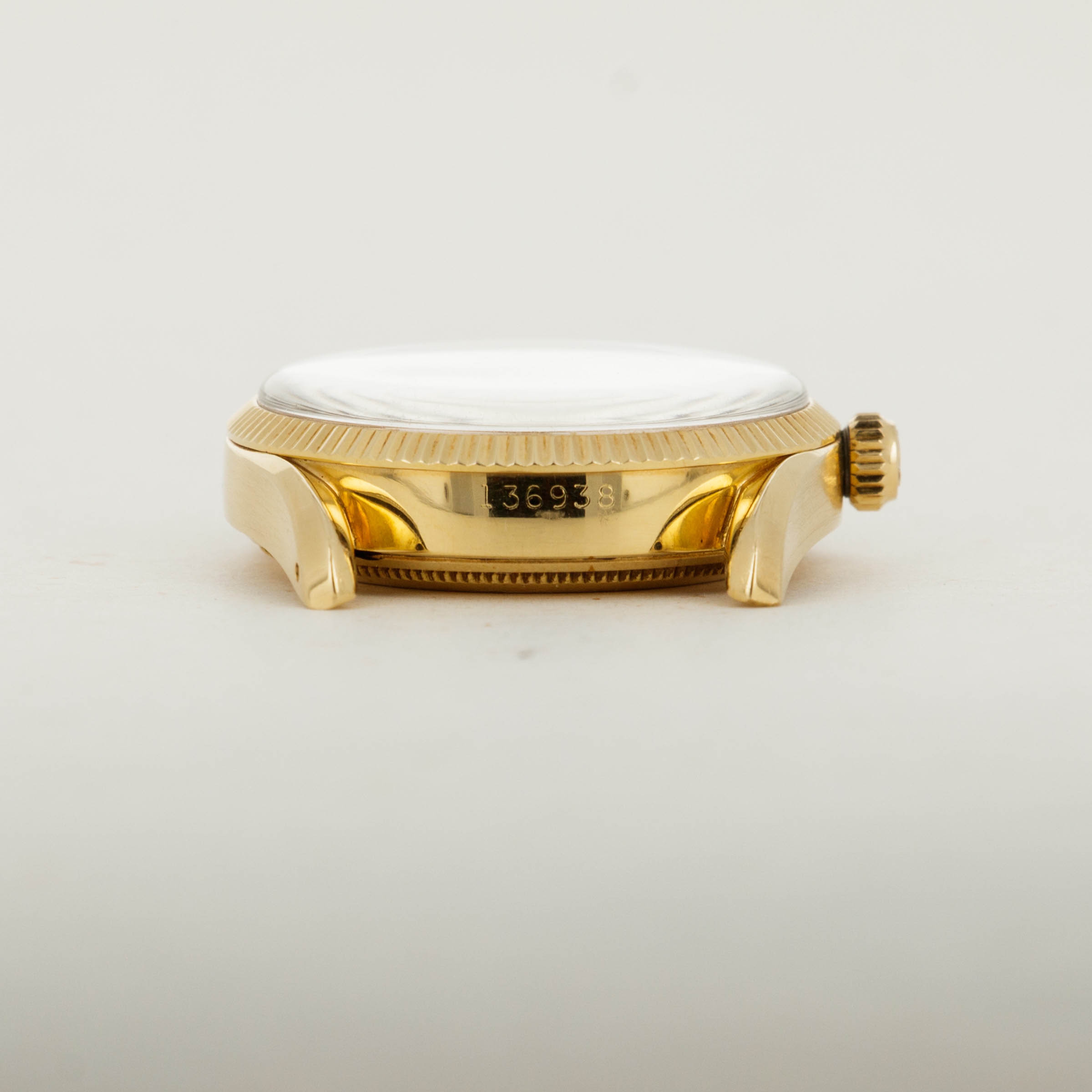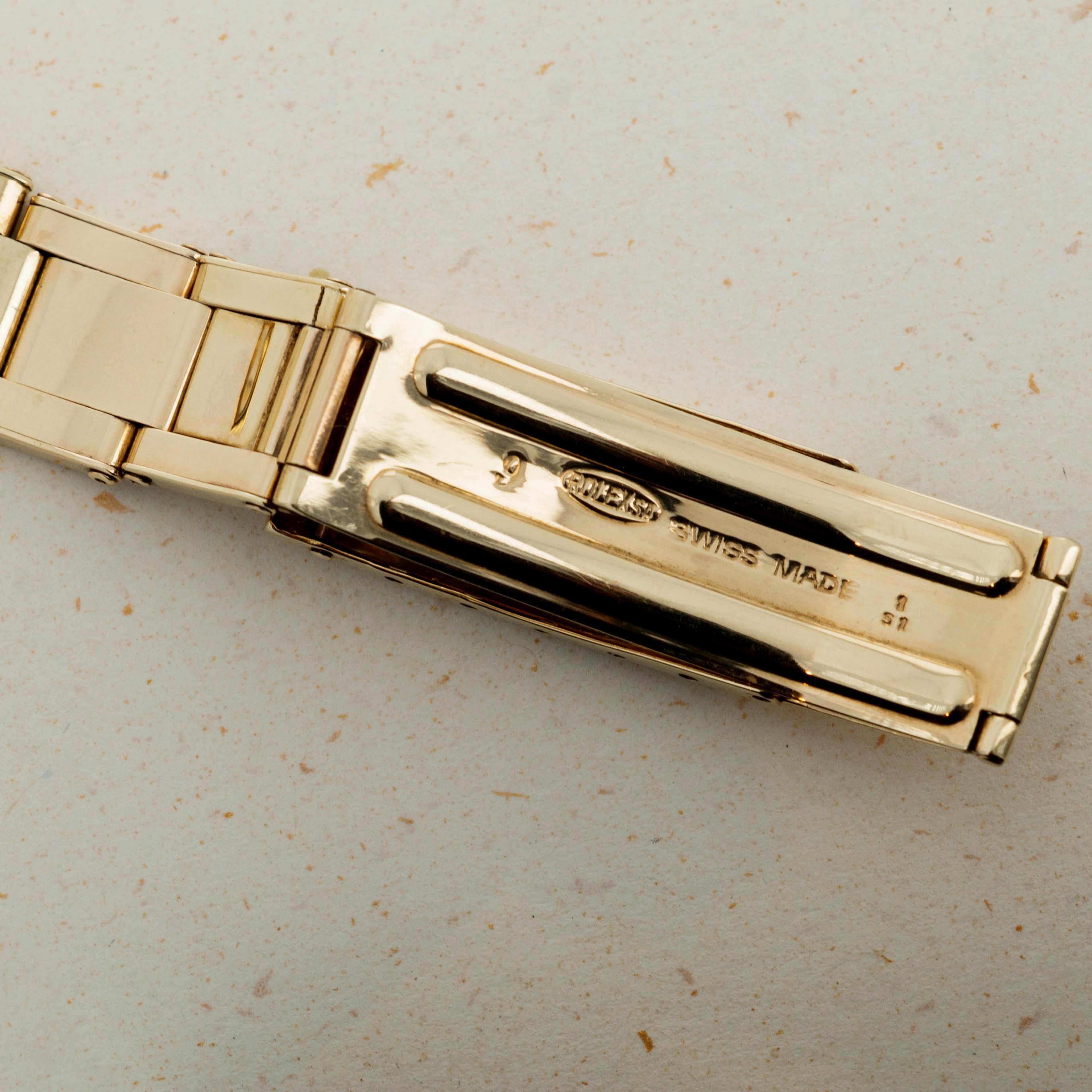 Watch is in near-mint condition. Sharp edges accentuate the curvature of the bombe lugs, with only the lightest of superficial wear visible. Crisp hallmark still visible on back of lug, there is very light scratches along the back of the lugs caused by removal of the bracelet. The gold tone dial is nearly flawless, with cream toned indexes that match the hands. Dial appears flawless with only a small area of discoloration along the edge at 4 o'clock. Watch comes fitted on a straight end piece oyster band with 12 links that exhibits very minor (if any) stretch.