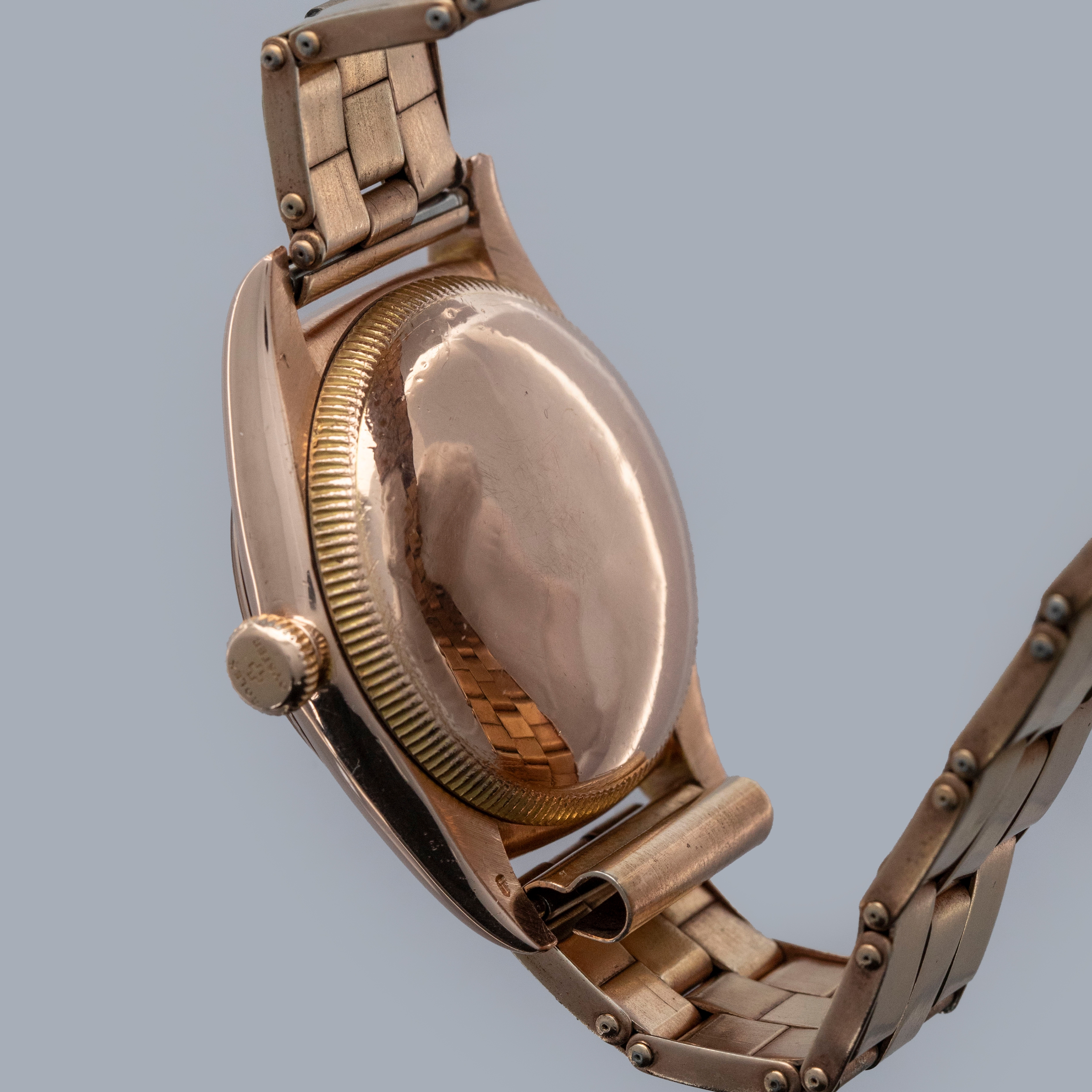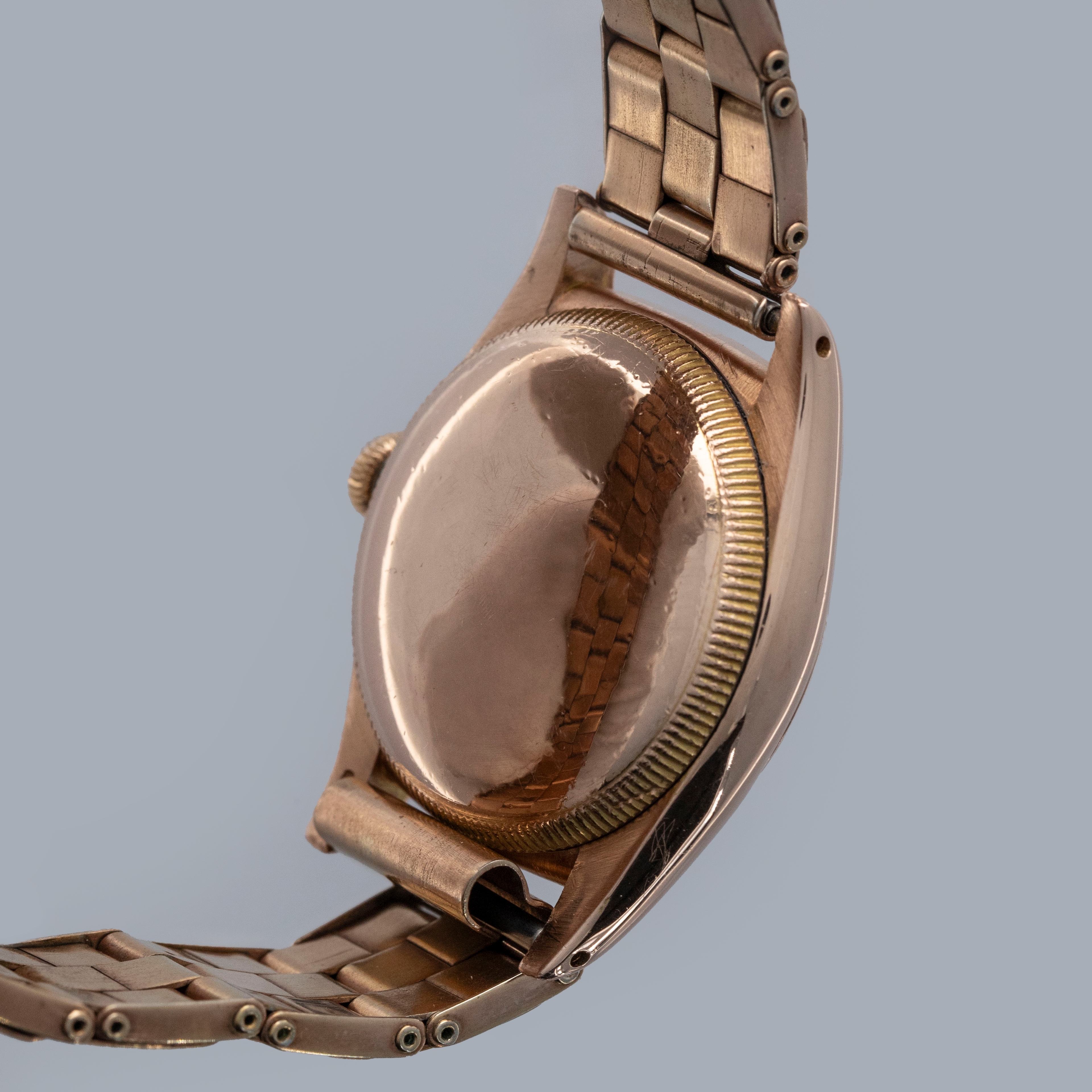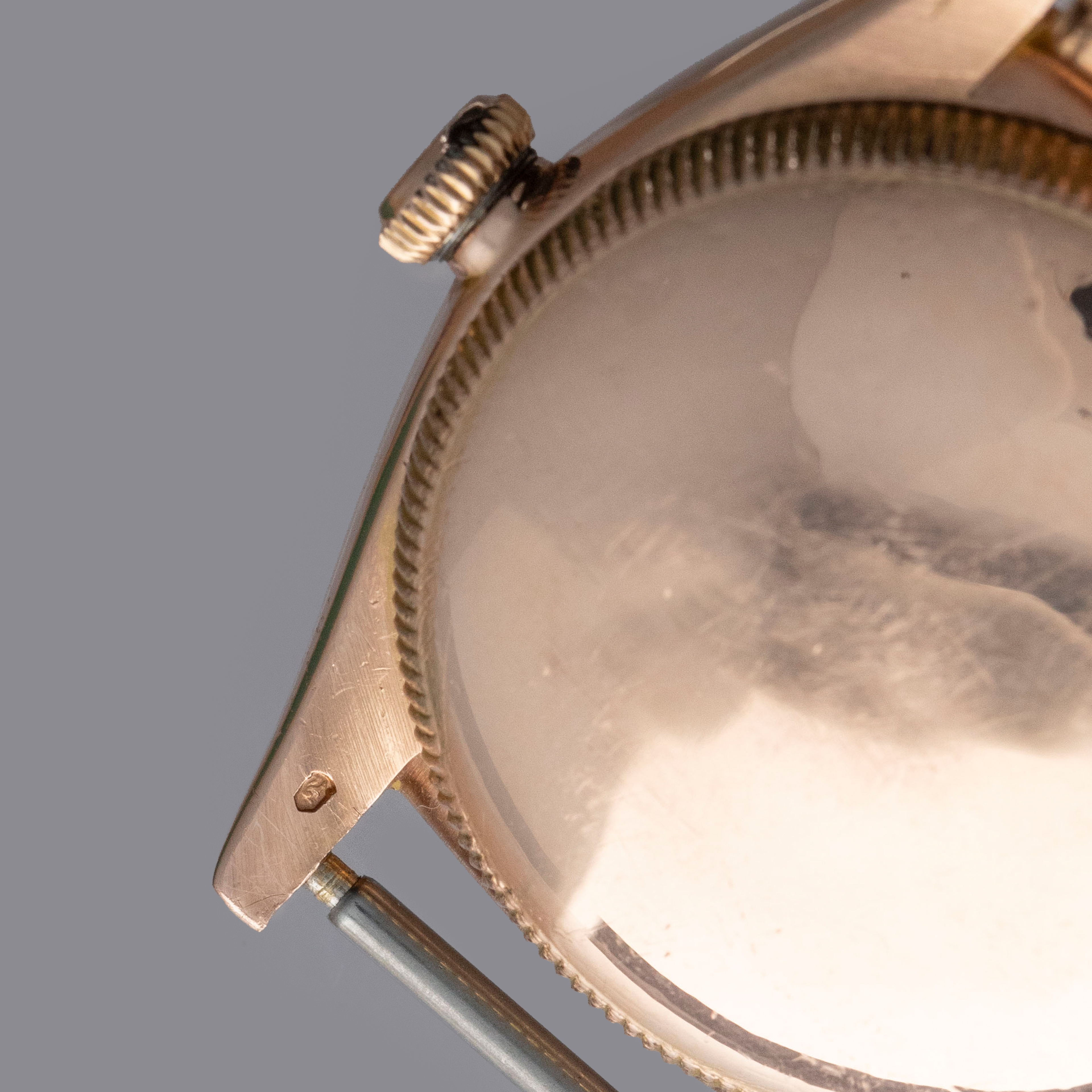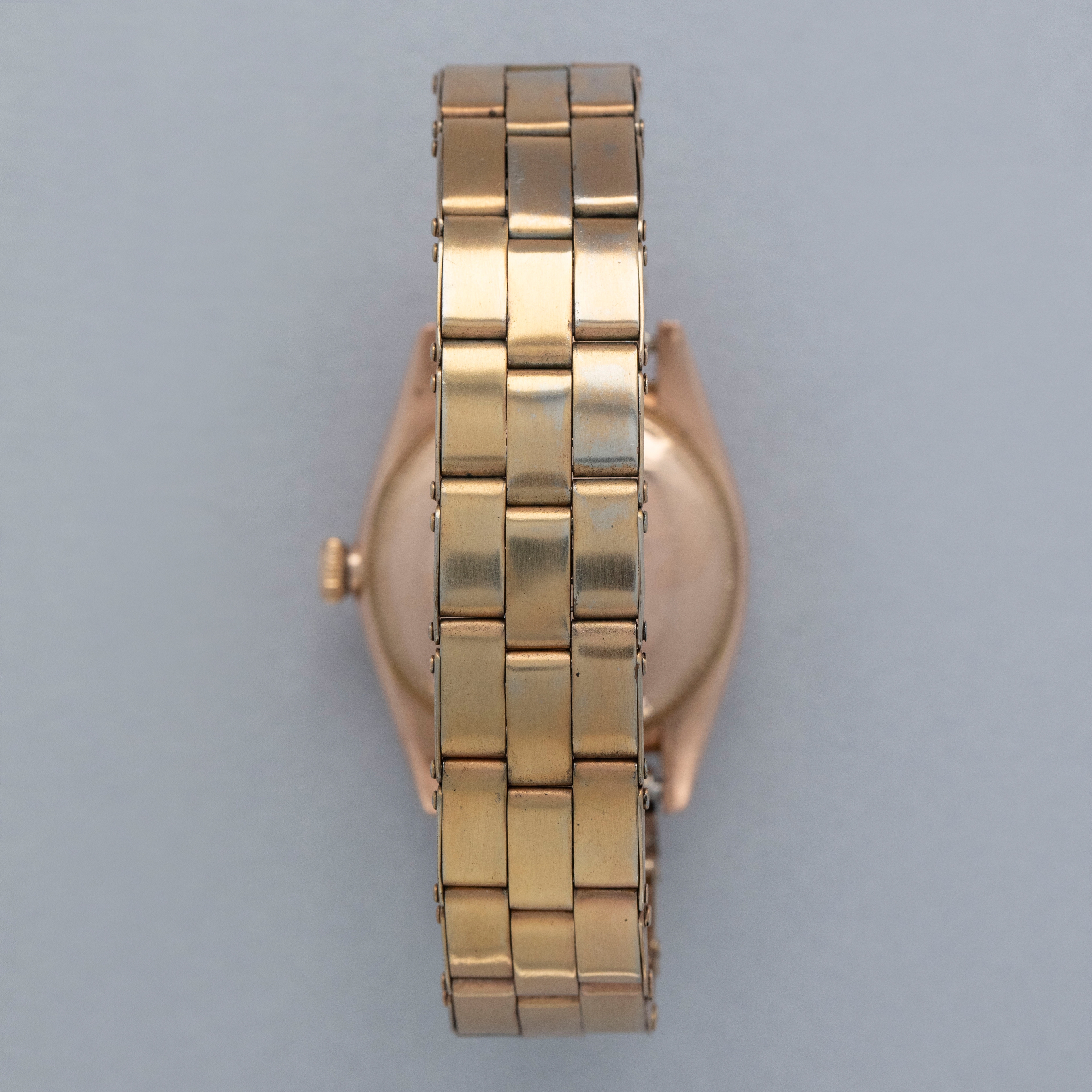Watch is in overall excellent condition. The rose gold case shows light surface marks and nicks consistent with age, with a well-defined hallmark visible on the back of the upper right lug. The case back displays light surface scratches and some wear to the case back teeth. The watch retains its rare early ROLEX OYSTER crown. The refinished dial remains excellent, and the hands appear to have been relumed at some point. It is fitted with a generic gold-plated rivet-style bracelet showing some wear to the finish. The watch was serviced in January 2026.