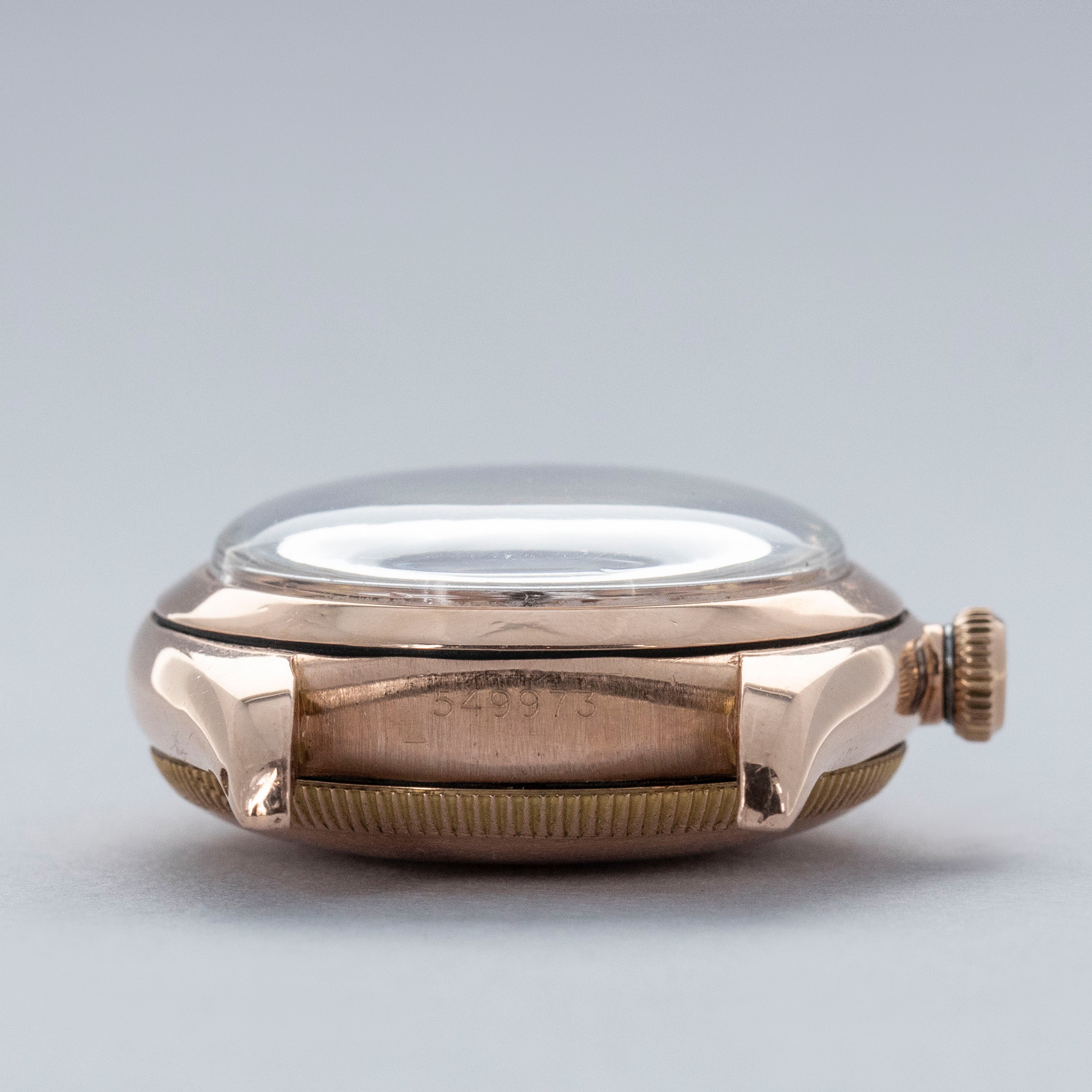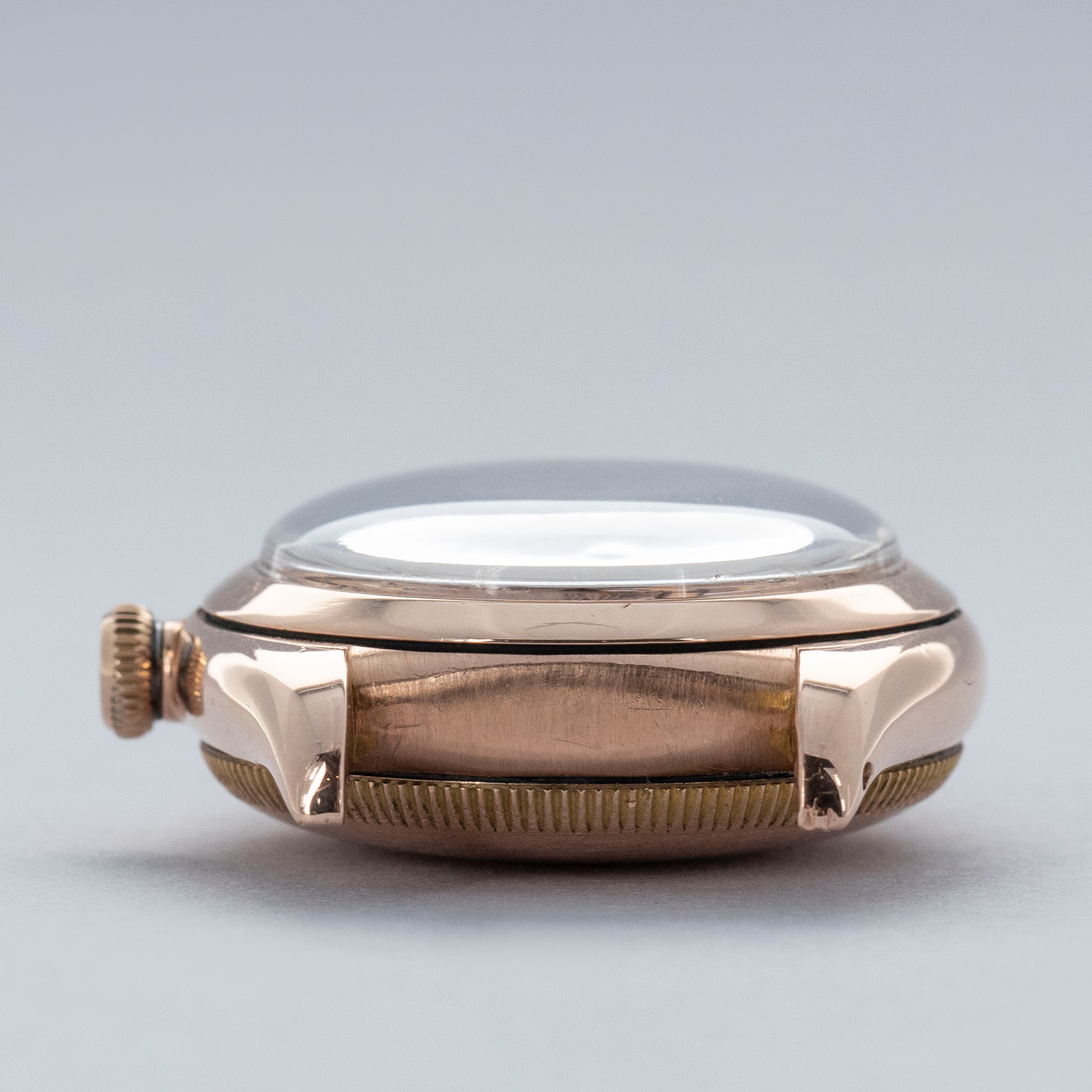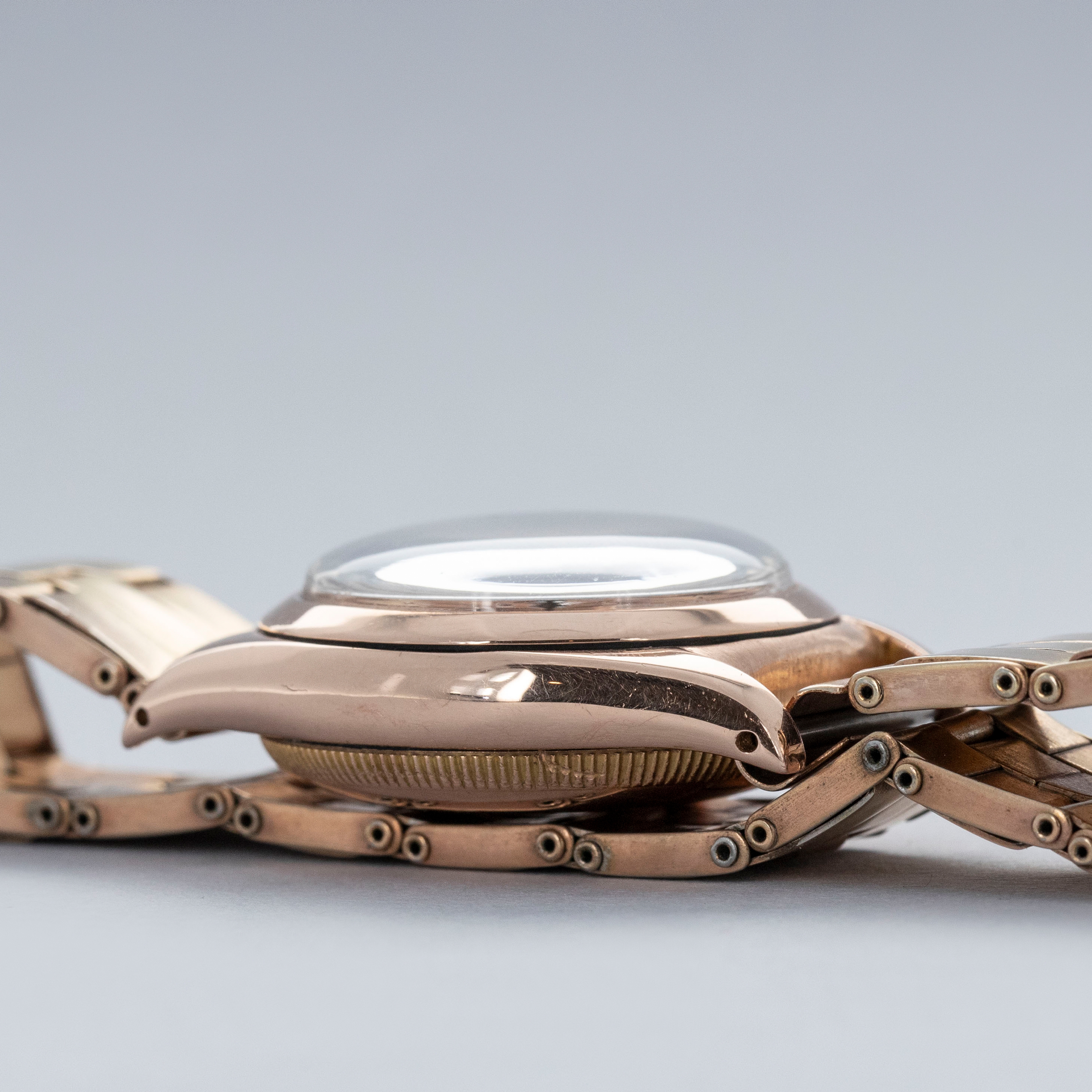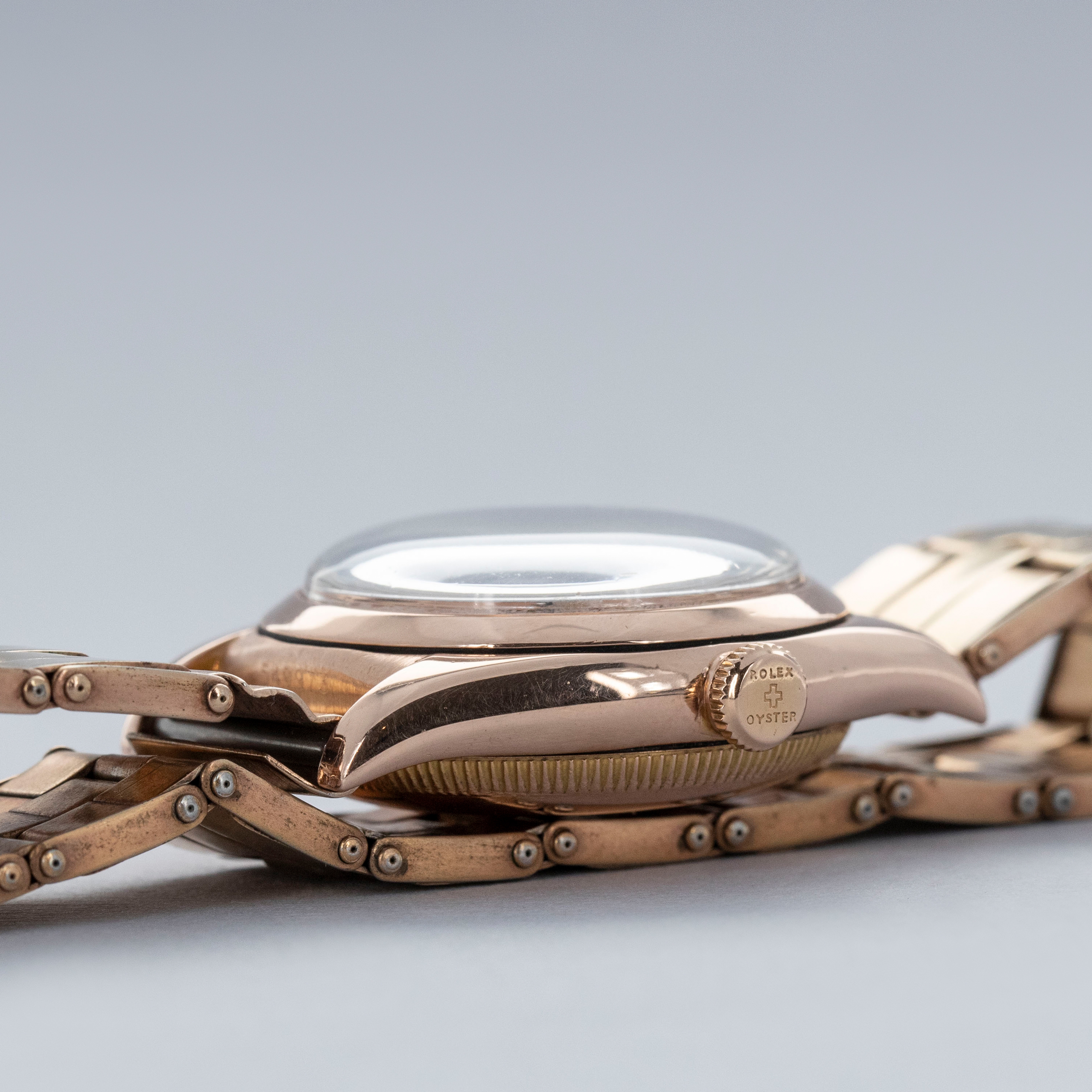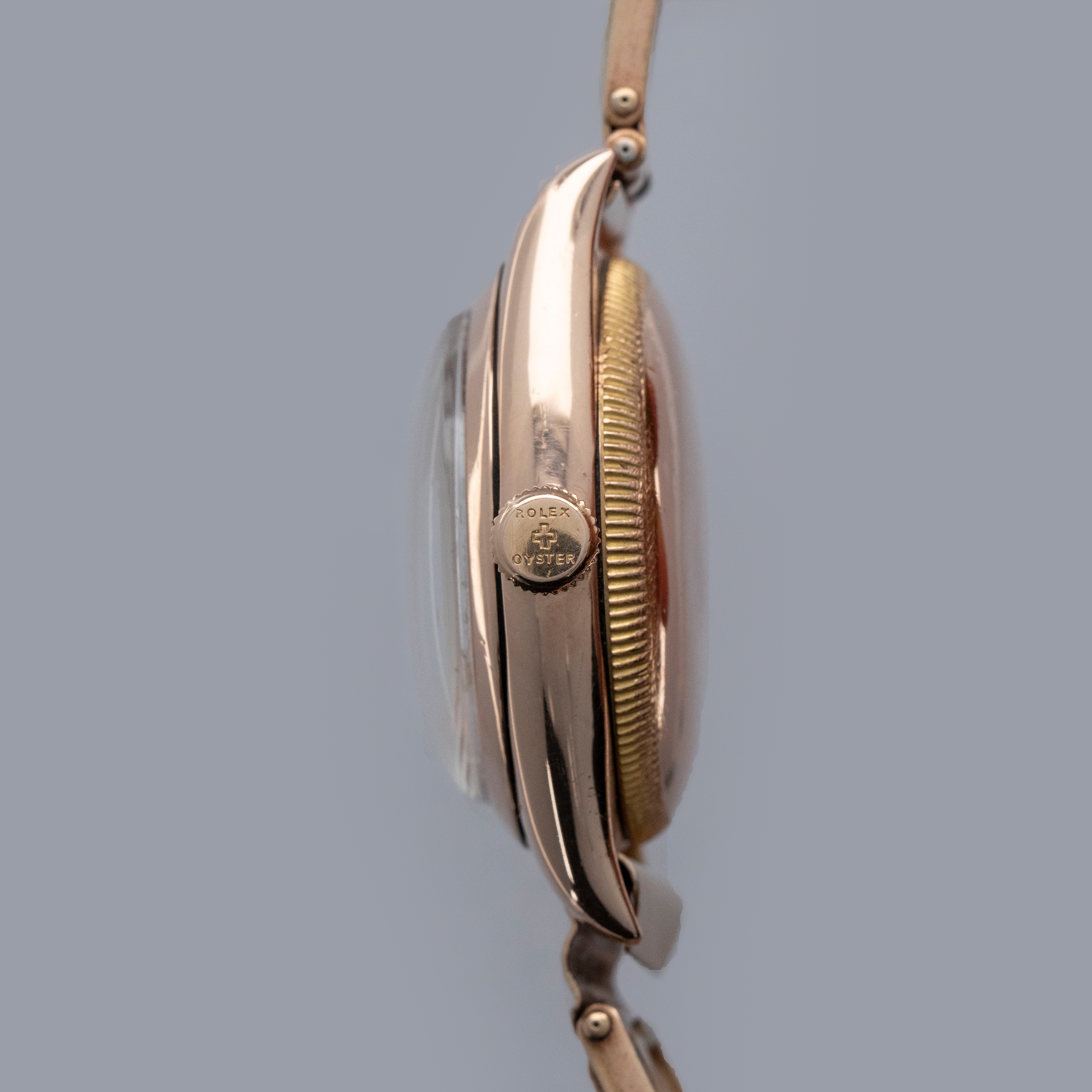 Watch is in overall excellent condition. The rose gold case shows light surface marks and nicks consistent with age, with a well-defined hallmark visible on the back of the upper right lug. The case back displays light surface scratches and some wear to the case back teeth. The watch retains its rare early ROLEX OYSTER crown. The refinished dial remains excellent, and the hands appear to have been relumed at some point. It is fitted with a generic gold-plated rivet-style bracelet showing some wear to the finish. The watch was serviced in January 2026.