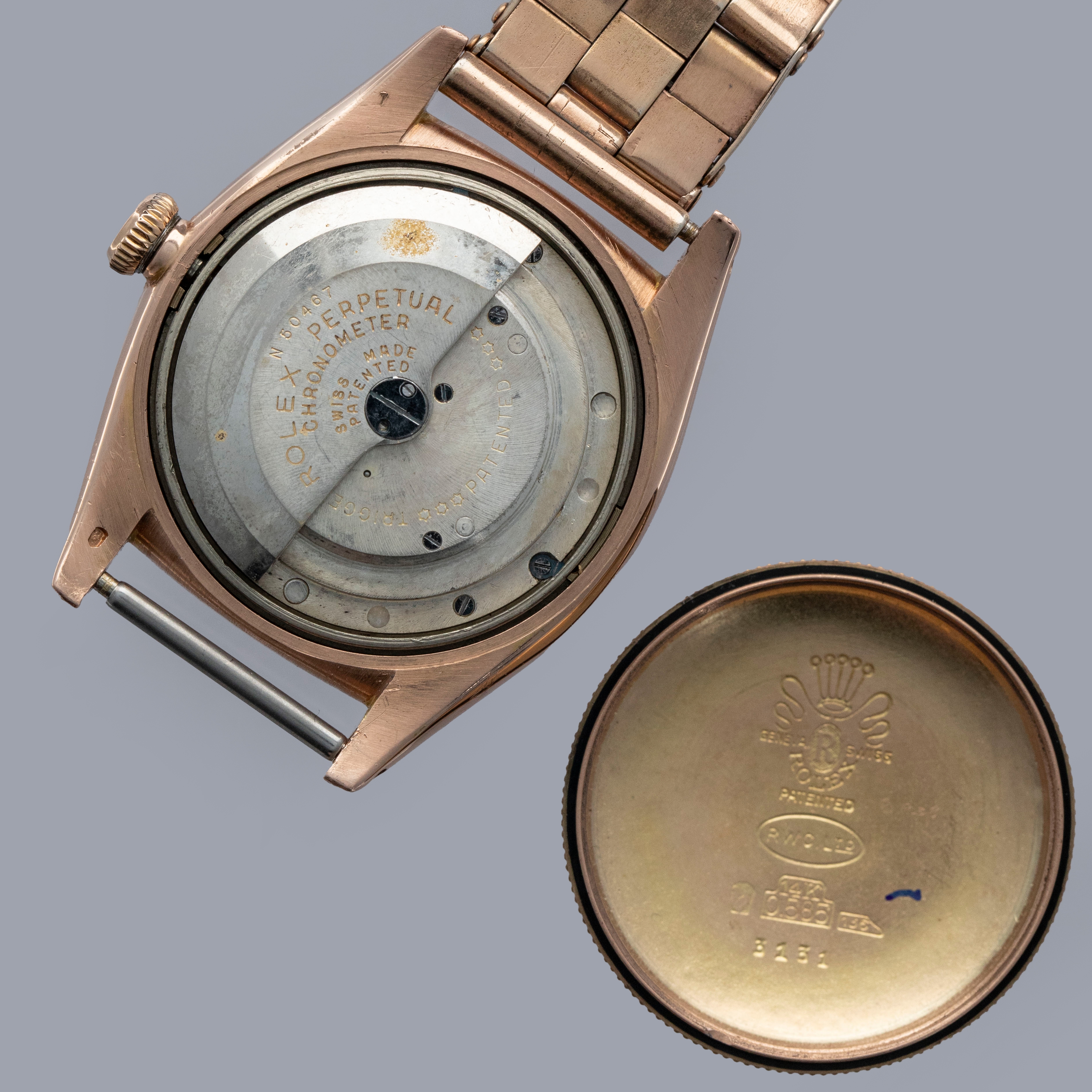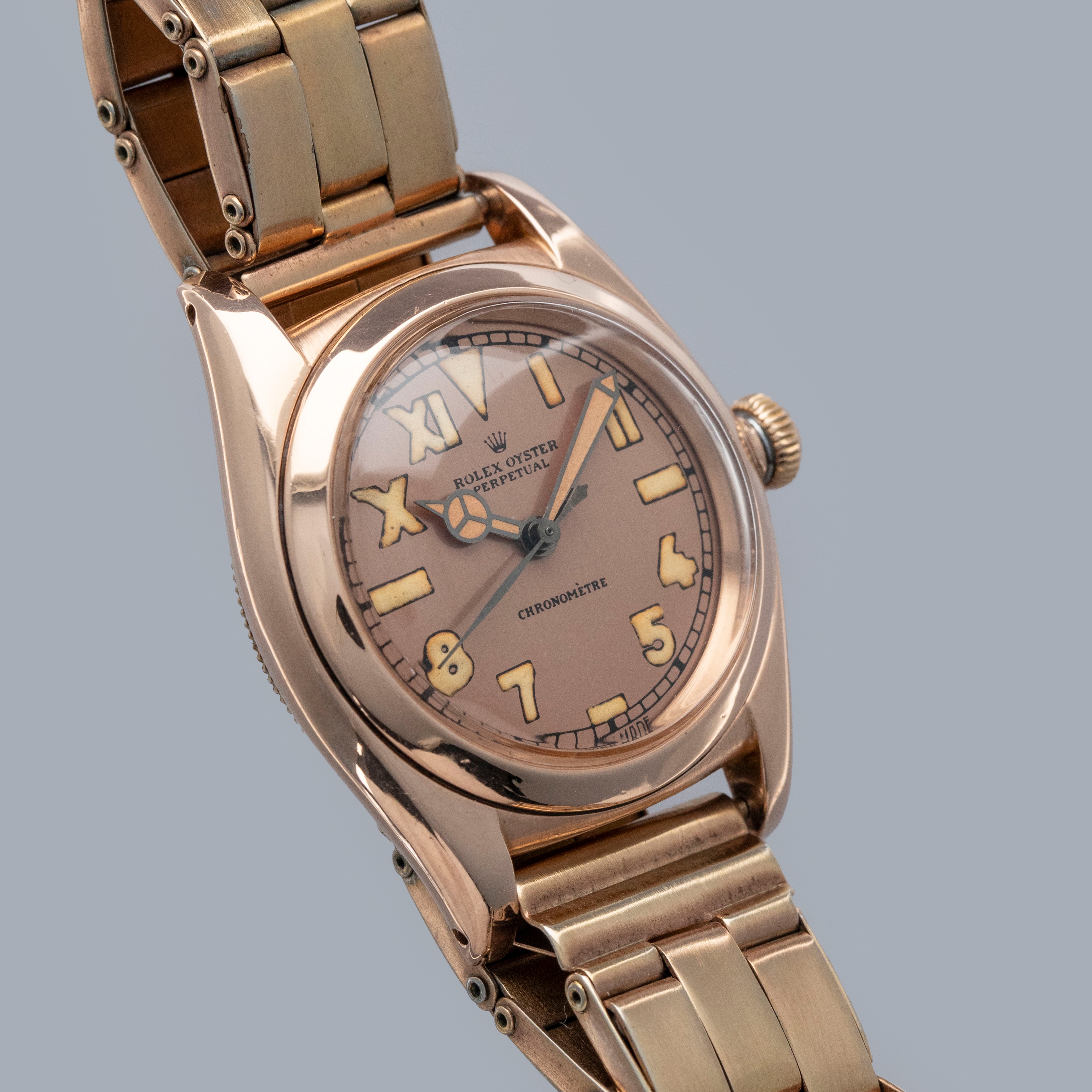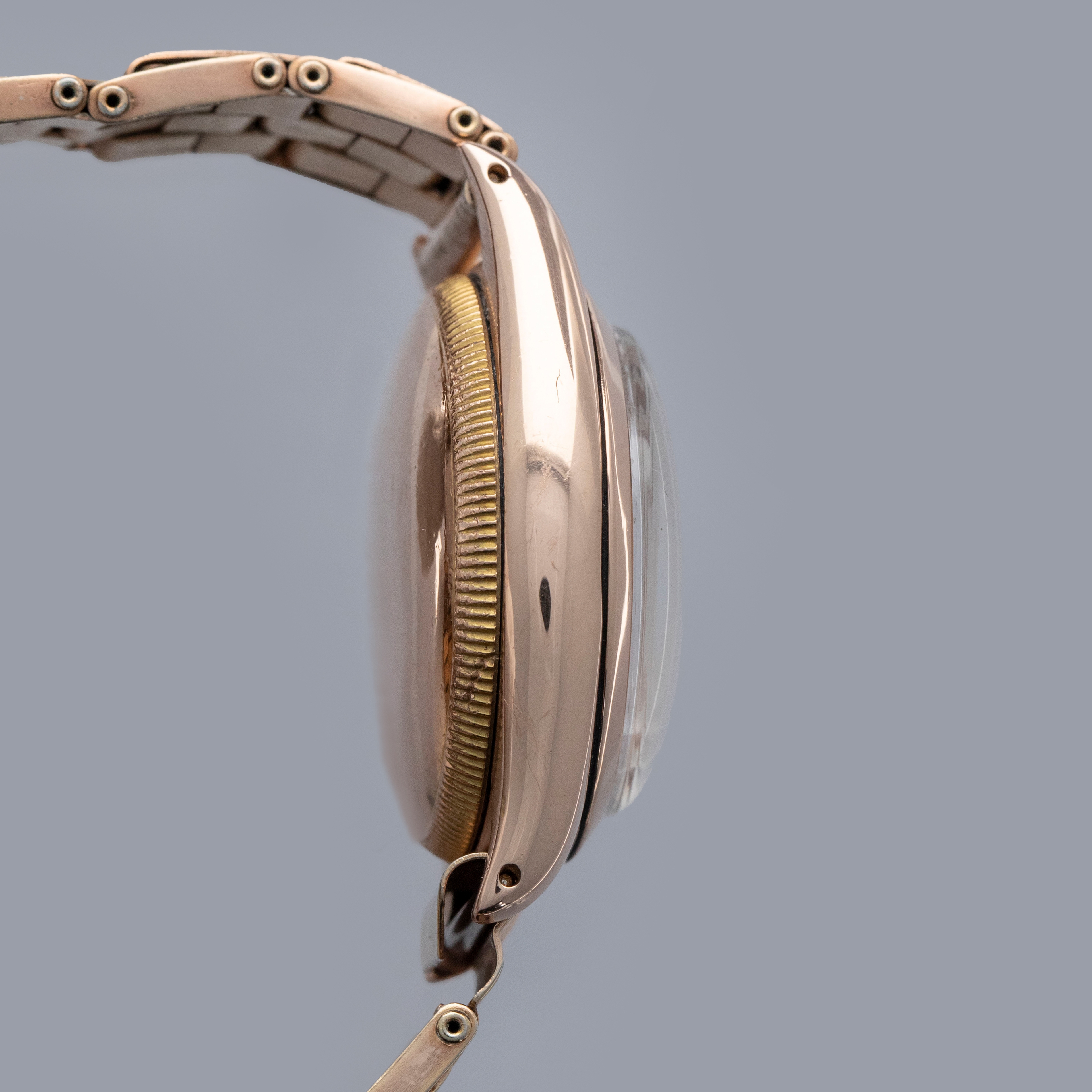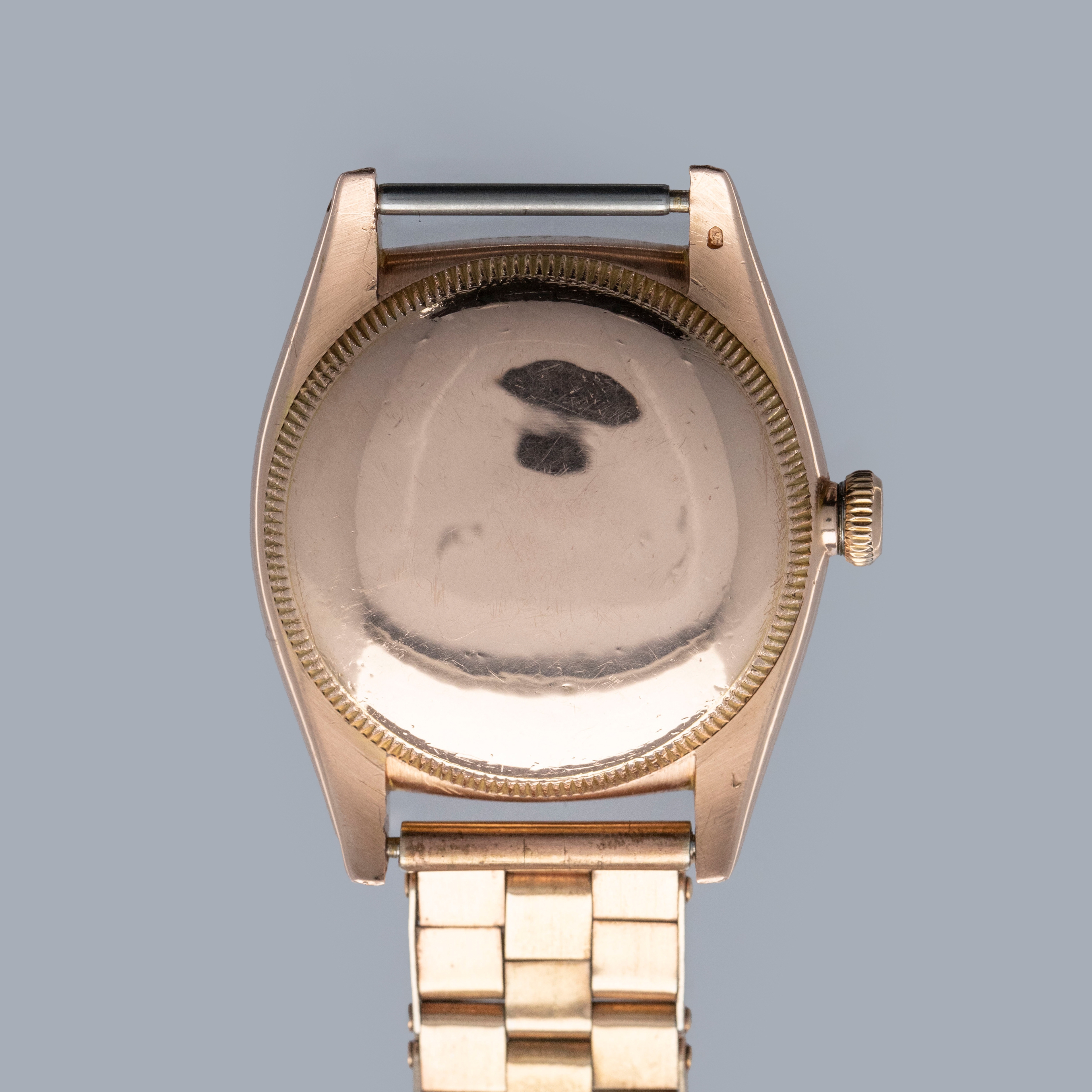 Watch is in overall excellent condition. The rose gold case shows light surface marks and nicks consistent with age, with a well-defined hallmark visible on the back of the upper right lug. The case back displays light surface scratches and some wear to the case back teeth. The watch retains its rare early ROLEX OYSTER crown. The refinished dial remains excellent, and the hands appear to have been relumed at some point. It is fitted with a generic gold-plated rivet-style bracelet showing some wear to the finish. The watch was serviced in January 2026.