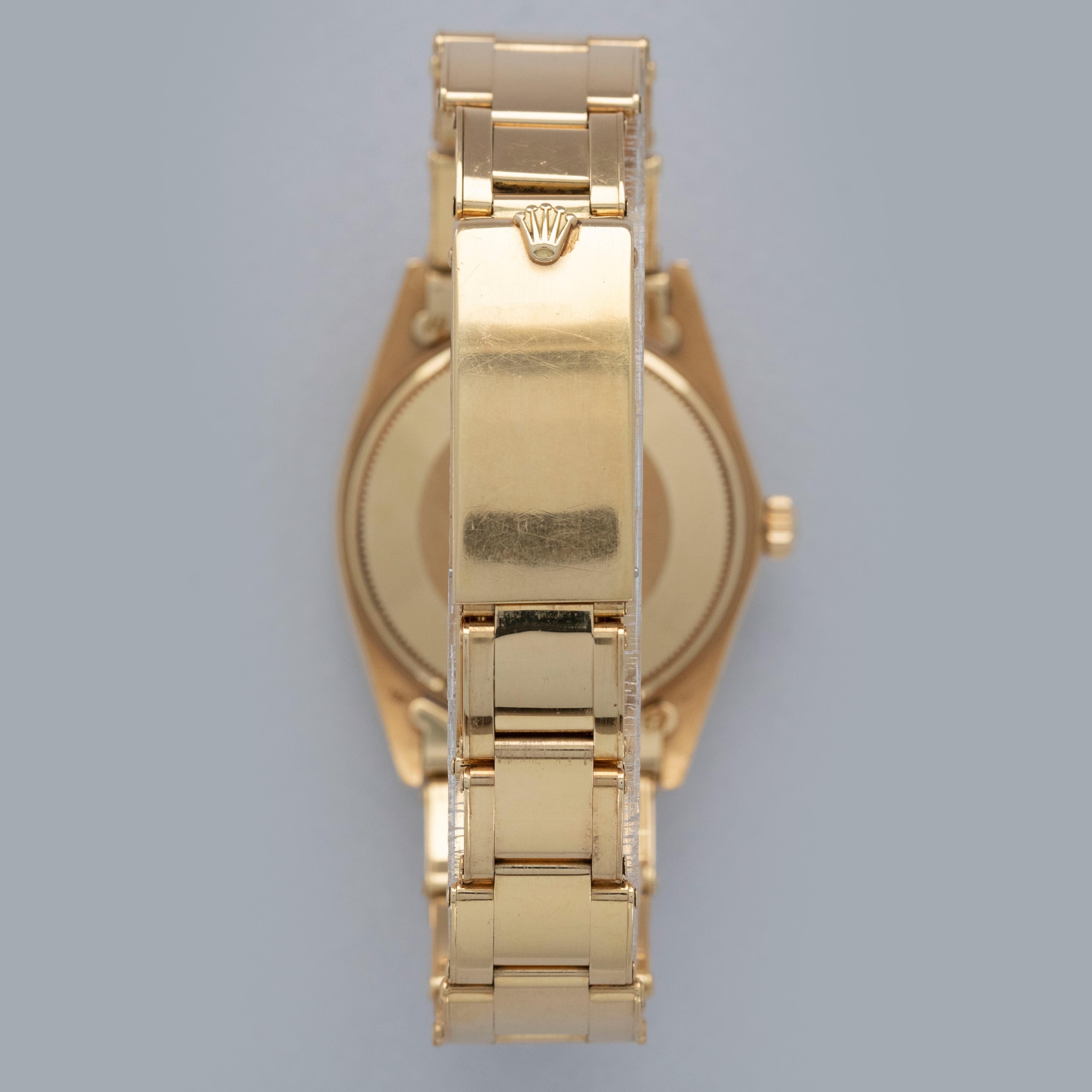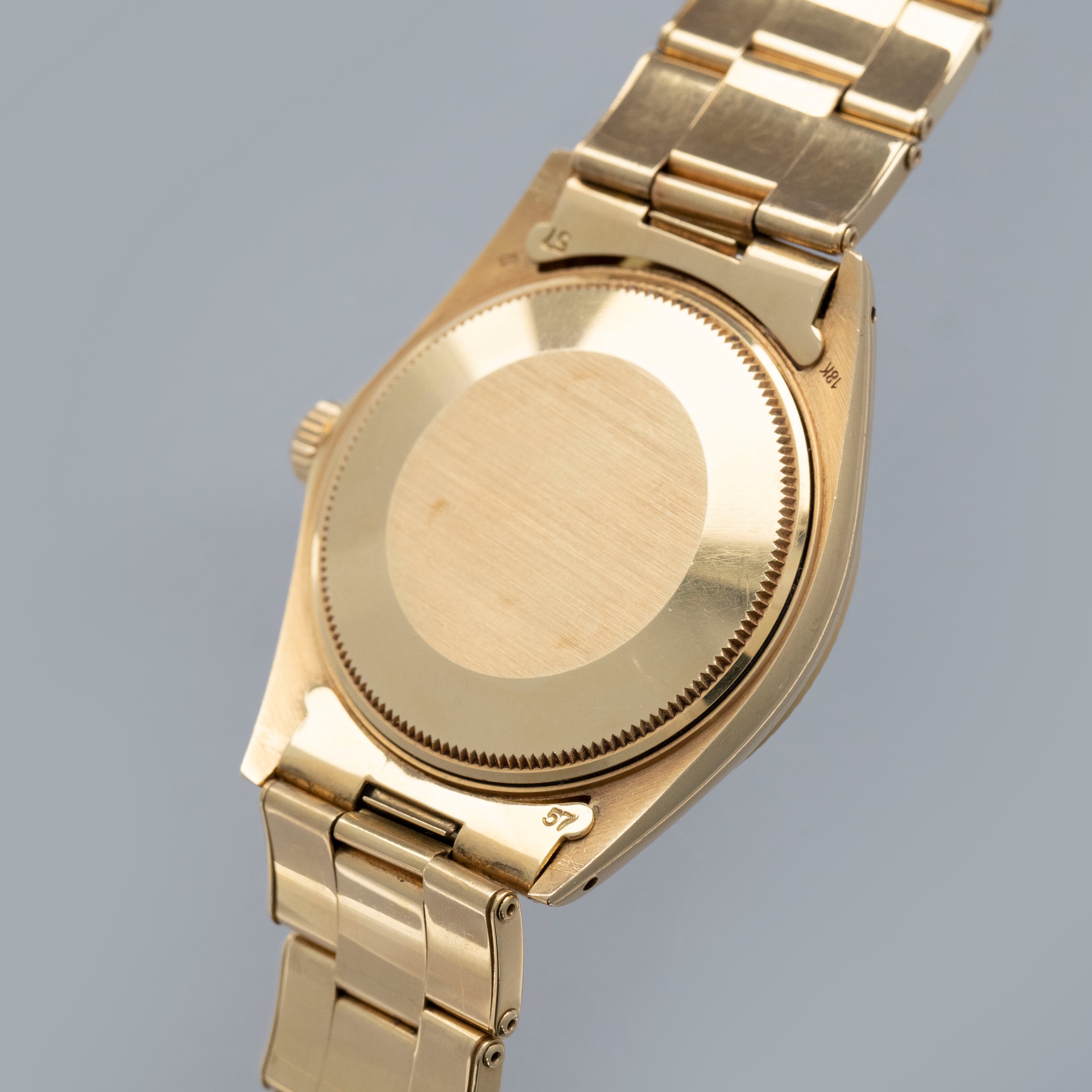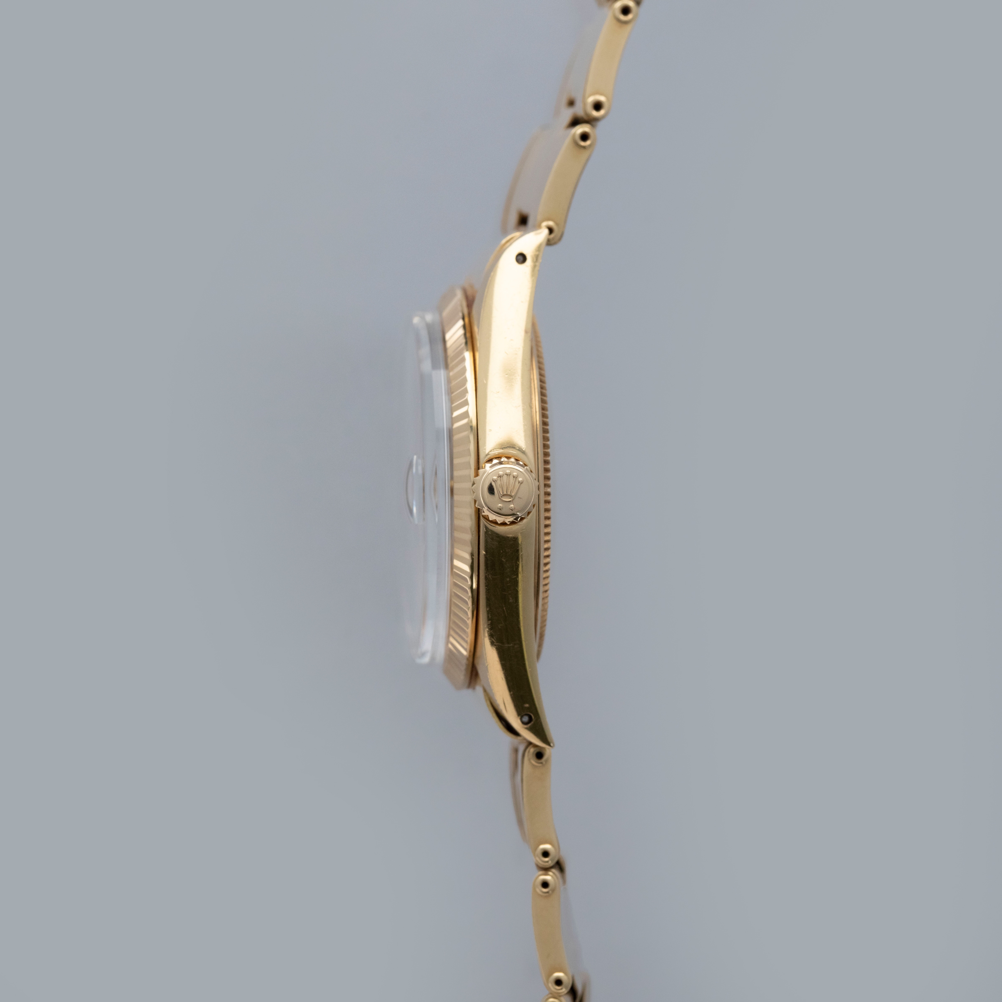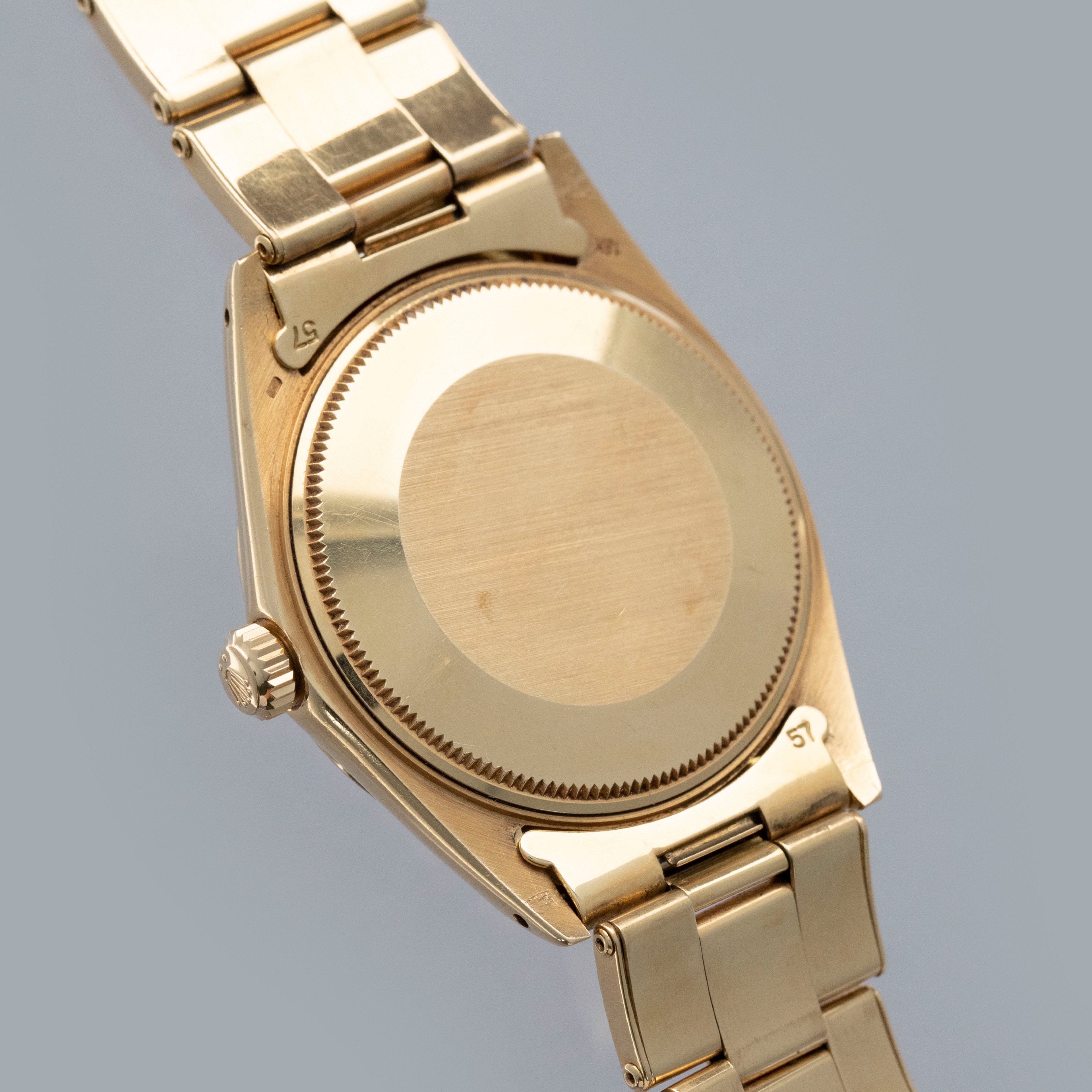 The watch is in overall excellent condition. The yellow gold case shows light surface scratches consistent with age, while the case back is very clean and the hallmarks on the rear of the lugs remain well defined. The fluted bezel is also well defined, with a couple of noticeable nicks at 12 o’clock. The dial is near mint, with clean and intact lume plots, complemented by corrosion-free yellow gold hands. The yellow gold rivet link Oyster bracelet has light surface scratches and moderate play between the links. The bracelet currently fits a 7 1/2” wrist, and is fitted with 12 links.