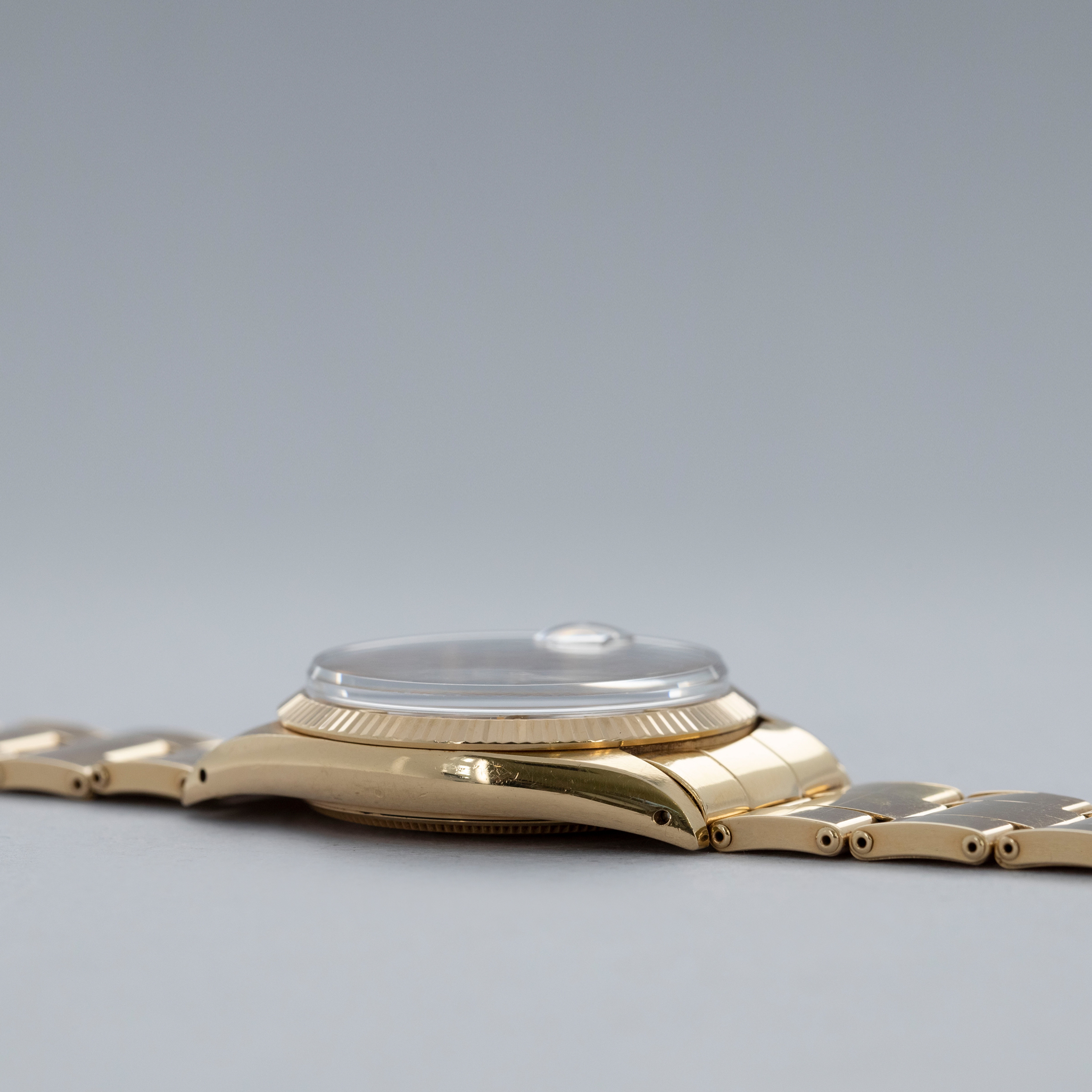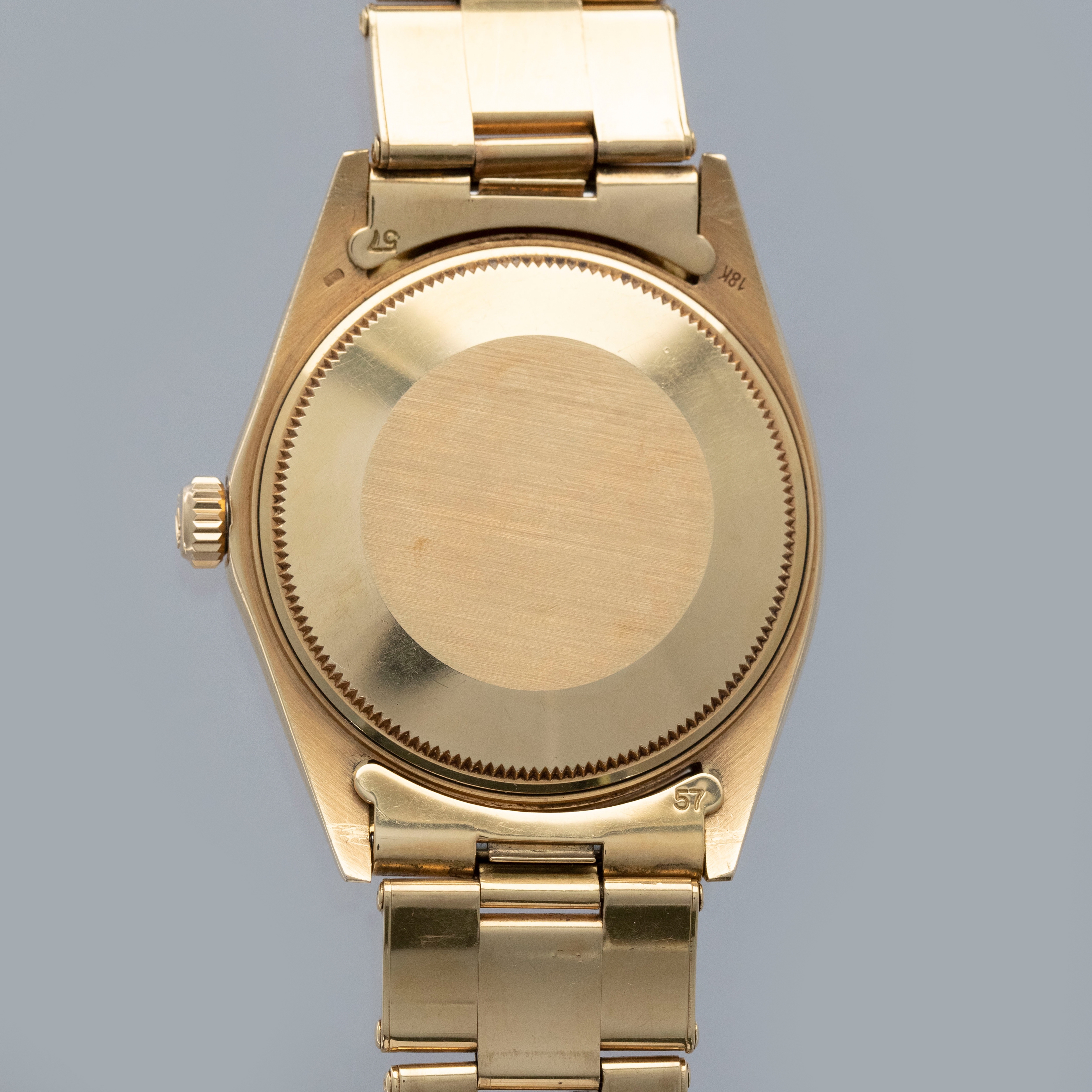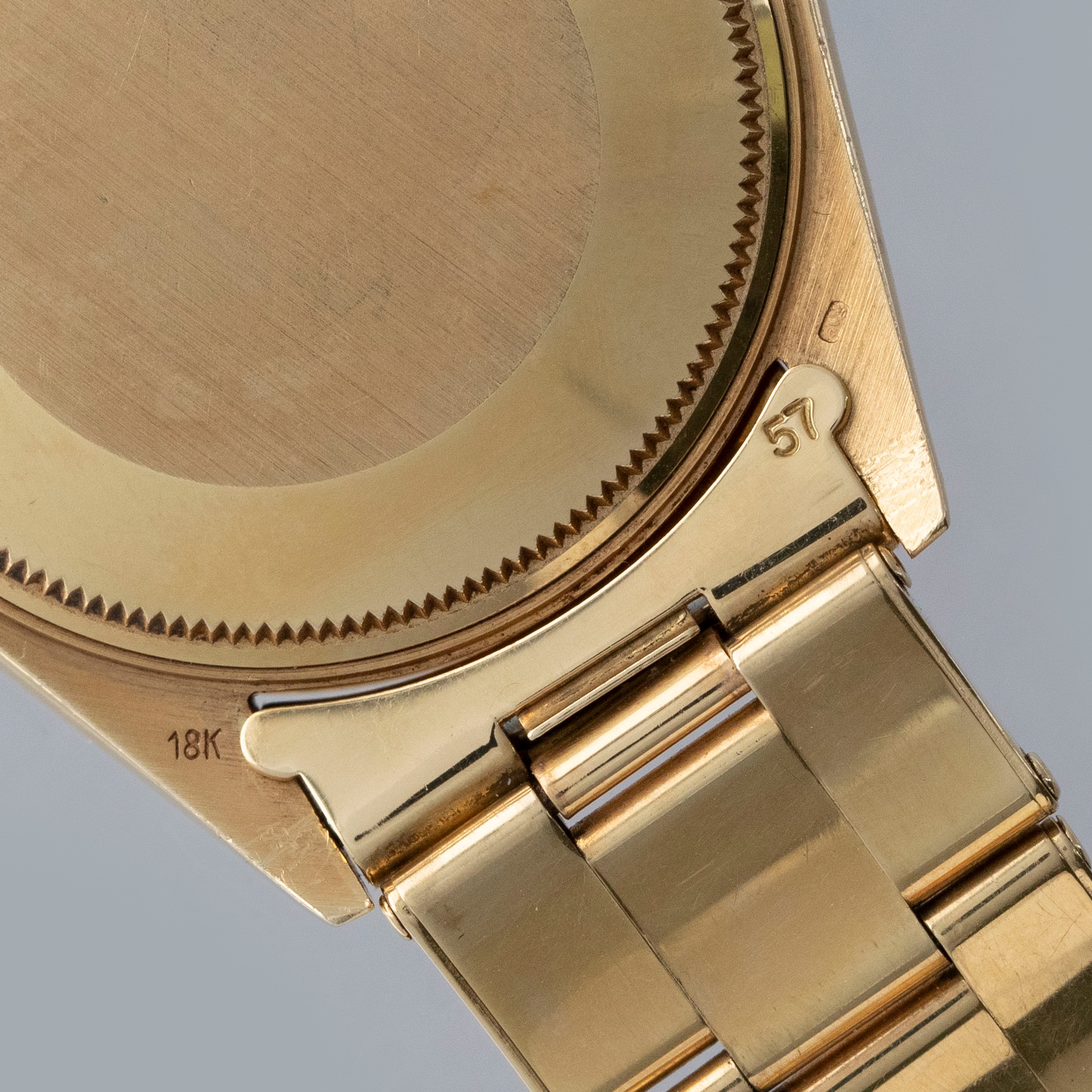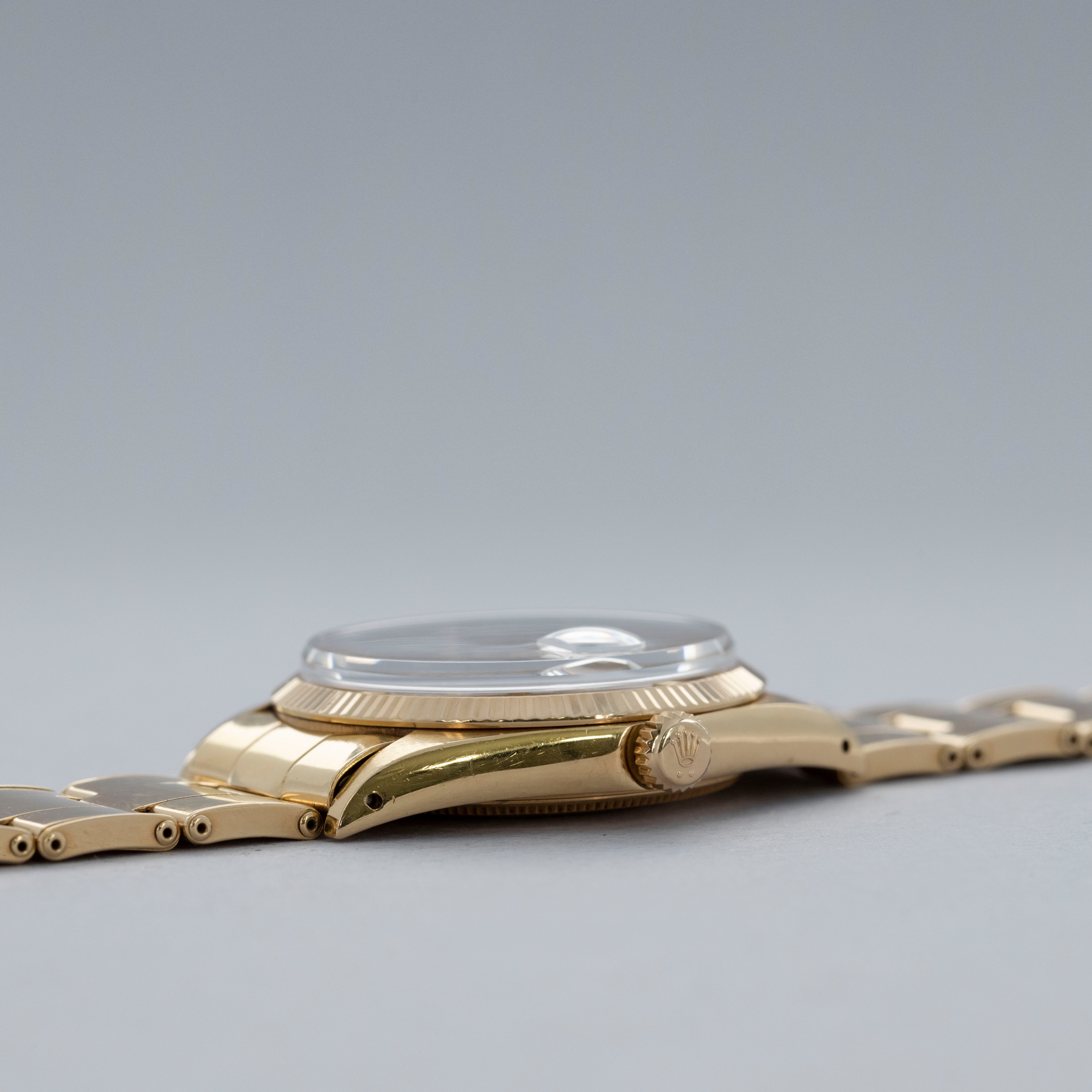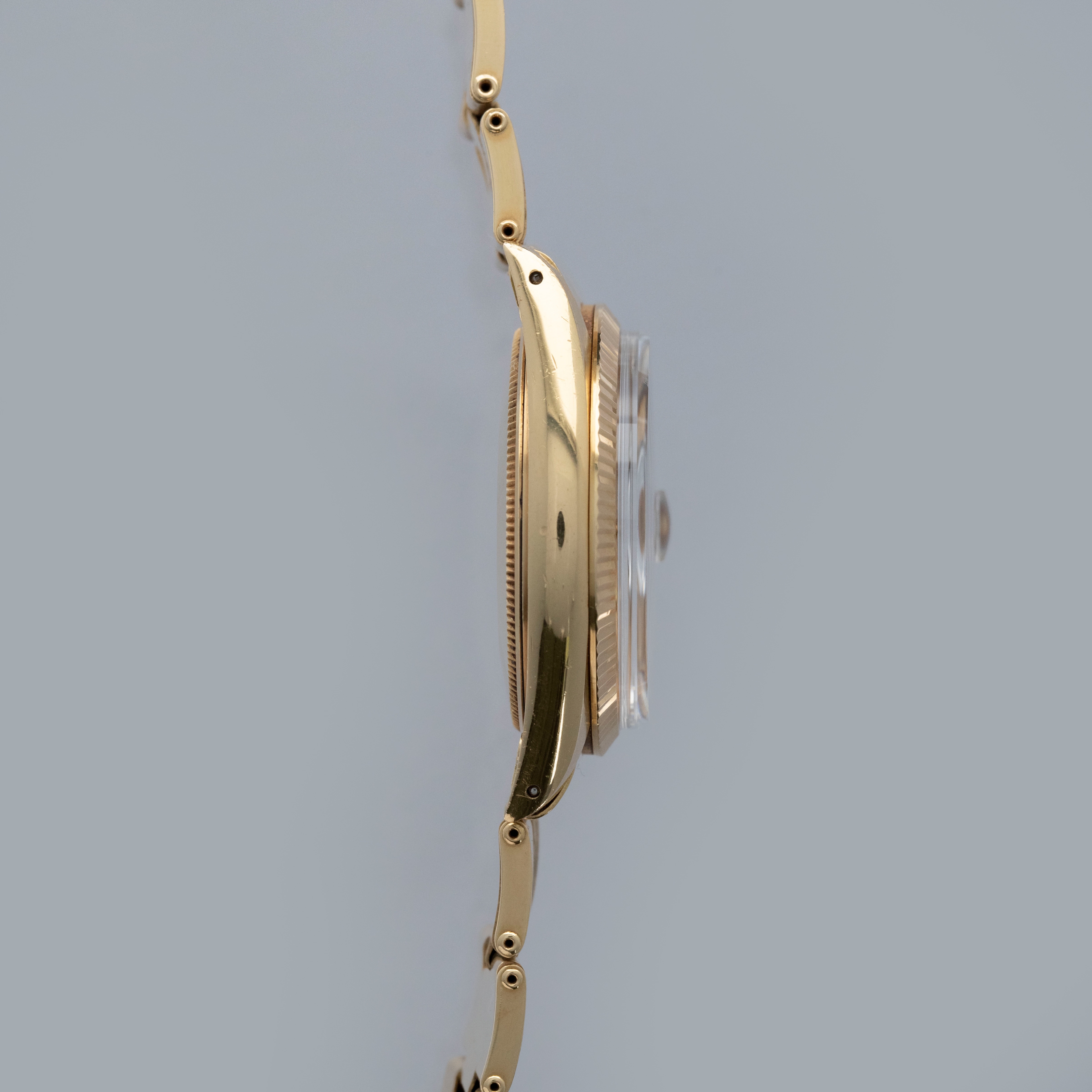The watch is in overall excellent condition. The yellow gold case shows light surface scratches consistent with age, while the case back is very clean and the hallmarks on the rear of the lugs remain well defined. The fluted bezel is also well defined, with a couple of noticeable nicks at 12 o’clock. The dial is near mint, with clean and intact lume plots, complemented by corrosion-free yellow gold hands. The yellow gold rivet link Oyster bracelet has light surface scratches and moderate play between the links. The bracelet currently fits a 7 1/2” wrist, and is fitted with 12 links.