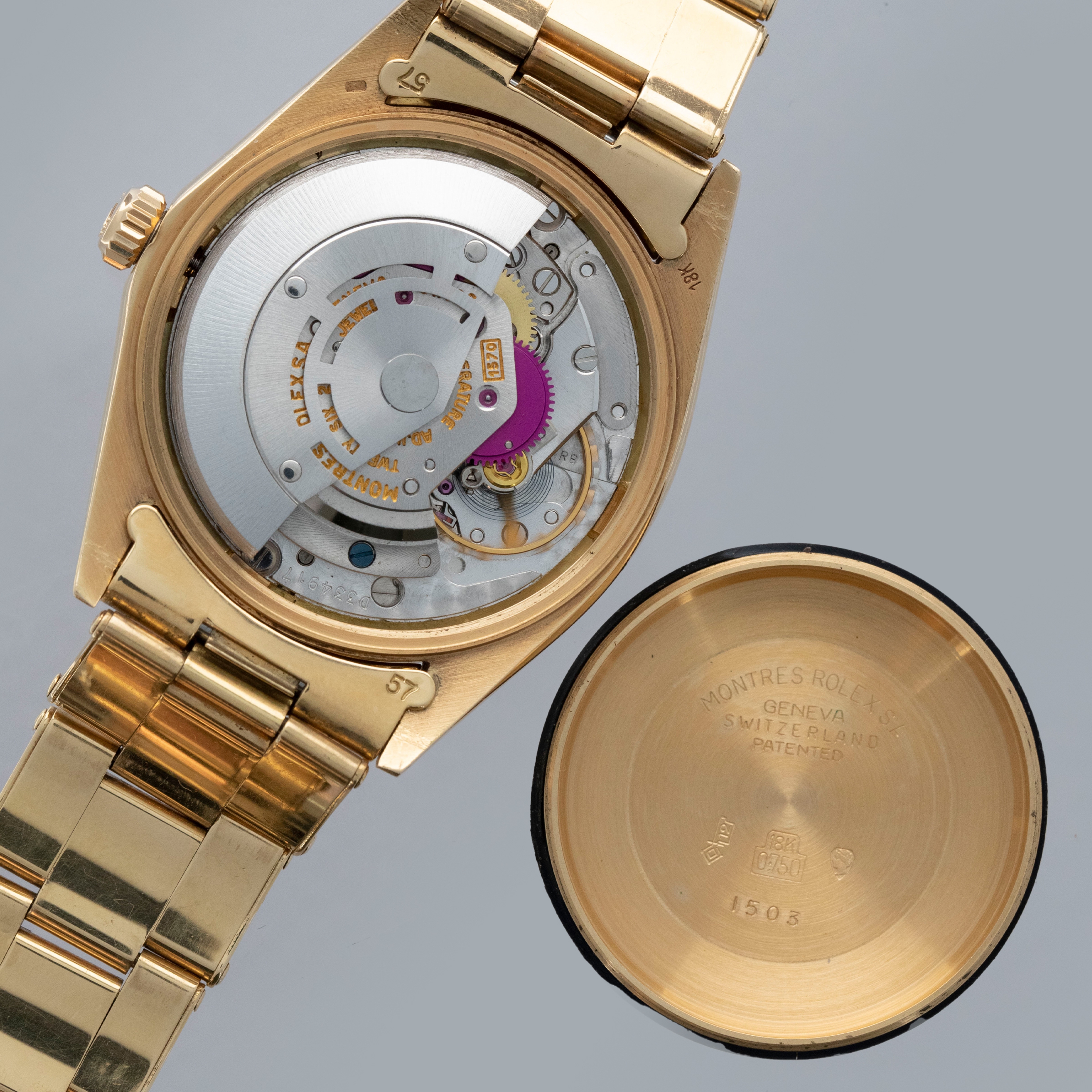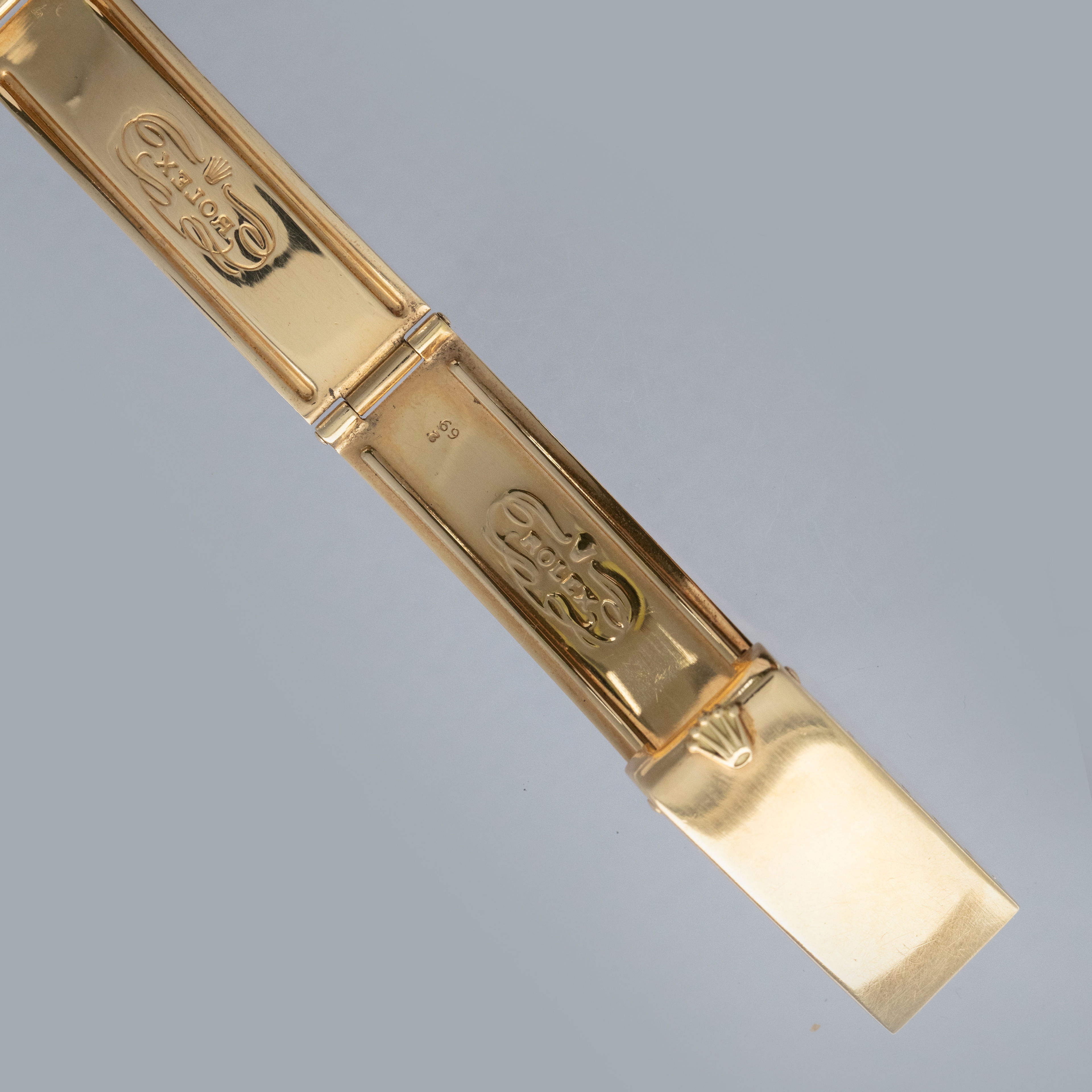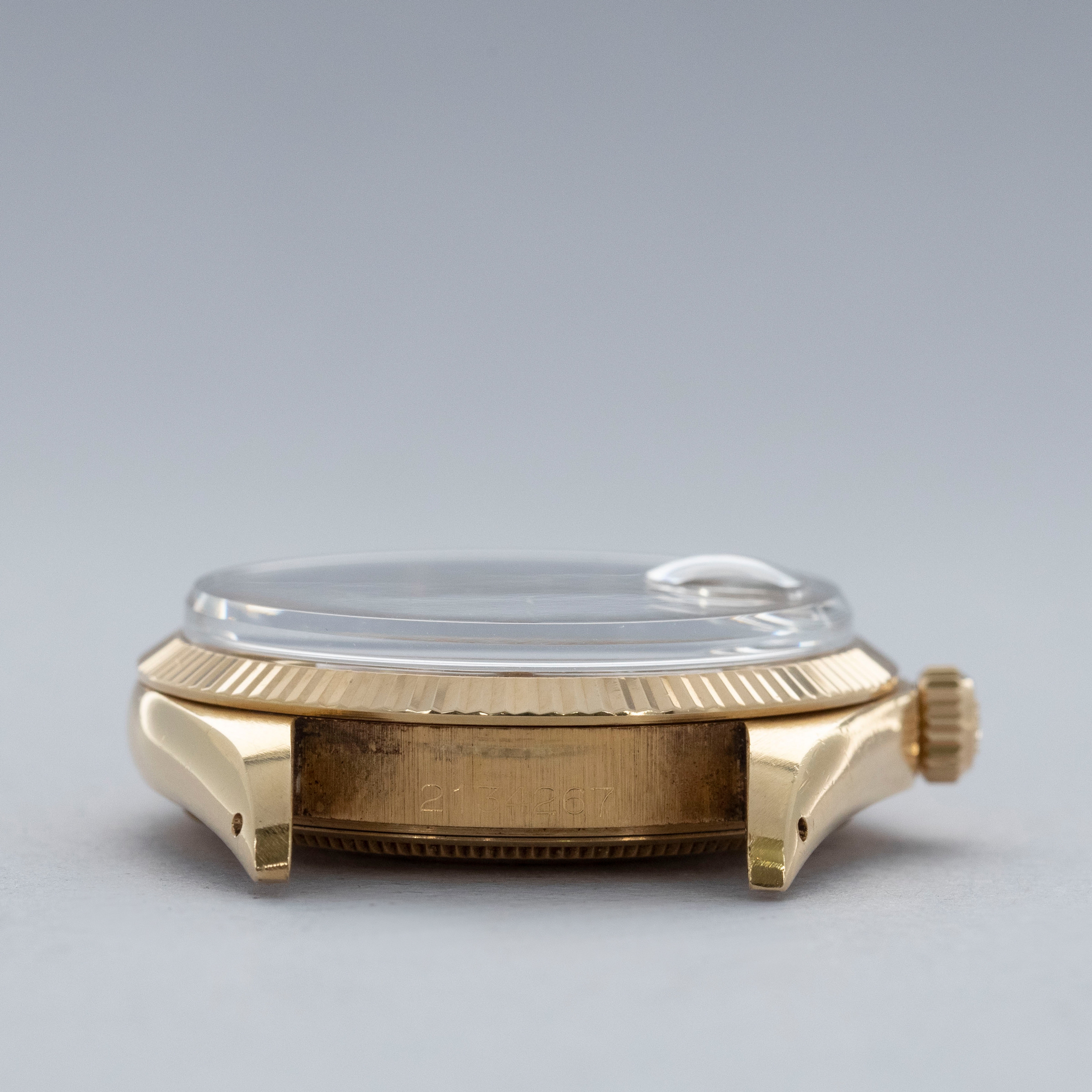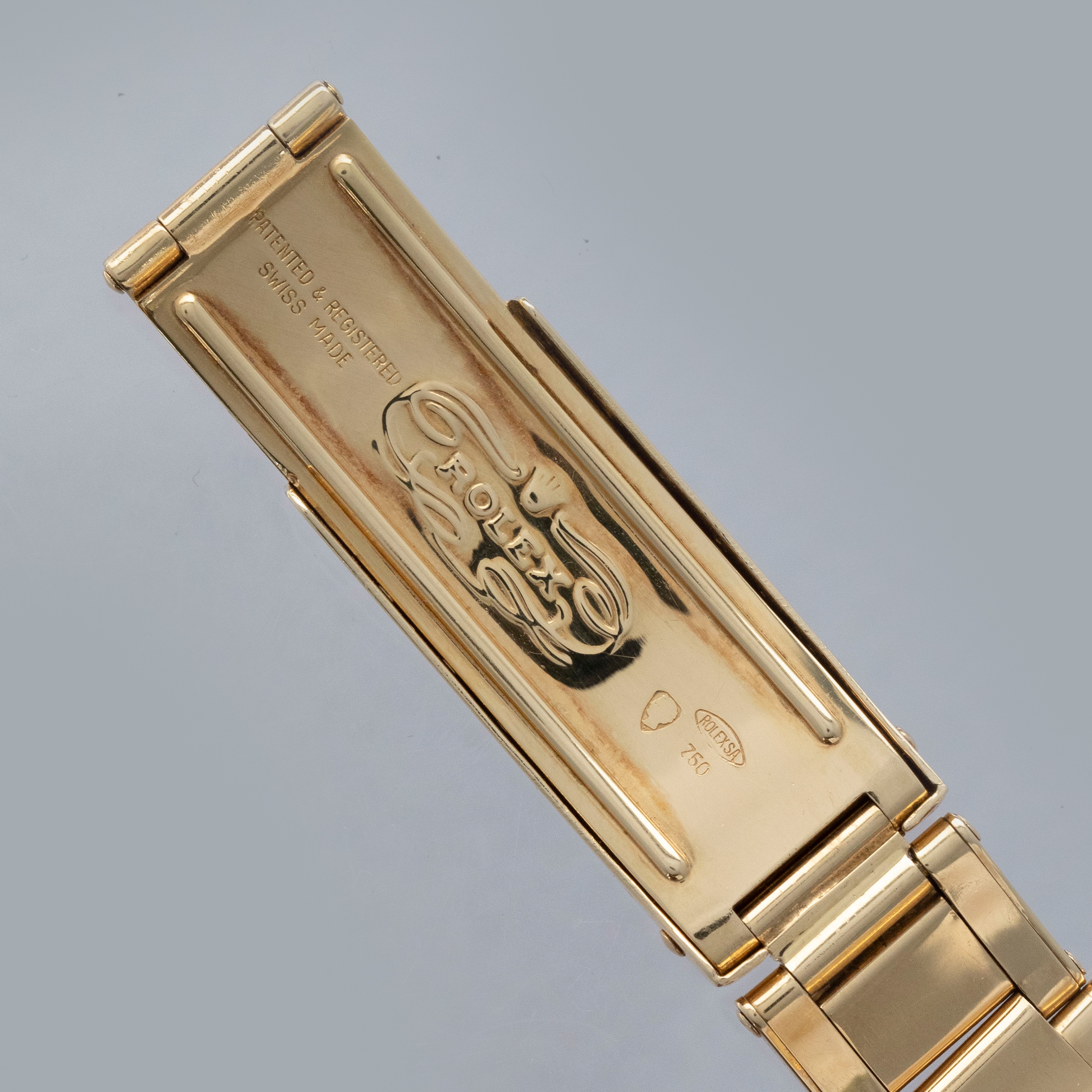 The watch is in overall excellent condition. The yellow gold case shows light surface scratches consistent with age, while the case back is very clean and the hallmarks on the rear of the lugs remain well defined. The fluted bezel is also well defined, with a couple of noticeable nicks at 12 o’clock. The dial is near mint, with clean and intact lume plots, complemented by corrosion-free yellow gold hands. The yellow gold rivet link Oyster bracelet has light surface scratches and moderate play between the links. The bracelet currently fits a 7 1/2” wrist, and is fitted with 12 links.