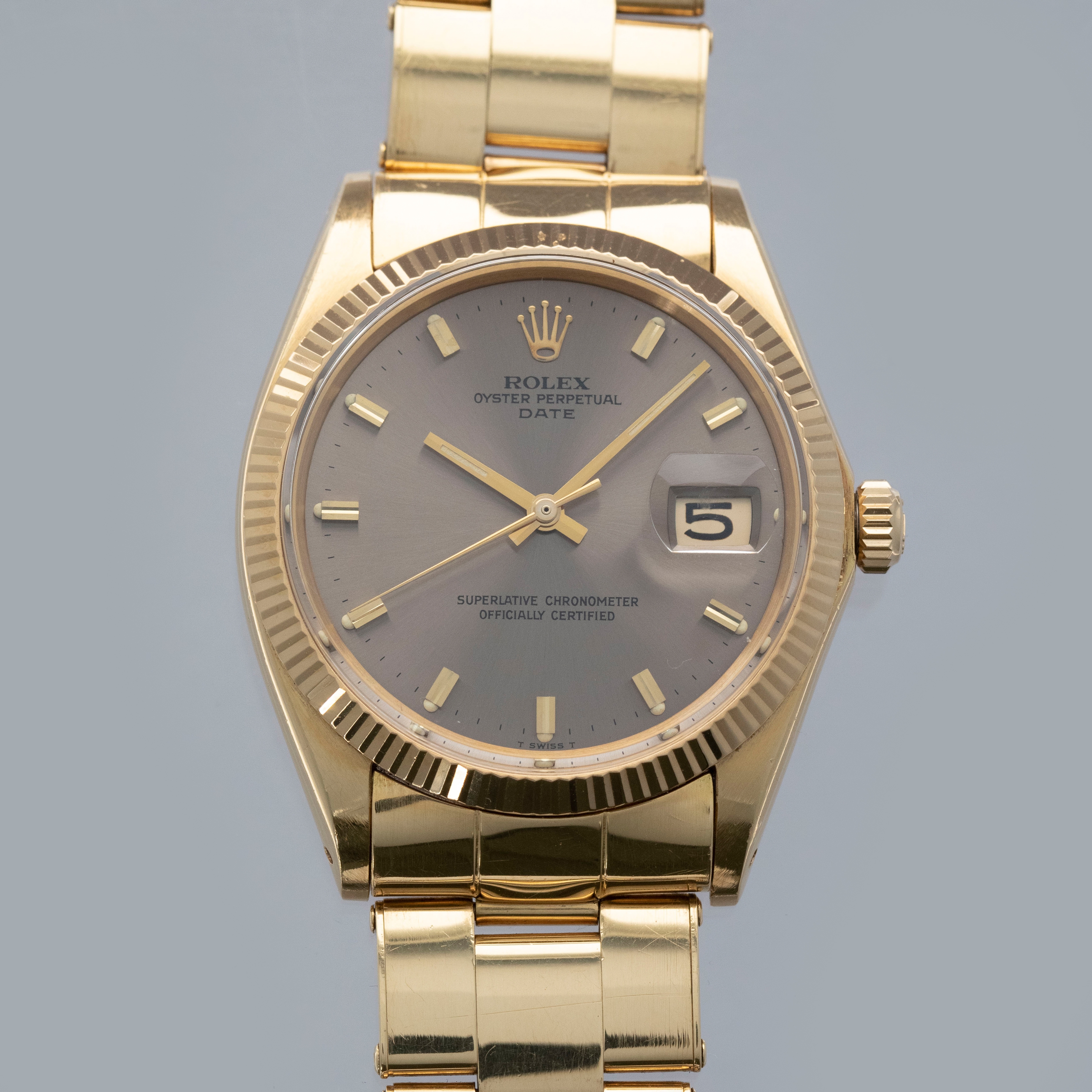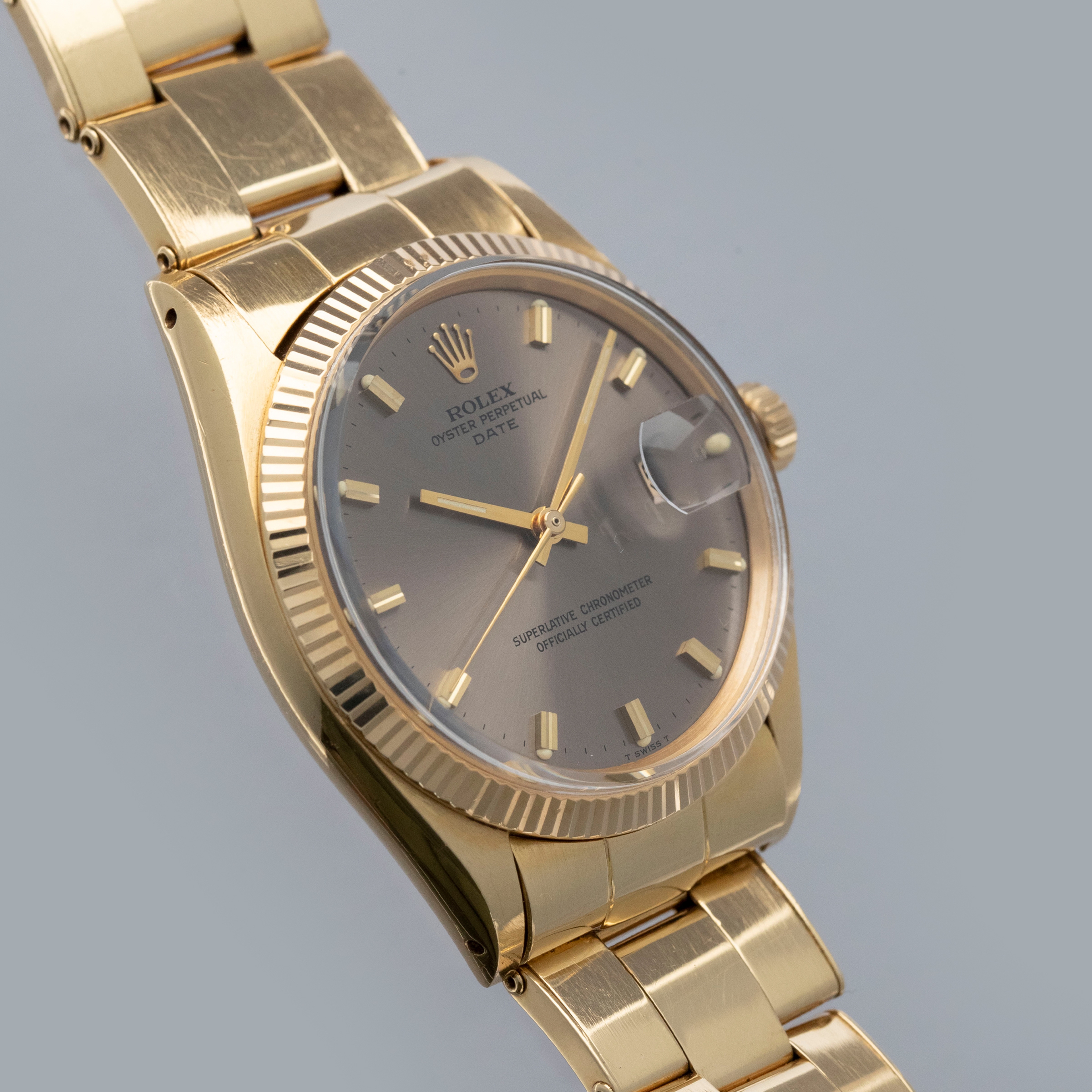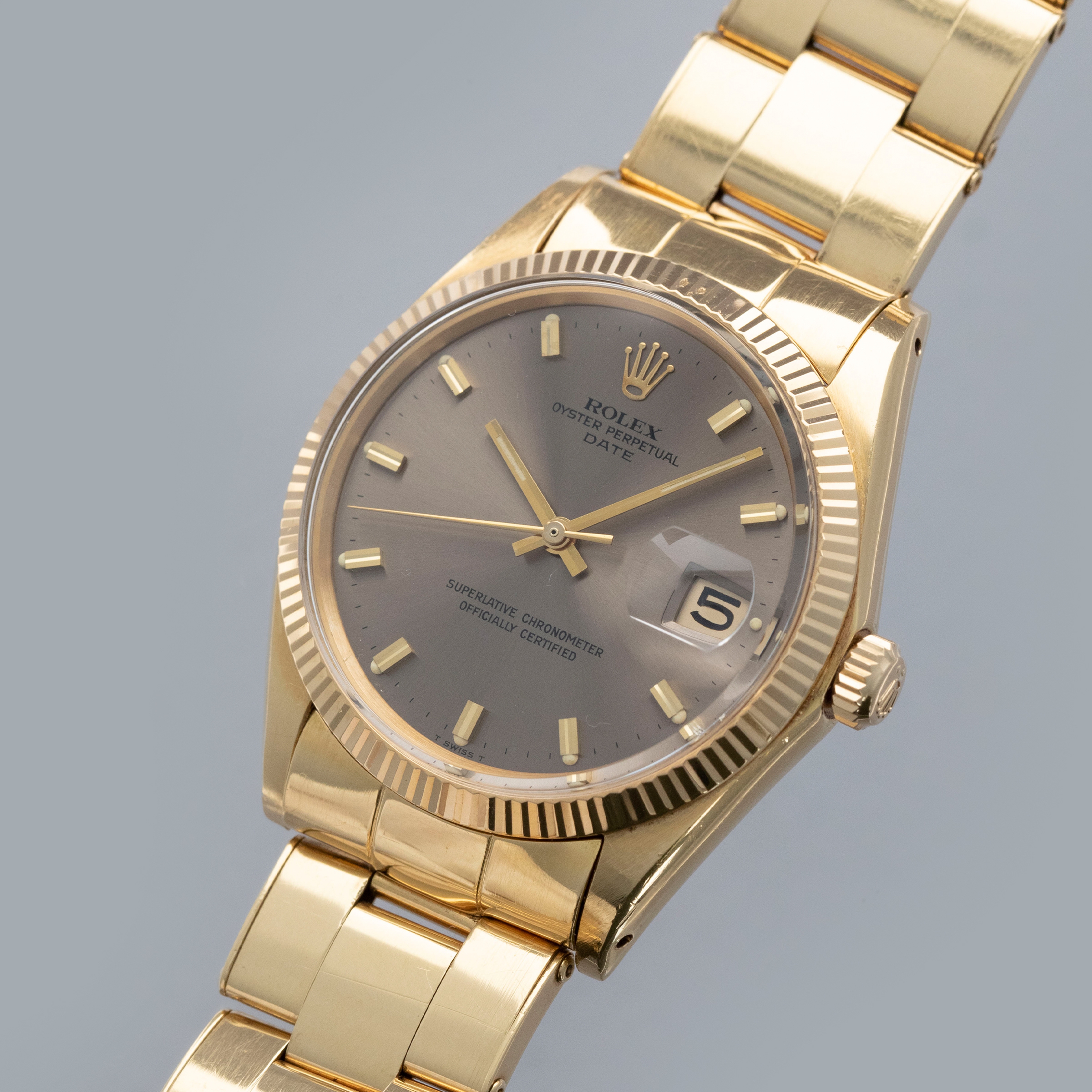 Released in the mid-1950s following the release of the Rolex Datejust, the Rolex Date was a mid-sized version of the Datejust that featured all of its iconic design traits just within a smaller case. Swapping the Datejust’s relatively larger 36mm case for the Air-King’s more quaint 34mm case, the Date was a fashionable watch that fit in with the tastes and aesthetic that was popular during the 50s and 60s. Continuing to offer the Date long into the 2010s, Rolex provided the Date with a wide selection of dial variants, bezel options, and case materials. Operating as a watch that could do it all, the Date was often constructed from an entirely gold case, much like the 18kt ref. 1503 that we have here, which is mounted to a matching 18k gold riveted bracelet. A stunning watch that paints a vivid picture of Rolex’s evolution through the ages, the Date collection features a host of interesting timepieces, and the example we have here is certainly a member of that cohort with its stunning bronze dial that completes this example's all-gold aesthetic.