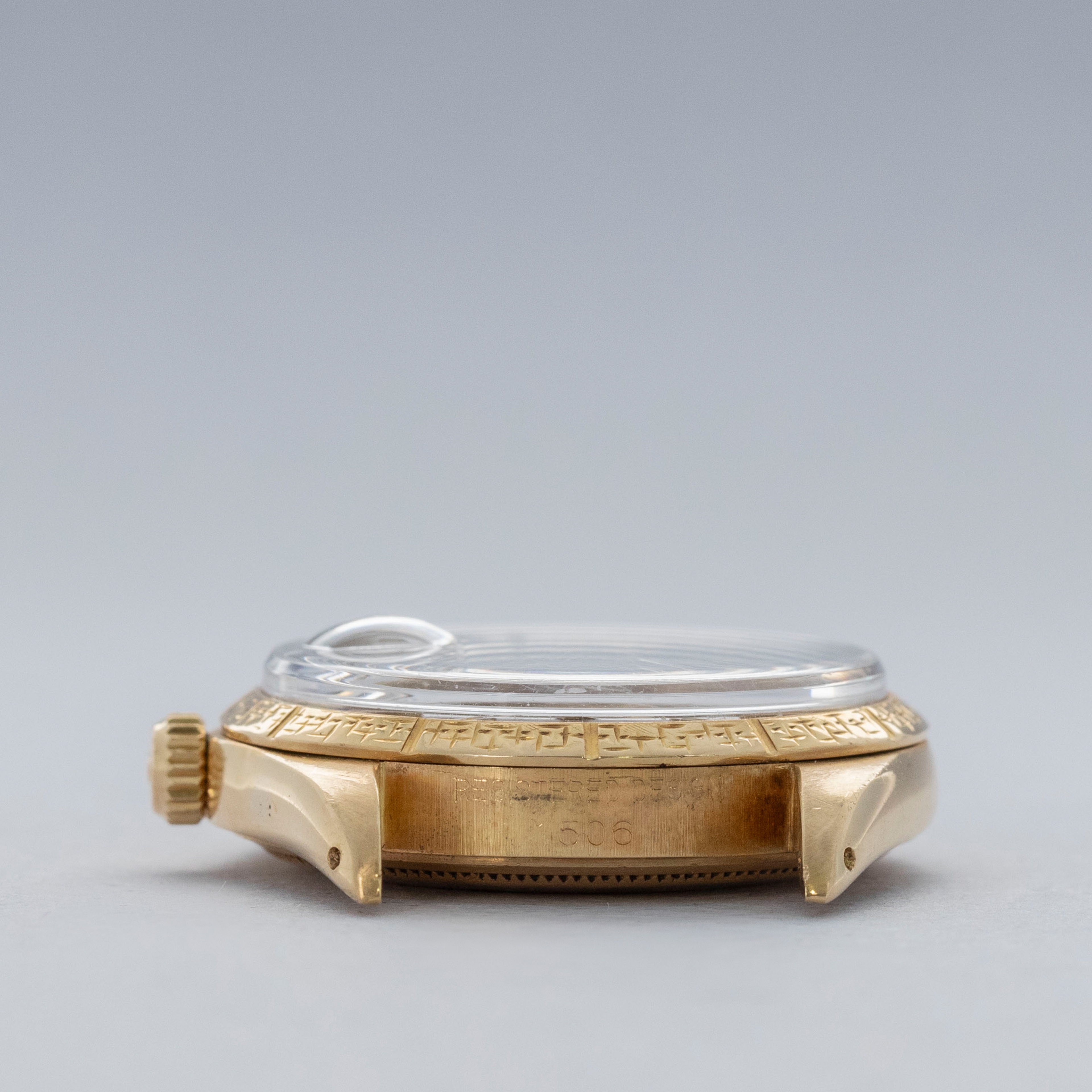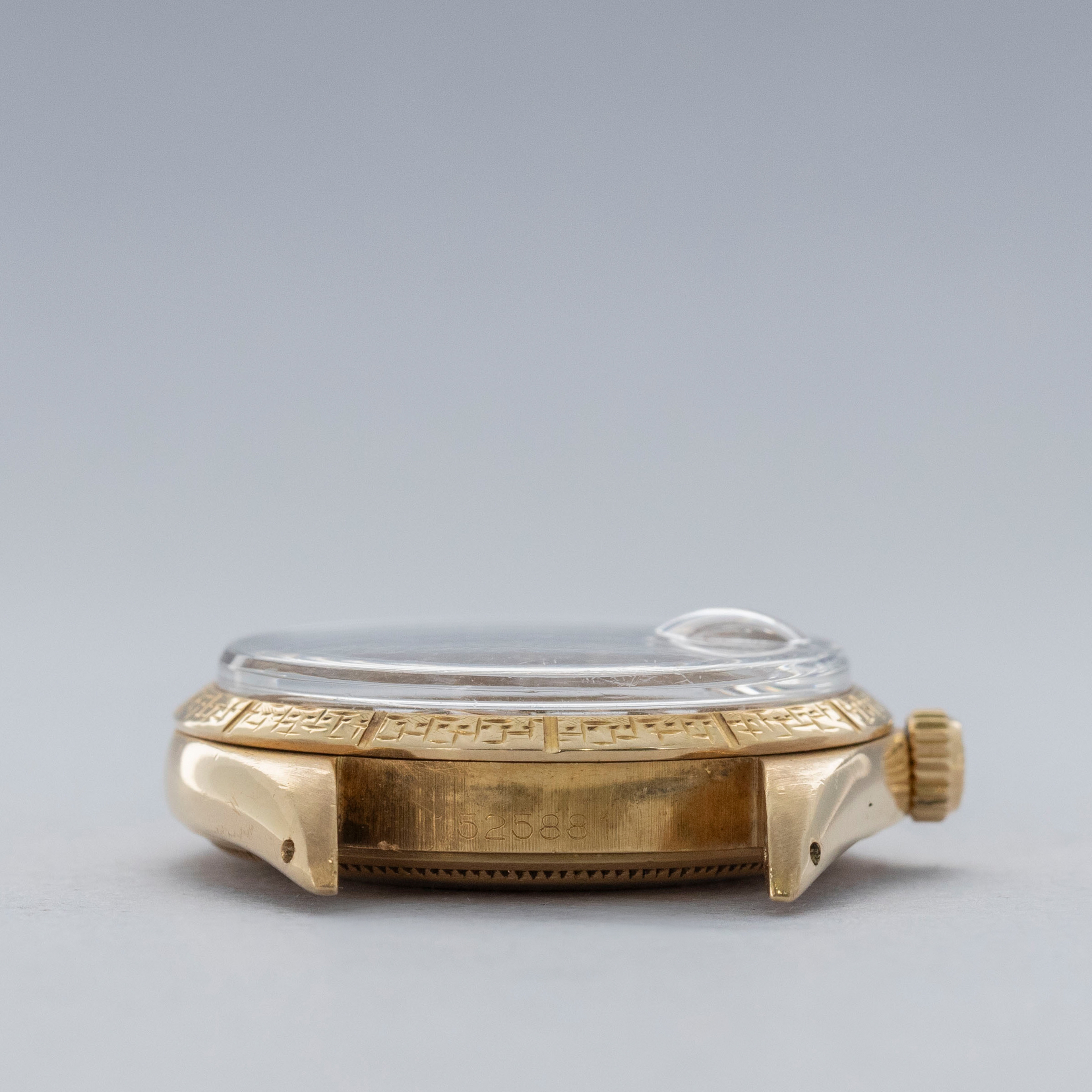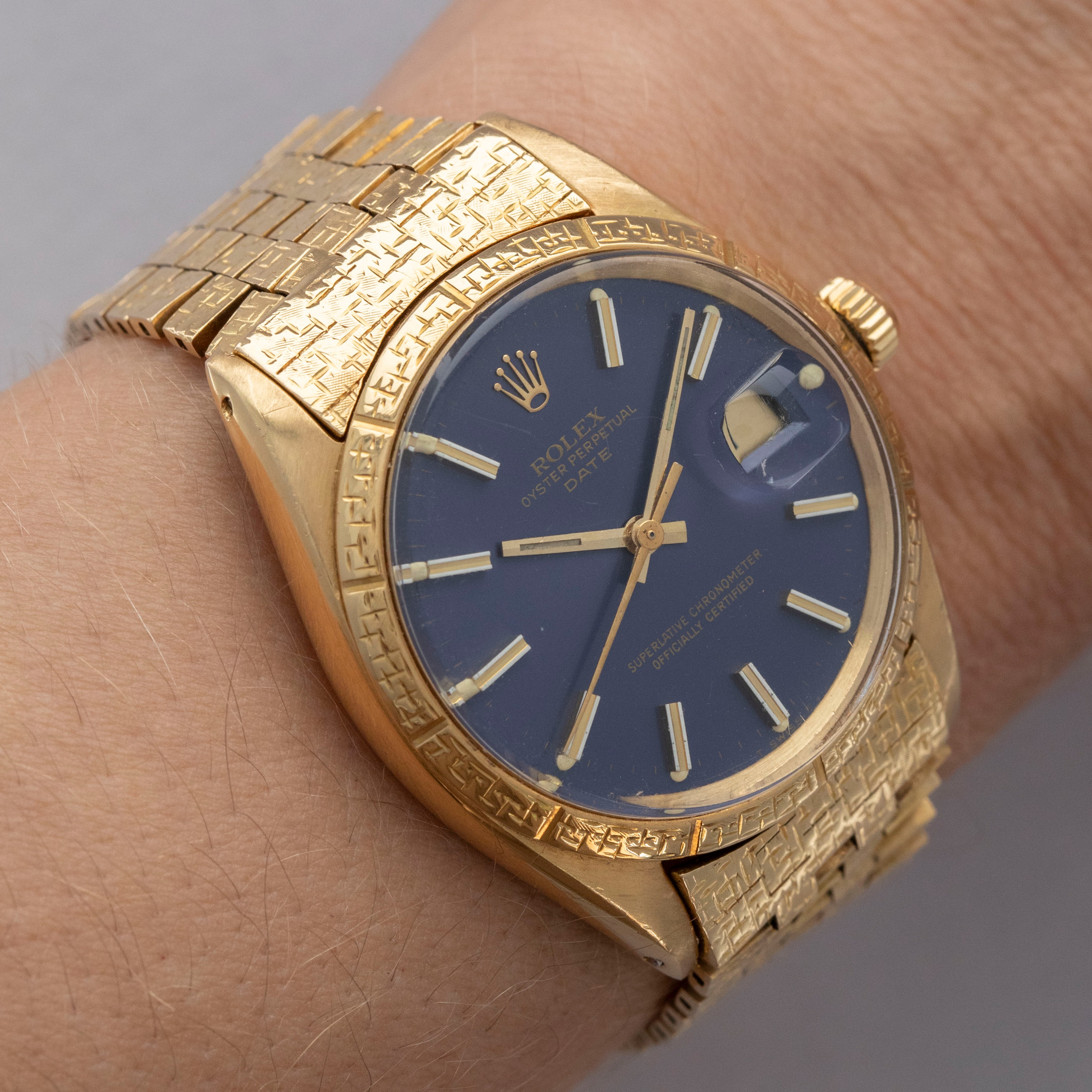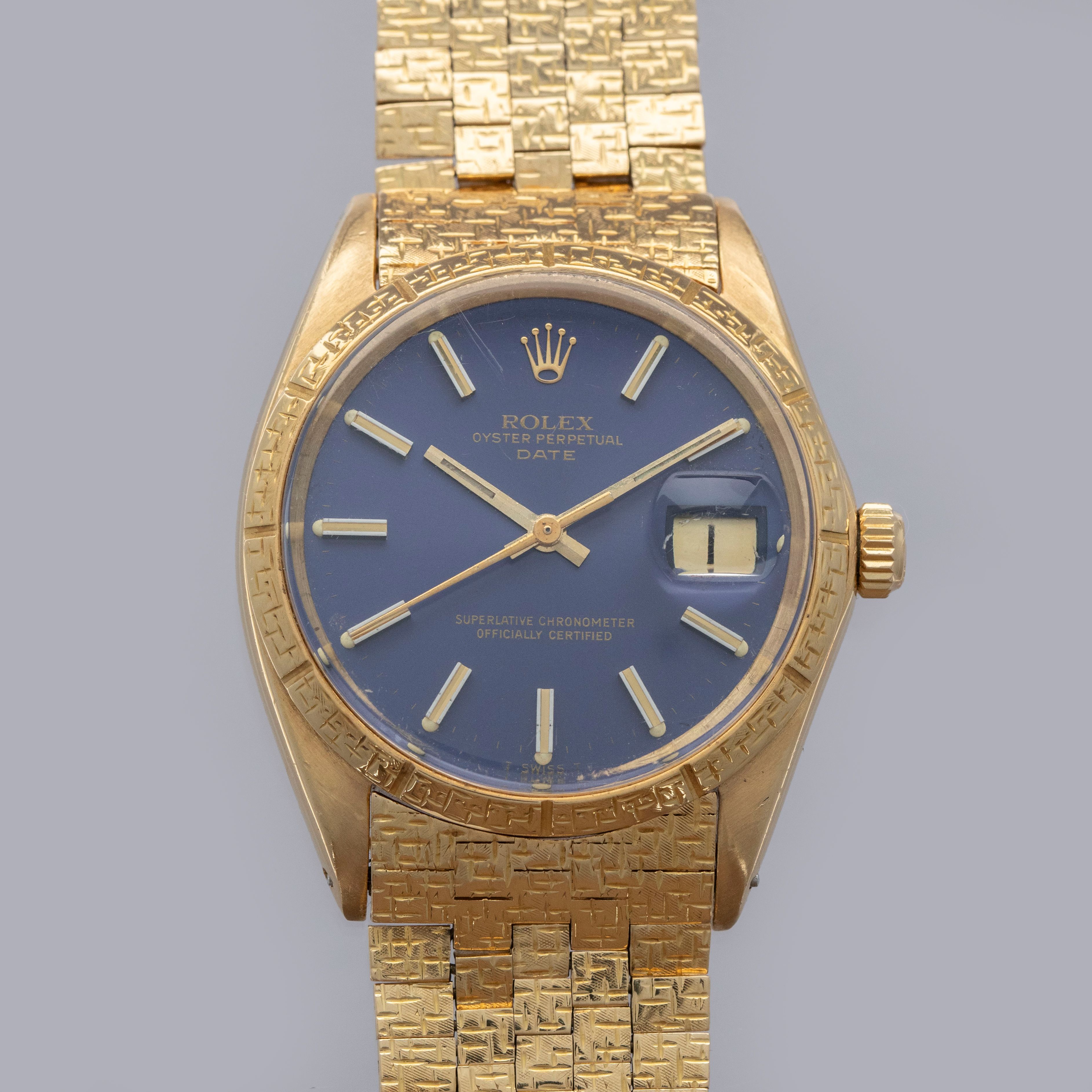 Released in the mid-1950s following the release of the Rolex Datejust, the Rolex Date was a mid-sized version of the Datejust that featured all of its iconic design traits just within a smaller case. Swapping the Datejust’s relatively larger 36mm case for the Air-King’s more quaint 34mm case, the Date was a fashionable watch that fit in with the tastes and aesthetic that was popular during the 50s and 60s. Continuing to offer the Date long into the 2010s, Rolex provided the Date with a wide selection of dial variants, bezel options and case materials. Operating as a watch that could do it all, the Date was often constructed from an entirely gold case, much like the 18k ref. 1506 that we have here, which is mounted to a matching, and incredibly rare, 18k gold Chine finish brick bracelet, with a matching Chine finish found across its bezel. Also known as the Greek Key Bezel due to the shapes of the etchings matching those from Greek decorations, this bezel and bracelet finish was only available on special order, and was only offered on the ref. 1506, thus it is incredible rare and sought after. A stunning watch that paints a vivid picture of Rolex’s evolution through the ages, the Date collection hosts an abundance of interesting timepieces, and the example we have here is truly stunning.