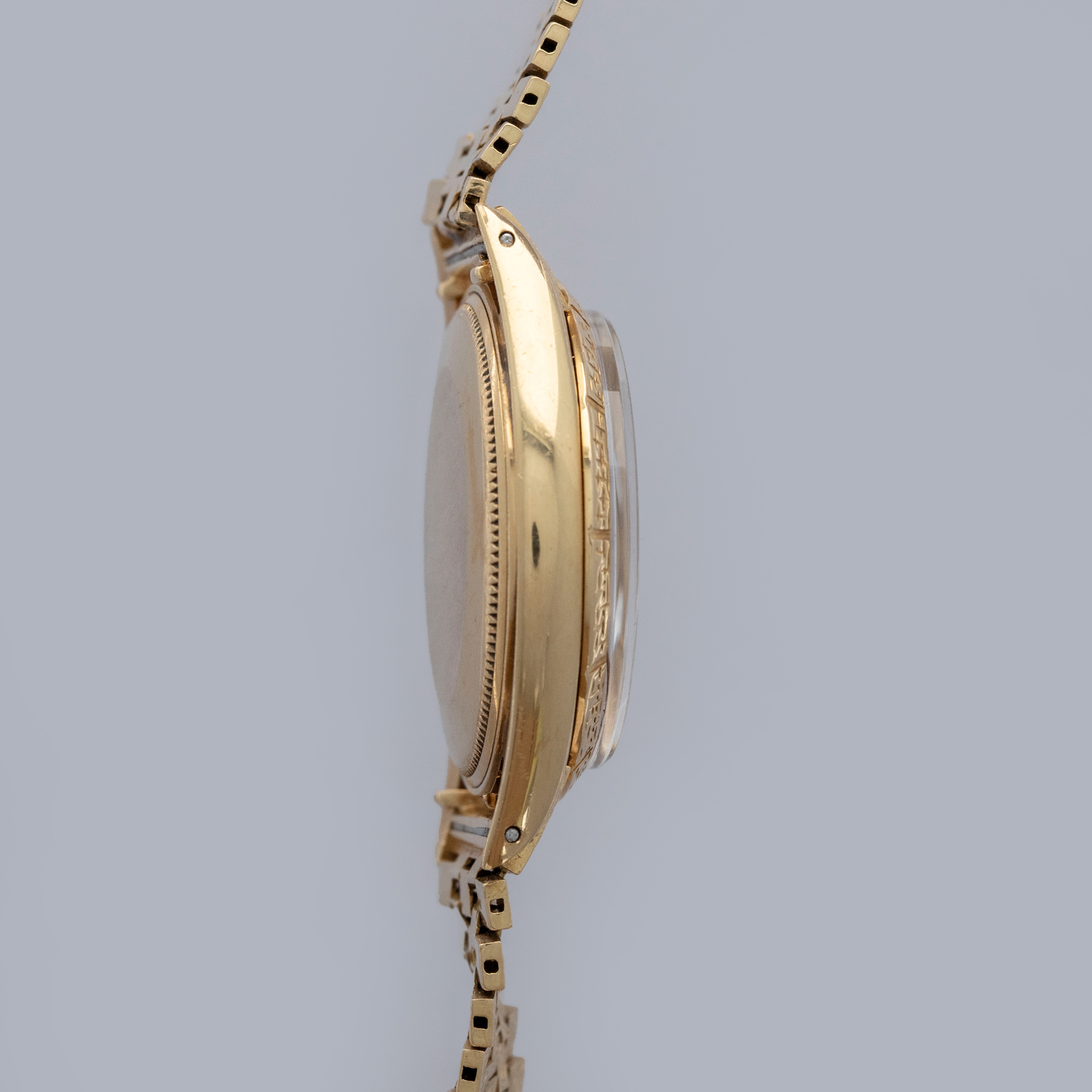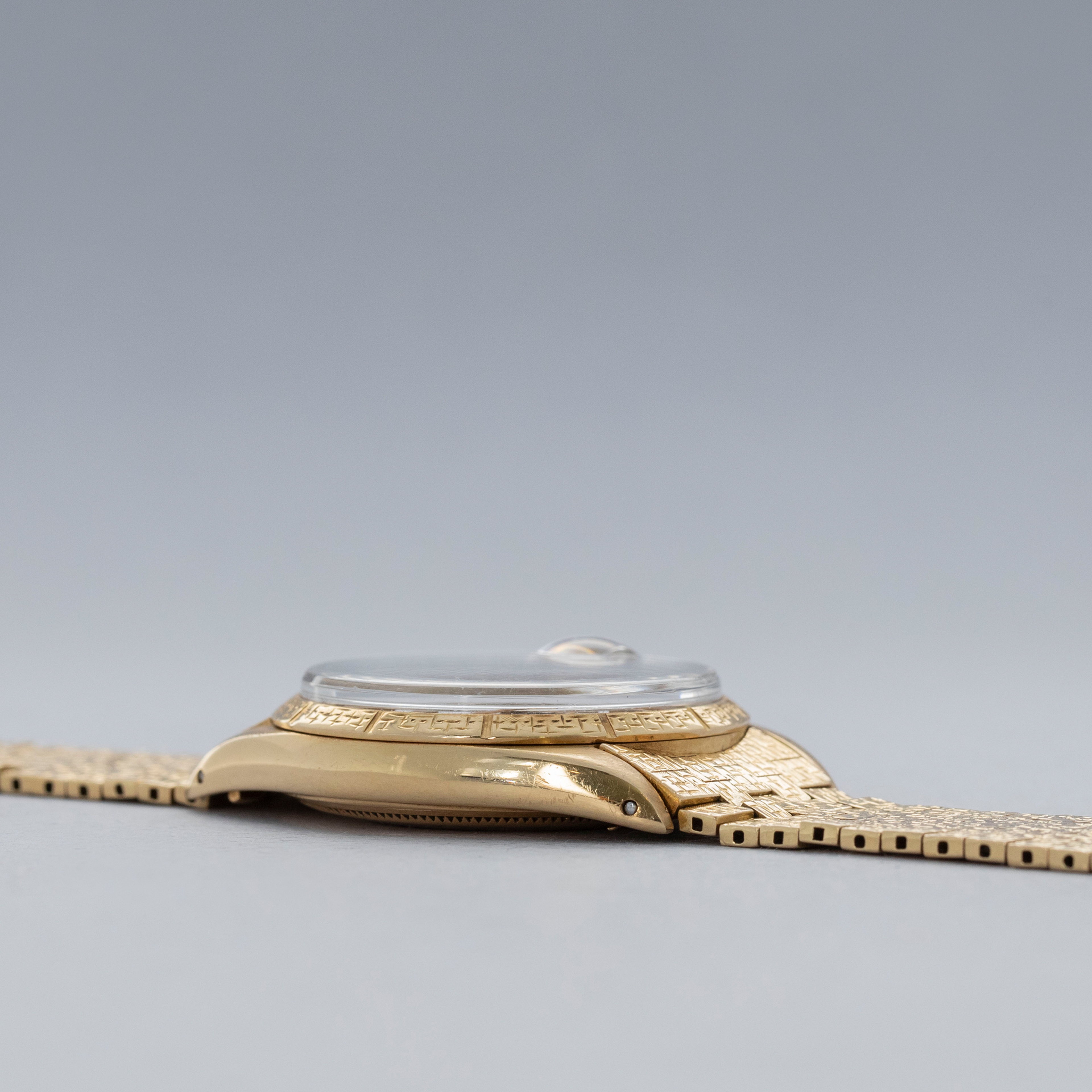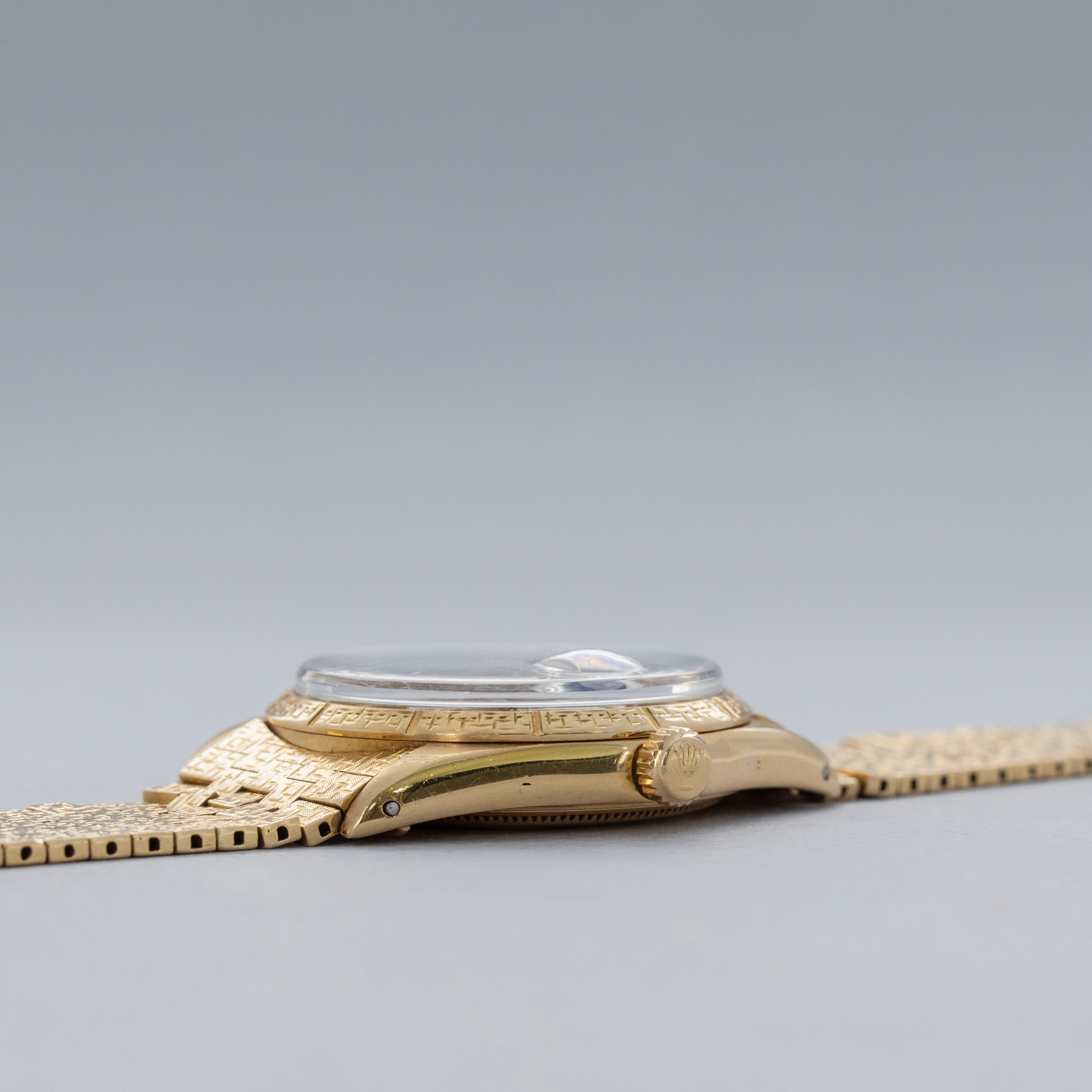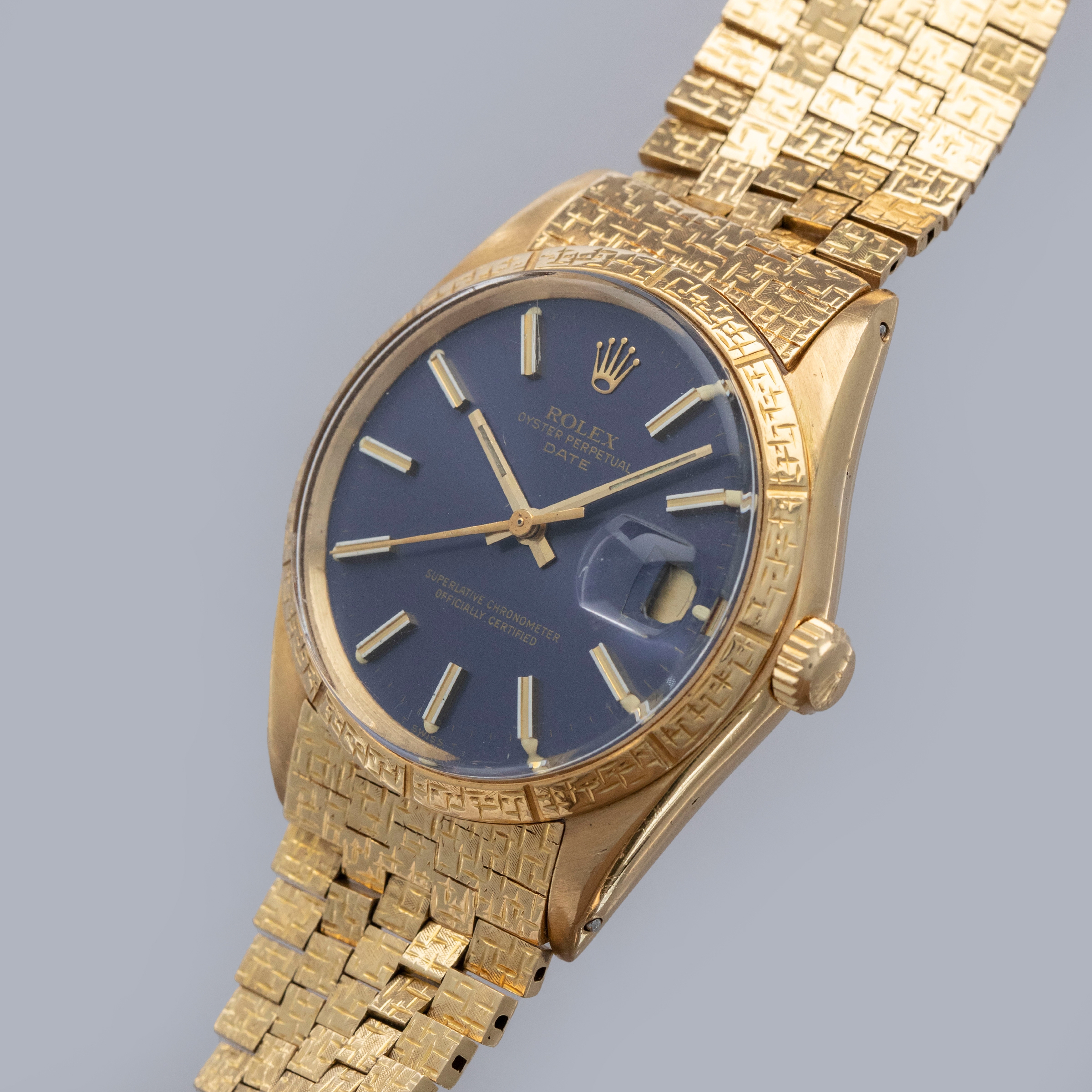 Released in the mid-1950s following the release of the Rolex Datejust, the Rolex Date was a mid-sized version of the Datejust that featured all of its iconic design traits just within a smaller case. Swapping the Datejust’s relatively larger 36mm case for the Air-King’s more quaint 34mm case, the Date was a fashionable watch that fit in with the tastes and aesthetic that was popular during the 50s and 60s. Continuing to offer the Date long into the 2010s, Rolex provided the Date with a wide selection of dial variants, bezel options and case materials. Operating as a watch that could do it all, the Date was often constructed from an entirely gold case, much like the 18k ref. 1506 that we have here, which is mounted to a matching, and incredibly rare, 18k gold Chine finish brick bracelet, with a matching Chine finish found across its bezel. Also known as the Greek Key Bezel due to the shapes of the etchings matching those from Greek decorations, this bezel and bracelet finish was only available on special order, and was only offered on the ref. 1506, thus it is incredible rare and sought after. A stunning watch that paints a vivid picture of Rolex’s evolution through the ages, the Date collection hosts an abundance of interesting timepieces, and the example we have here is truly stunning.