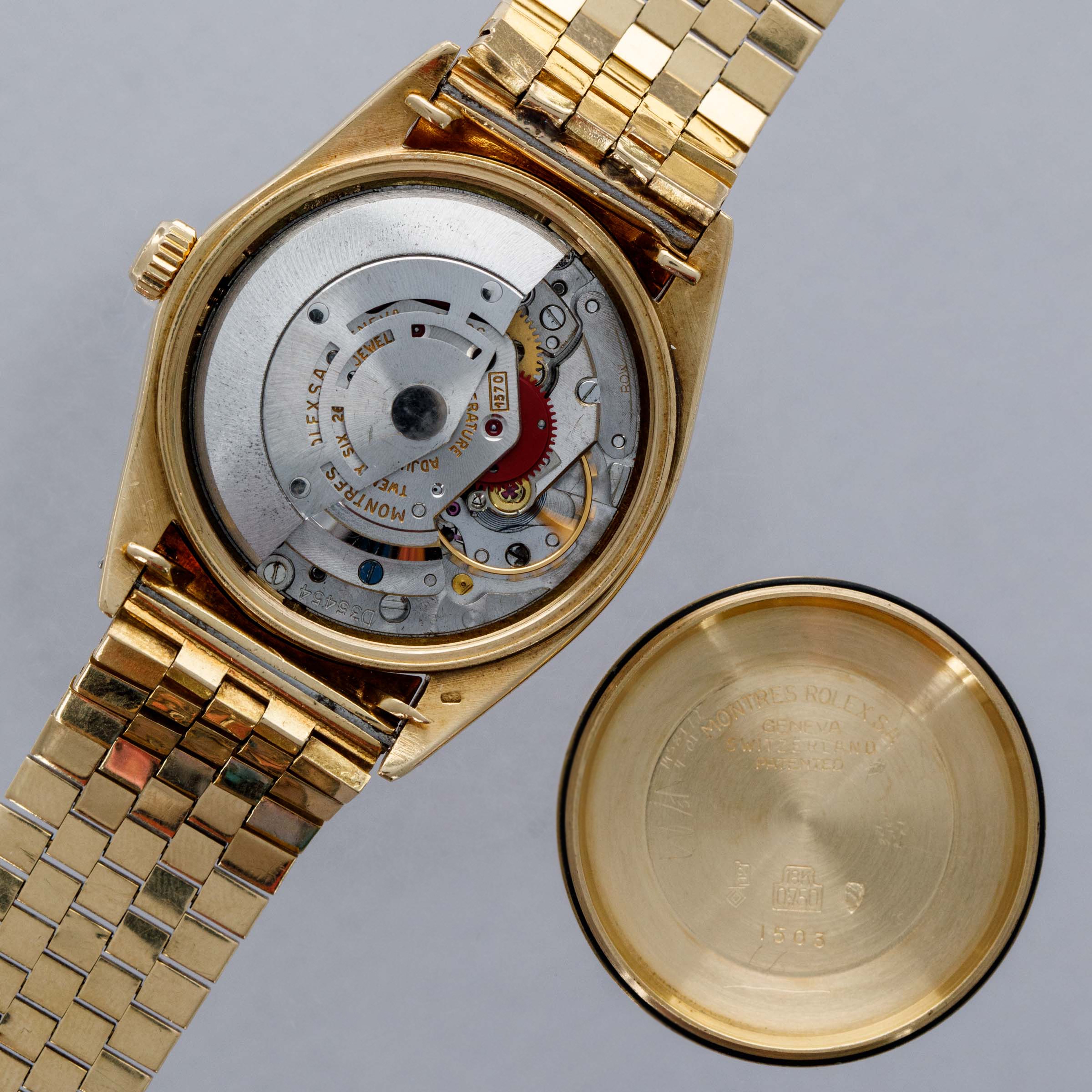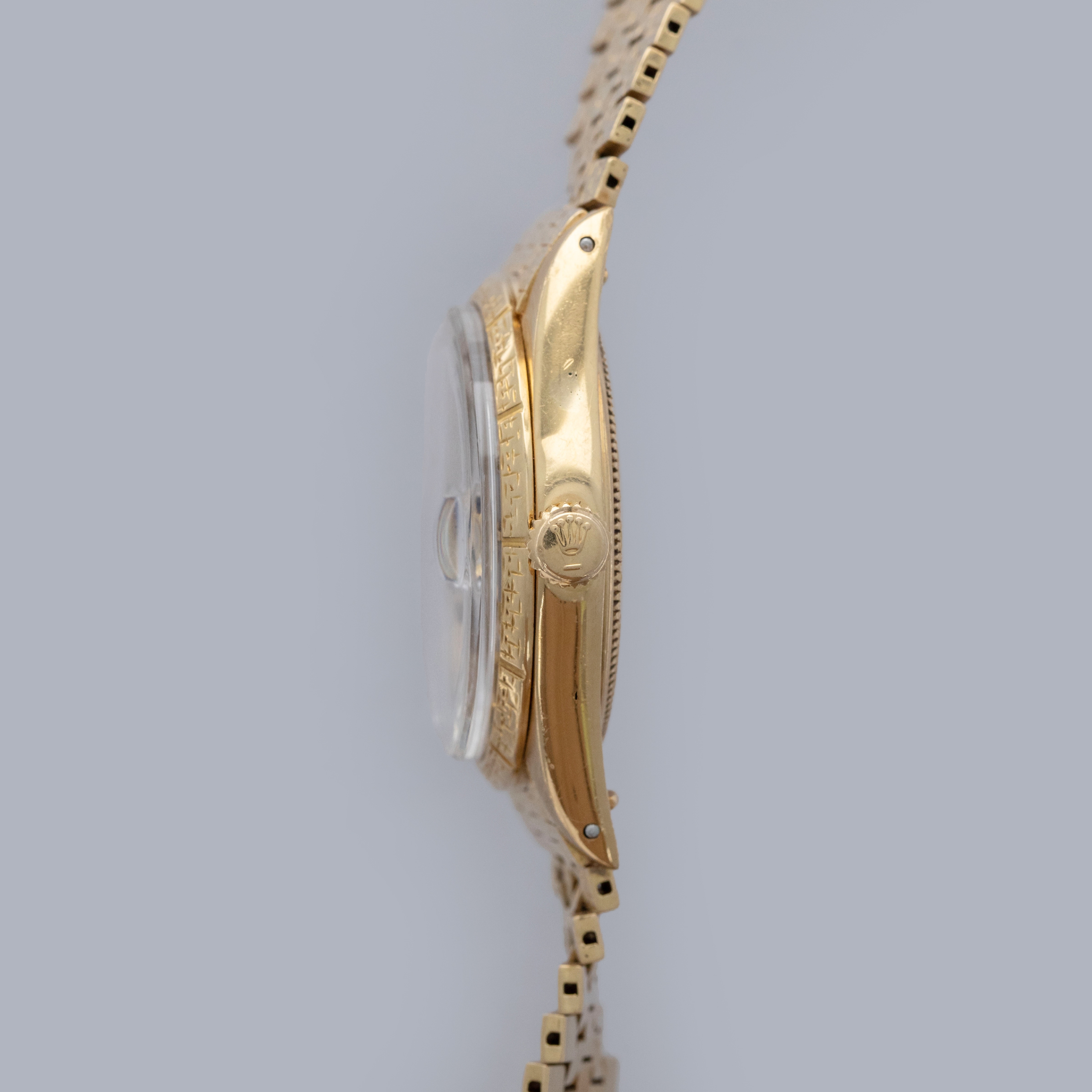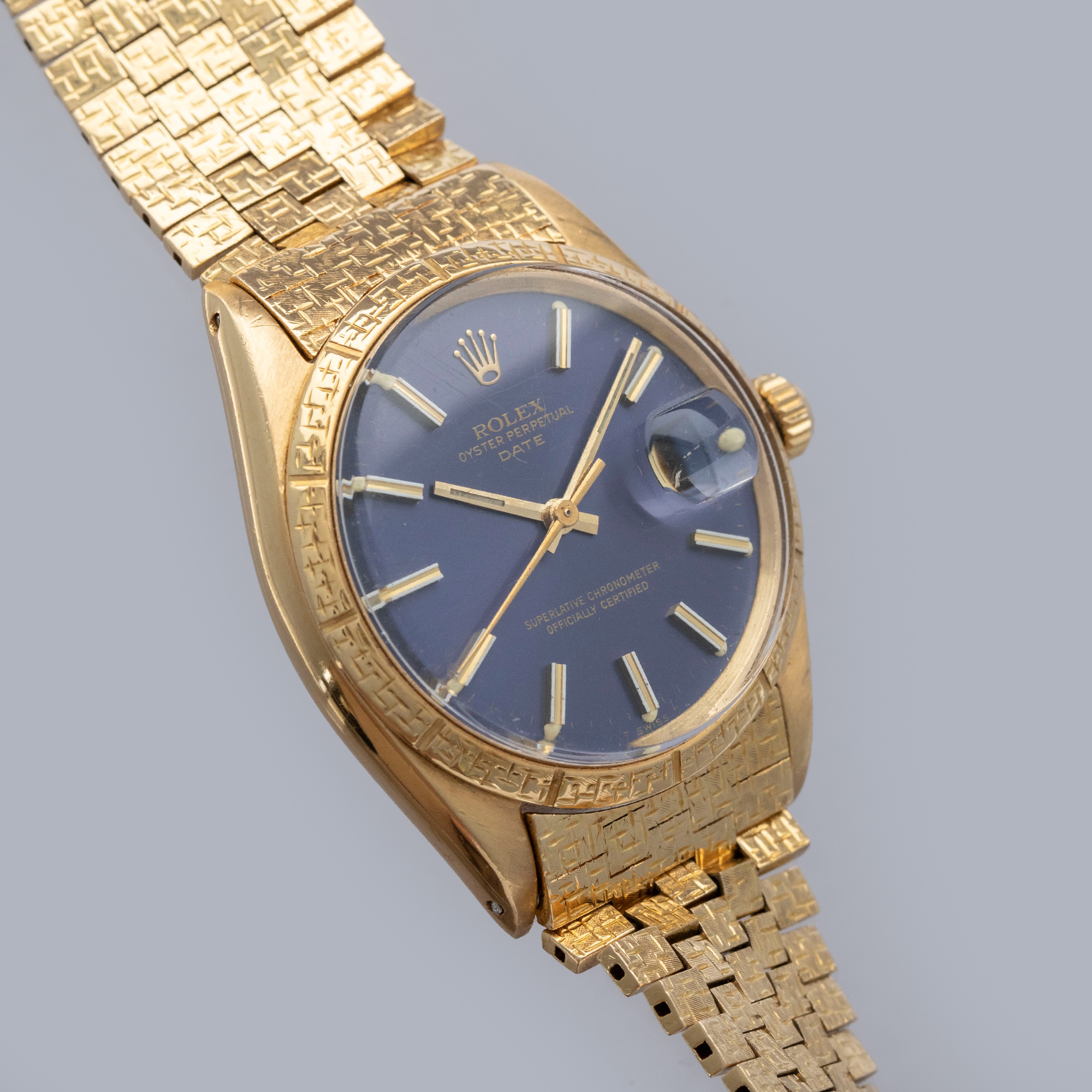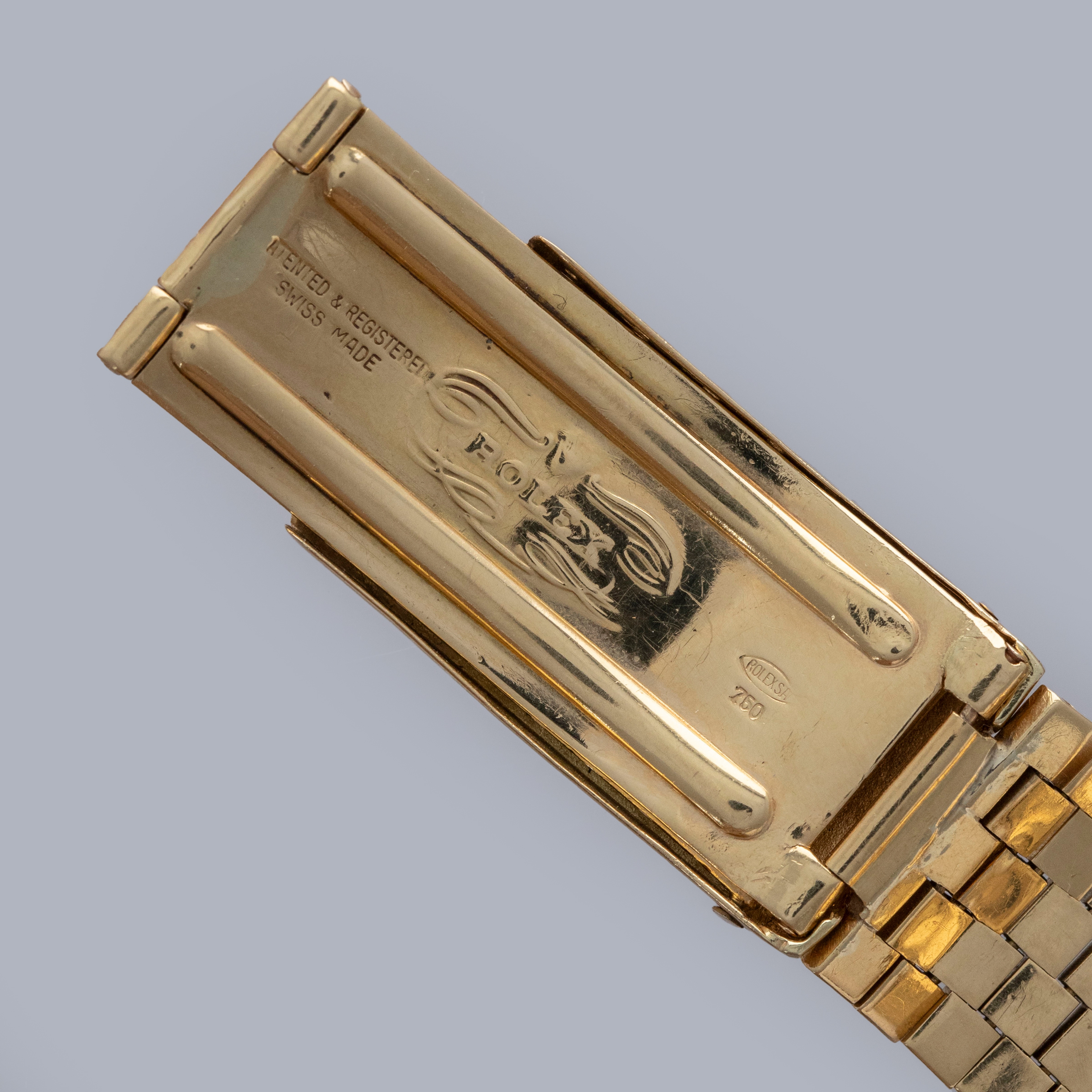 Released in the mid-1950s following the release of the Rolex Datejust, the Rolex Date was a mid-sized version of the Datejust that featured all of its iconic design traits just within a smaller case. Swapping the Datejust’s relatively larger 36mm case for the Air-King’s more quaint 34mm case, the Date was a fashionable watch that fit in with the tastes and aesthetic that was popular during the 50s and 60s. Continuing to offer the Date long into the 2010s, Rolex provided the Date with a wide selection of dial variants, bezel options and case materials. Operating as a watch that could do it all, the Date was often constructed from an entirely gold case, much like the 18k ref. 1506 that we have here, which is mounted to a matching, and incredibly rare, 18k gold Chine finish brick bracelet, with a matching Chine finish found across its bezel. Also known as the Greek Key Bezel due to the shapes of the etchings matching those from Greek decorations, this bezel and bracelet finish was only available on special order, and was only offered on the ref. 1506, thus it is incredible rare and sought after. A stunning watch that paints a vivid picture of Rolex’s evolution through the ages, the Date collection hosts an abundance of interesting timepieces, and the example we have here is truly stunning.