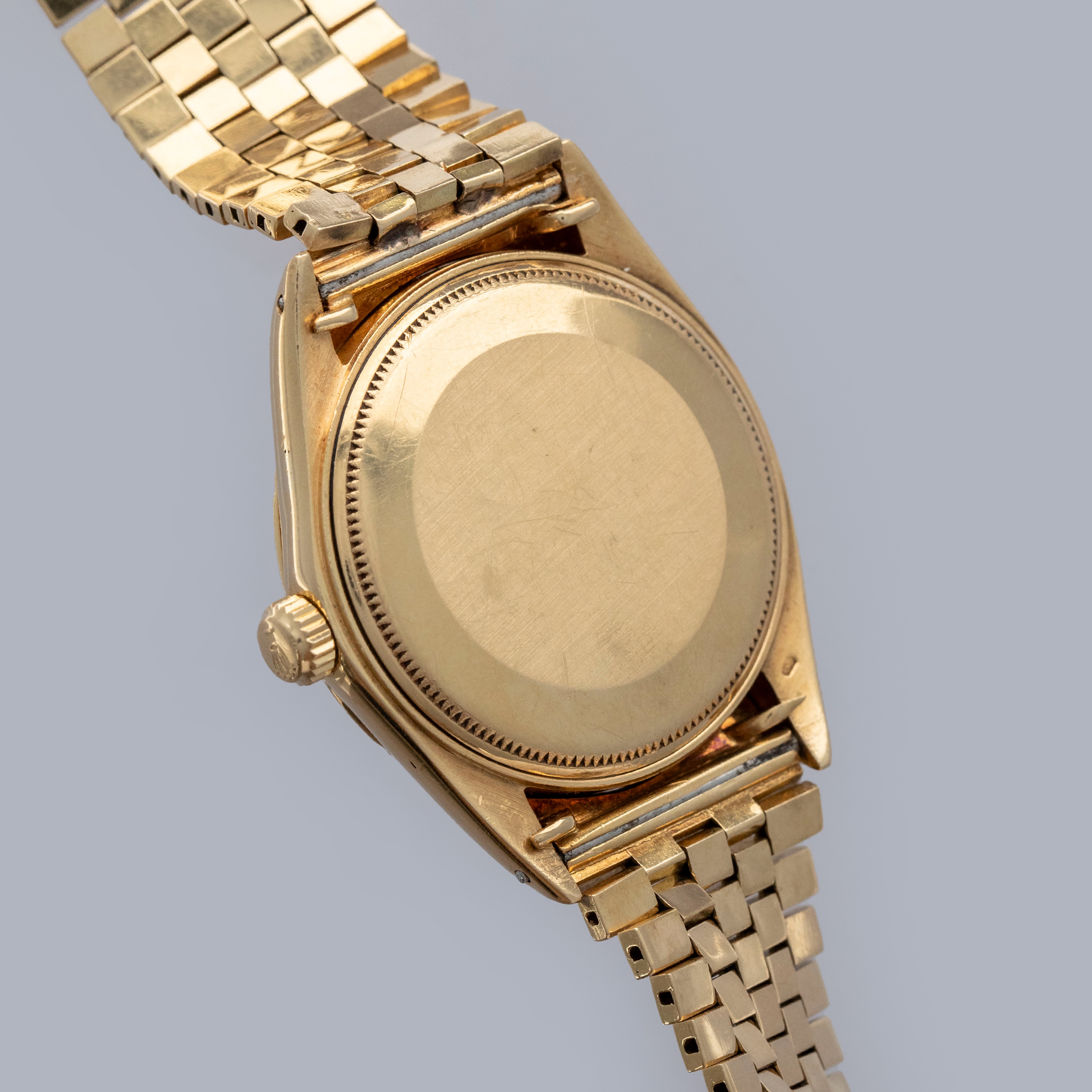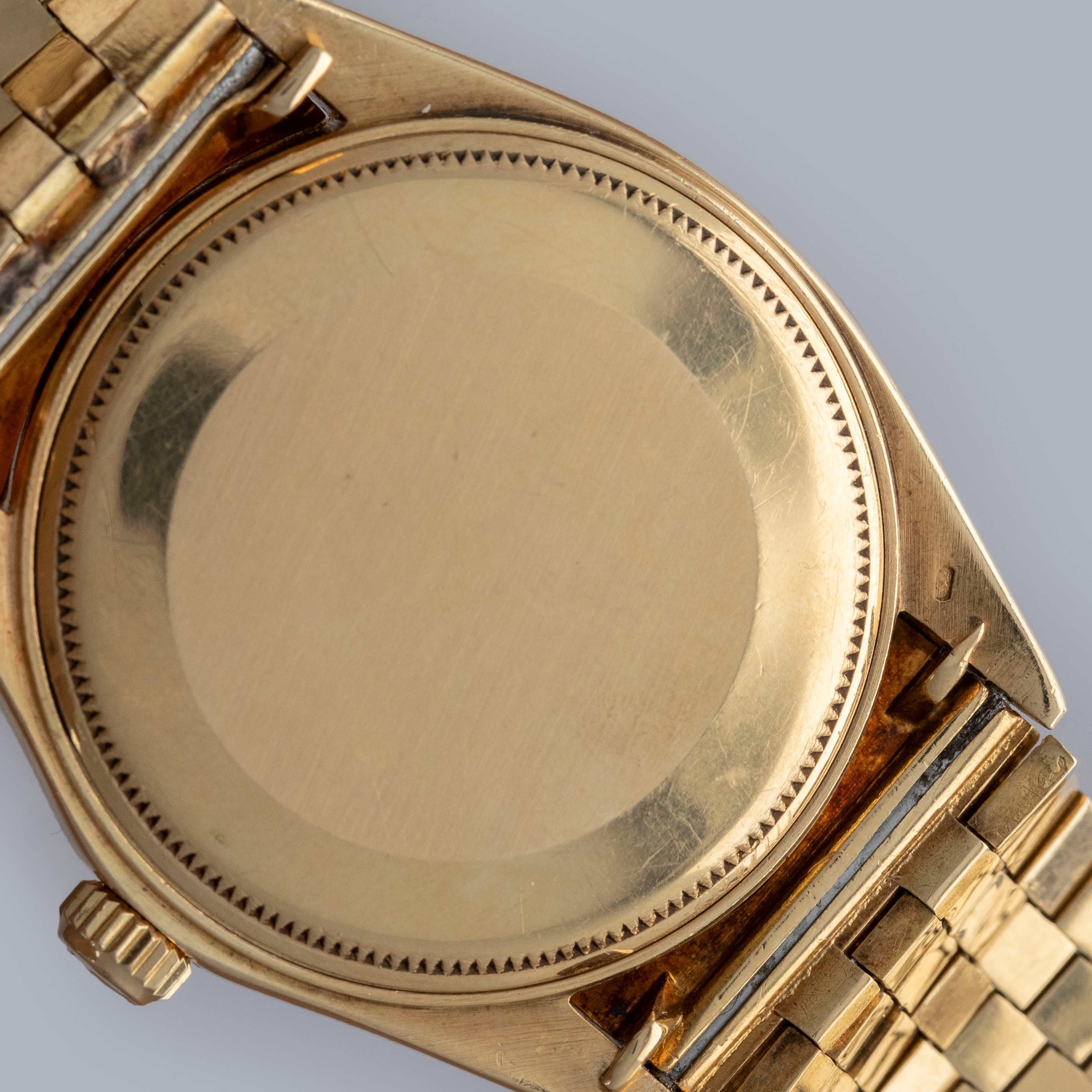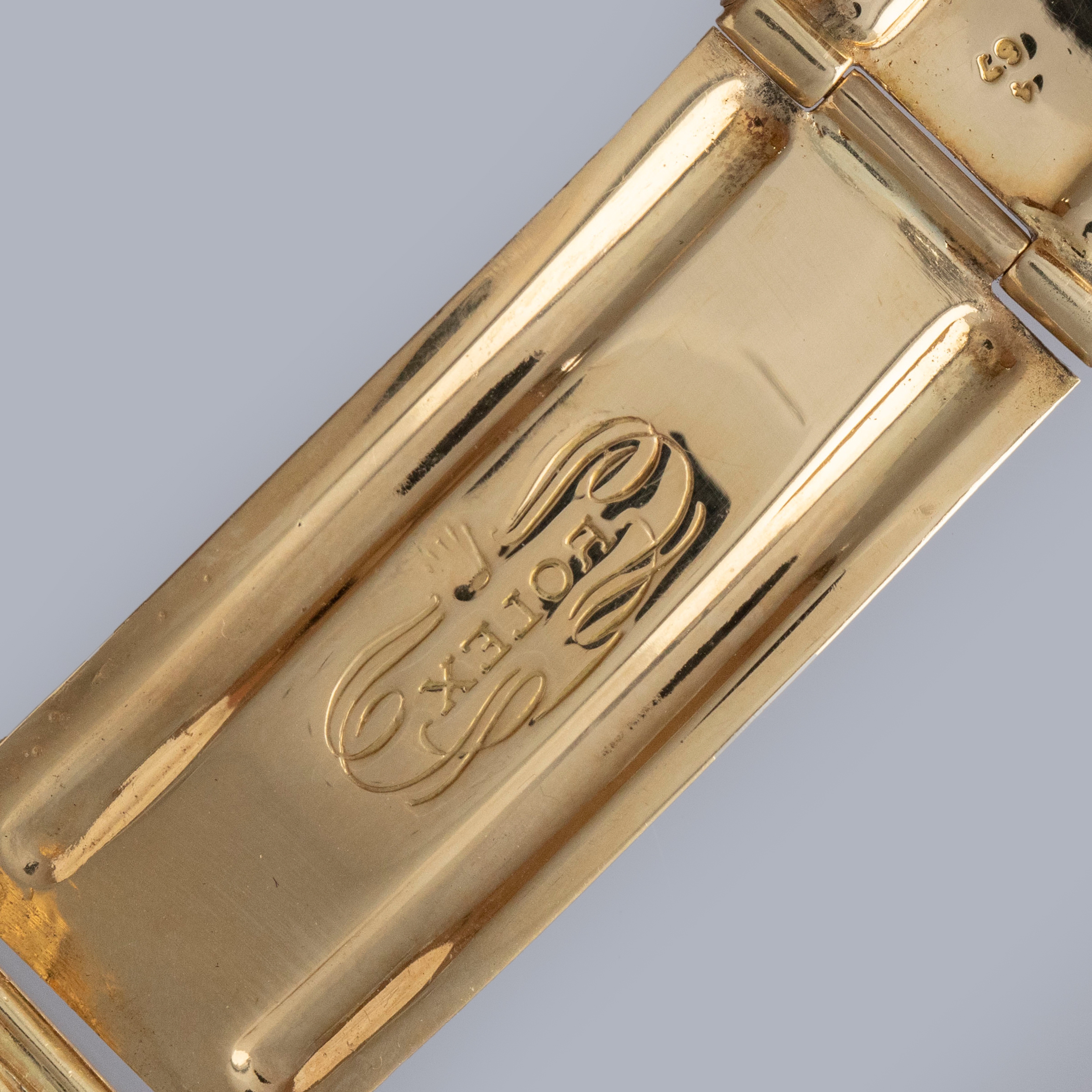 The watch is in overall excellent condition. The yellow gold case has scratches and marks consistent with its vintage, and shows signs of previous polish. The lugs display some wear along the edges. The diamond-cut bezel remains sharp and well defined. The blue dial is in excellent condition, with well-preserved luminous plots. The crystal has some scratches. The watch is fitted with a brick-style "Chine Finish" bracelet that matches the bezel’s finish, showing light surface marks and some play between the links. The bracelet has 38 links and fits an approximately 7.25” wrist.