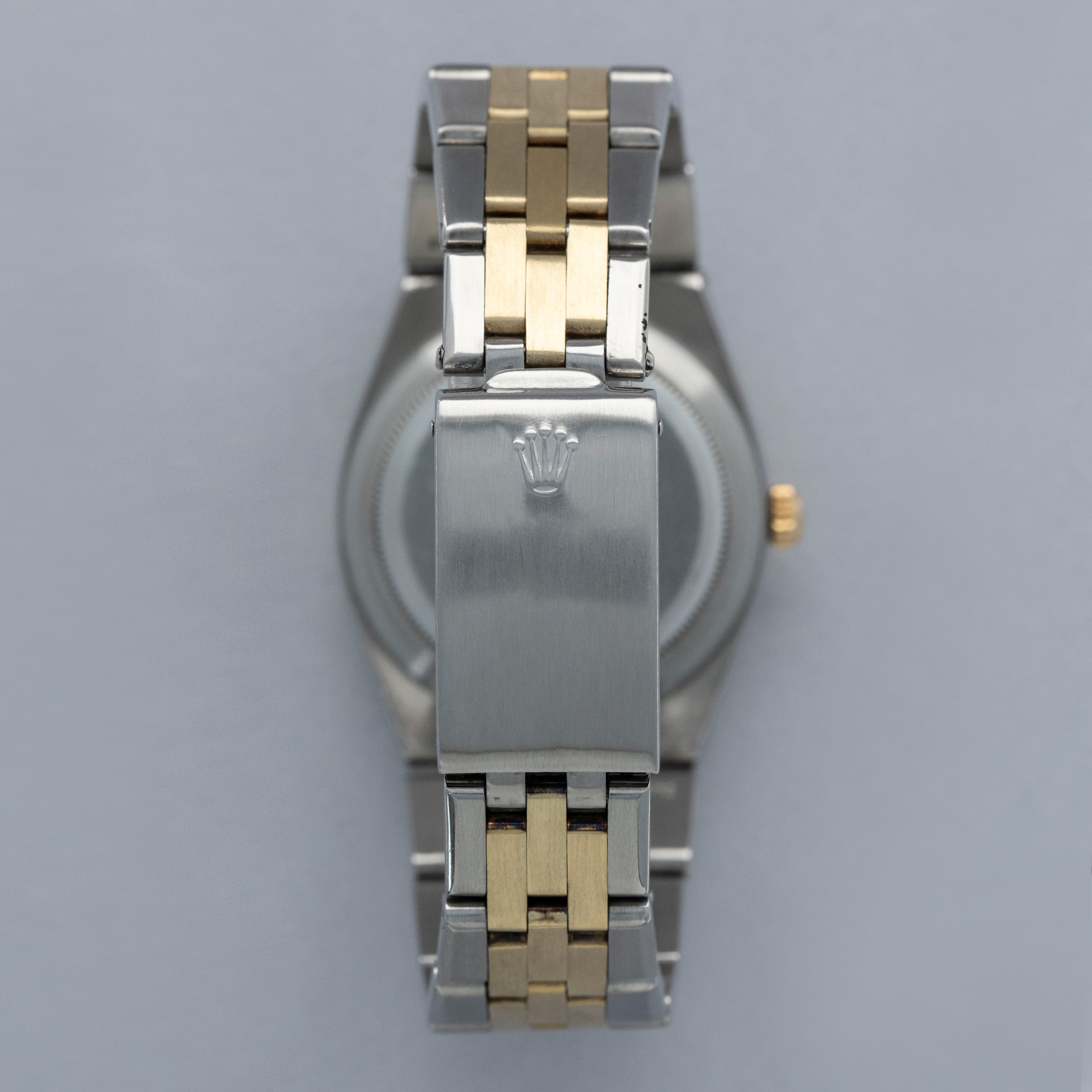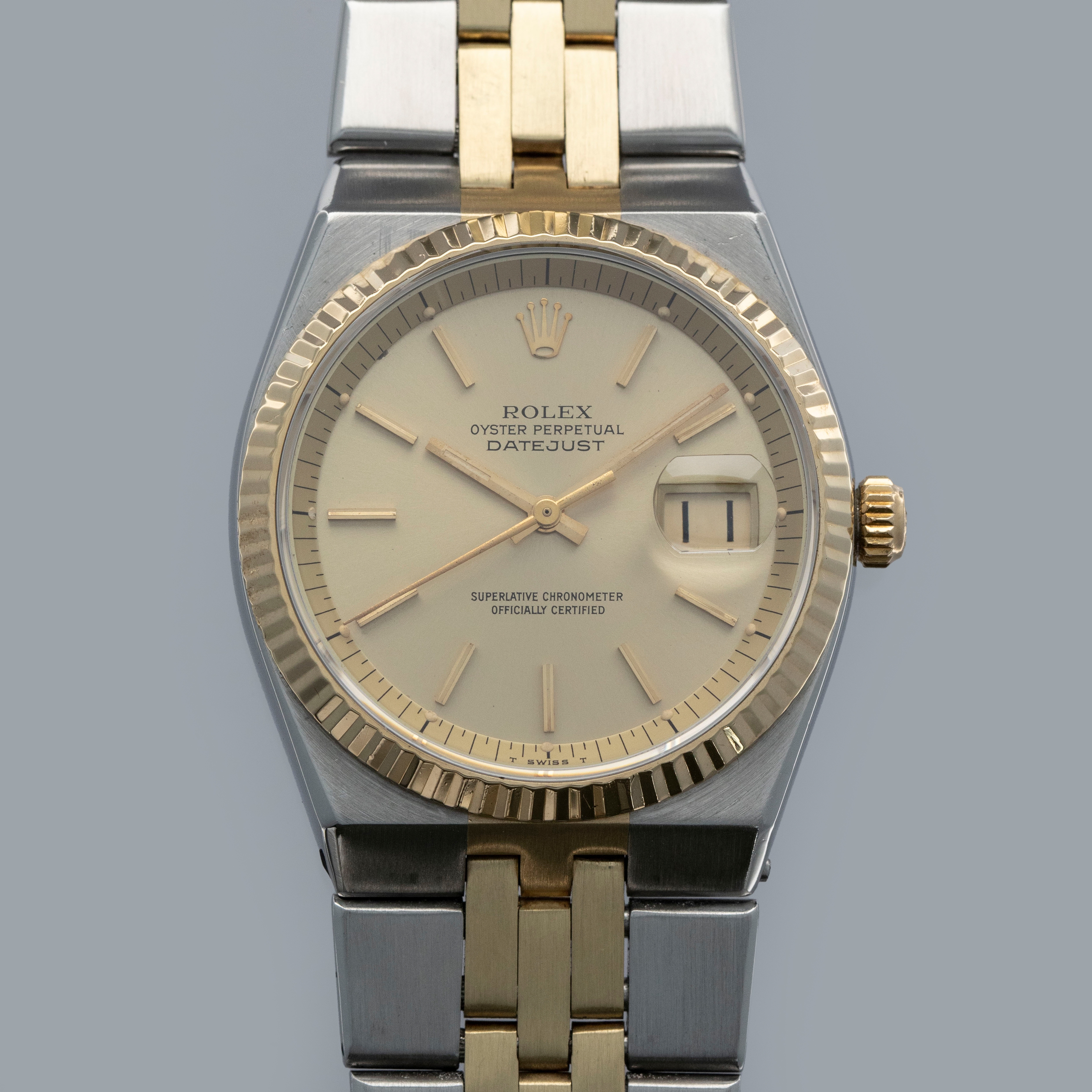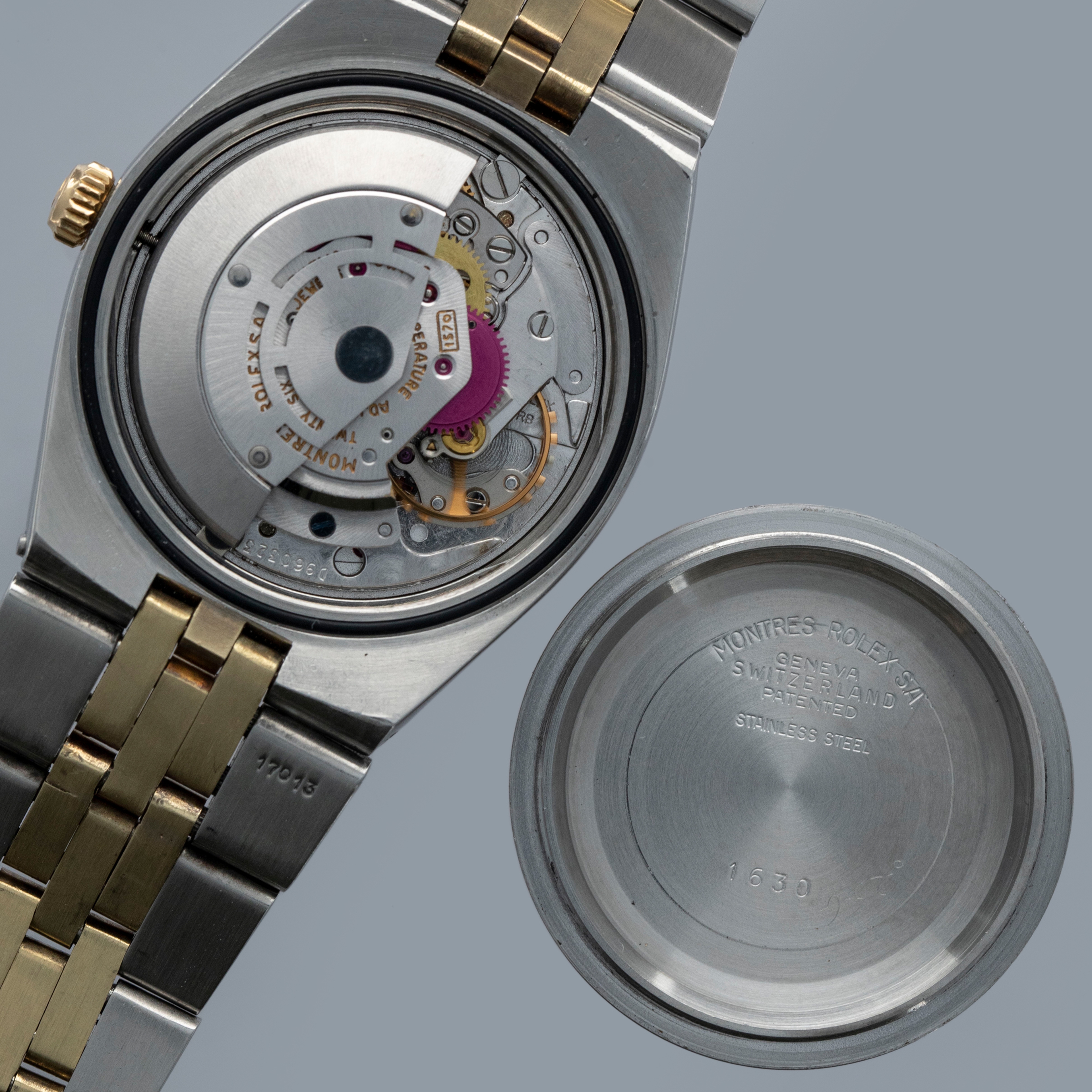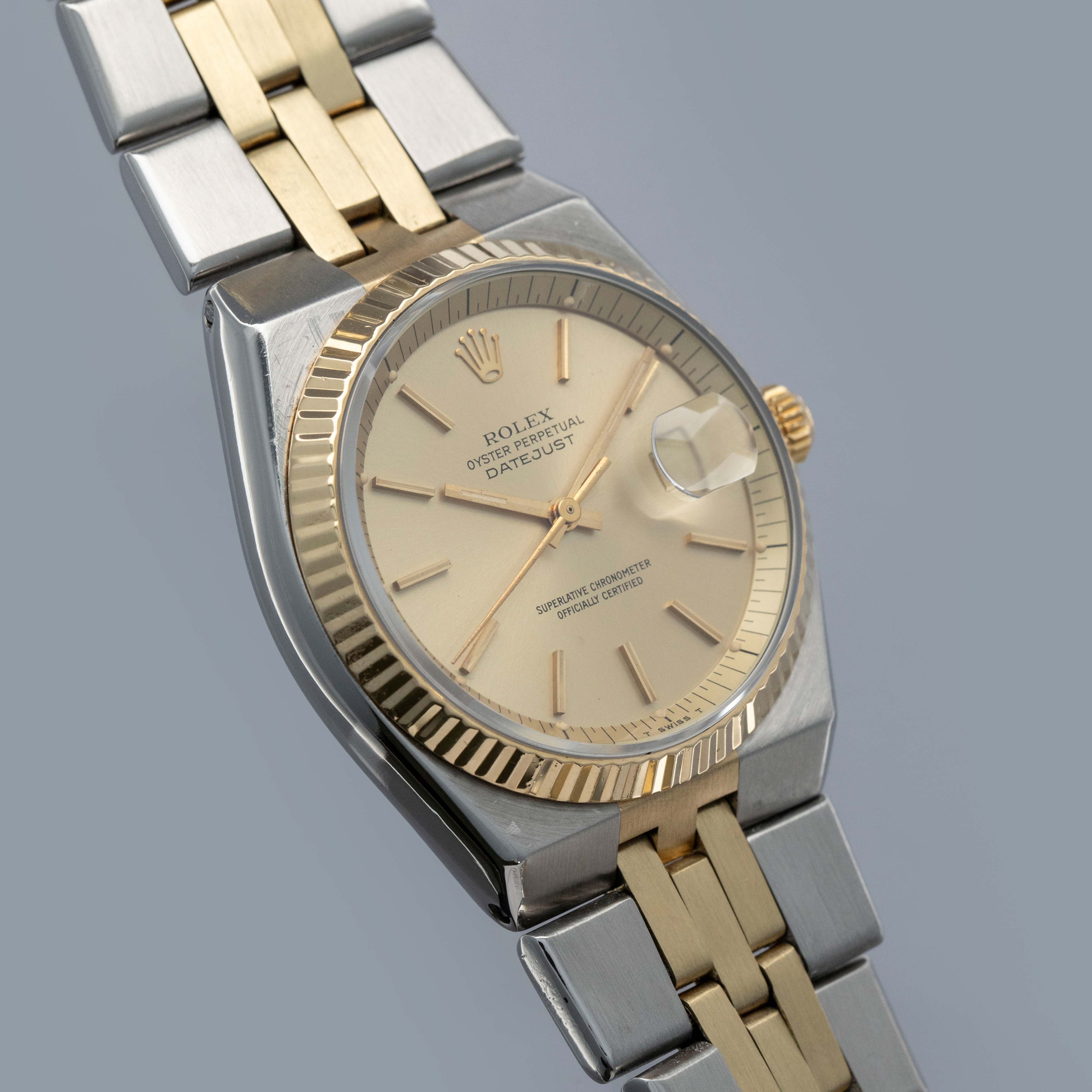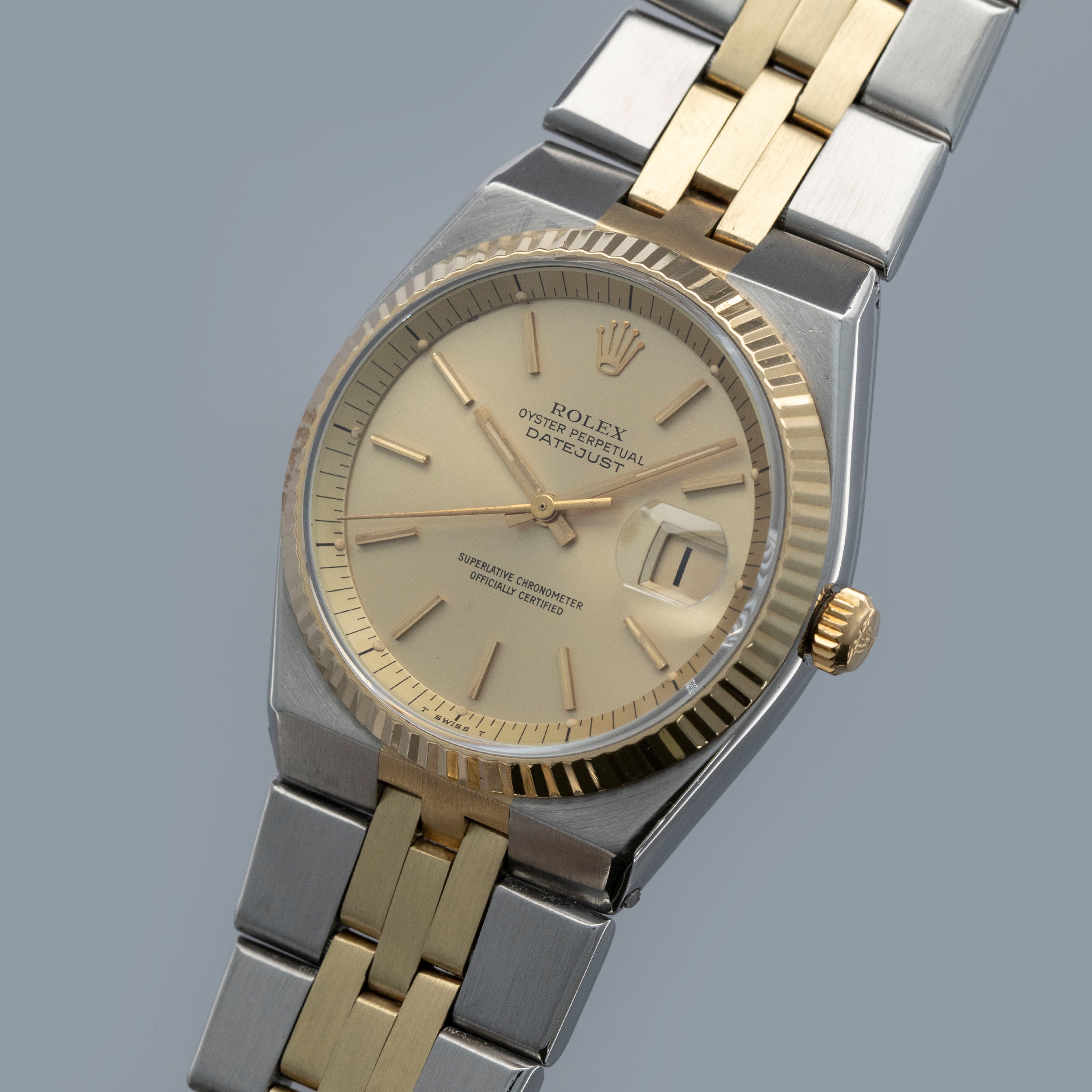 The Rolex Oyster Perpetual Date ref. 1630 stands as a historical timepiece, crafted during Rolex's transition to quartz watches in 1975. Produced alongside its stainless steel sibling, the ref. 1530, the ref. 1630 was discontinued in 1977 just before the the Oysterquartz began production. Boasting the Oysterquartz collection’s angular case, which it was originally designed for, Rolex decided to launch the ref. 1530 and ref. 1630 while they were perfecting their own quartz movement. Besides its angular 36mm two-tone stainless steel and 18kt yellow gold construction, the ref. 1630 houses a sunburst champagne dial with applied index markers and a steep rehaut that includes a minute-scale – a reflection of the construction’s adaptability for the thicker quartz calibre that would soon replace the automatic cal. 1570 movement in the ref. 1530 and ref. 1630. As a part of Rolex's enduring legacy, the Oyster Perpetual Date ref. 1630 symbolizes precision and durability, during a time of genuine uncertainty in the watchmaking industry. A timeless testament to horological excellence, this model remains a distinctive marker in Rolex's unparalleled reputation for precision and durability.