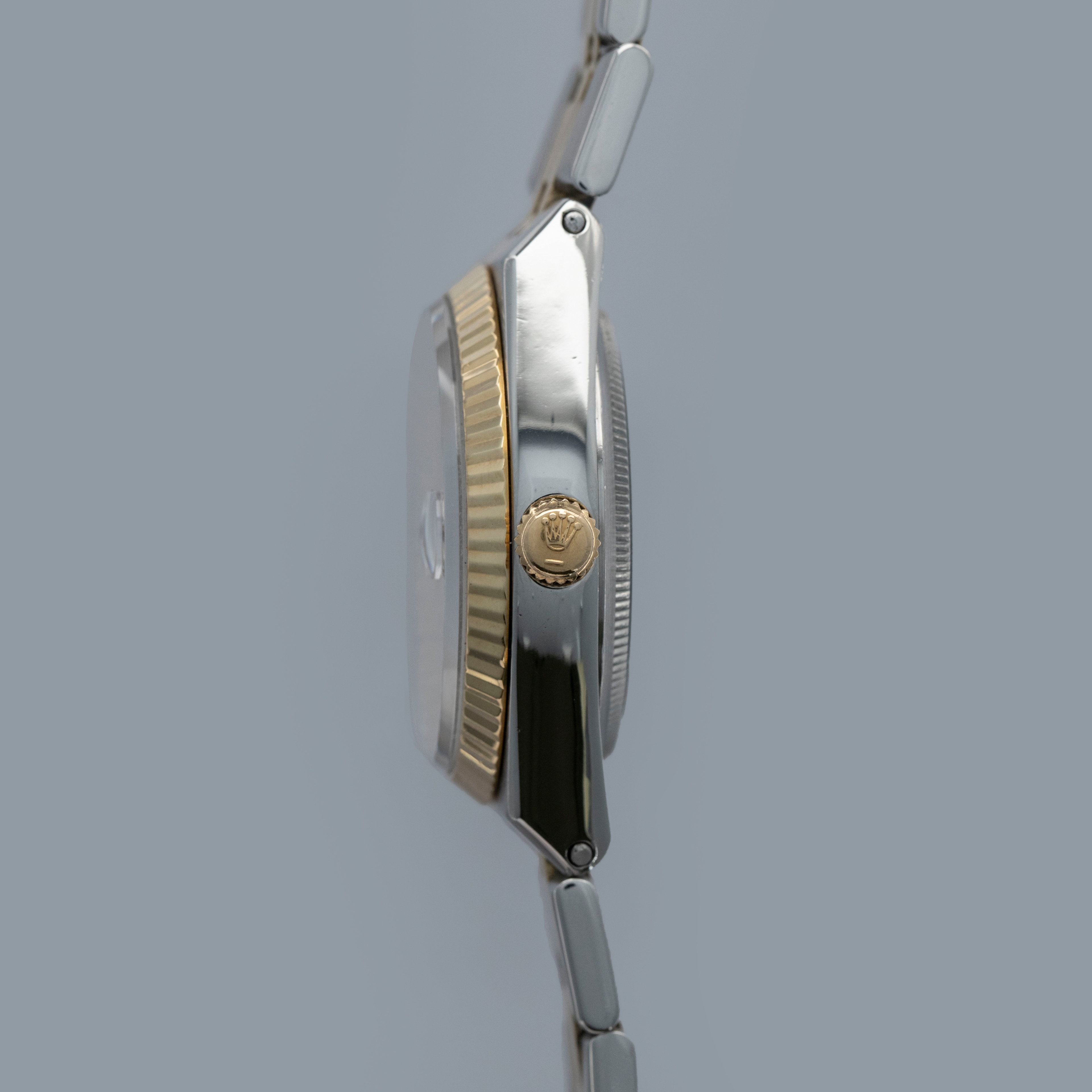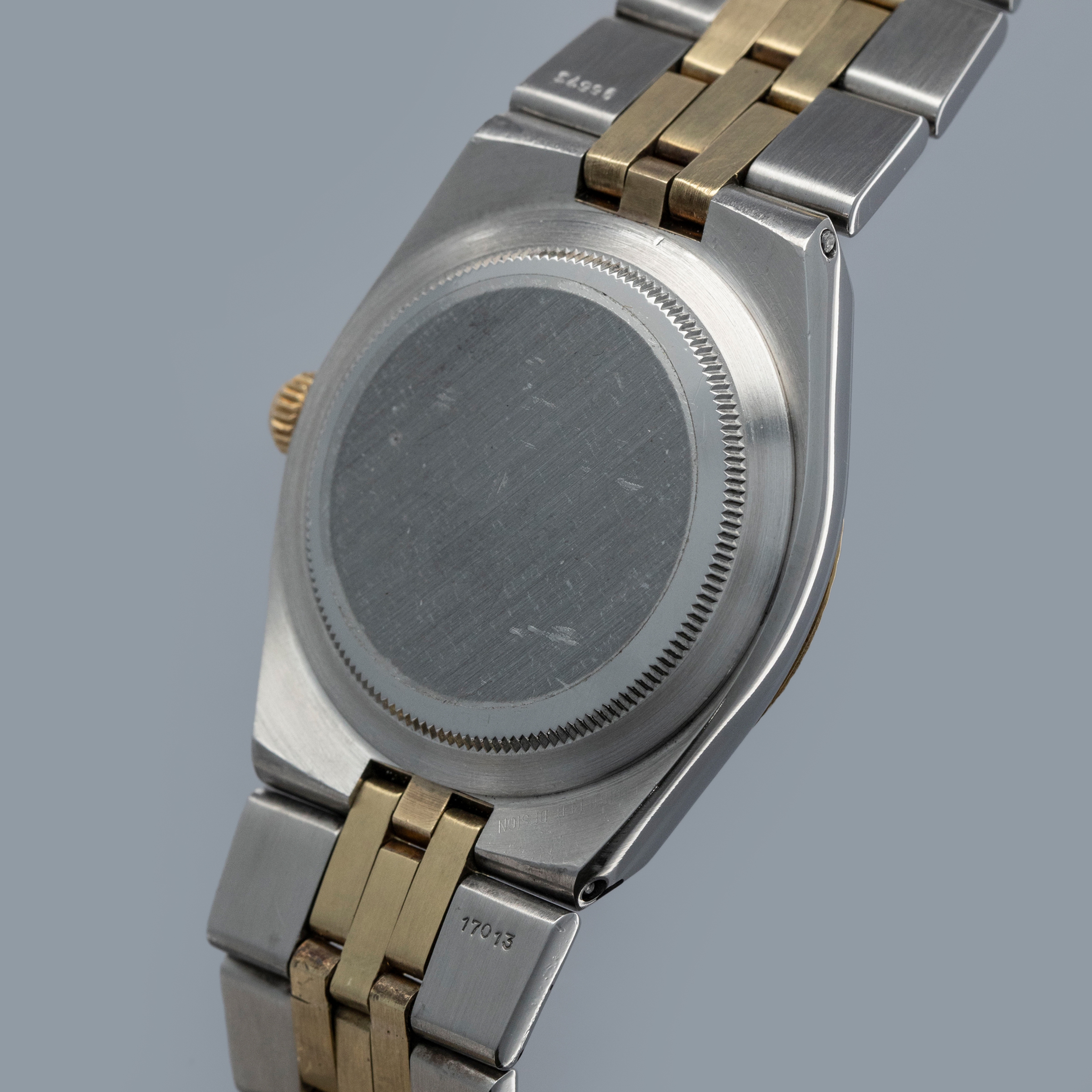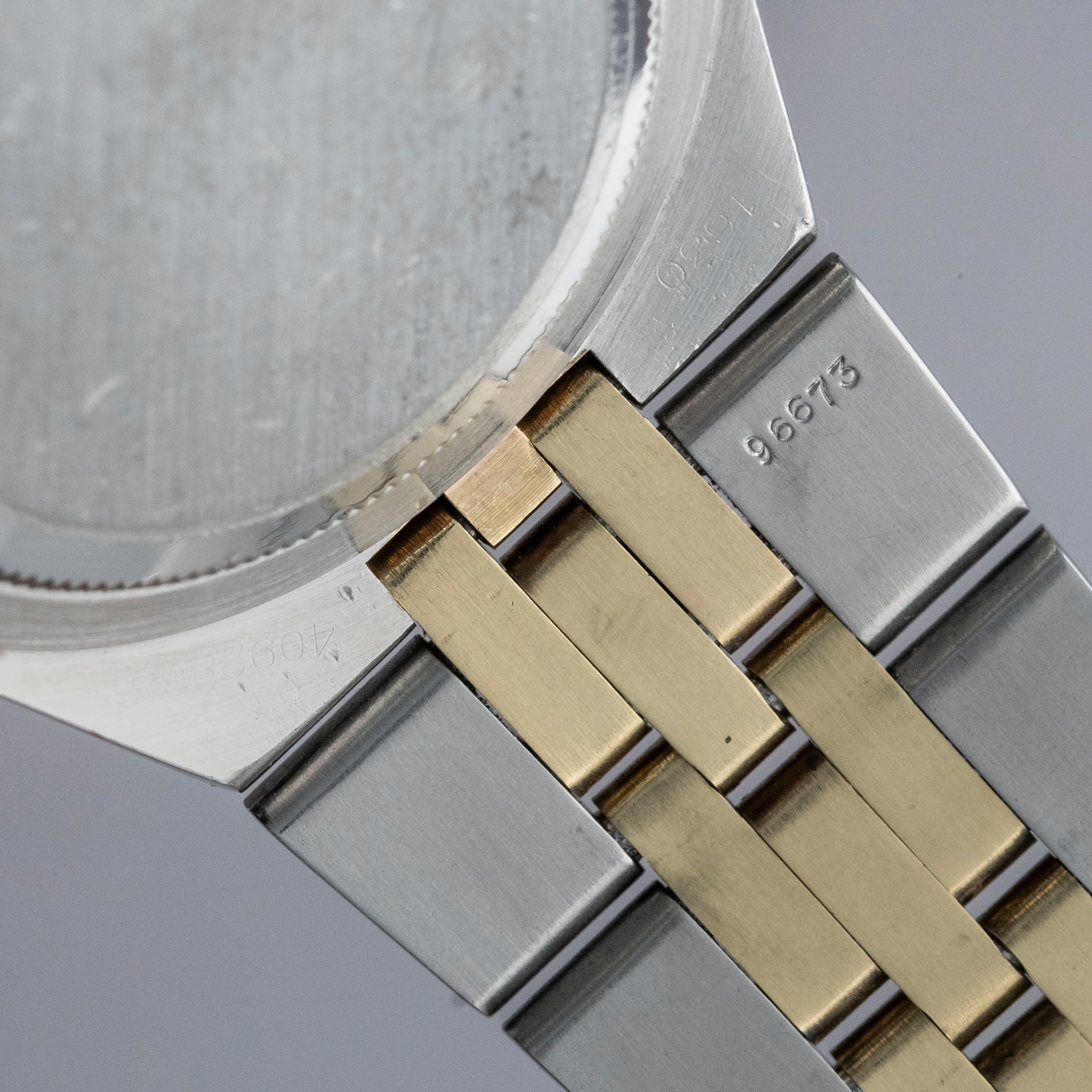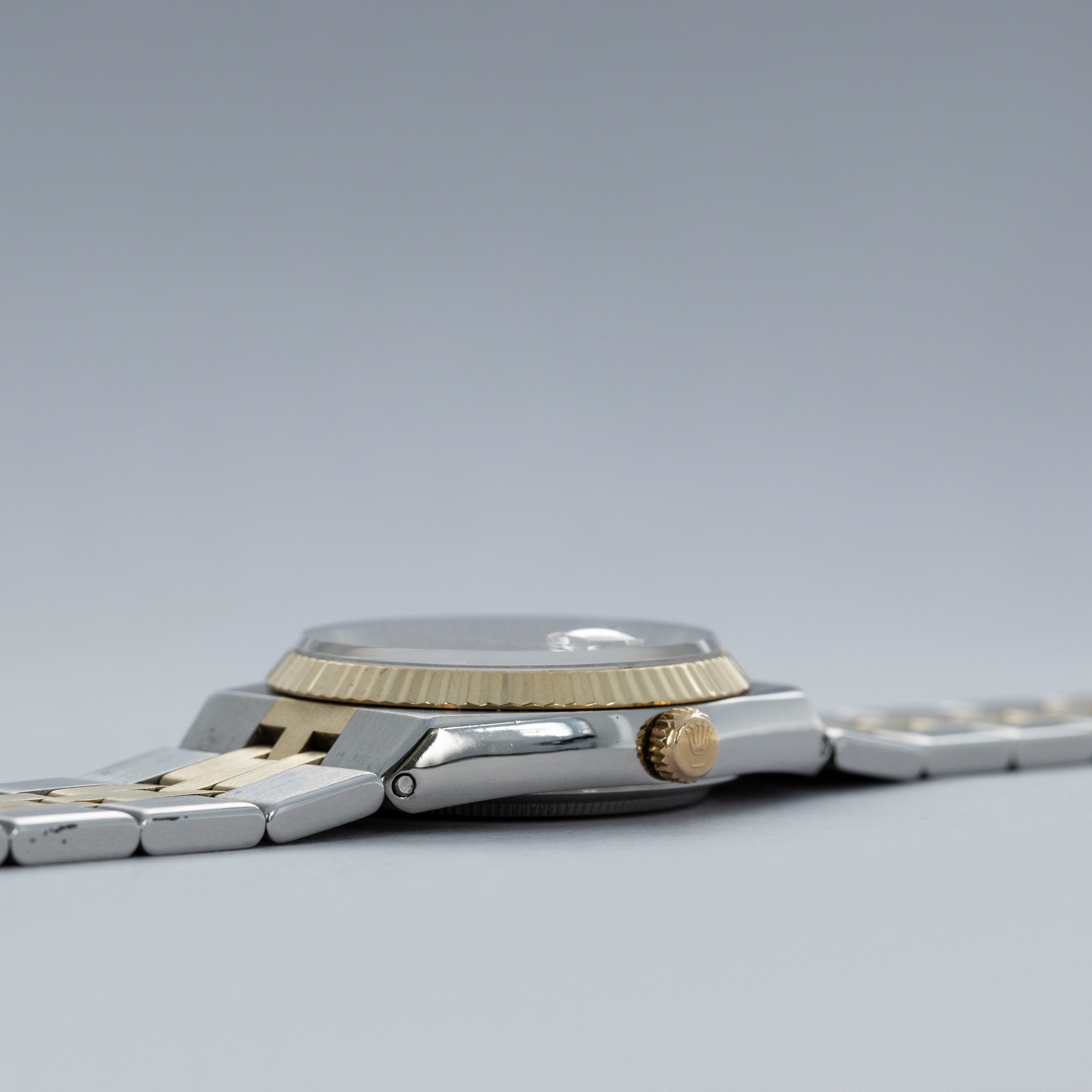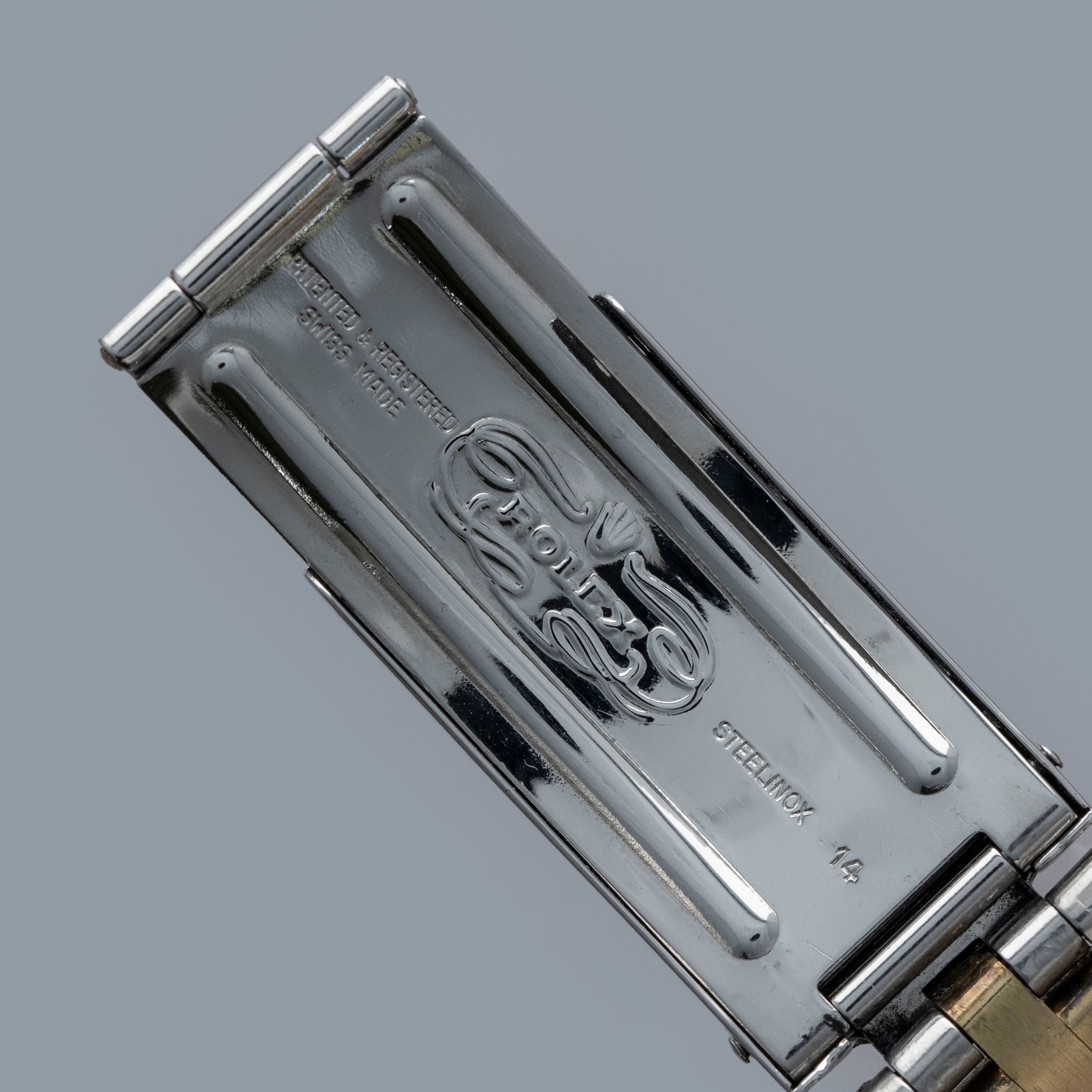 The Rolex Oyster Perpetual Date ref. 1630 stands as a historical timepiece, crafted during Rolex's transition to quartz watches in 1975. Produced alongside its stainless steel sibling, the ref. 1530, the ref. 1630 was discontinued in 1977 just before the the Oysterquartz began production. Boasting the Oysterquartz collection’s angular case, which it was originally designed for, Rolex decided to launch the ref. 1530 and ref. 1630 while they were perfecting their own quartz movement. Besides its angular 36mm two-tone stainless steel and 18kt yellow gold construction, the ref. 1630 houses a sunburst champagne dial with applied index markers and a steep rehaut that includes a minute-scale – a reflection of the construction’s adaptability for the thicker quartz calibre that would soon replace the automatic cal. 1570 movement in the ref. 1530 and ref. 1630. As a part of Rolex's enduring legacy, the Oyster Perpetual Date ref. 1630 symbolizes precision and durability, during a time of genuine uncertainty in the watchmaking industry. A timeless testament to horological excellence, this model remains a distinctive marker in Rolex's unparalleled reputation for precision and durability.