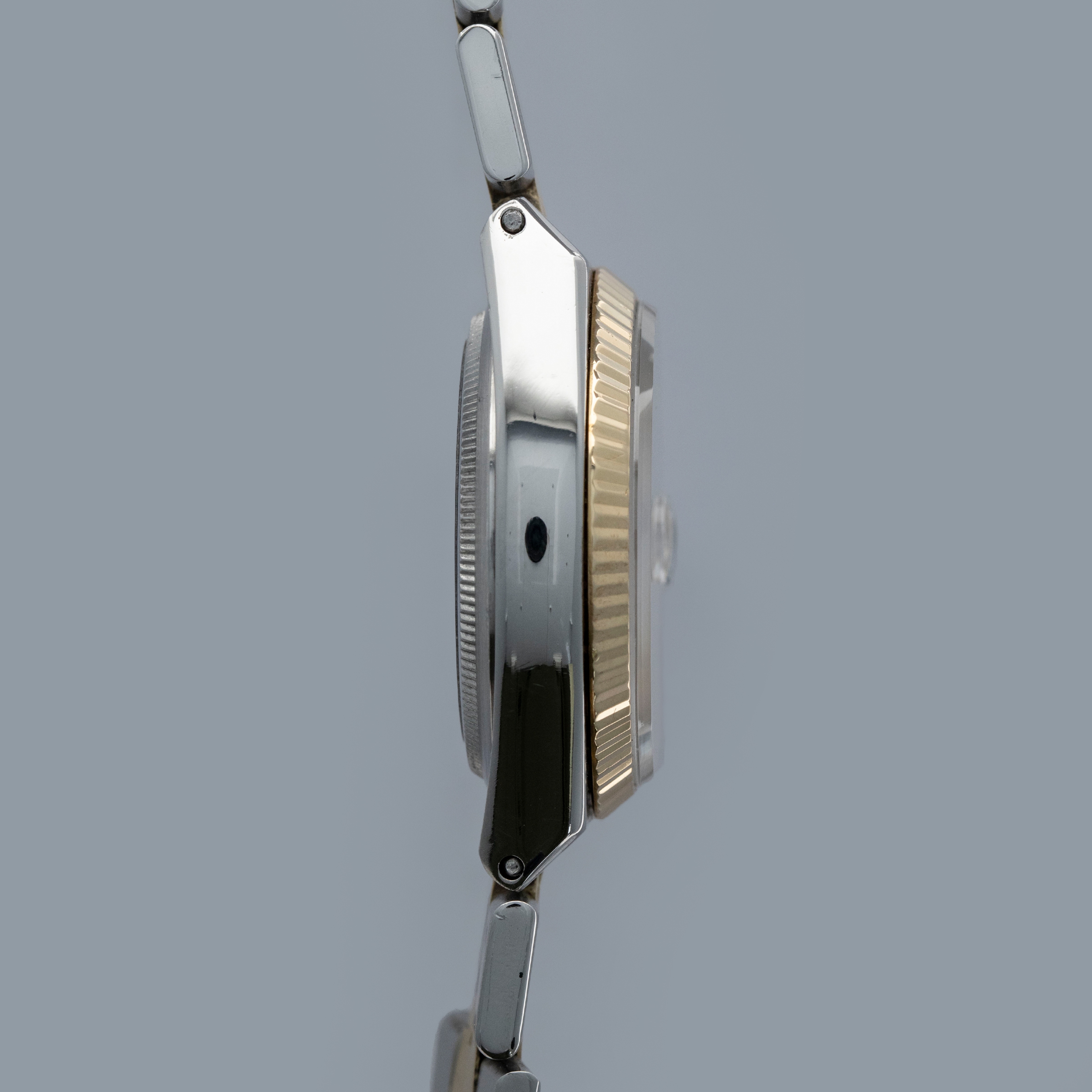 The watch is in overall excellent condition. The stainless steel case shows light scratches and signs of a previous polish, with the engravings on the backs of the lugs still legible. The yellow gold bezel is well defined, with gentle aging visible along the edges and some light marks and tarnishing around nine. The dial is generally excellent, with a small mark between 10 and 11 o’clock, and a minor loss of lume on the chapter ring at nine. The hands show some oxidation. The steel and gold bracelet has surface scratches and light play between the links. The bracelet has 12 links and fits an approximately 7¼” wrist.