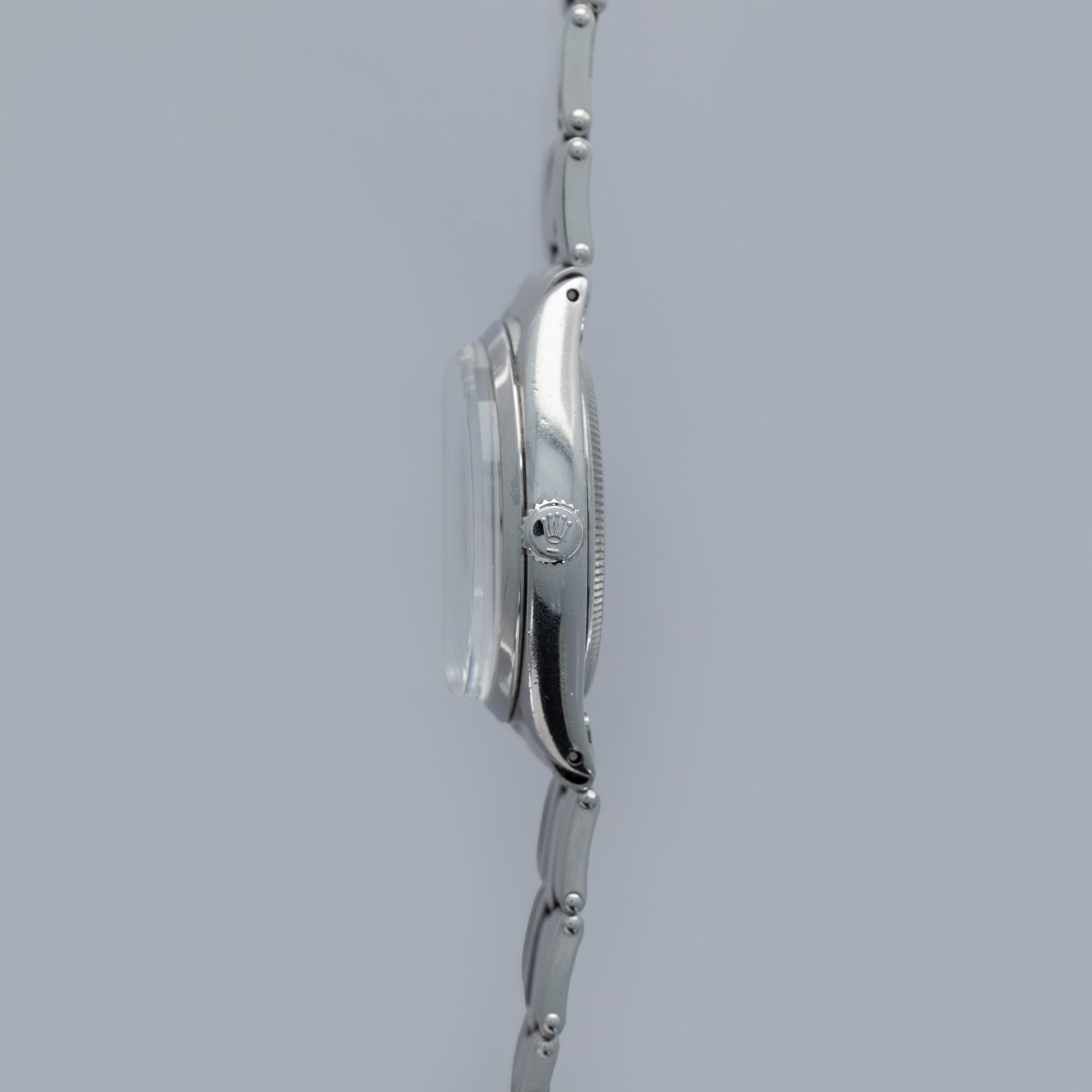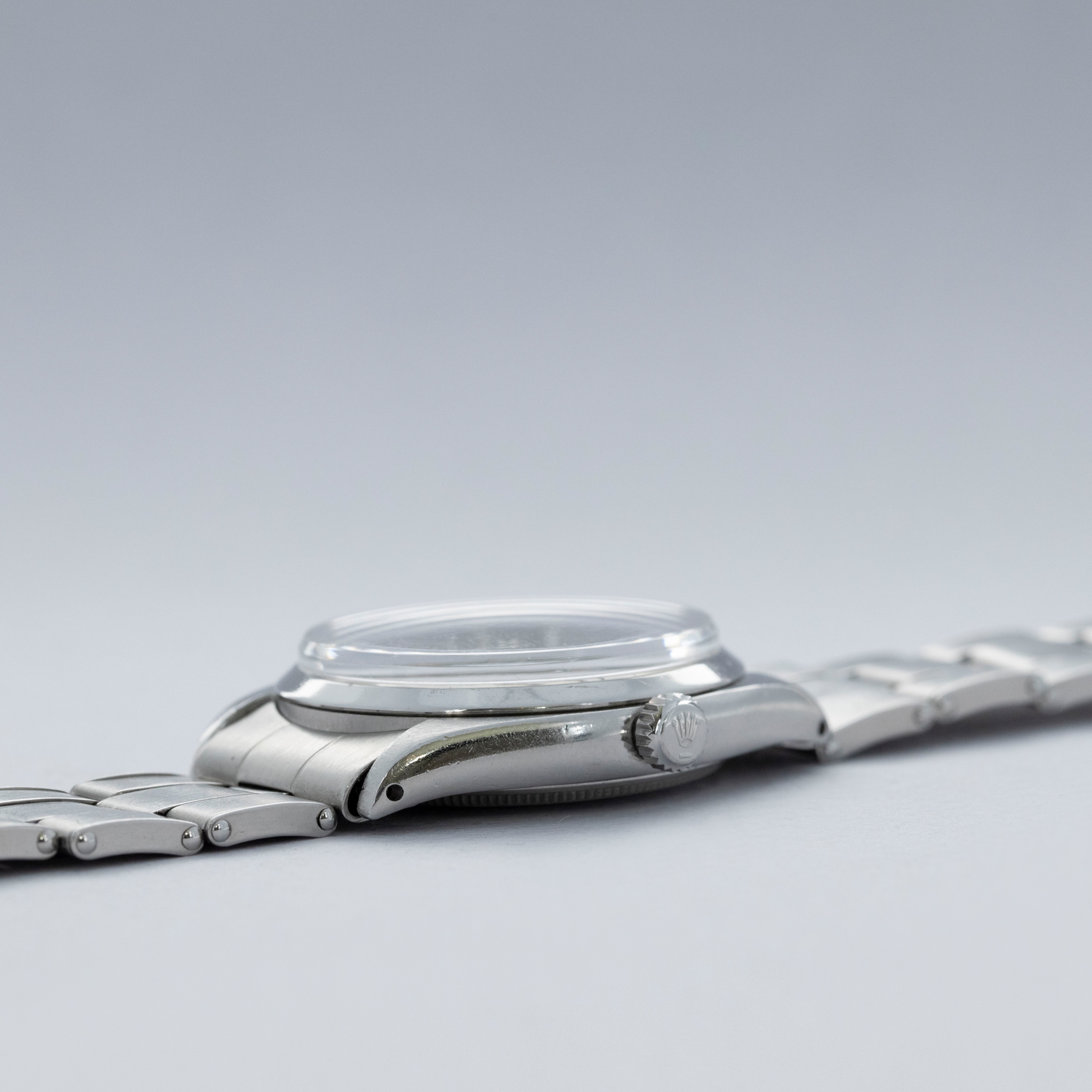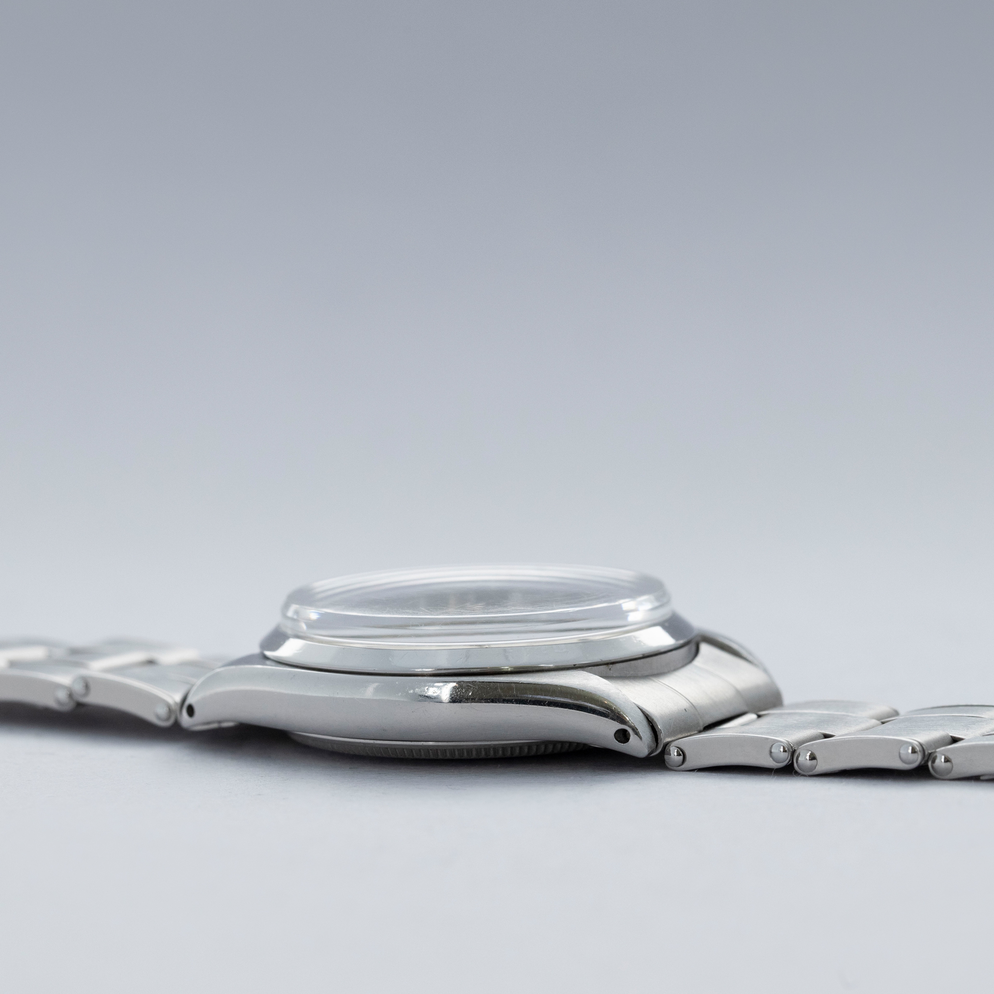 Featuring the Explorer's (and the Air-King's) no-frills construction, the ref. 5500's aesthetic is defined by its flat polished bezel, lack of crown guards, and Rolex's signature Oyster bracelet.