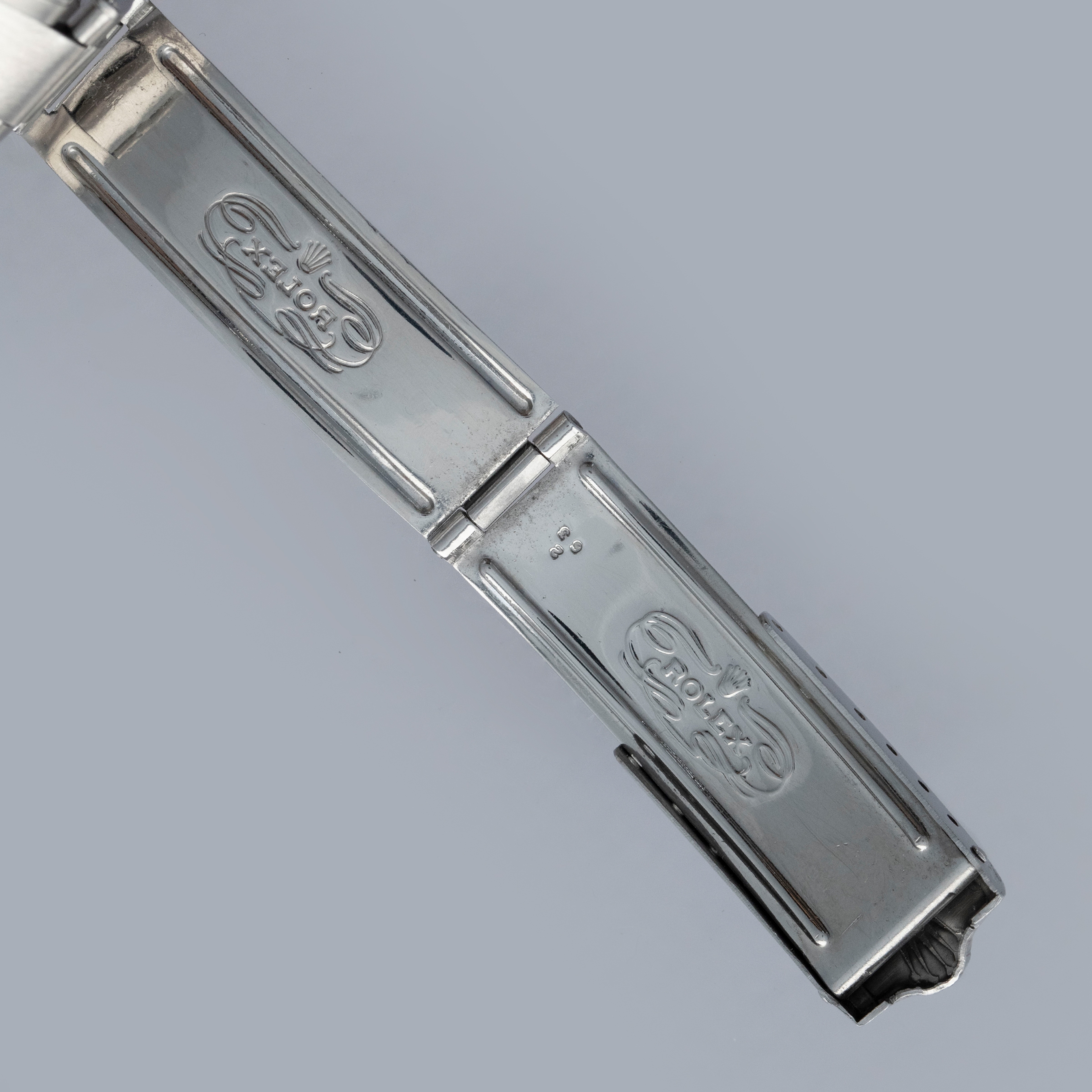 The watch is in overall excellent condition. The steel case and bezel have some light scratches and nicks, commensurate with a watch of this vintage, and the watch has been polished at some point. The lugs remain reasonably symmetrical. The rare two-tone Explorer-signed dial is in excellent condition, with some light surface marks, and the hands show light oxidation. The folded link rivet bracelet is also in excellent condition, with light scratches and some light play between the links and some stretch visible near the clasp. The bracelet currently fits a 6 3/4” wrist, and is fitted with 11 links.