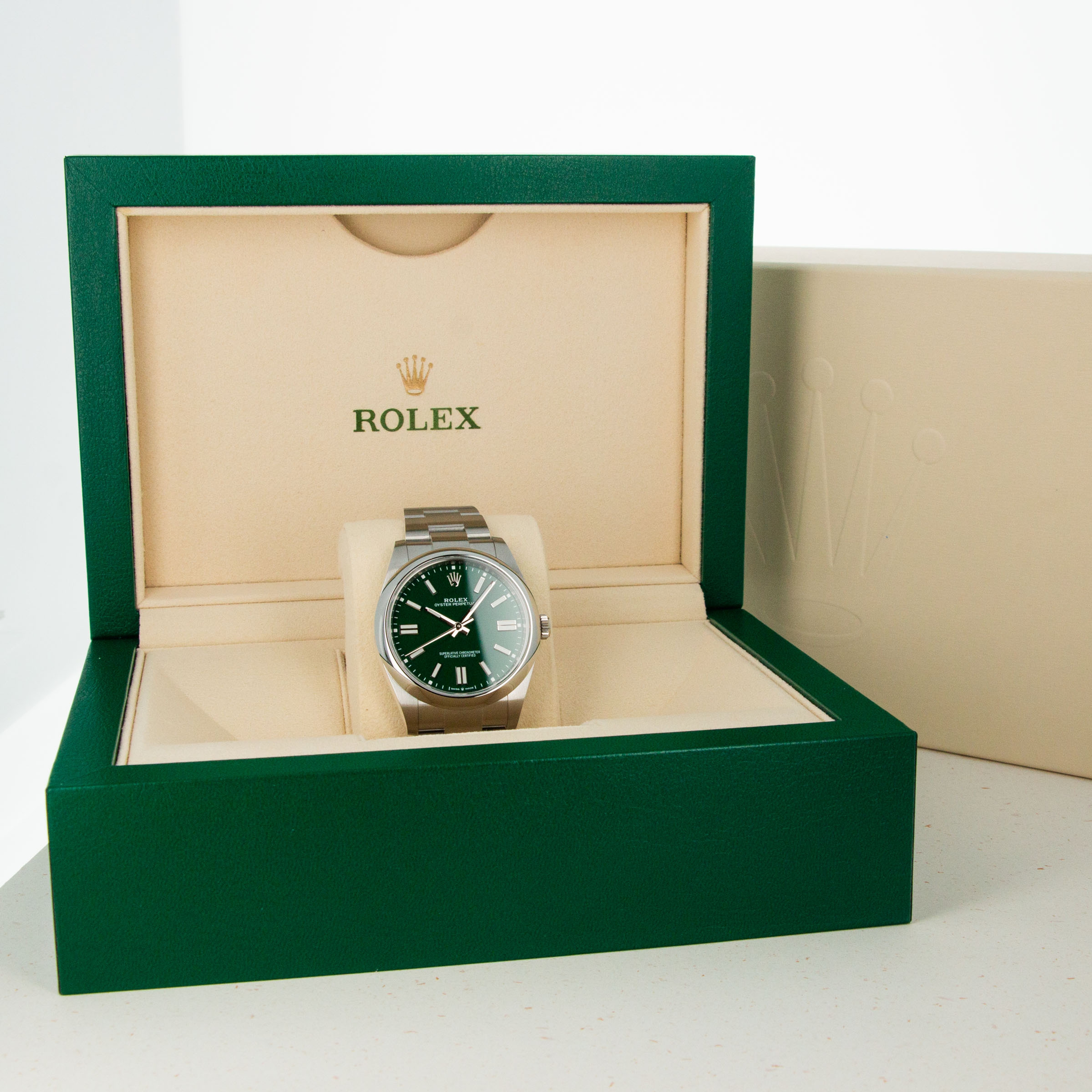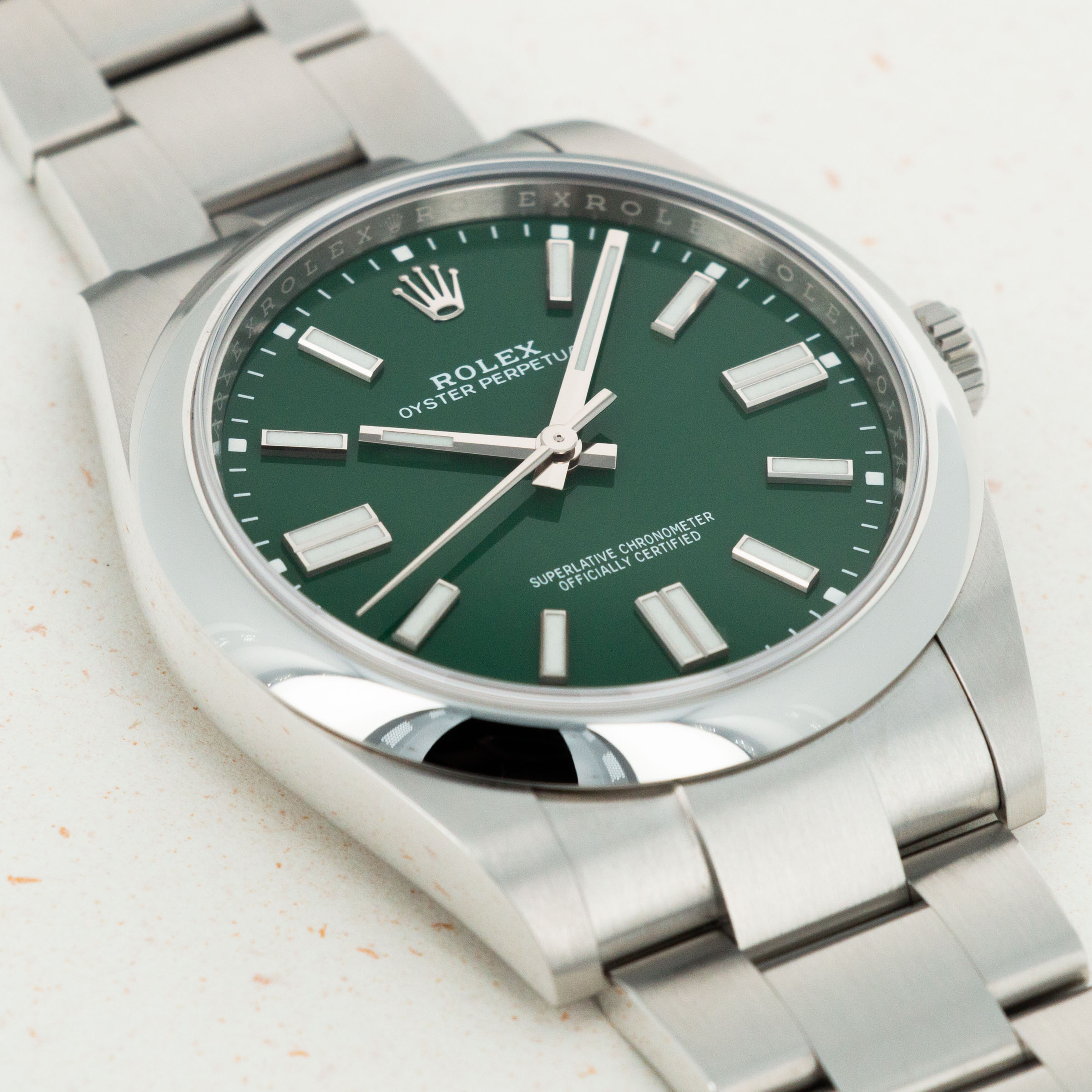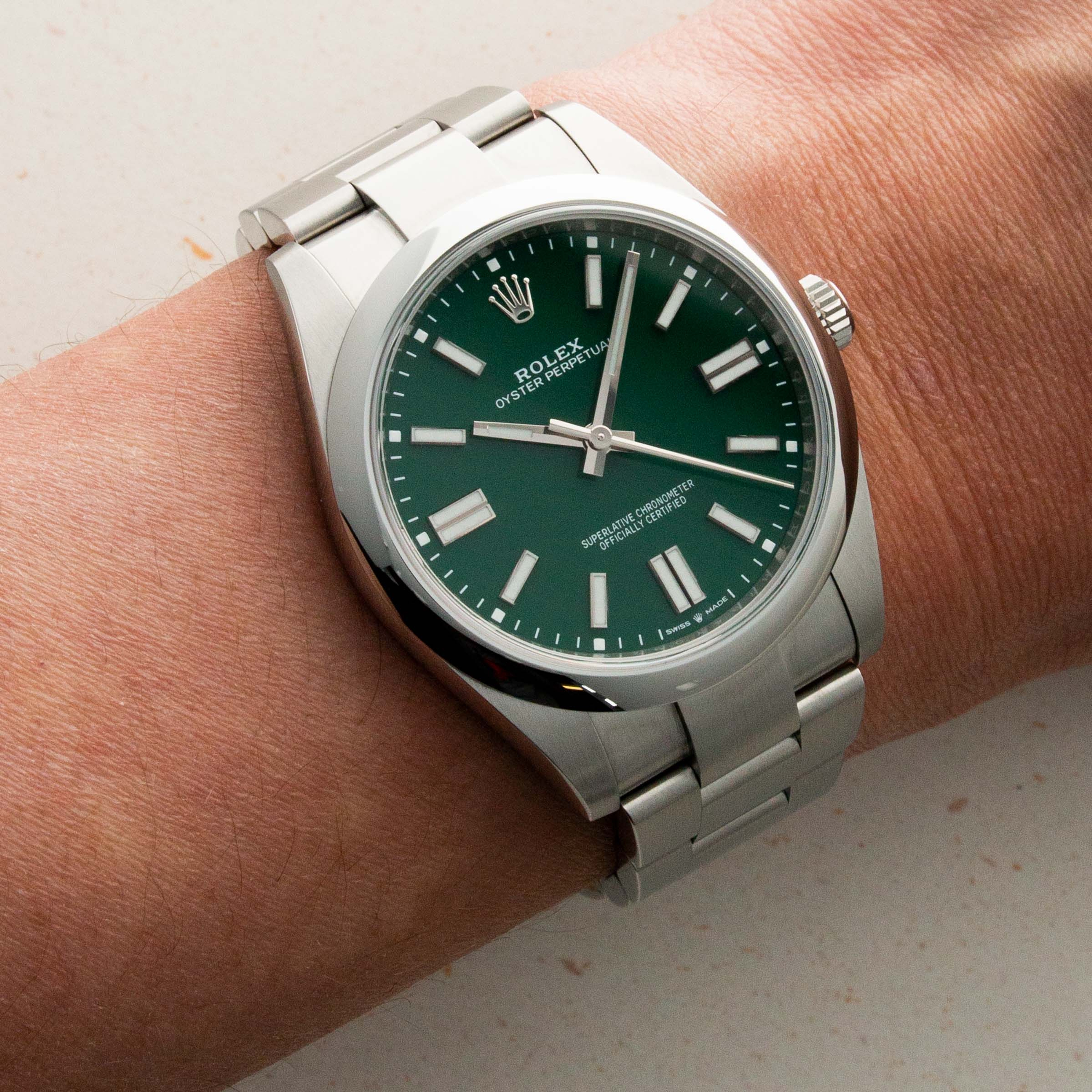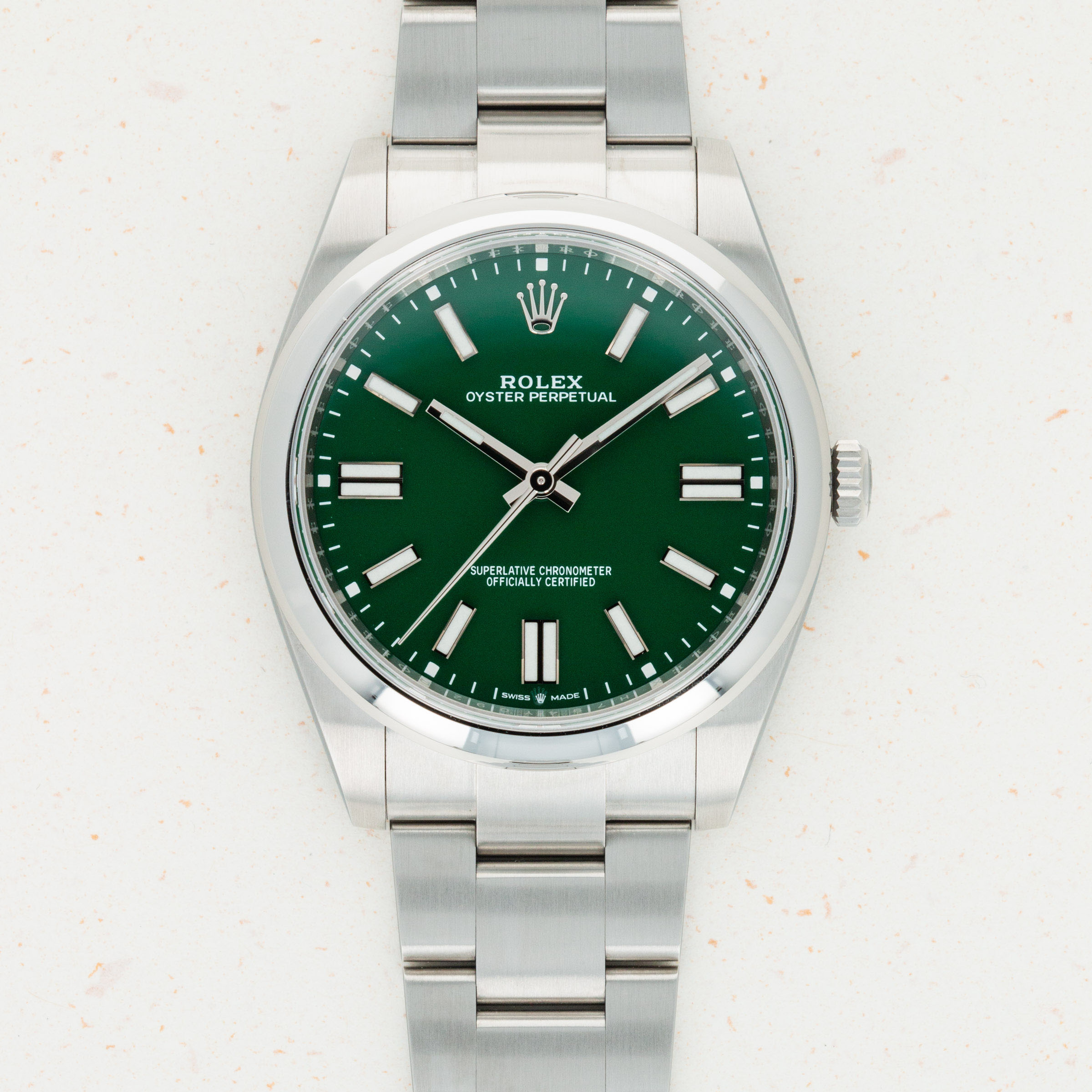 Released in 2020 as Rolex revitalized the entire Oyster Perpetual collection, the new OP41 ref. 124300 features the incredible in-house Rolex cal. 3230 movement within its 41mm entirely satin-brushed stainless steel case. Featuring 70 hours of power reserve with COSC certification and Rolex's own "Superlative Chronometer" certification, this new movement has ensured that the latest Oyster Perpetuals remain accurate to within -2/+2 seconds a day and feature the same level of horological engineering as any other flagship offering from the Genevan brand. Aside from its movement, the Oyster Perpetual was also given an aesthetic overhaul in the form of a range of new and immediately recognizable Stella dial reminiscent dial options. Ranging from turquoise blue to yellow to green to coral red and a selection of other colors, these new vibrant dials fuelled a massive shift in public opinion for the Oyster Perpetual, as it went from a relatively obscure offering to an instant hit overnight.