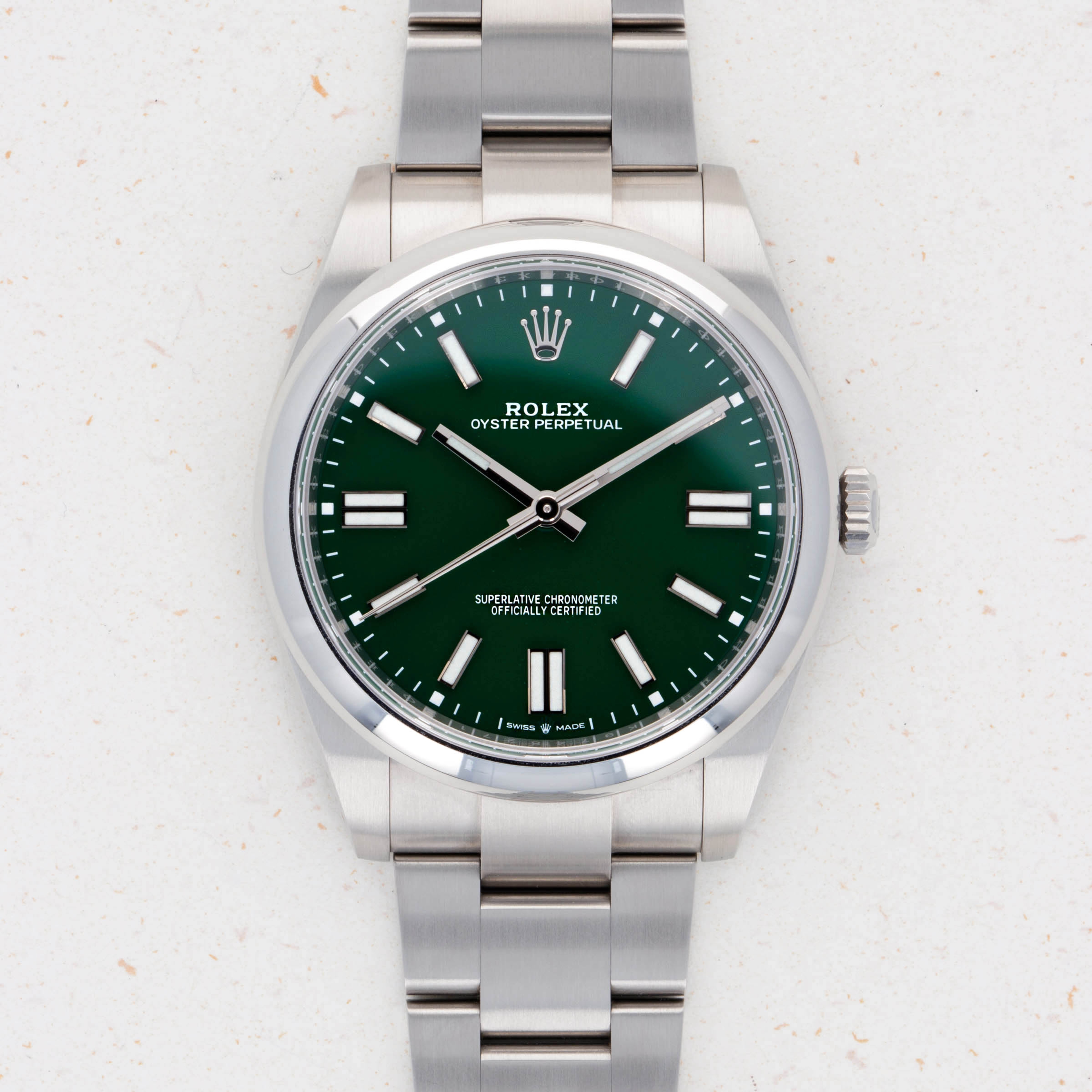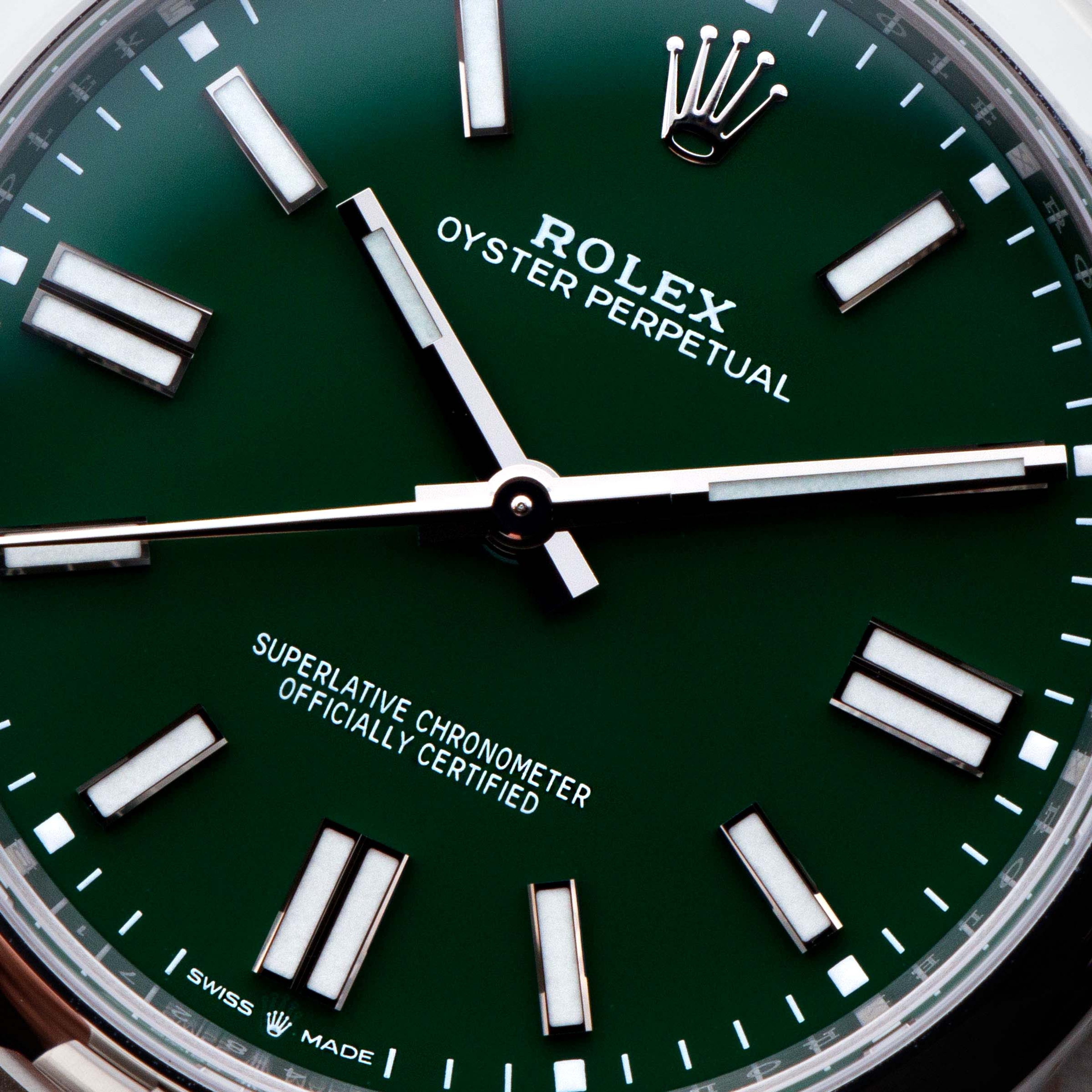 Released in 2020 as Rolex revitalized the entire Oyster Perpetual collection, the new OP41 ref. 124300 features the incredible in-house Rolex cal. 3230 movement within its 41mm entirely satin-brushed stainless steel case. Featuring 70 hours of power reserve with COSC certification and Rolex's own "Superlative Chronometer" certification, this new movement has ensured that the latest Oyster Perpetuals remain accurate to within -2/+2 seconds a day and feature the same level of horological engineering as any other flagship offering from the Genevan brand. Aside from its movement, the Oyster Perpetual was also given an aesthetic overhaul in the form of a range of new and immediately recognizable Stella dial reminiscent dial options. Ranging from turquoise blue to yellow to green to coral red and a selection of other colors, these new vibrant dials fuelled a massive shift in public opinion for the Oyster Perpetual, as it went from a relatively obscure offering to an instant hit overnight.