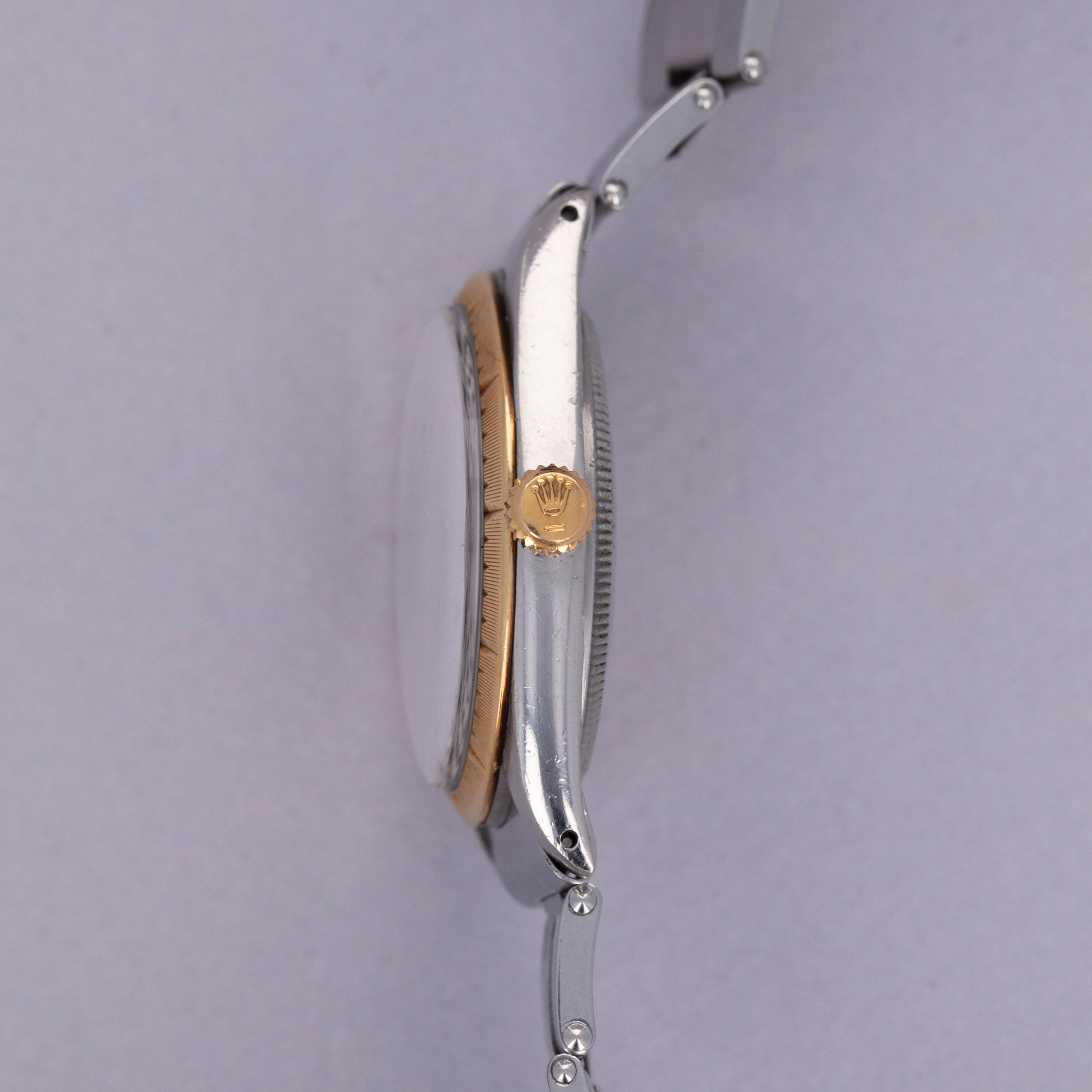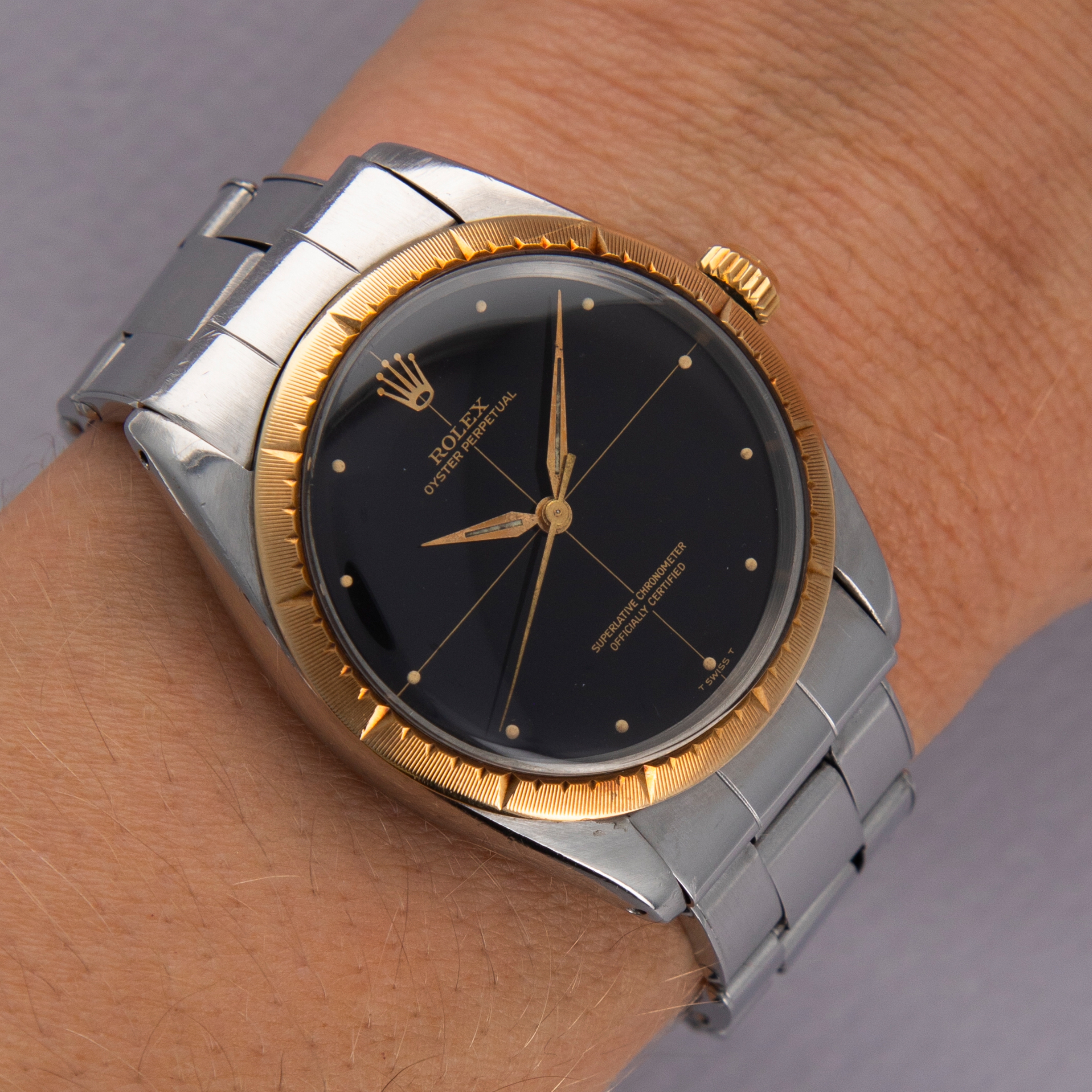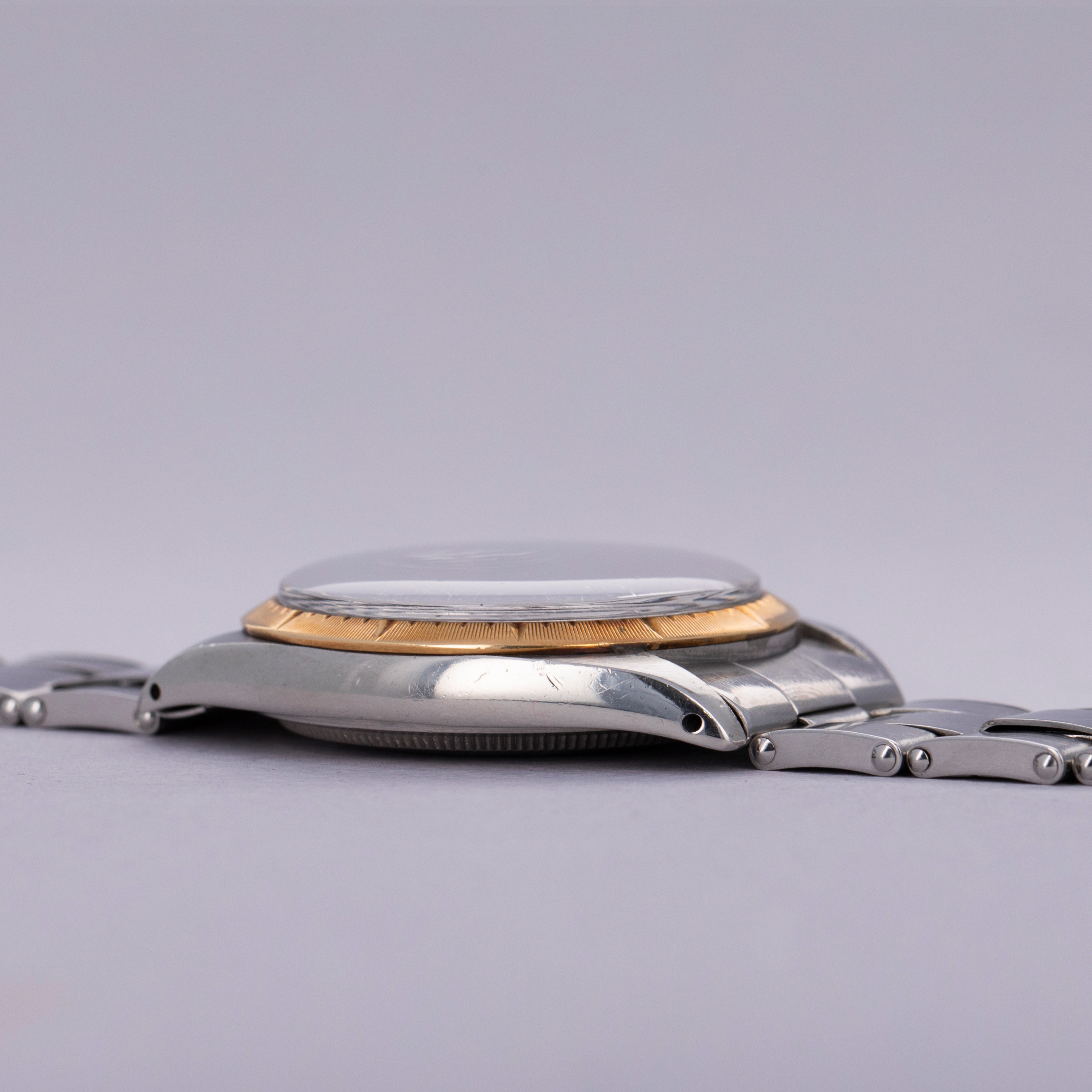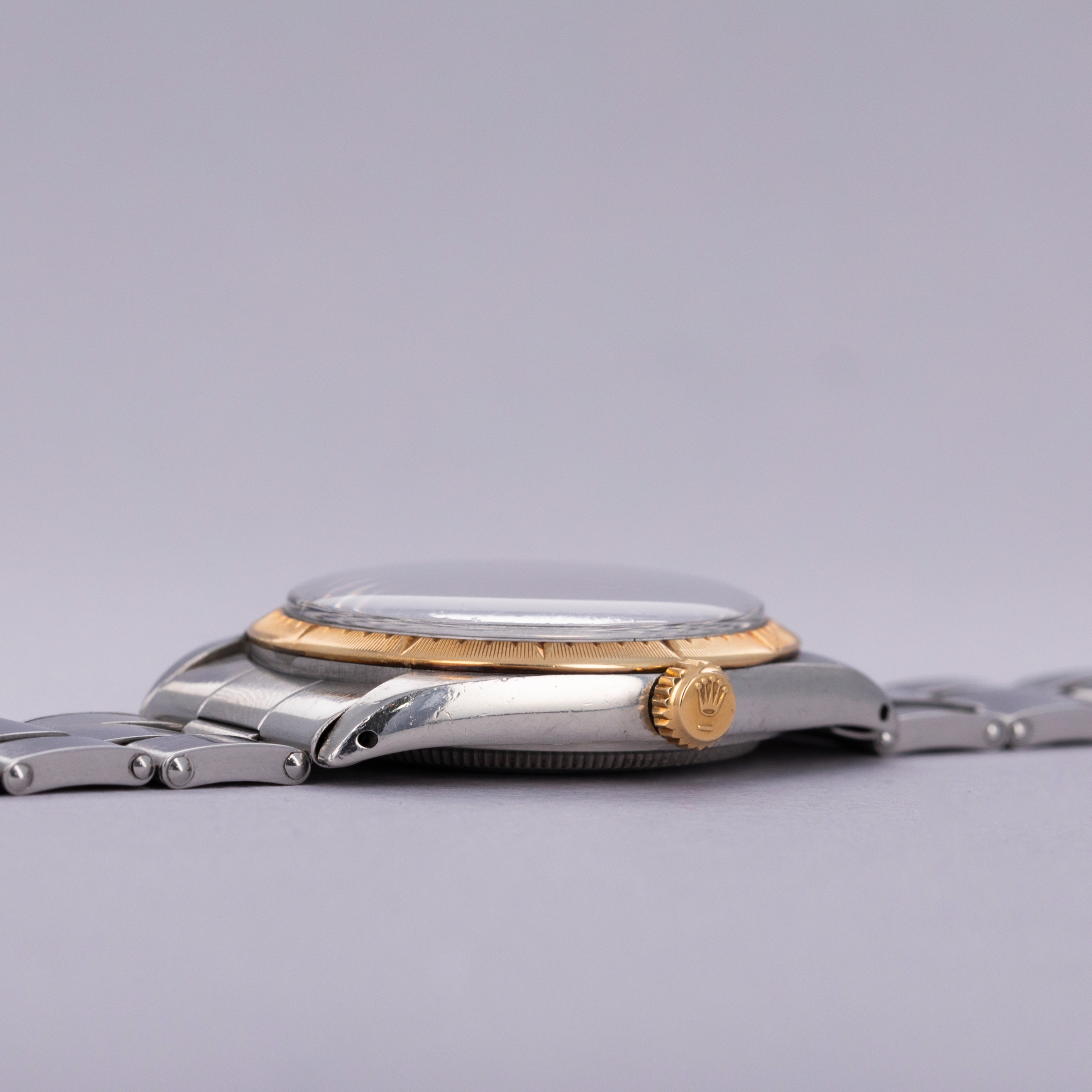 Pairing with a stainless steel Oyster bracelet, this two-tone ref. 1008's aesthetic is slightly dressed down on the wrist compared to how it would normally look, thanks to its steel center links. Still, its 18kt yellow gold bezel and crown still pack a luxurious punch.