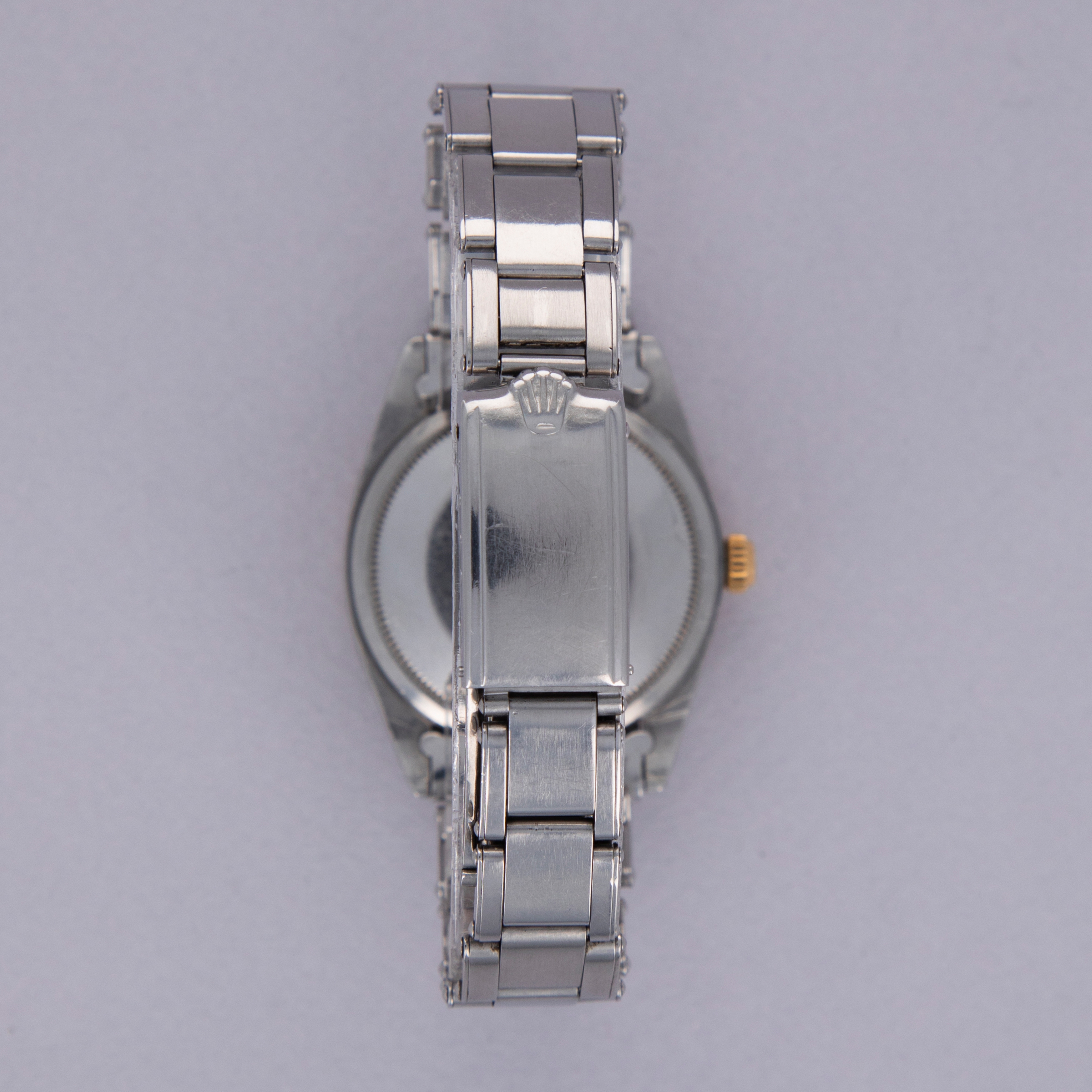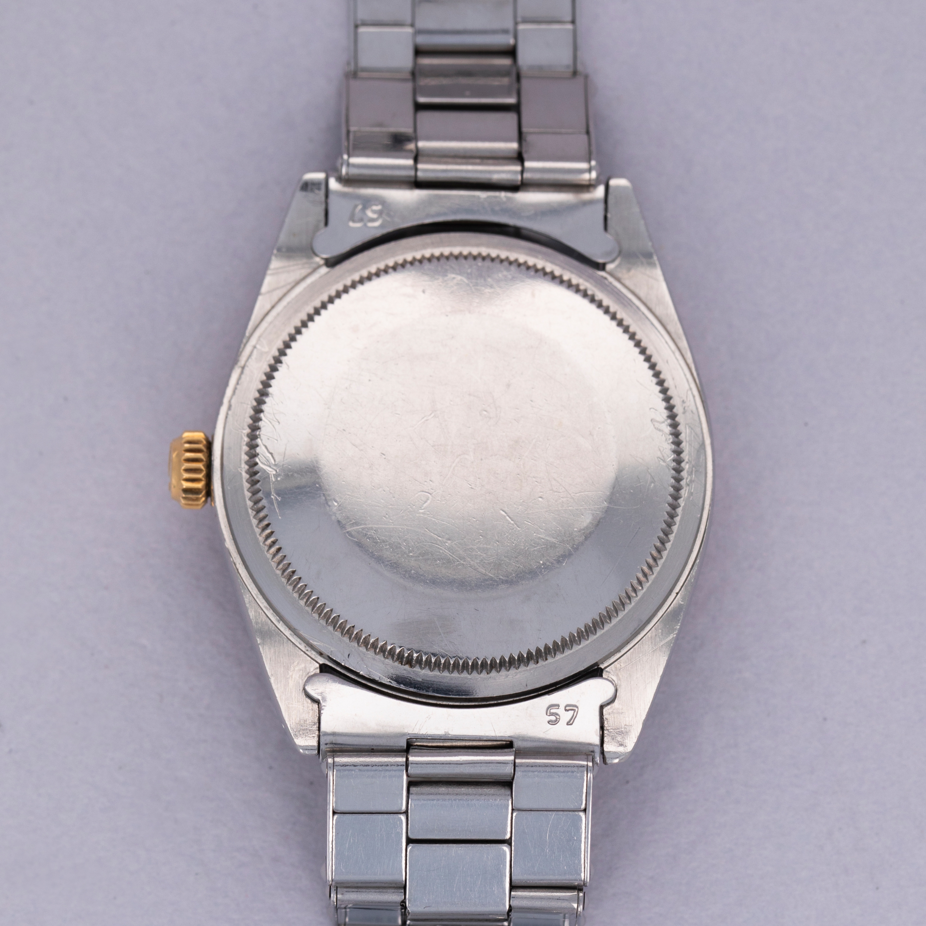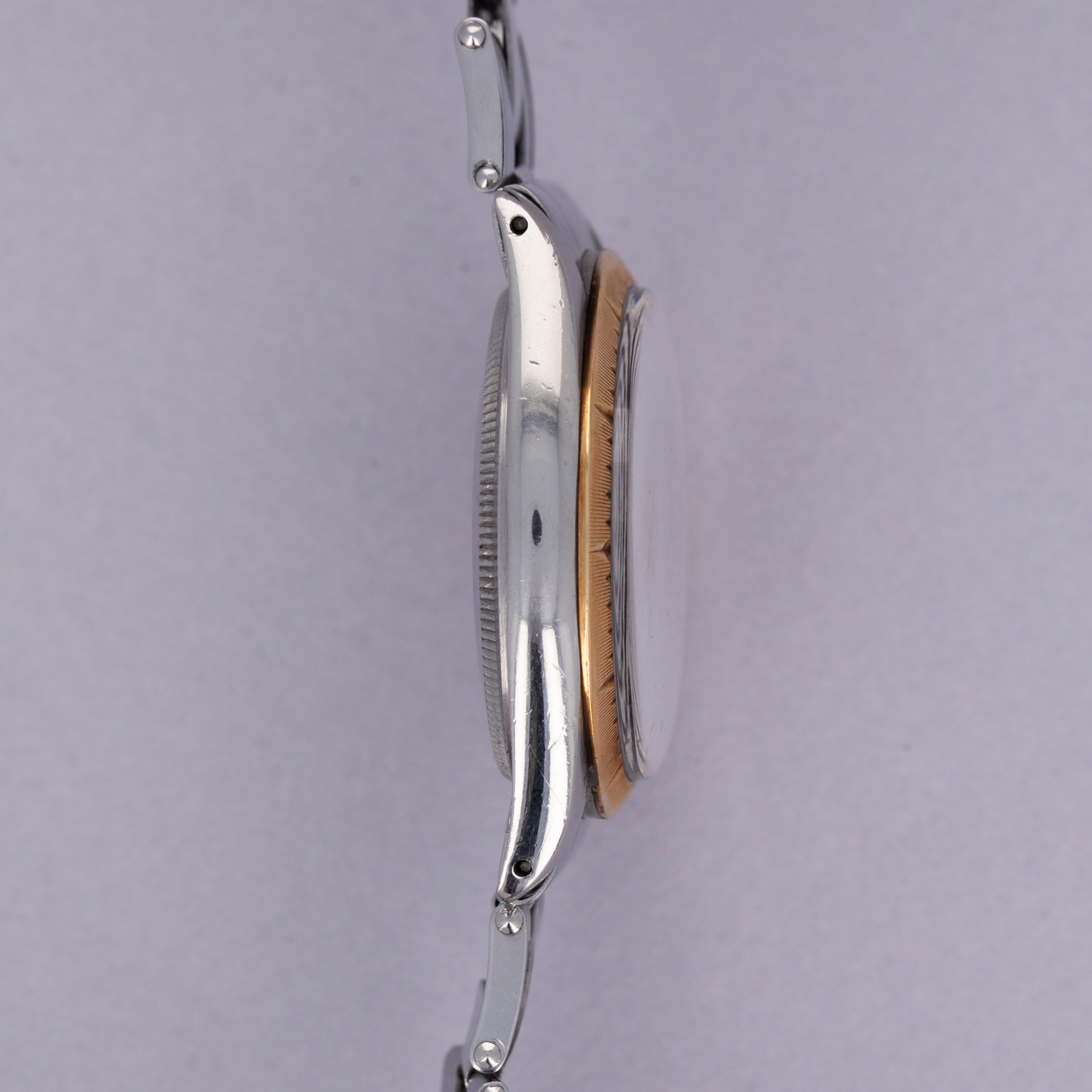 Pairing with a stainless steel Oyster bracelet, this two-tone ref. 1008's aesthetic is slightly dressed down on the wrist compared to how it would normally look, thanks to its steel center links. Still, its 18kt yellow gold bezel and crown still pack a luxurious punch.