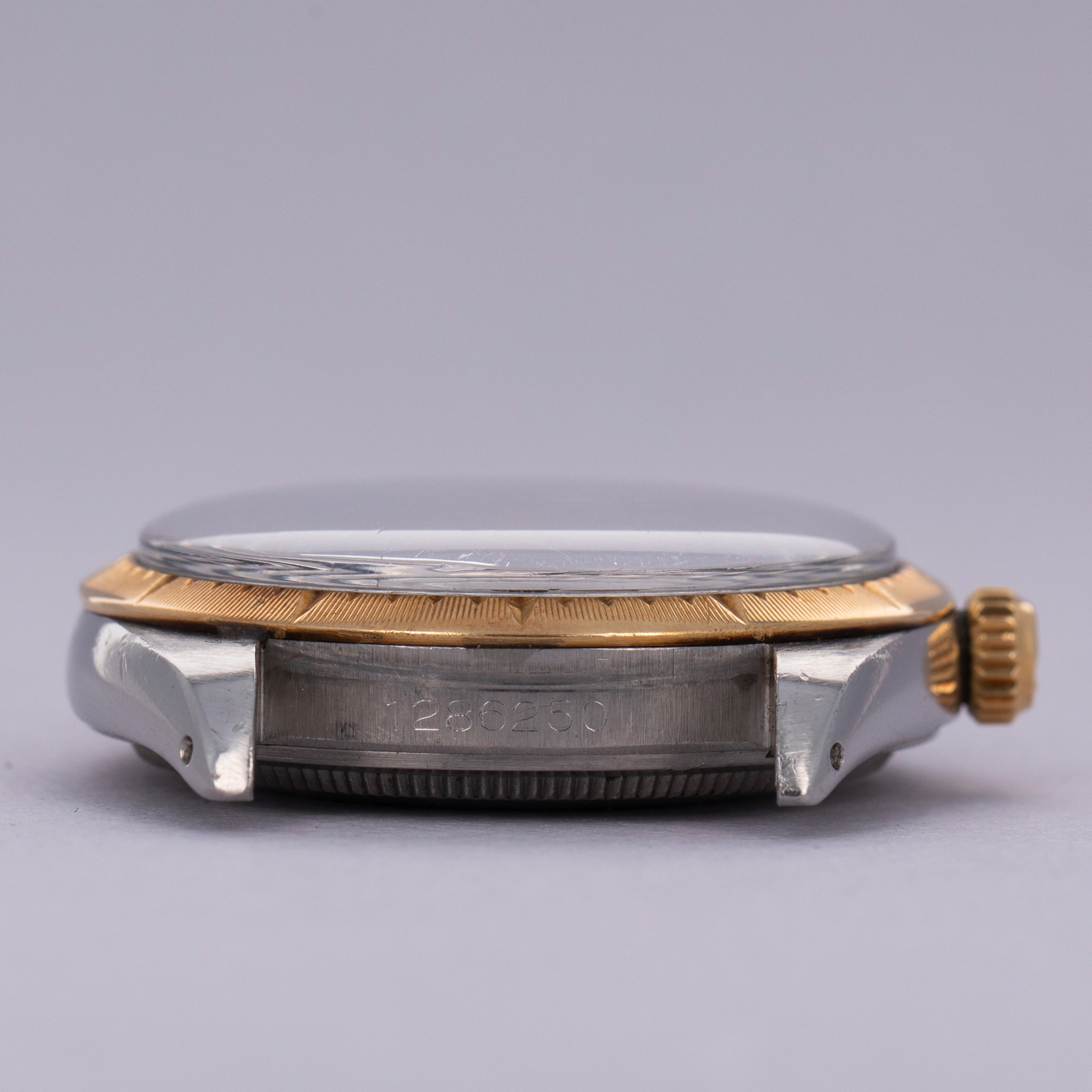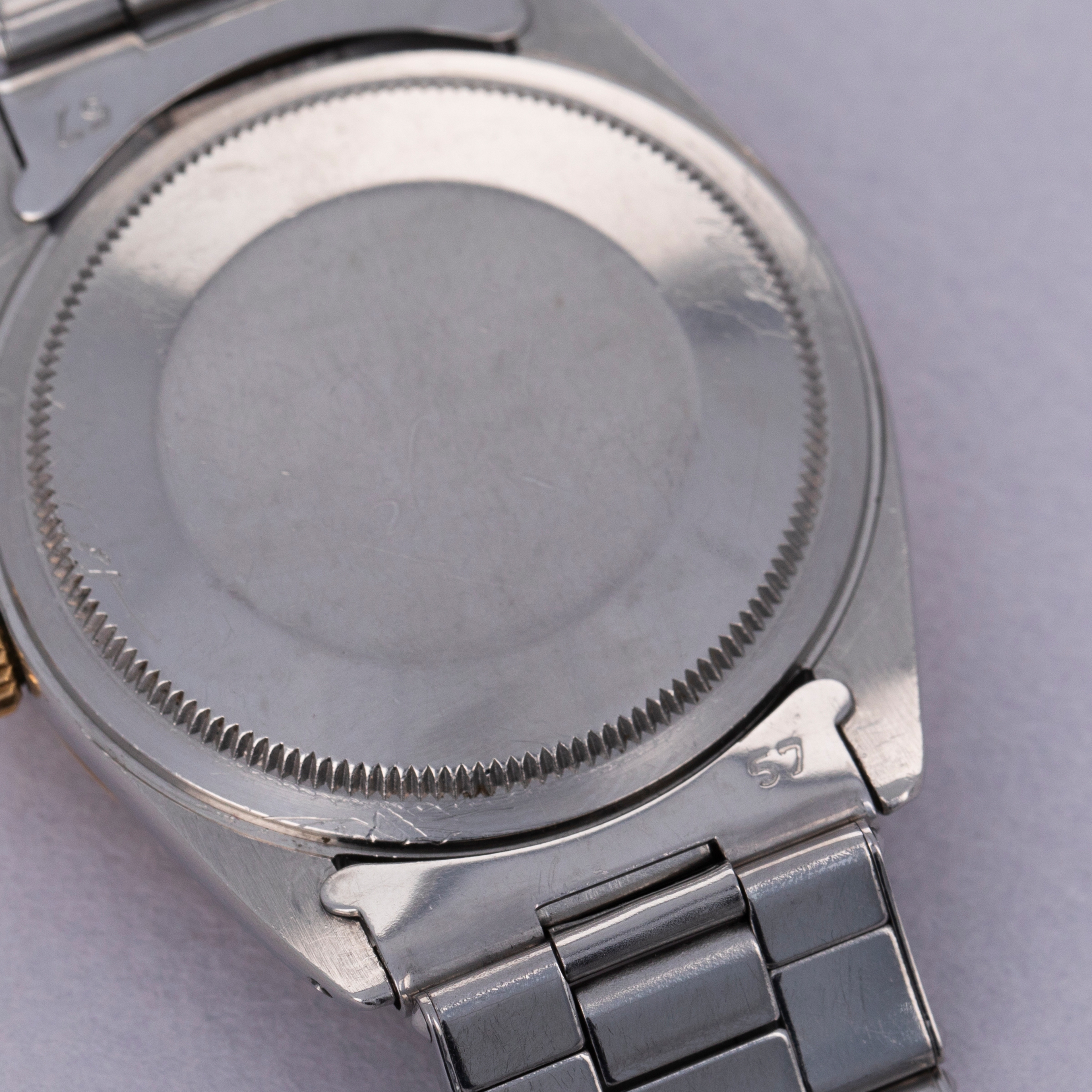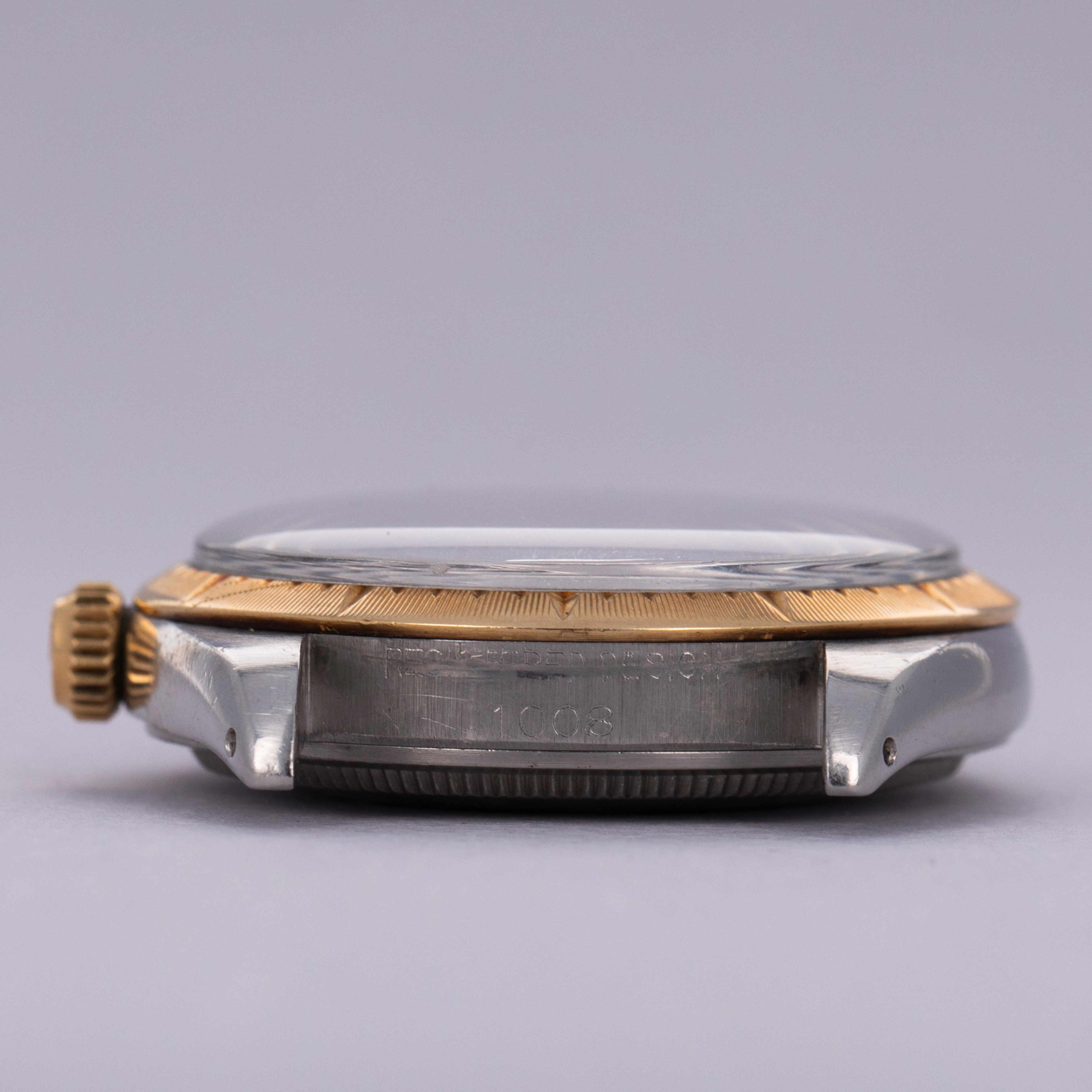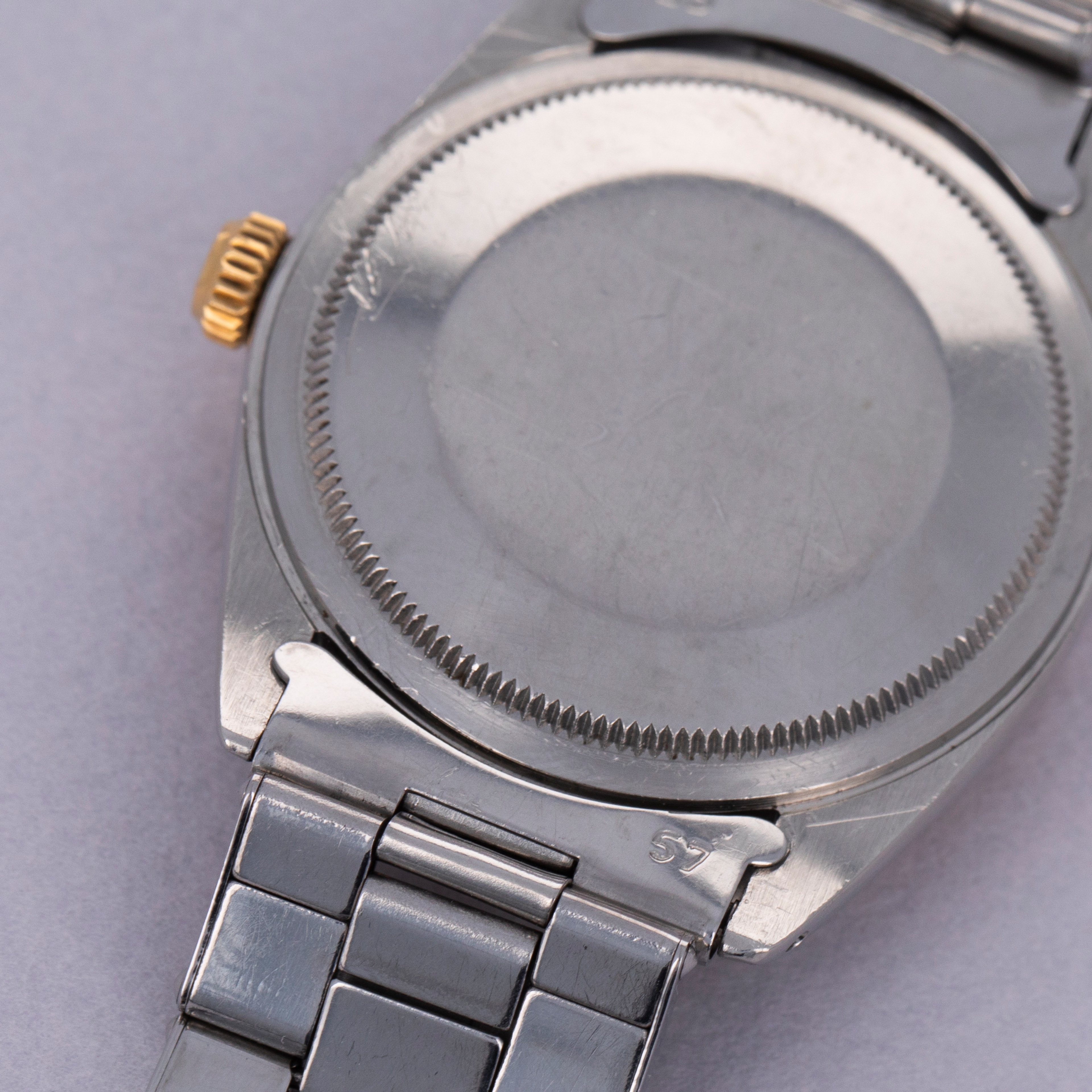 Pairing with a stainless steel Oyster bracelet, this two-tone ref. 1008's aesthetic is slightly dressed down on the wrist compared to how it would normally look, thanks to its steel center links. Still, its 18kt yellow gold bezel and crown still pack a luxurious punch.
