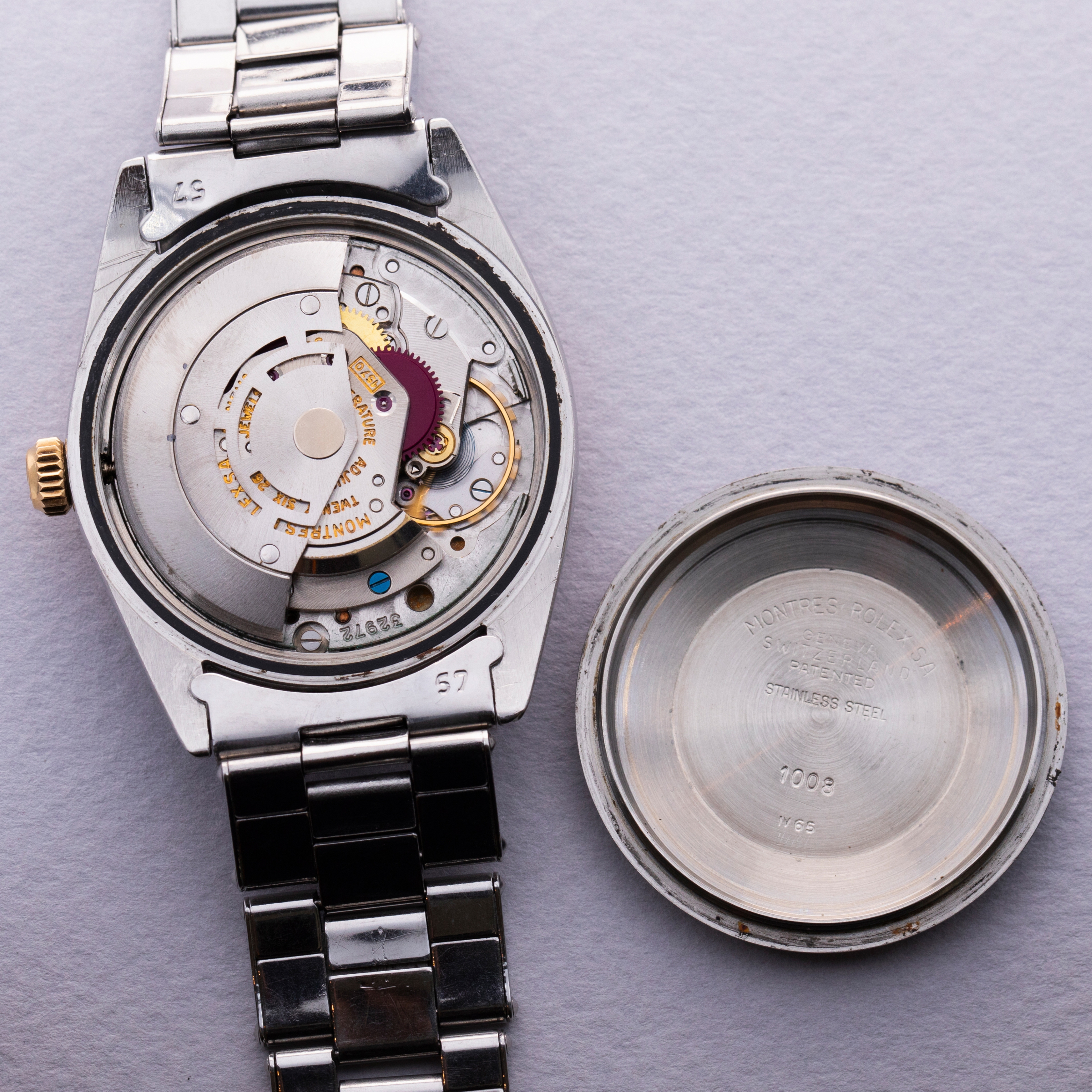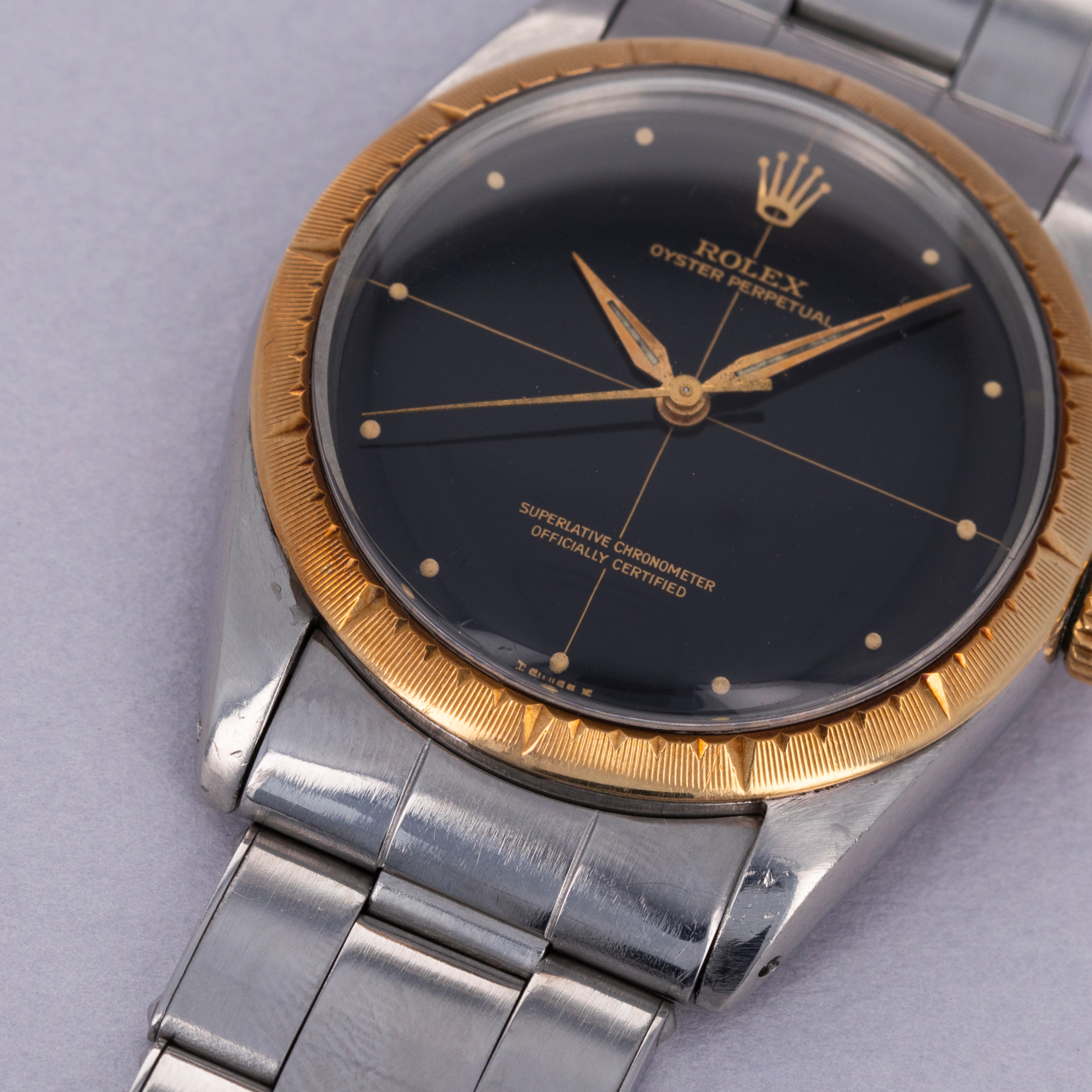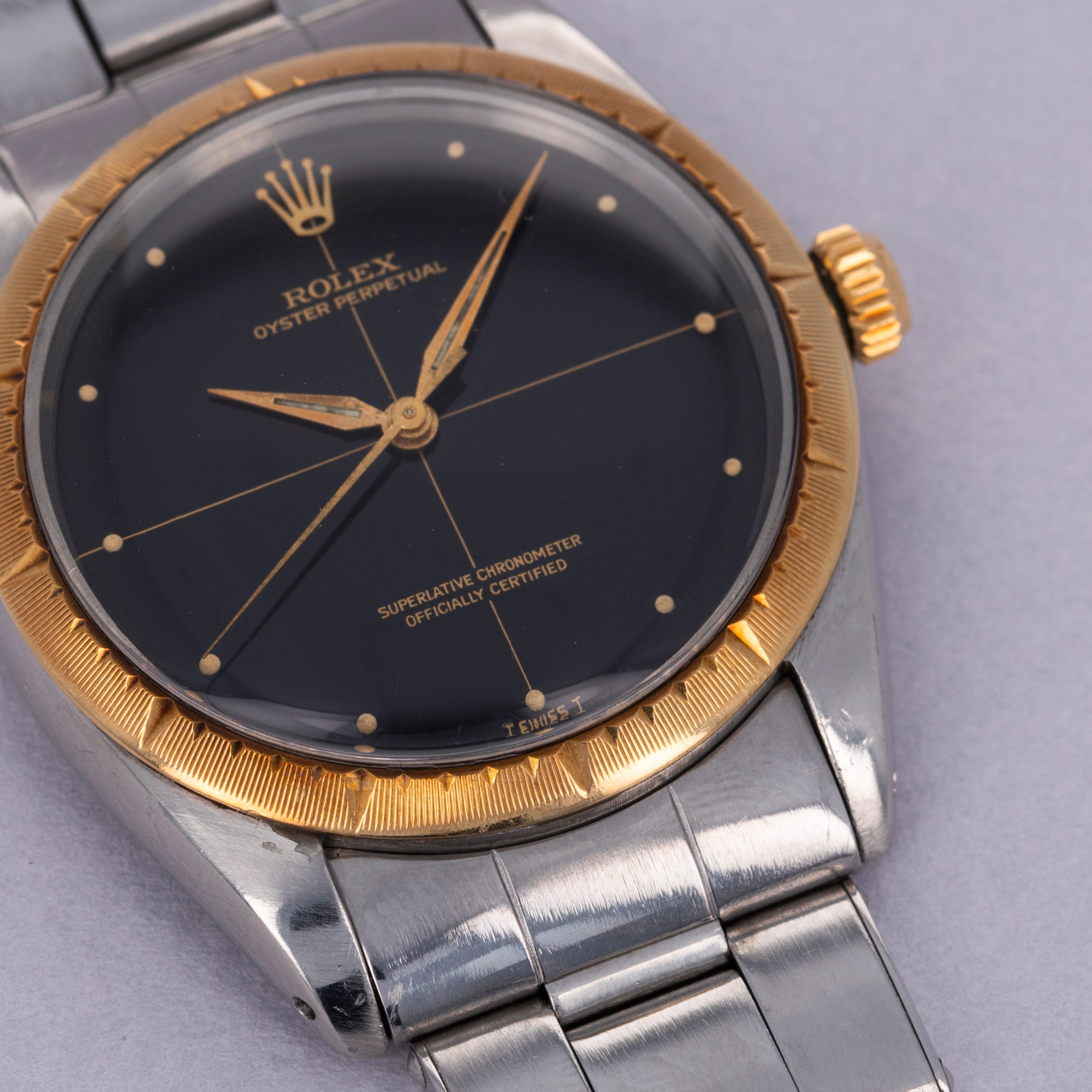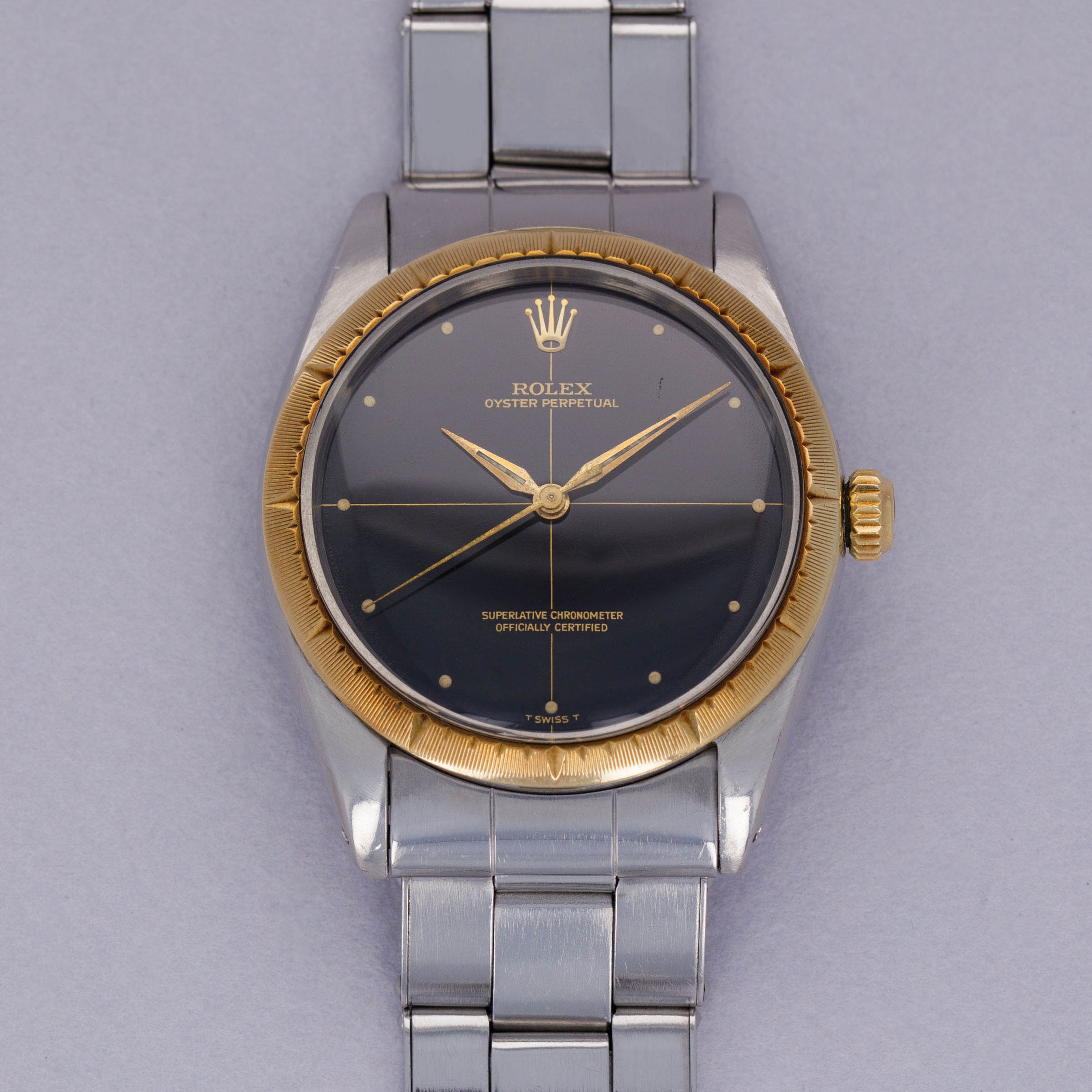 Famed as the base model that all of Rolex’s sports models use as their foundations, the Oyster Perpetual is an iconic watch that has a profound impact on horology. While its no-frills stainless steel construction is utilitarian, its design is equally timeless and classic. With its smooth stainless steel bezel and clean dial, the Oyster Perpetual has long been a collector favorite. Produced from the late 1950s until the early 1980s, the Oyster Perpetual ref. 1008 was amongst the references that introduced the automatic cal. 1560 movement to Rolex’s catalog. Here we have a black Zephyr dial variant of the ref. 1008 on a stainless steel Oyster bracelet with a stunning 18kt yellow gold bezel and matching 18kt yellow gold crown. Boasting an appealing aged aesthetic through its patinated bezel and stunning jet-black dial with gilt inscriptions, this example’s display reveals its heritage as a vintage timepiece that has stood the test of time.